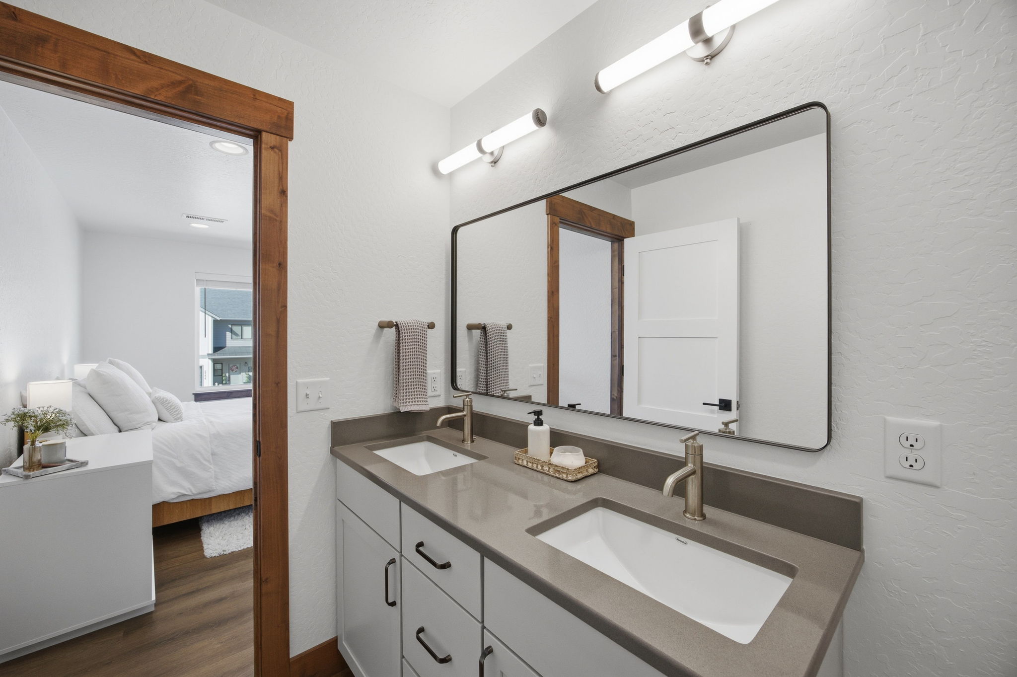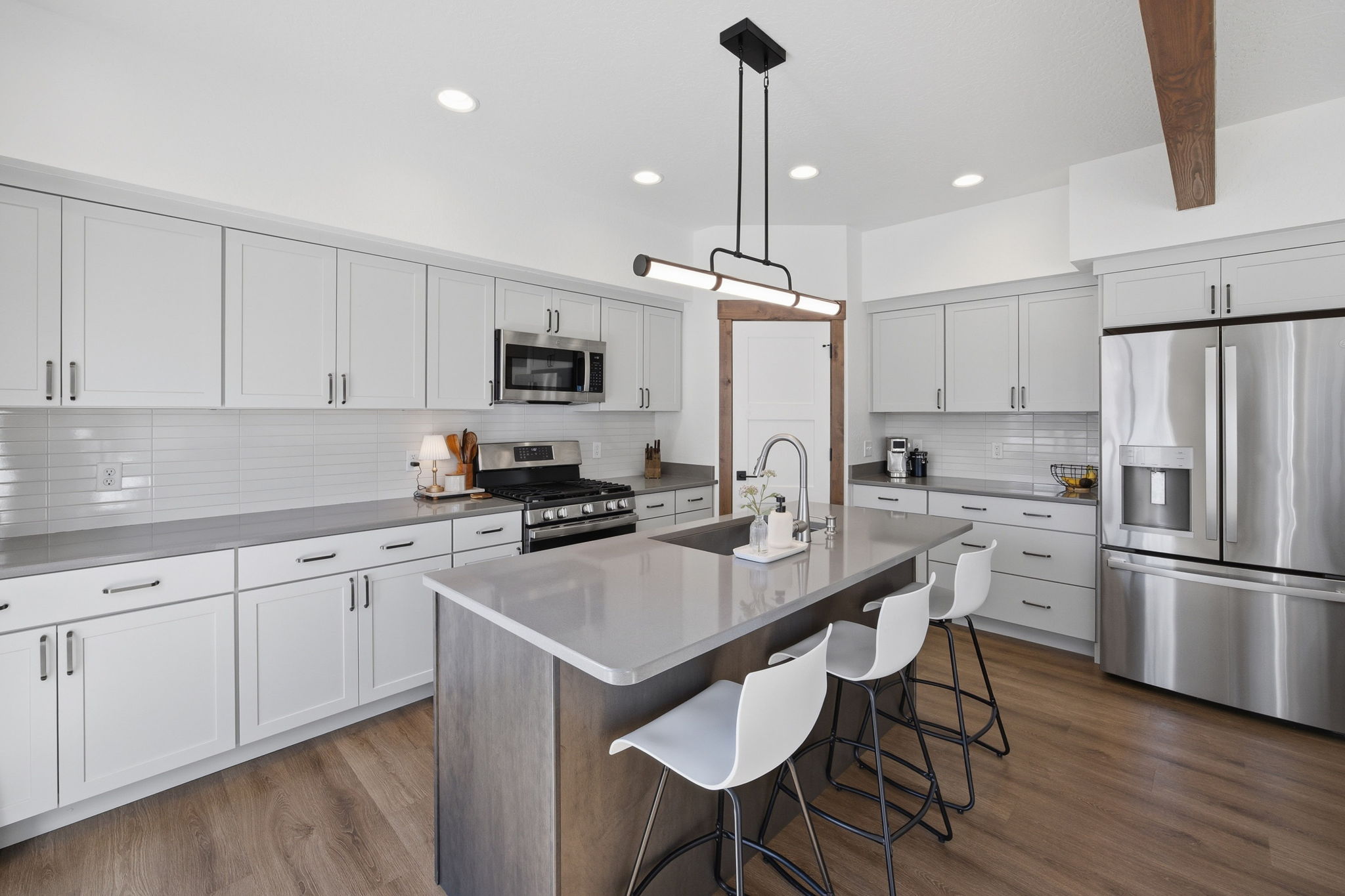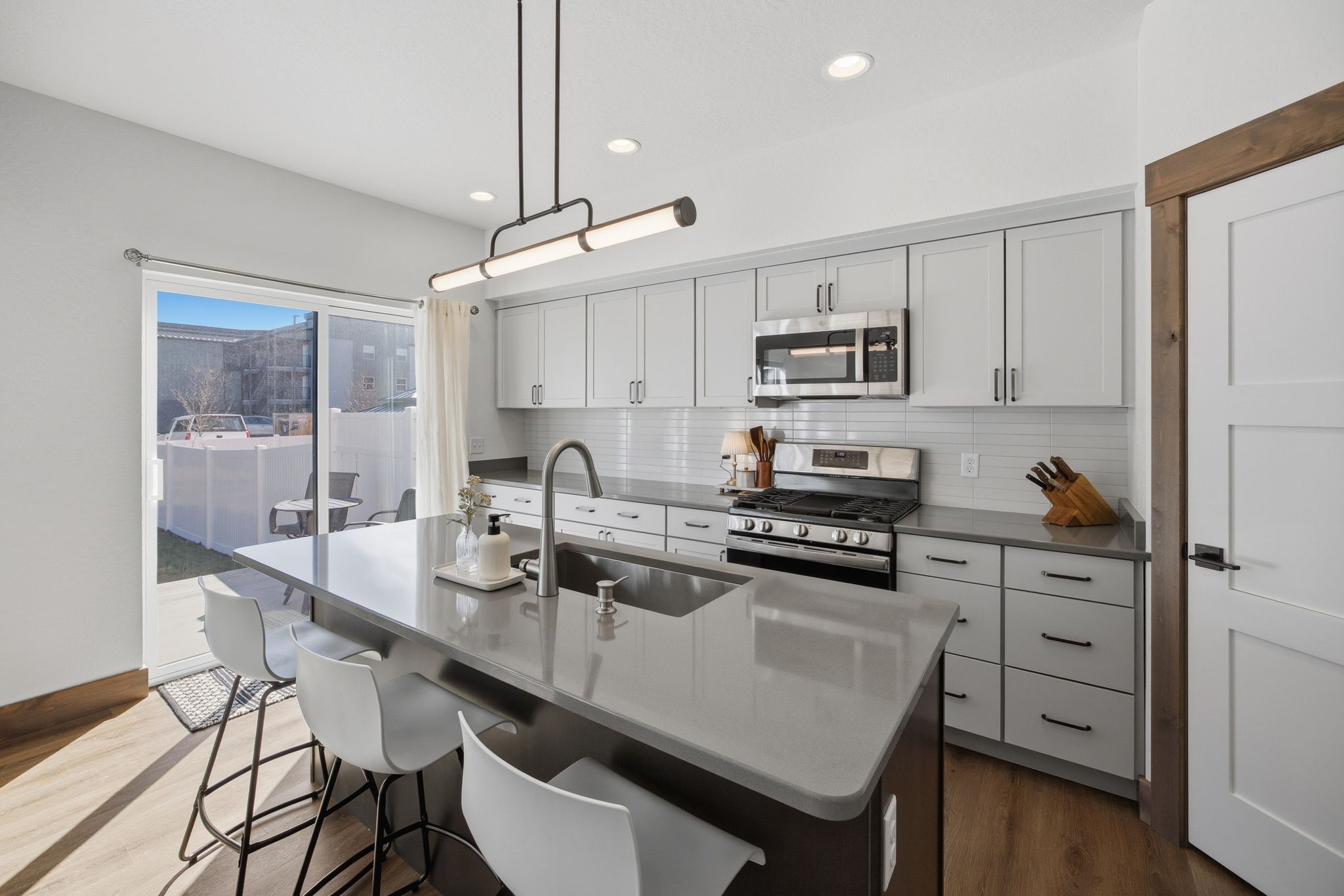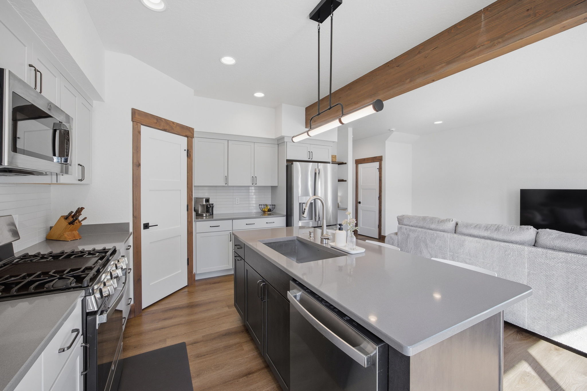 Discover contemporary living at its finest in this 2024 townhome by Beauchamp Construction, in the Hellgate Elementary School District. This residence represents the pinnacle of warm modern design that is sophisticated, functional, and most importantly, ready for immediate occupancy. The main level features tall ceilings and an open concept designed for everyday comfort. A convenient entryway closet and powder room keep guests entirely on the main floor, making hosting effortless. The kitchen stuns with its stainless steel appliances, quartz countertops, stack tile backsplash, corner pantry, and integrated refuse cabinet in the working island. The large windows flood the space with natural light and offer access to the East-facing patio that overlooks the landscaped, irrigated backyard. Upstairs, the home reveals its thoughtful layout with two additional spacious bedrooms, a full bathroom, large linen closet, and dedicated laundry room with storage to maximize functionality. Down the hallway is the primary suite that offers an element of privacy and is complemented by a walk-in closet with built-in organization and features an ensuite with dual-sink quartz vanity, spacious shower, and Moen brushed nickel fixtures. Additional amenities include an attached heated garage, climate control with Ecobee technology, Ring doorbell, alder trim and luxury vinyl plank flooring throughout along with peace of mind with a transferrable warranty through December 2034. No need to wait, secure your key to Remington Flats today!