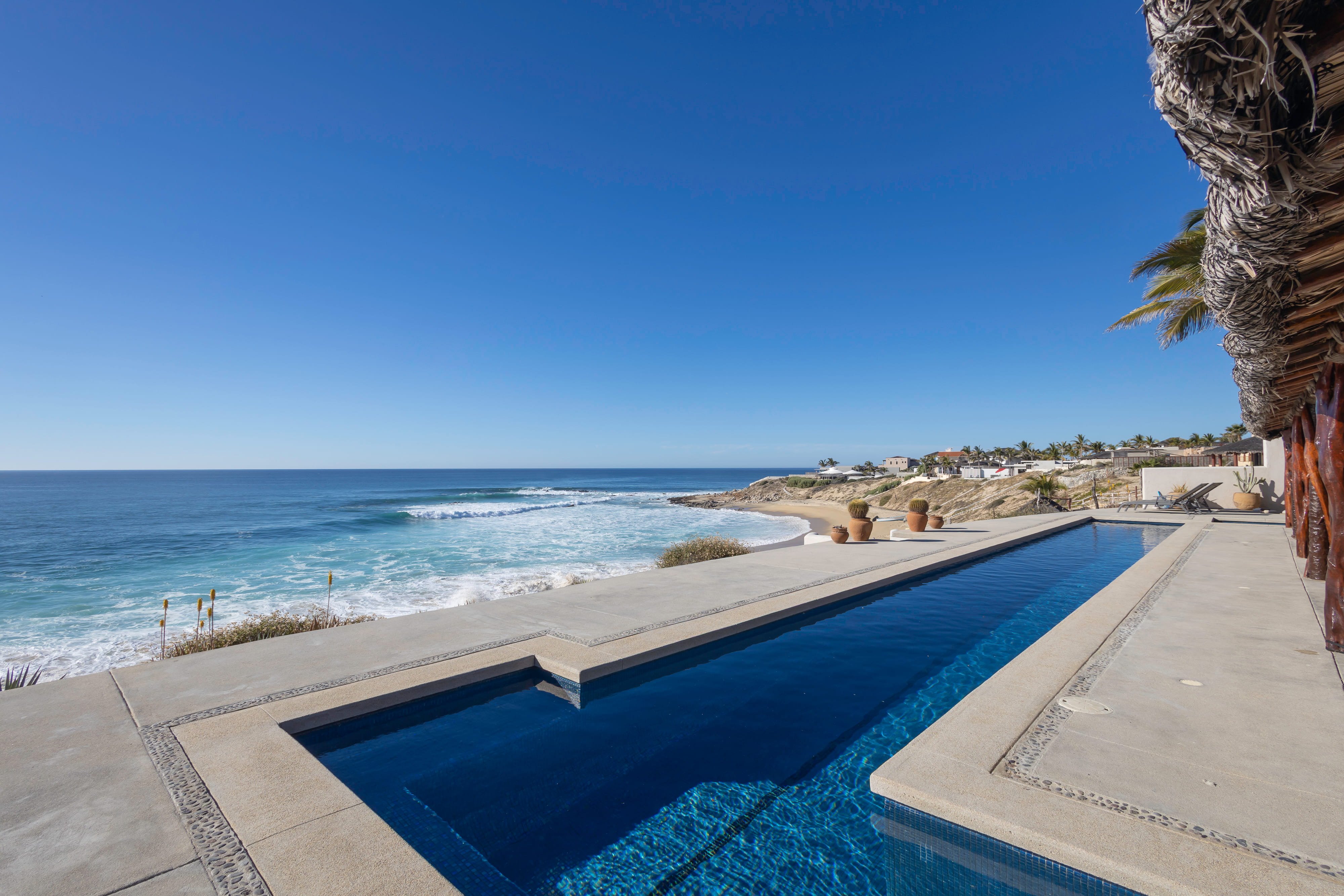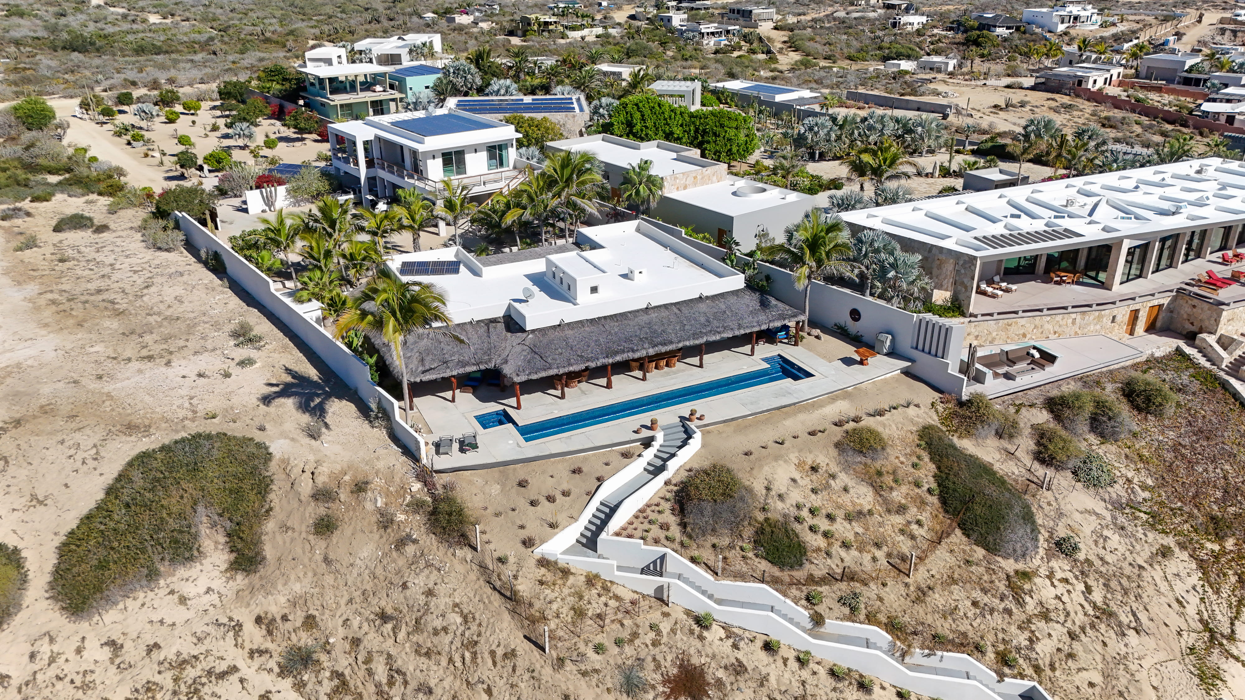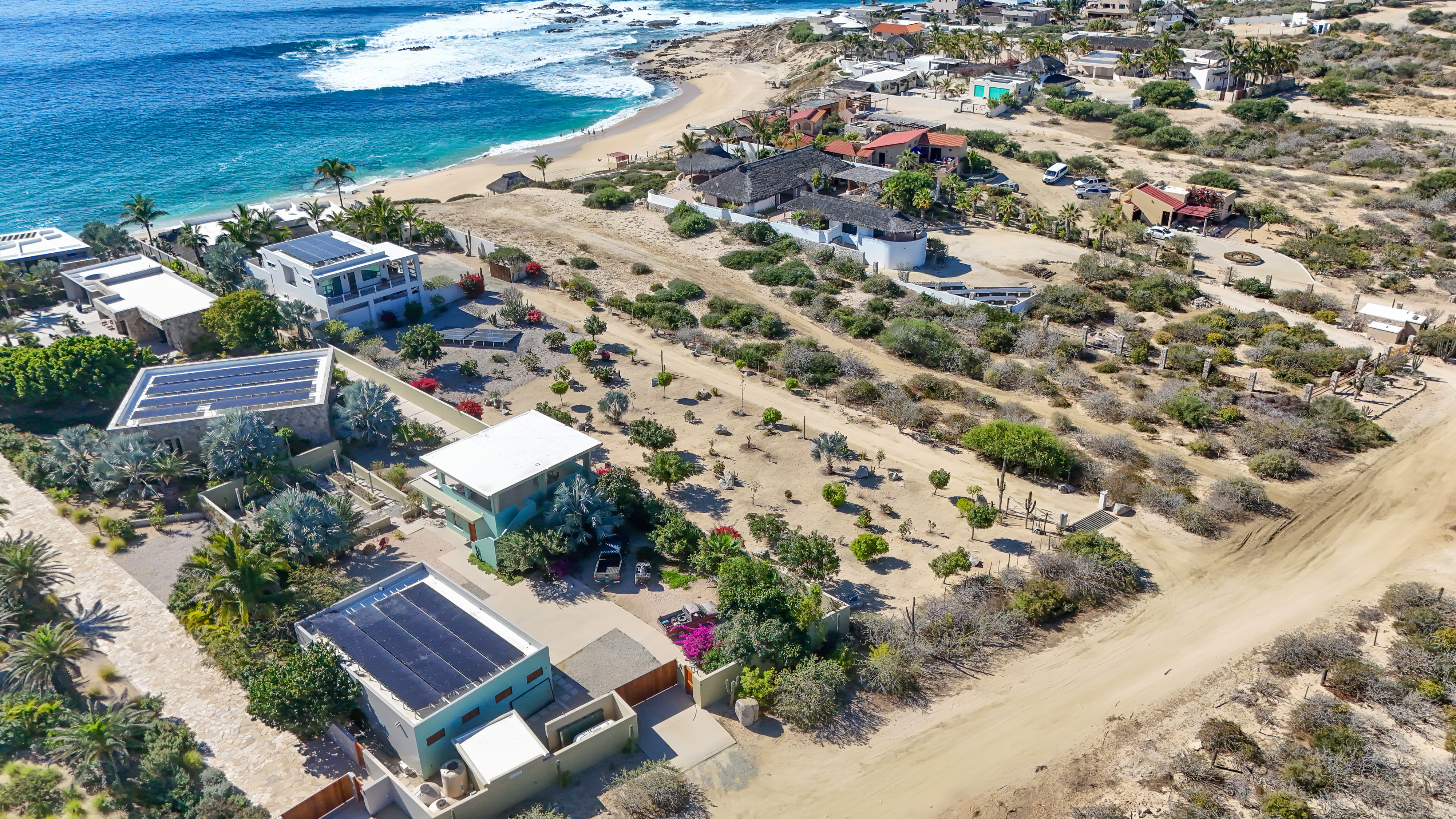 Located along the pristine beachfront of Zacatitos in the East Cape, this residence offers sweeping views of the Sea of Cortez and a peaceful setting along Baja’s untouched coastline. Set on a one-acre beachfront homesite, the property provides exceptional privacy and space. The home features four bedrooms, including three with ocean views, three and one-half bathrooms, and a dedicated office. A covered three-car garage and solar panels support a self-sufficient, off-grid lifestyle. Designed for indoor–outdoor living, the property includes a pool, jacuzzi, and grill area overlooking the sea, with additional space for a garden or orchard. An excellent opportunity to own a private beachfront residence in one of the East Cape’s most authentic coastal areas.