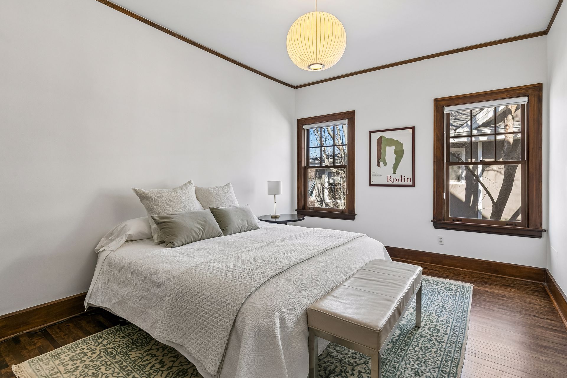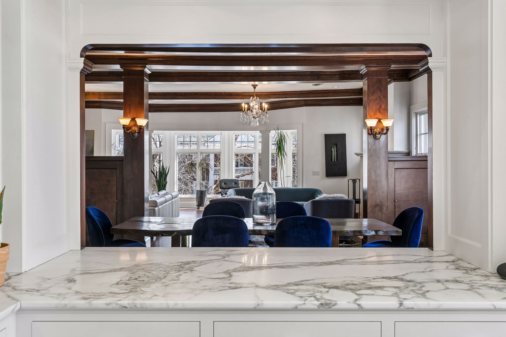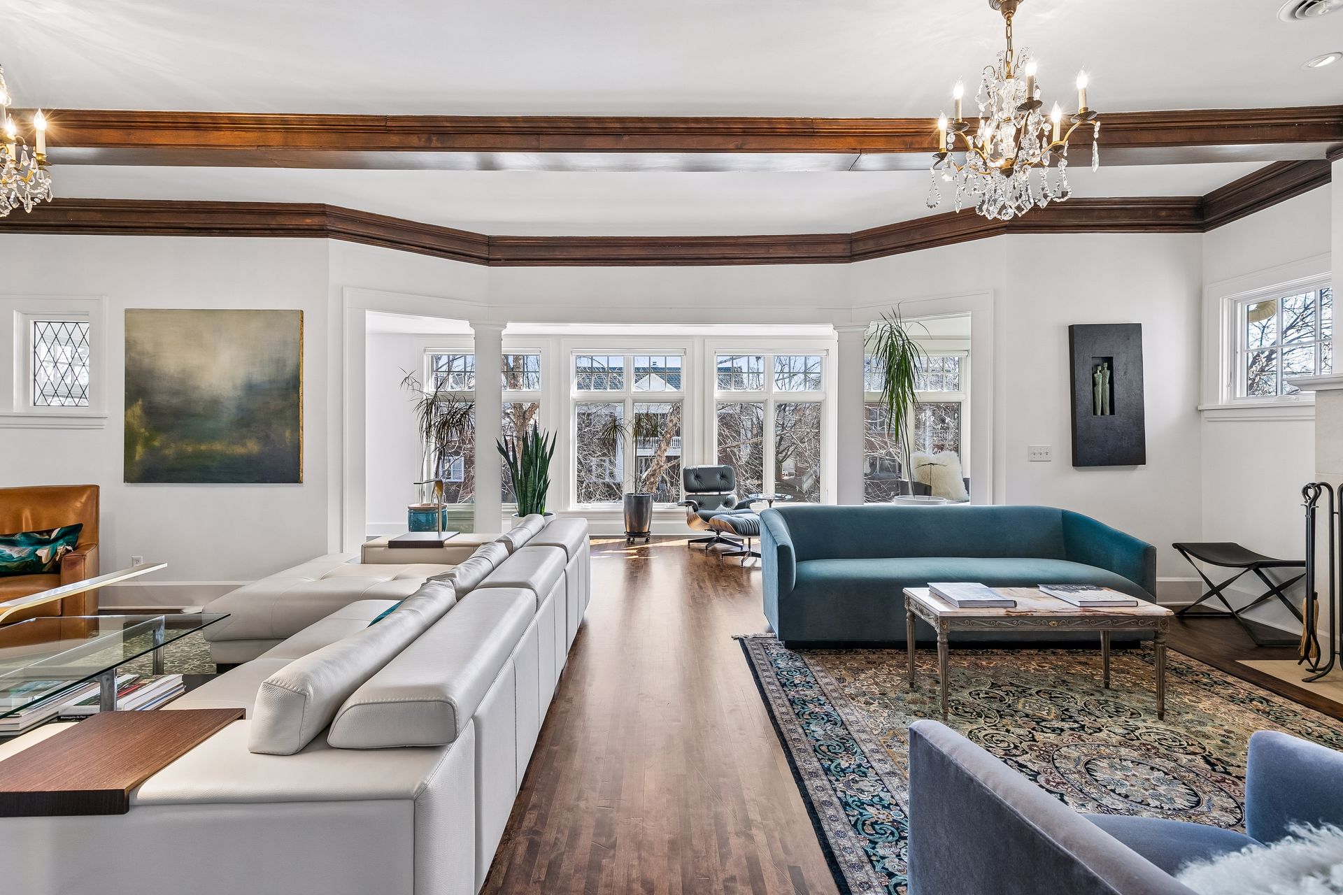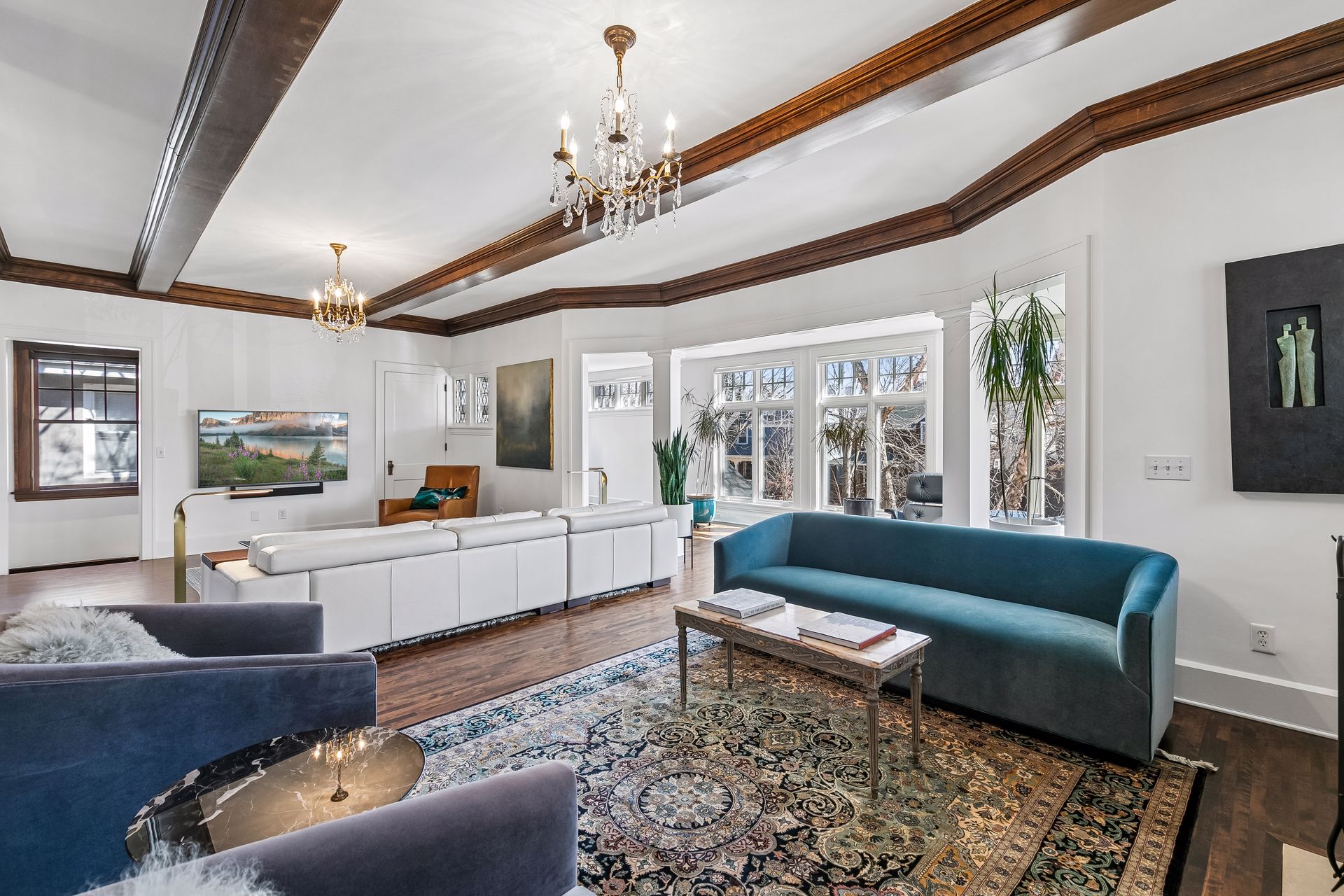 Remodeled four-bedroom + den condo in the desirable East Isles neighborhood. The property features attractive curb appeal, an updated arched entrance, and a modern front door surrounded by well-maintained landscaping, seasonal flowers, and mature canopy trees. Welch Forsman Associates completed renovations that emphasize modern design elements, integrating them thoughtfully with turn-of-the-century charm and craftsmanship to produce attractive, practical living spaces throughout the property. The expansive living room includes an adjacent sunroom, distinguished by a wall of windows allowing for an abundance of natural light to pour through. Elegant wood beams accentuate the high ceilings, seamlessly integrating with the built-in dining room buffet. The kitchen, illuminated by natural light, offers generous cabinet storage, a central island, and an elegant tile backsplash. The main floor features in-unit laundry, three bedrooms and a den, complemented by primary suites on both the main and upper levels. The upper-level ensuite serves as a private retreat, offering two balconies, a sitting room, several walk-in closets, and a bathroom equipped with a soaking tub and walk-in shower. Ample storage in the lower level and attached garage. A short distance to all that Lake of Isles has to offer.