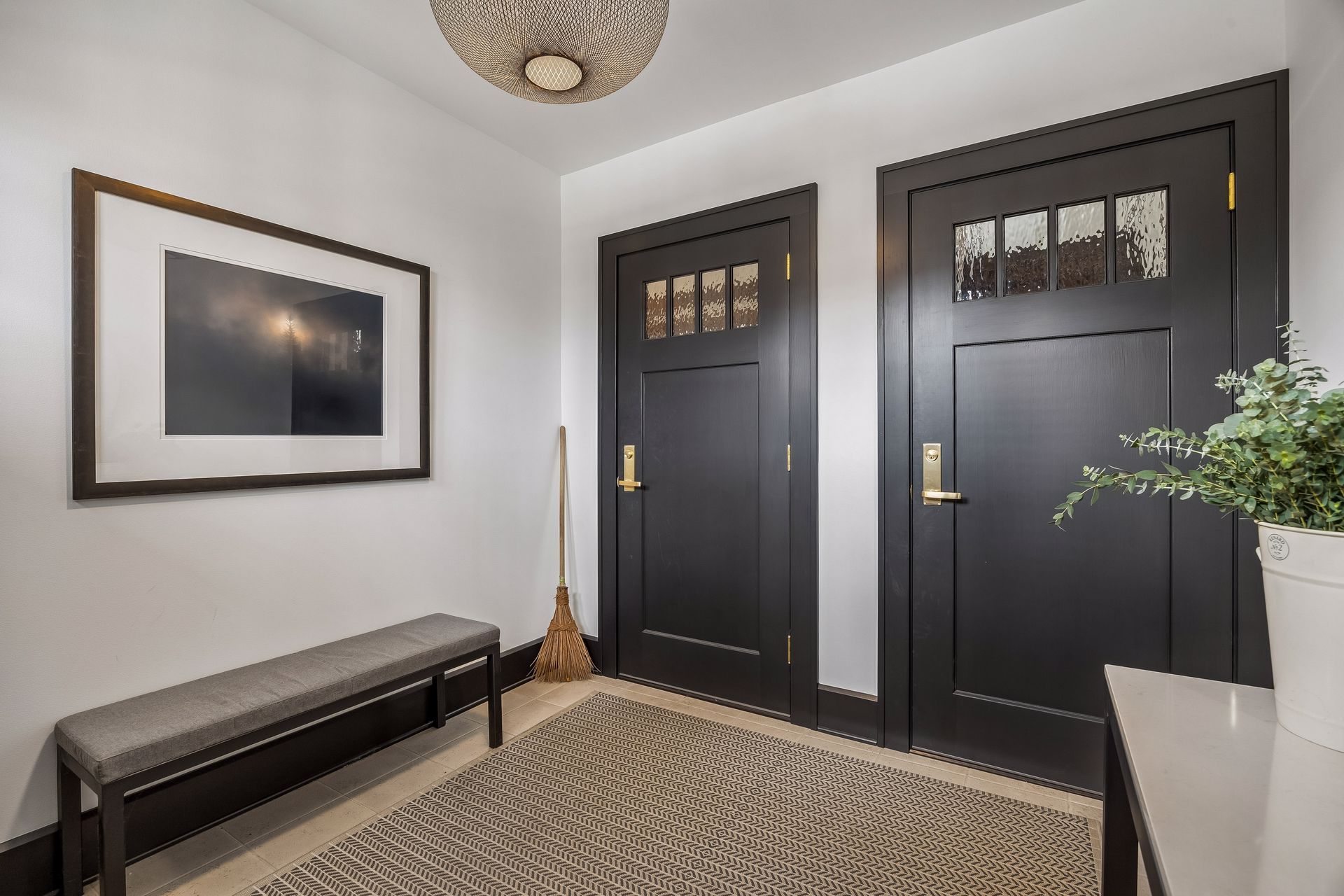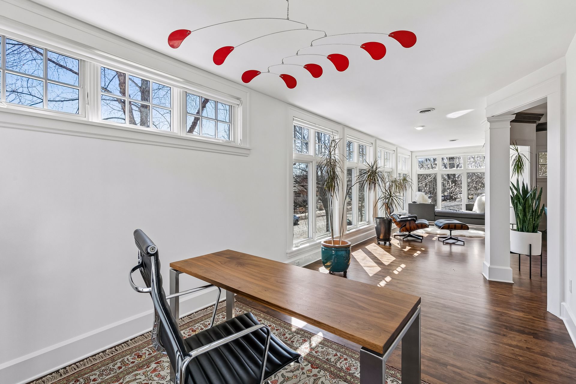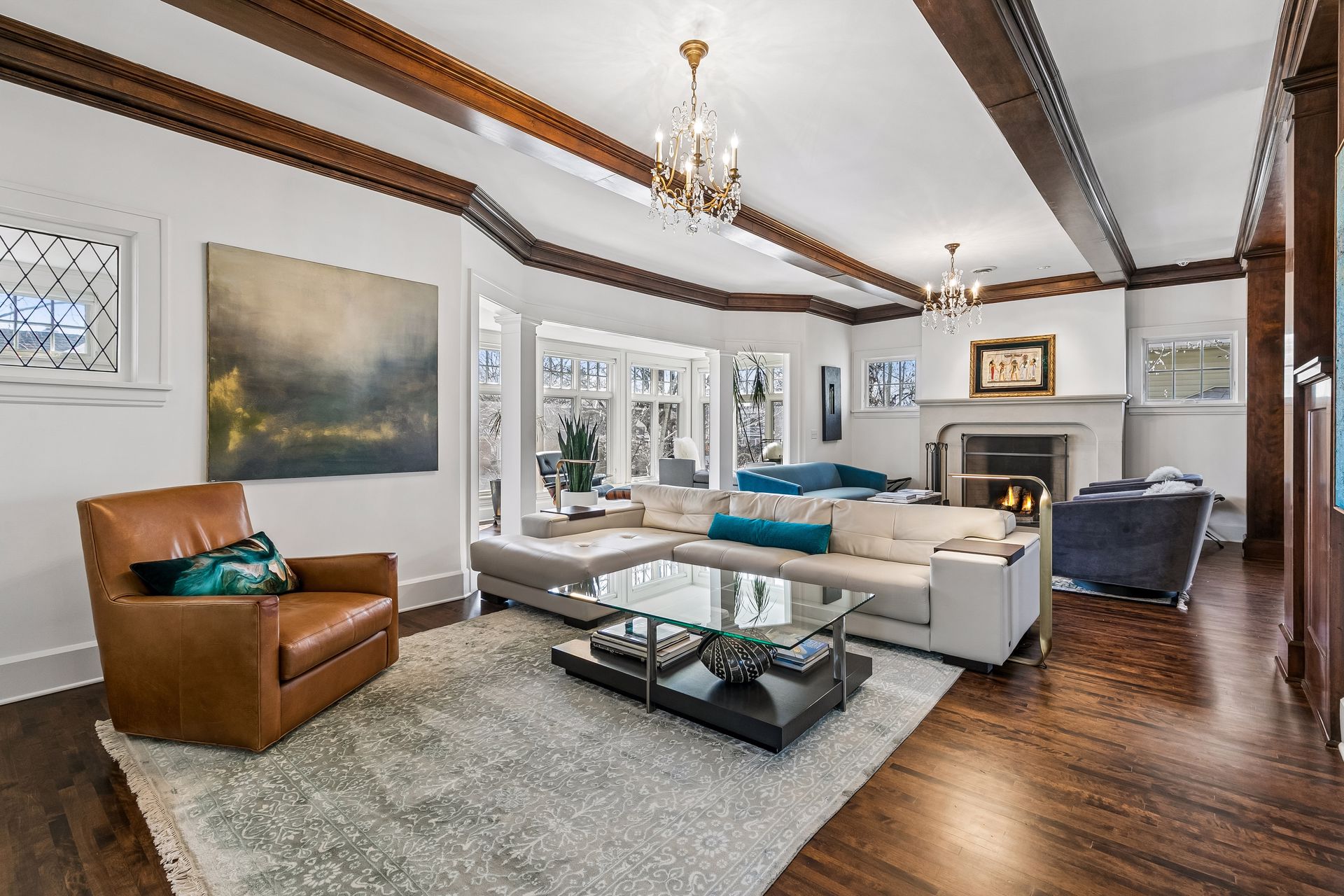 Remodeled four-bedroom + den condo in the desirable East Isles neighborhood. The property features attractive curb appeal, an updated arched entrance, and a modern front door surrounded by well-maintained landscaping, seasonal flowers, and mature canopy trees. Welch Forsman Associates completed renovations that emphasize modern design elements, integrating them thoughtfully with turn-of-the-century charm and craftsmanship to produce attractive, practical living spaces throughout the property. The expansive living room includes an adjacent sunroom, distinguished by a wall of windows allowing for an abundance of natural light to pour through. Elegant wood beams accentuate the high ceilings, seamlessly integrating with the built-in dining room buffet. The kitchen, illuminated by natural light, offers generous cabinet storage, a central island, and an elegant tile backsplash. The main floor features in-unit laundry, three bedrooms and a den, complemented by primary suites on both the main and upper levels. The upper-level ensuite serves as a private retreat, offering two balconies, a sitting room, several walk-in closets, and a bathroom equipped with a soaking tub and walk-in shower. Ample storage in the lower level and attached garage. A short distance to all that Lake of Isles has to offer.