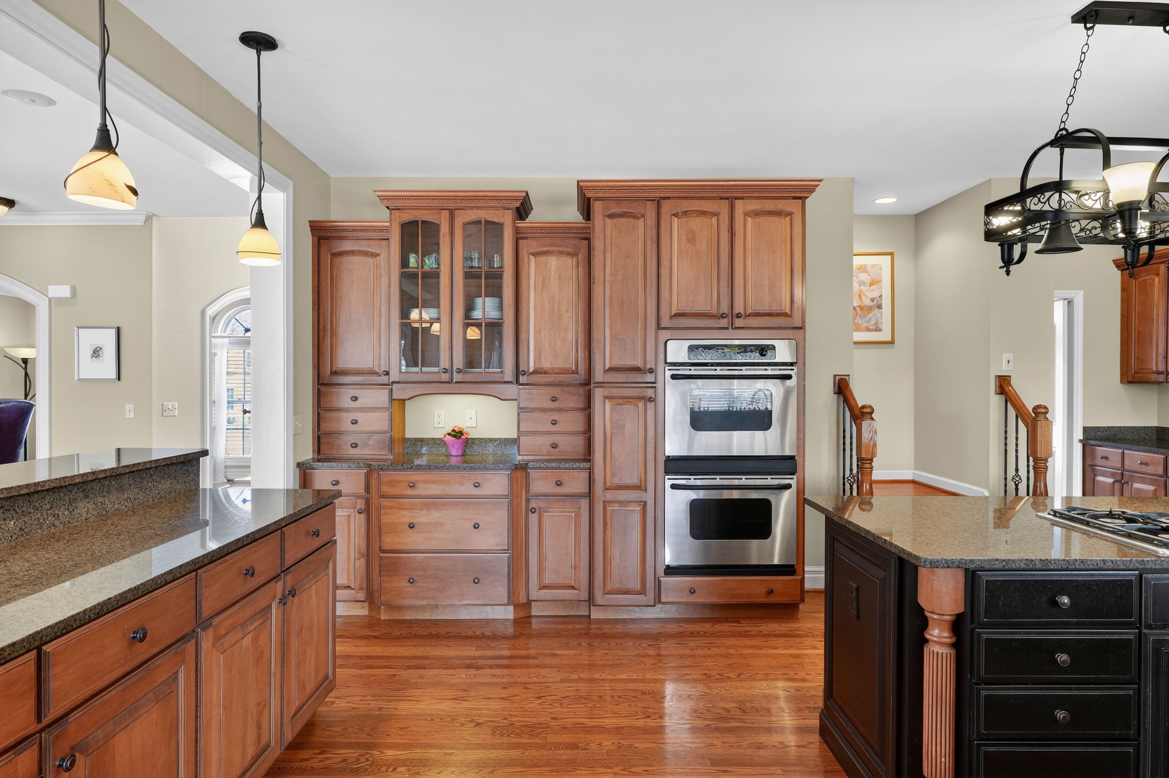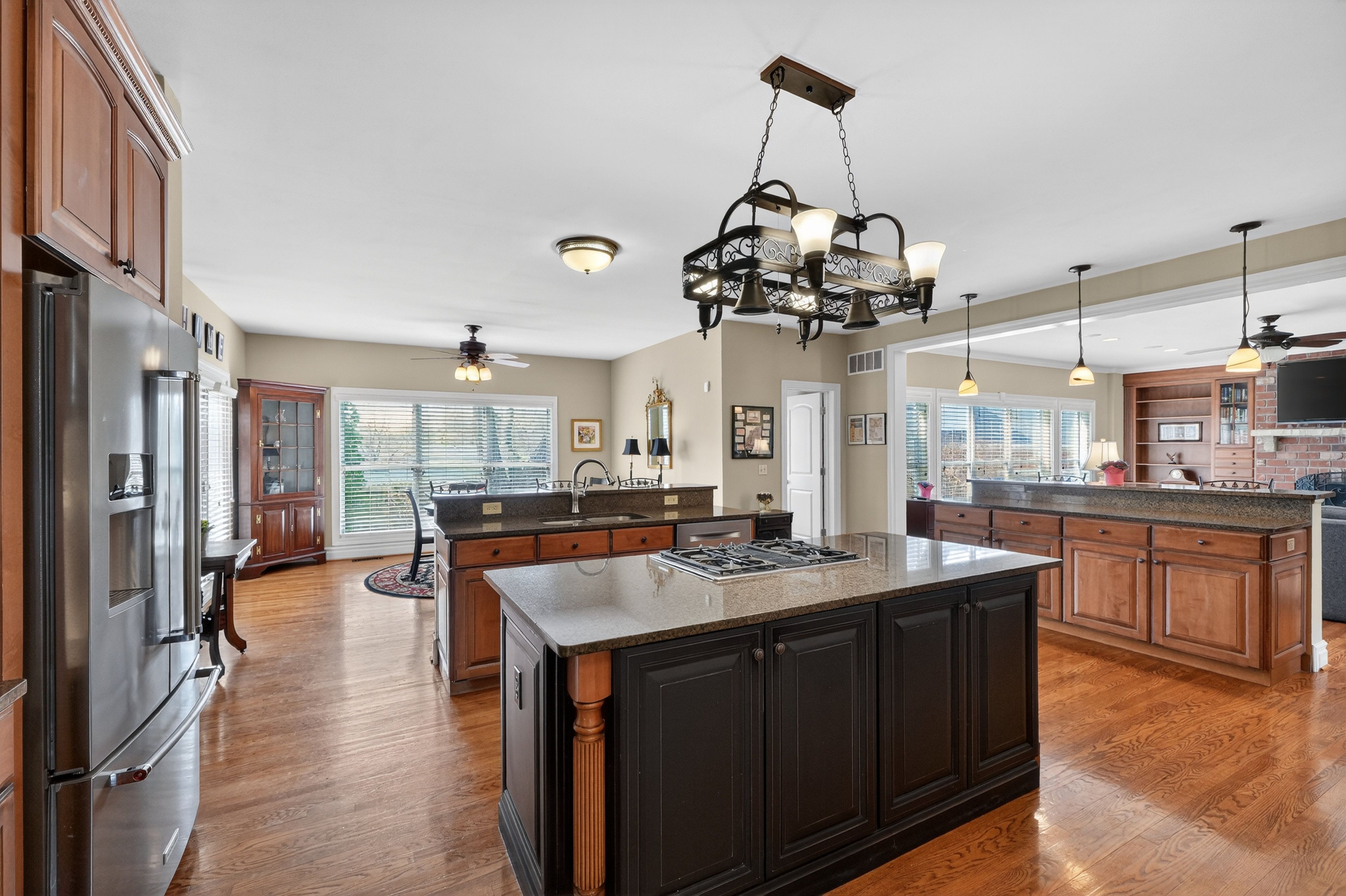 Presenting an exceptional five-bedroom residence in the highly coveted Harwood Hills neighborhood, thoughtfully designed with a main-level Primary suite and an elegant, open-concept floor plan ideal for both refined living and effortless entertaining. The gourmet kitchen is a standout feature, boasting three expansive islands that provide both function and style, perfect for culinary pursuits and gathering alike.Upstairs, four well-appointed bedrooms are complemented by two full baths, offering comfort and privacy. The luxurious Primary bath serves as a serene, spa-inspired retreat, enhancing the home’s warm yet sophisticated ambiance throughout.The finished lower level spans approximately 2,000 square feet and is designed for leisure and entertaining, featuring areas for billiards and table tennis, a media lounge, and a stylish bar. An additional bedroom or private office, along with a full bath, adds versatility. Outdoors, enjoy beautifully refreshed landscaping, a fenced yard, and an inviting patio with a gas fireplace. A charming built-in shed with electricity offers unique potential as a studio or enchanting playhouse.