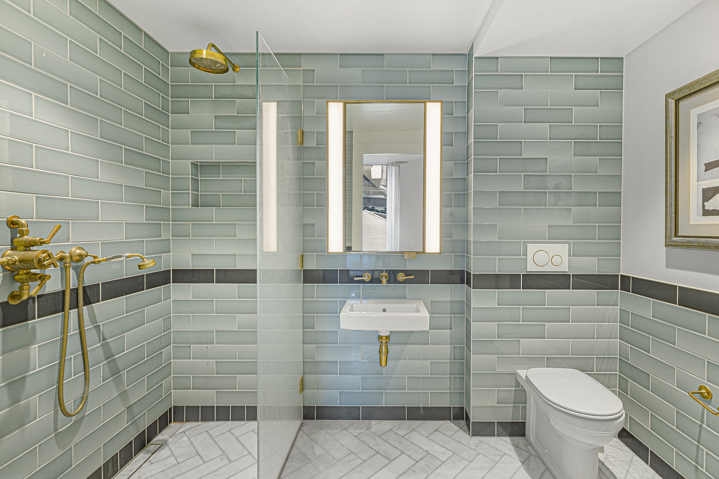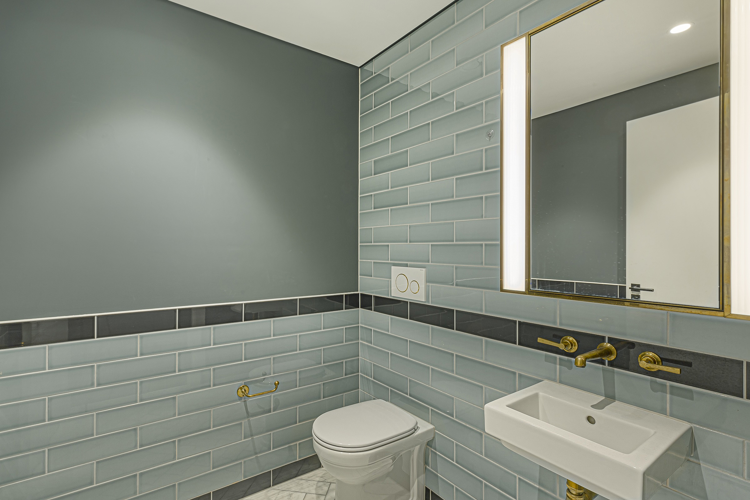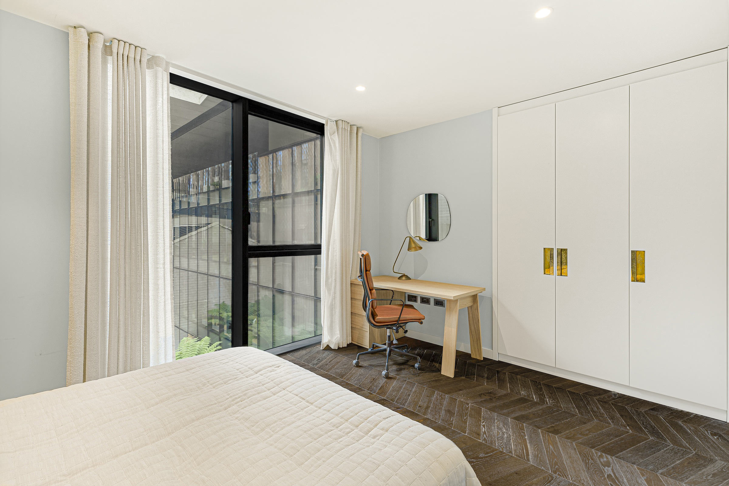 The river-facing master bedroom suite is a serene retreat with built-in storage and a striking bathroom finished in pretty, pale blue subway tiles. The two additional en-suite bedrooms are comfortable and private for guests or family.