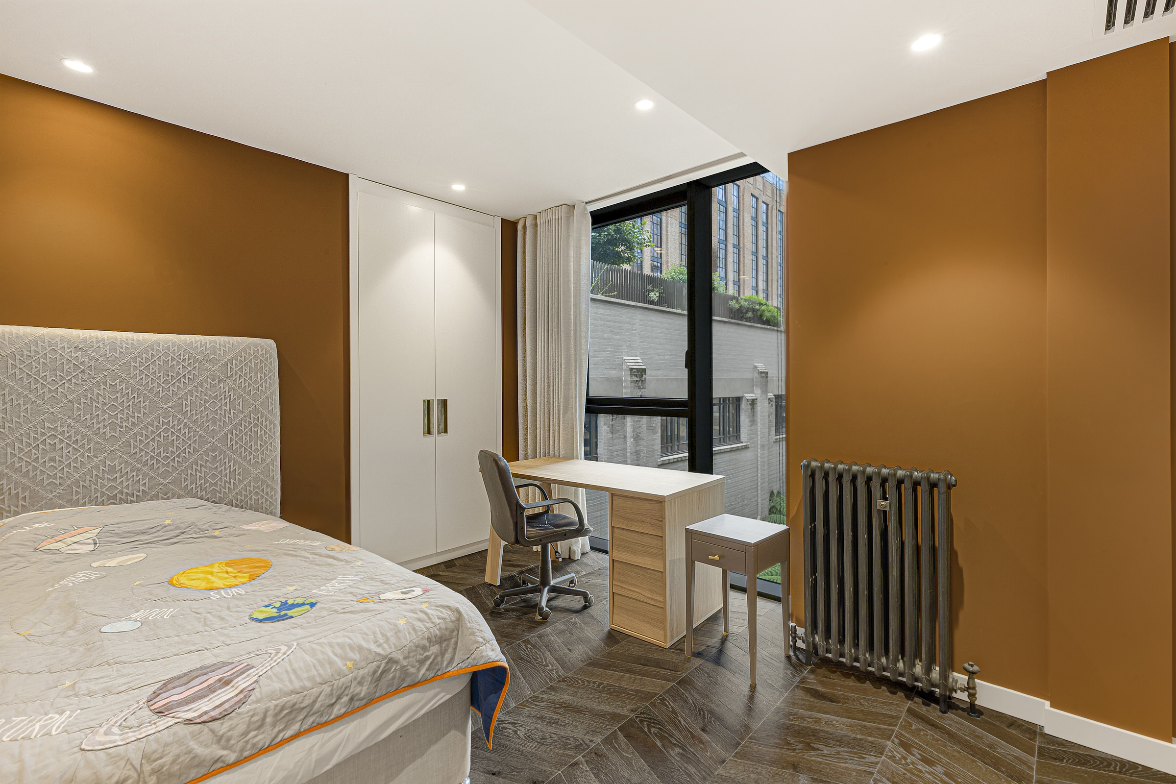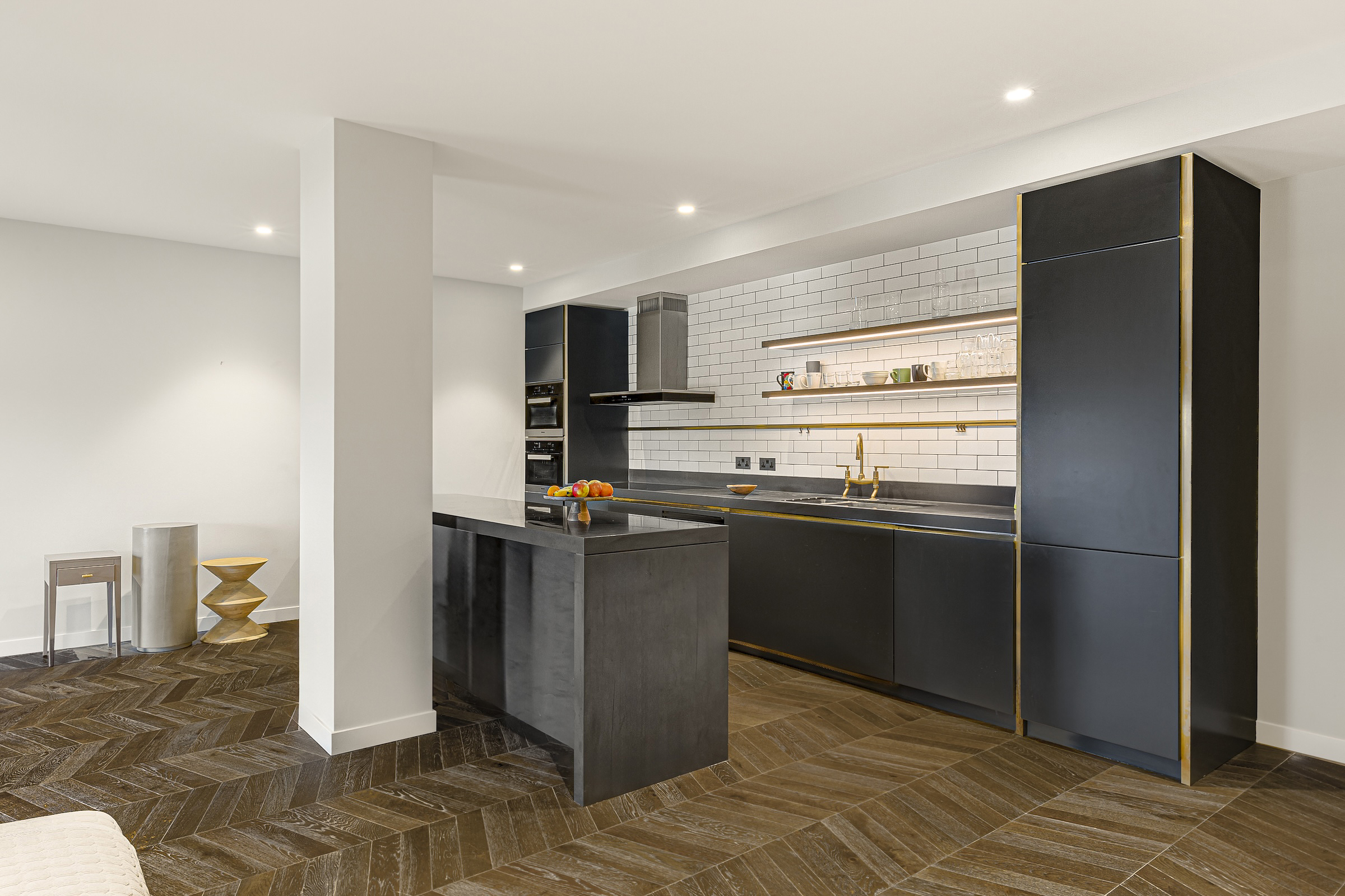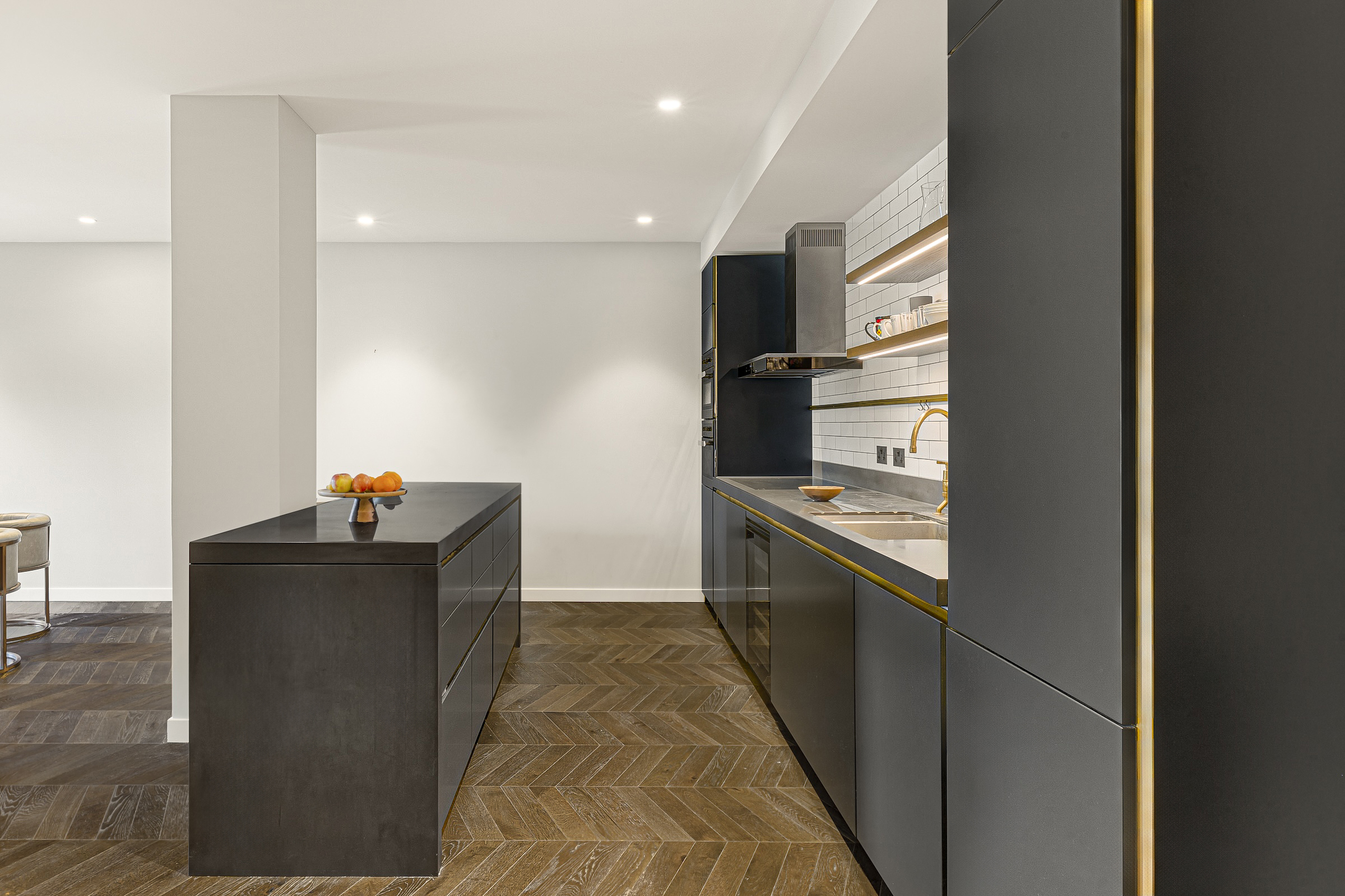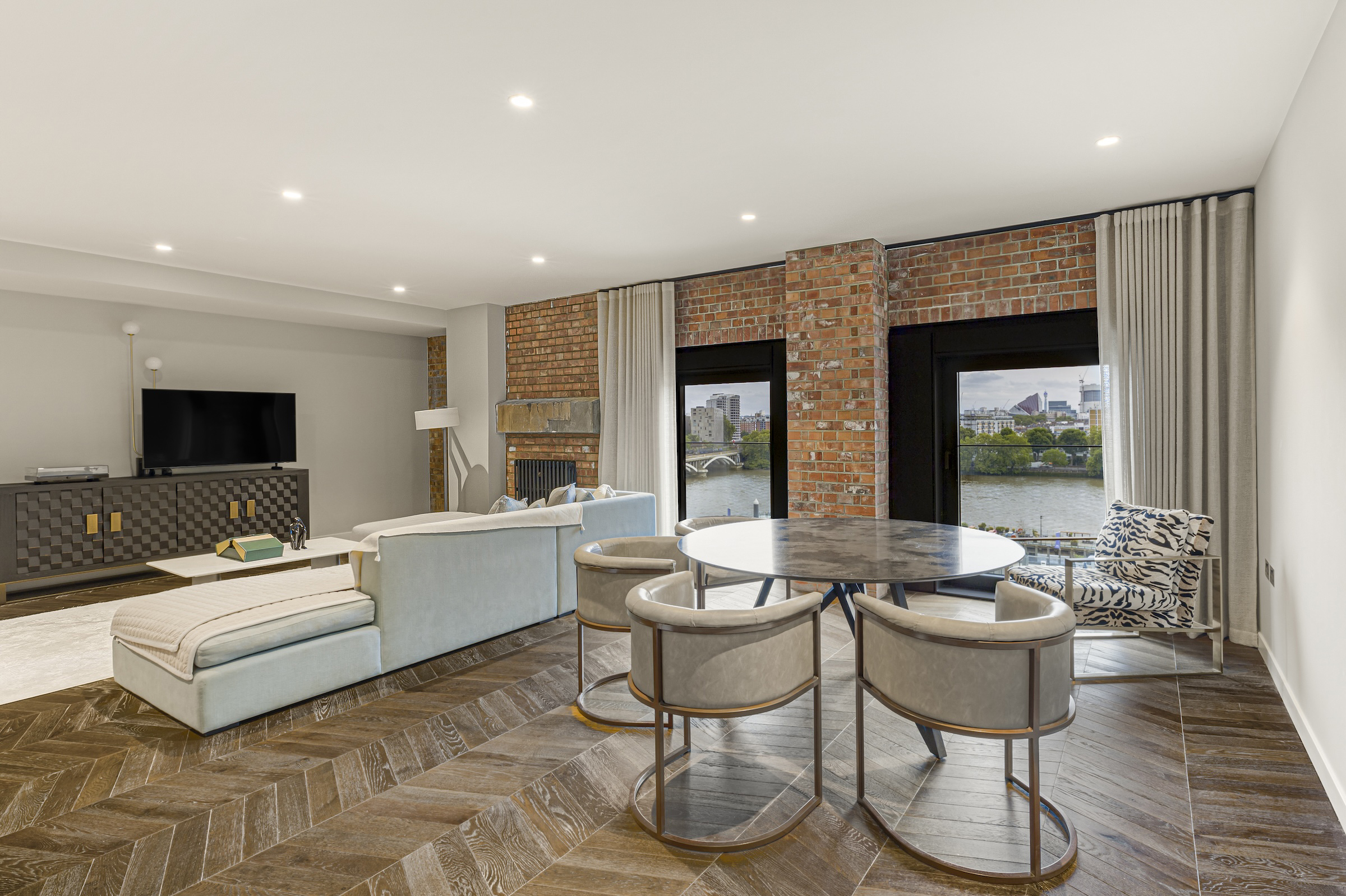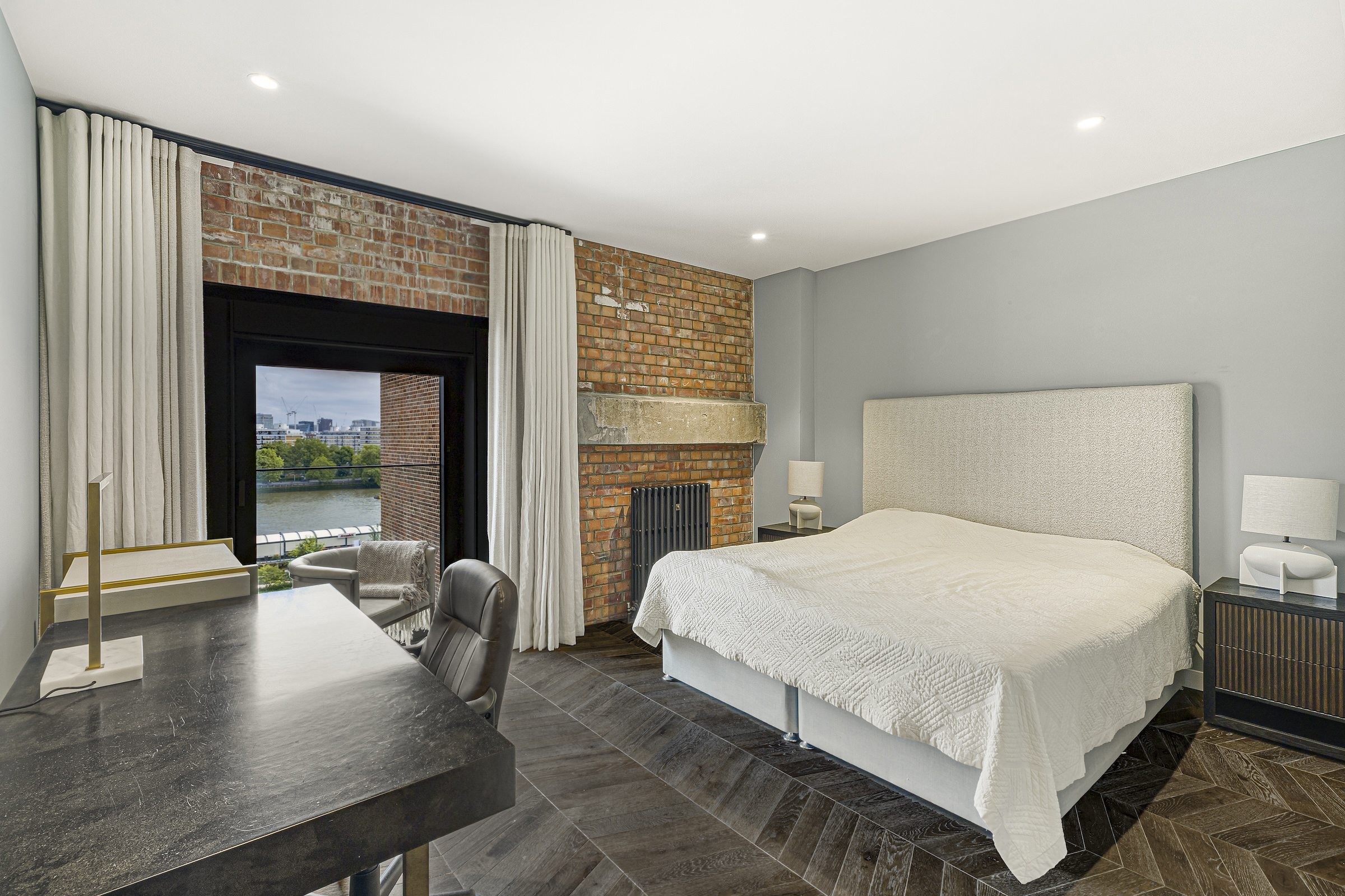 The beautiful home, with its panoramic views of the landscaped gardens below, has been finished with high-spec furnishings and exceptional finishes throughout. The open-plan kitchen and reception room, featuring exposed brick walls overlooks the Thames. This space is perfect for entertaining, and has top-of-the-range Miele appliances concealed in smart paredp-back cabinetry complemented by a breakfast bar.