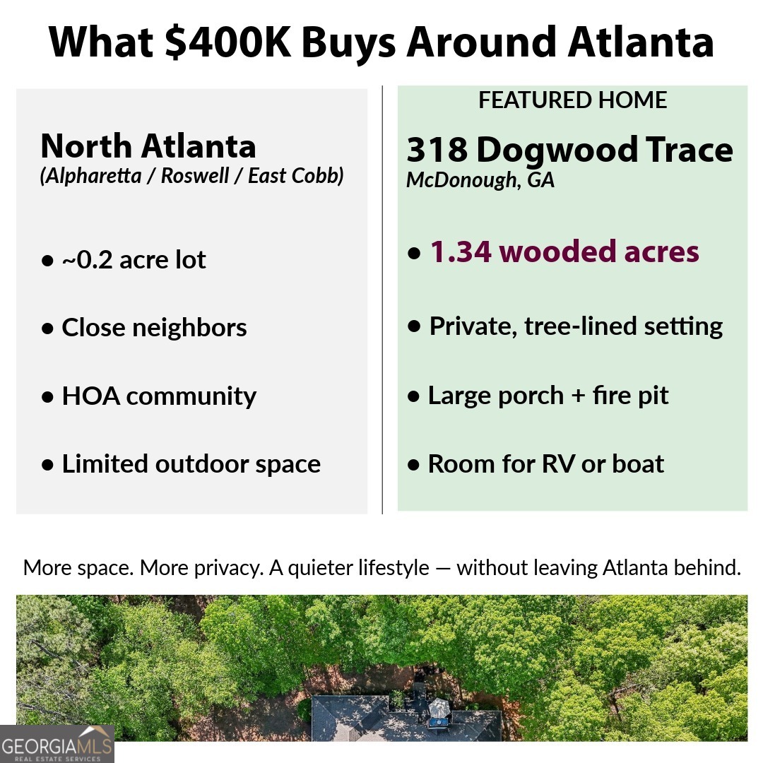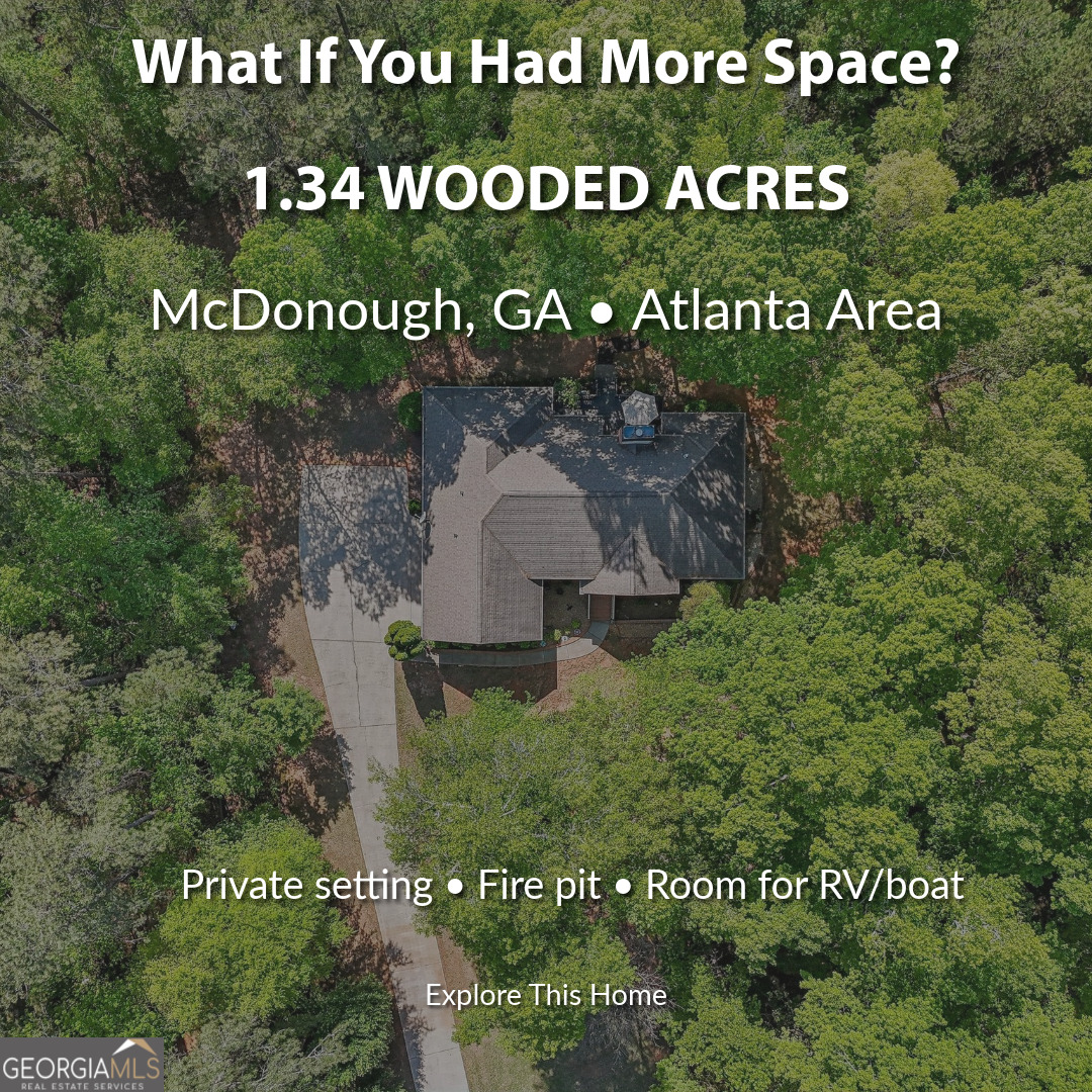 What if home didn't just check the boxes-but actually felt like a place where you could exhale? Tucked away on 1.34 wooded acres in McDonough, this well-maintained single-story home offers the kind of private, peaceful setting many buyers are craving right now-but rarely find at this price point. Surrounded by mature trees and natural privacy, the property creates a true sense of escape-while still being within a convenient drive to Downtown Atlanta and Hartsfield-Jackson Airport. Inside, the home features a spacious single-level layout with a desirable split-bedroom floor plan, offering both comfort and functionality for everyday living. Main-level living provides ease and simplicity, without the need for stairs. Step outside, and the lifestyle this property offers really begins to shine. A welcoming front porch invites you to slow down, while the backyard opens to a private, tree-lined retreat. The fire pit area creates a natural gathering space-perfect for quiet evenings or time with family and friends under the trees. There's also the kind of flexibility that's becoming harder to find, with space for an RV, boat, or outdoor equipment-giving you the freedom to fully enjoy both the property and your time at home. Located in the sought-after Kelleytown area within the Union Grove School District in Henry County, you'll still have convenient access to shopping, dining, parks, and a year-round farmers market-without giving up the space and privacy that make this home feel like a getaway. For buyers comparing options closer to Atlanta, this property offers something different-more land, more privacy, and a lifestyle that feels removed from the noise, without losing connection. Homes offering this combination of acreage, single-level living, and everyday escape are becoming increasingly rare.