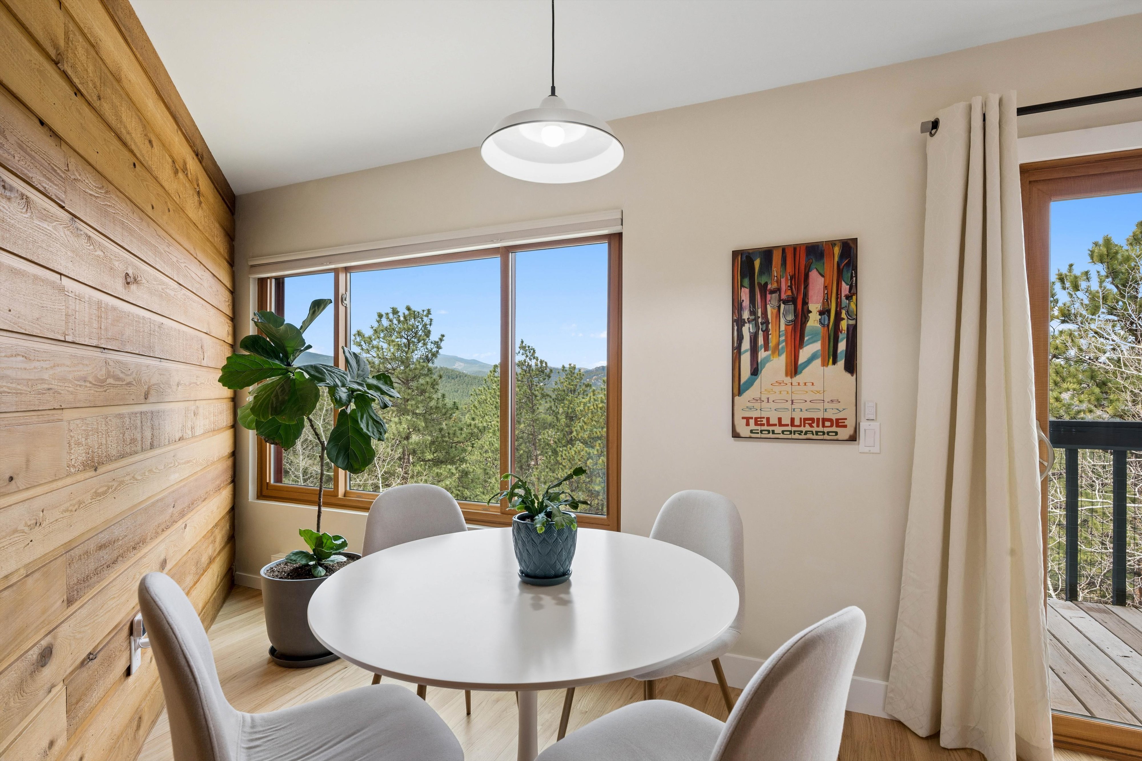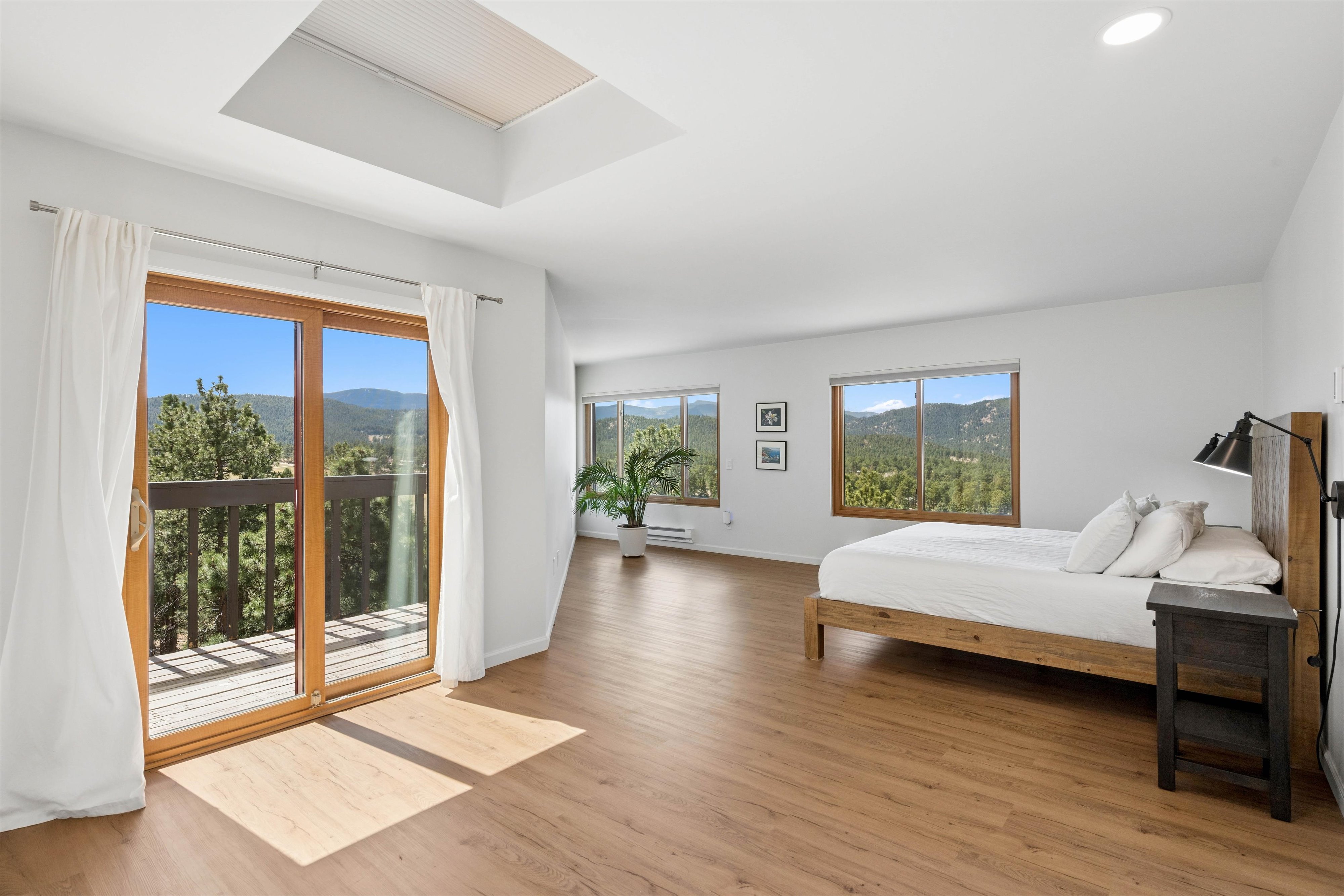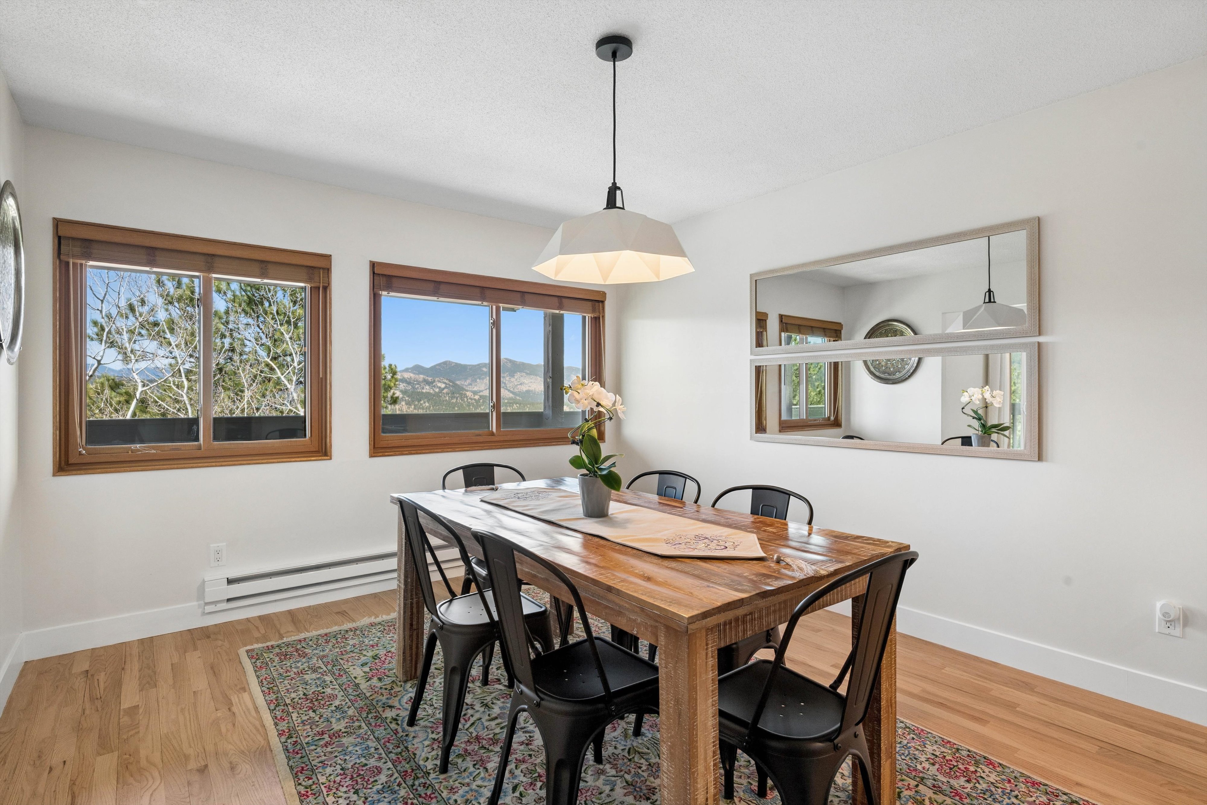 OPEN HOUSE Saturday, April 11, 11:00am-1:00pm. Experience refined mid-century inspired mountain living in this beautifully reimagined residence, privately set on 3.37 acres with sweeping panoramic views and a setting adjacent to open space. Thoughtfully updated while honoring its architectural character, the 3,769 sq ft home seamlessly blends rich natural textures, tongue-and-groove detail, and elevated modern finishes to create a warm yet sophisticated retreat. The designer kitchen serves as the centerpiece of the home, appointed with quartz countertops, an expansive island, stainless steel appliances, a sunlit breakfast nook, and fresh interior paint, all flowing effortlessly to multiple decks that invite indoor-outdoor living. The formal dining room is framed by breathtaking vistas, offering an unforgettable setting for elevated entertaining. The primary suite is a true sanctuary, featuring a spa-inspired en suite with stone surfaces, custom cabinetry, lighted mirrors, an oversized walk-in shower, and a spacious walk-in closet. A secondary bedroom and bath on the main level provide convenience for guests, while the upper-level loft offers a flexible space ideal for a private office or studio. Outdoor living is exceptional, with six distinct decks designed to capture the surrounding landscape and ever-changing mountain views. A separate lock-off studio with private entrance offers versatile use, complete with a kitchenette, lofted sleeping area with walk-in closet, living and dining space, and a ¾ bath—perfect for extended stays, creative pursuits, or private guest accommodations. Extensive upgrades include triple-pane windows, durable Hardie board siding, and thoughtfully integrated built-ins throughout. The property is further enhanced by a 3-car attached garage, generous off-street parking, and a rare combination of privacy and accessibility just minutes from the heart of Evergreen and Evergreen Lake.