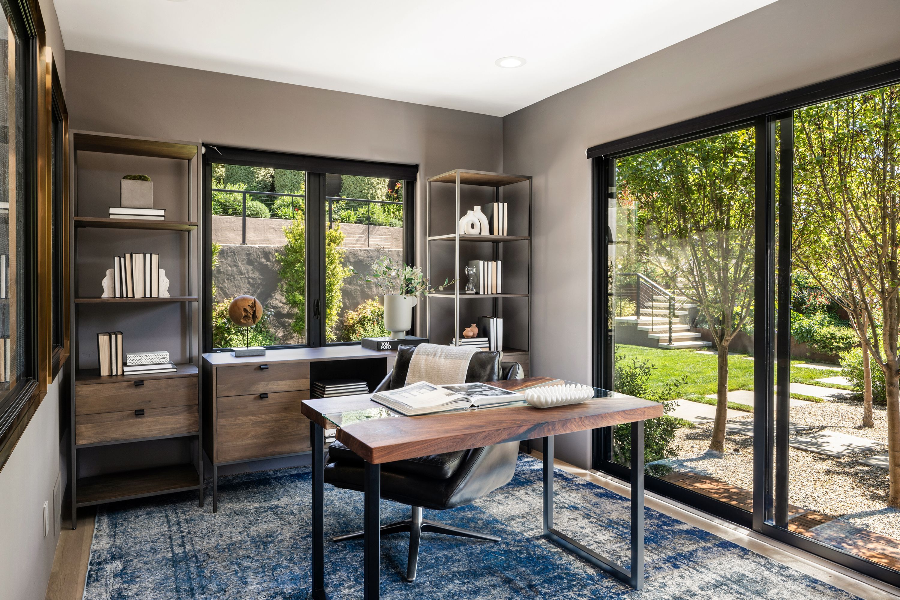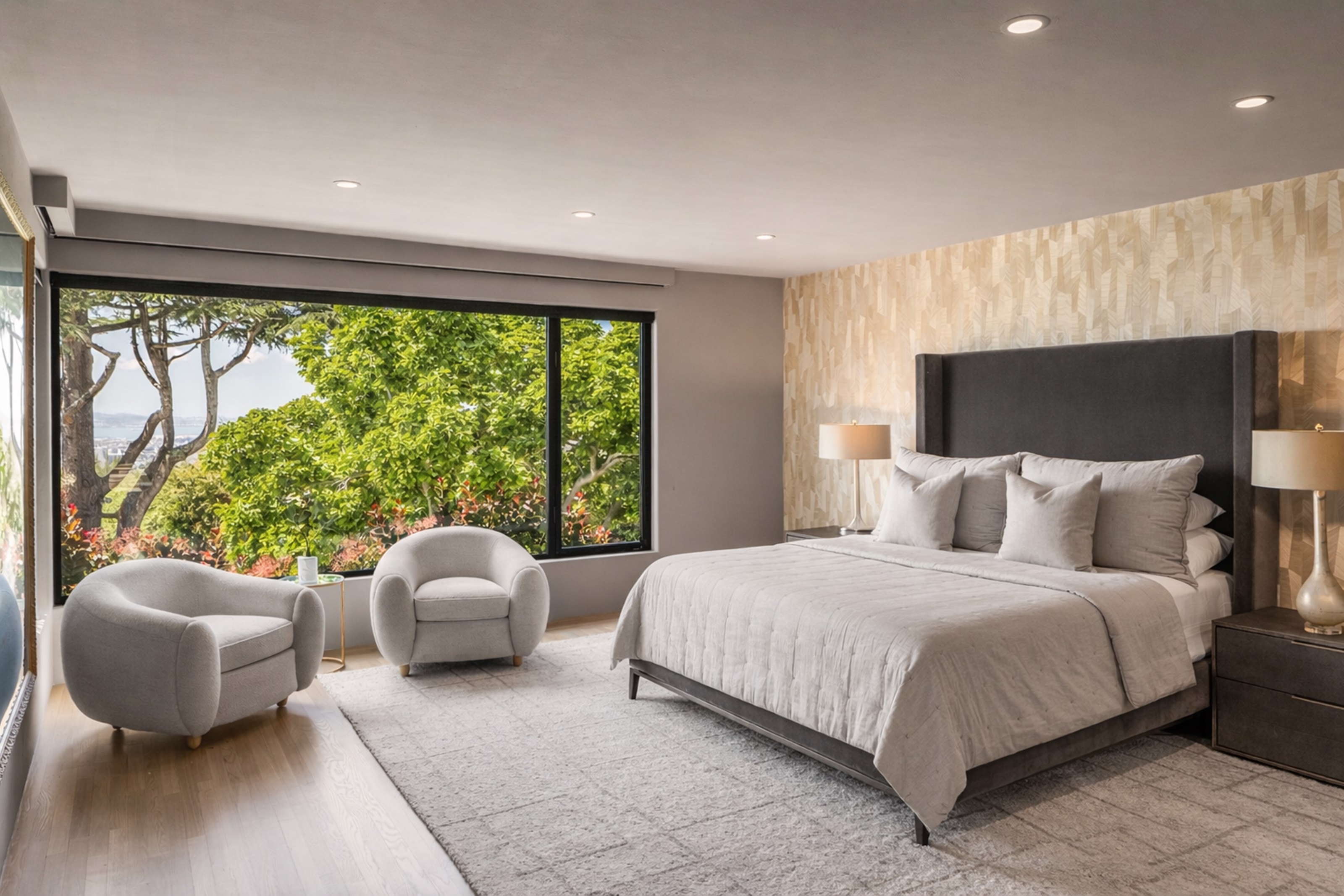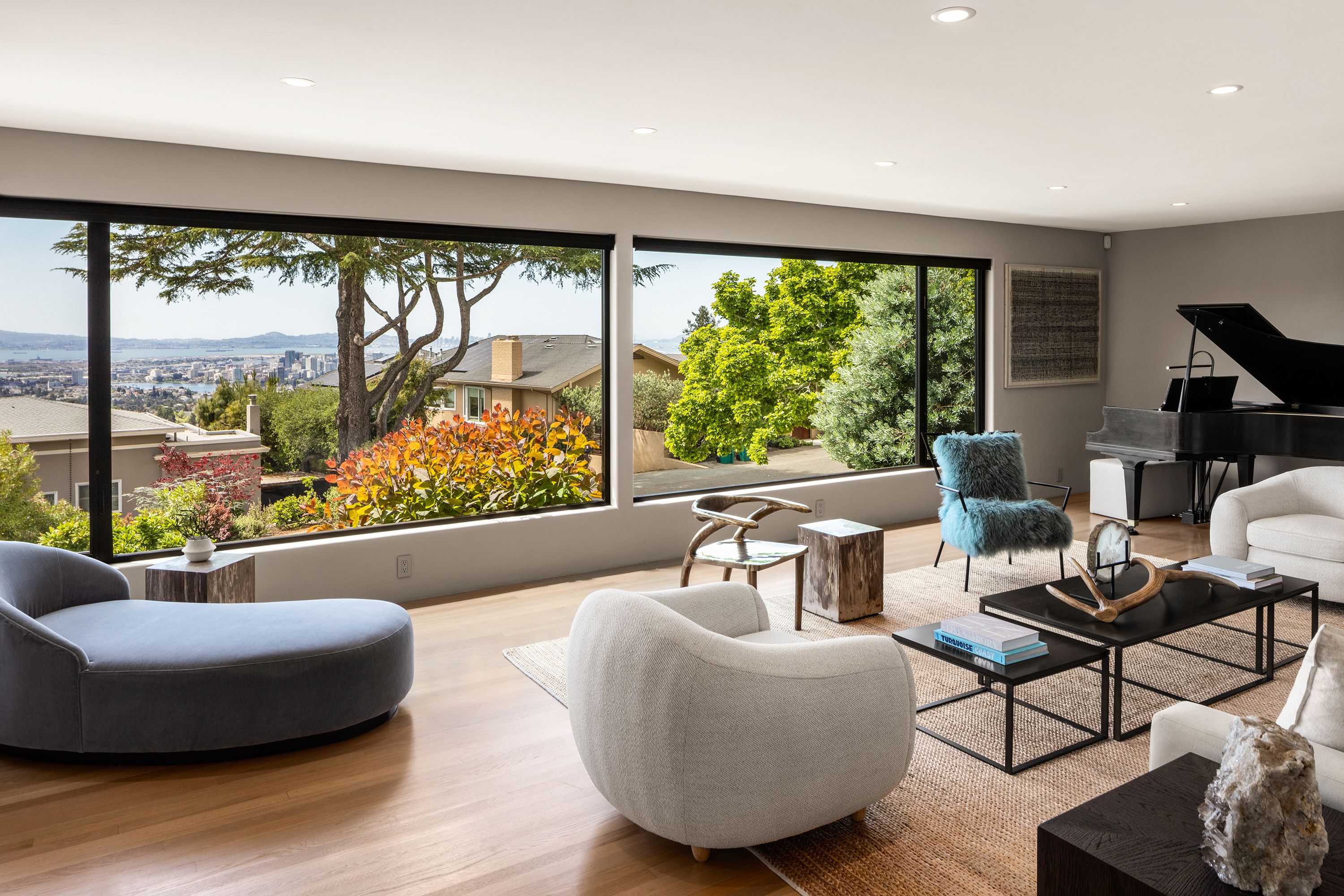 A private oasis designed for seamless indoor-outdoor living, inspired by the understated elegance of luxury hospitality. Thoughtfully reimagined, this residence blends refined contemporary design with exceptional comfort, functionality, and a true sense of retreat.The home offers five bedrooms and four full and two half bathrooms, including three en-suite retreats. Each bathroom is appointed with sophisticated finishes and clean modern fixtures. The primary suite is a sanctuary of its own, featuring a spa-like bathroom with an expansive multi-head shower, steam feature, built-in bench, and a calm, restorative atmosphere.At the center of the home, the chef’s kitchen is both striking and highly functional, appointed with premium Wolf, Sub-Zero, and Miele appliances, dual wine refrigerators, and custom cabinetry. Designed for both cooking and gathering, it flows effortlessly into the main living spaces and out to the expansive deck.Outdoor living is a defining feature. A resort-inspired courtyard unfolds with Thermory decking, a fire pit lounge, and multiple areas for entertaining and relaxation, including a basketball court and climbing wall. A private plunge pool/spa and cabana-style seating overlook the Bay, creating a serene, retreat-like setting that feels both playful and elevated.The living room is dramatic yet inviting, anchored by a nearly 30-foot-wide window wall that fills the space with natural light while framing views of the landscaped grounds, downtown Oakland, and San Francisco. A formal dining room comfortably accommodates large gatherings, while three dedicated workspaces—including a spacious office and two library/study niches with custom built-ins—support the needs of modern living.Originally designed by noted architect Bennett Christopherson and later refined by Thornton Weiler, the home was extensively rebuilt in 2021 by Buestad Construction. The grounds were reimagined by award-winning landscape architect David Thorne, creating a seamless integration of architecture and landscape.In addition to the main living areas, a finished lower level offers a large entertaining room, gym, bathroom, wine room, and generous storage—adding flexibility to a home that is as functional as it is beautifully conceived.Rarely does a home achieve this level of architectural clarity, privacy, and livability—where thoughtful design, exceptional craftsmanship, and a true sense of escape come together so effortlessly.