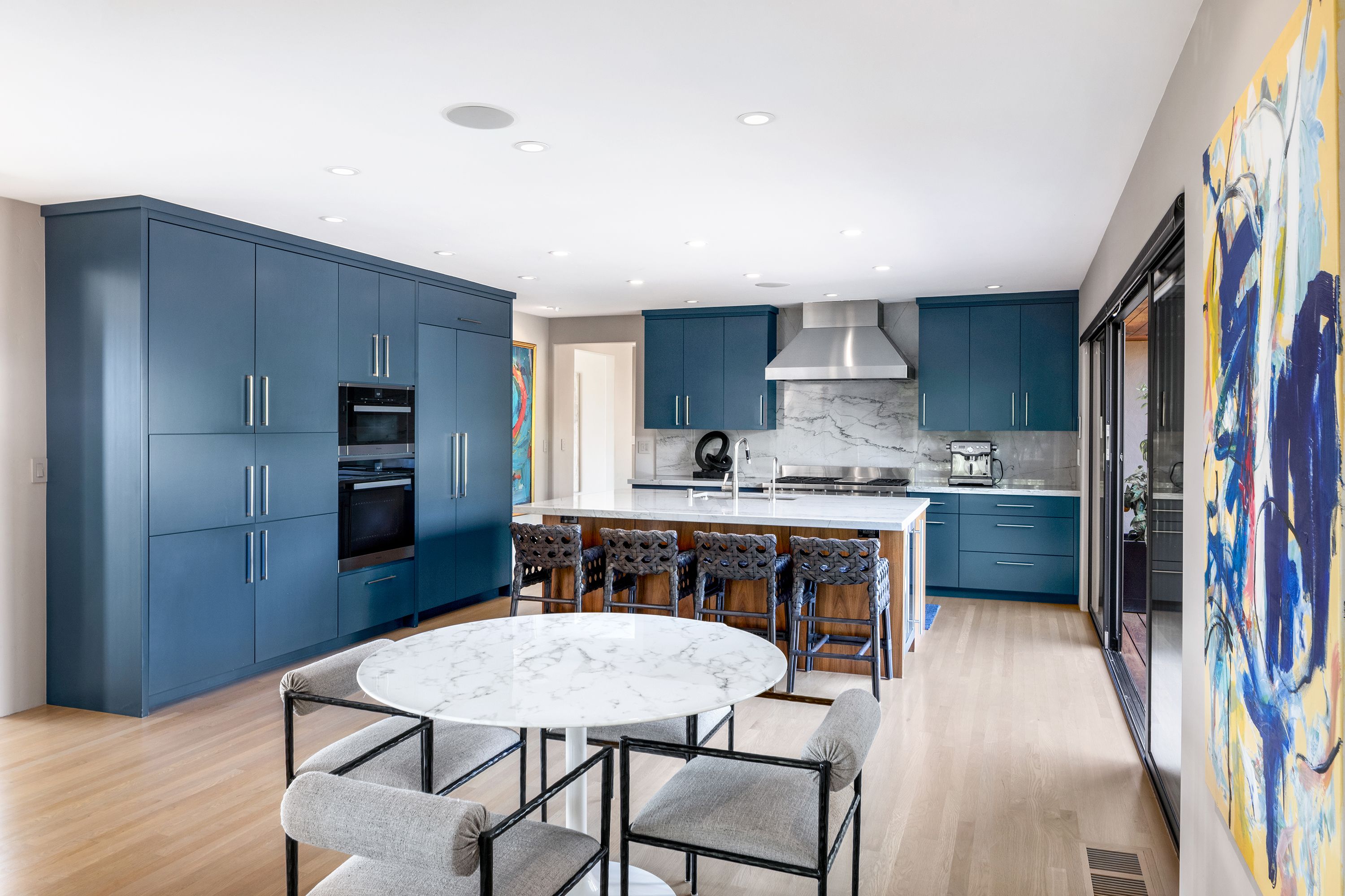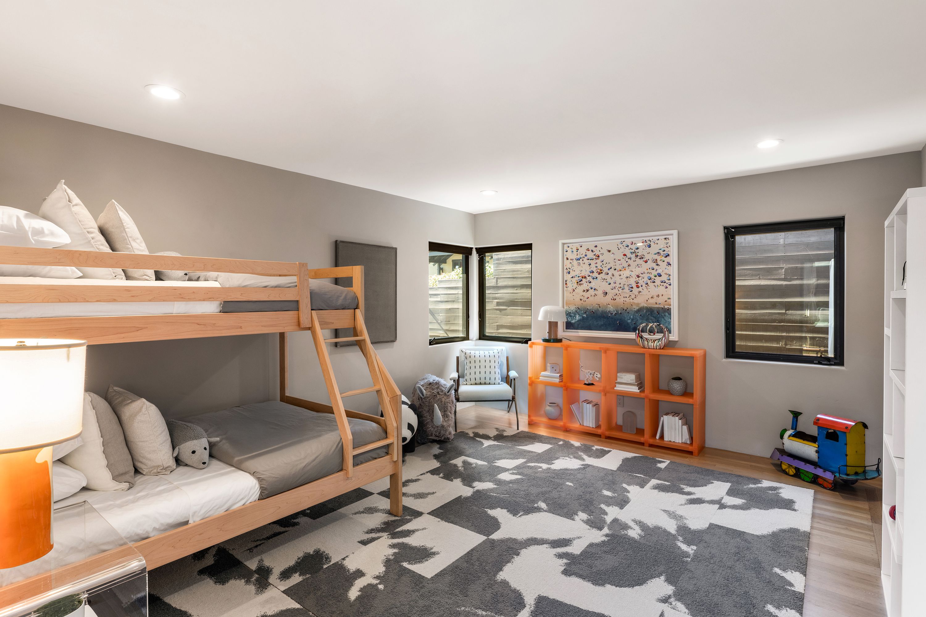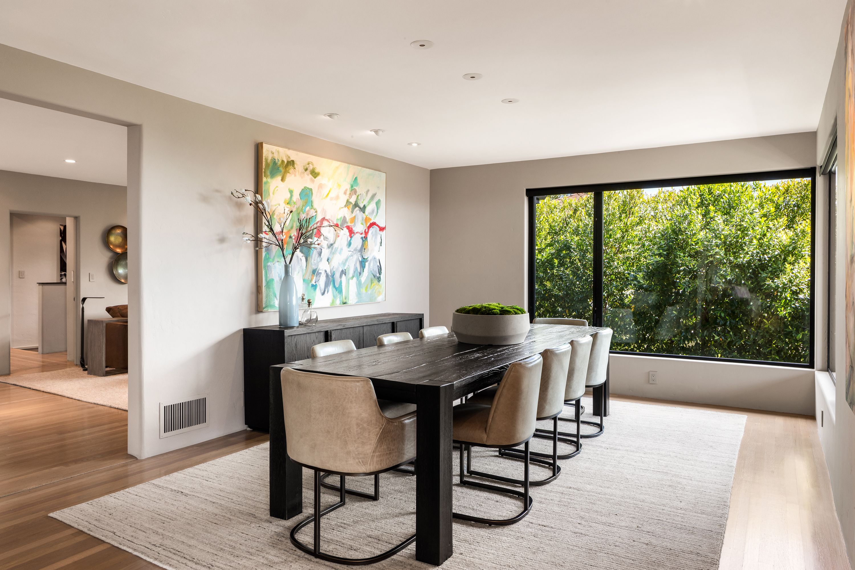 A private oasis designed for seamless indoor-outdoor living, inspired by the understated elegance of luxury hospitality. Thoughtfully reimagined, this residence blends refined contemporary design with exceptional comfort, functionality, and a true sense of retreat.The home offers five bedrooms and four full and two half bathrooms, including three en-suite retreats. Each bathroom is appointed with sophisticated finishes and clean modern fixtures. The primary suite is a sanctuary of its own, featuring a spa-like bathroom with an expansive multi-head shower, steam feature, built-in bench, and a calm, restorative atmosphere.At the center of the home, the chef’s kitchen is both striking and highly functional, appointed with premium Wolf, Sub-Zero, and Miele appliances, dual wine refrigerators, and custom cabinetry. Designed for both cooking and gathering, it flows effortlessly into the main living spaces and out to the expansive deck.Outdoor living is a defining feature. A resort-inspired courtyard unfolds with Thermory decking, a fire pit lounge, and multiple areas for entertaining and relaxation, including a basketball court and climbing wall. A private plunge pool/spa and cabana-style seating overlook the Bay, creating a serene, retreat-like setting that feels both playful and elevated.The living room is dramatic yet inviting, anchored by a nearly 30-foot-wide window wall that fills the space with natural light while framing views of the landscaped grounds, downtown Oakland, and San Francisco. A formal dining room comfortably accommodates large gatherings, while three dedicated workspaces—including a spacious office and two library/study niches with custom built-ins—support the needs of modern living.Originally designed by noted architect Bennett Christopherson and later refined by Thornton Weiler, the home was extensively rebuilt in 2021 by Buestad Construction. The grounds were reimagined by award-winning landscape architect David Thorne, creating a seamless integration of architecture and landscape.In addition to the main living areas, a finished lower level offers a large entertaining room, gym, bathroom, wine room, and generous storage—adding flexibility to a home that is as functional as it is beautifully conceived.Rarely does a home achieve this level of architectural clarity, privacy, and livability—where thoughtful design, exceptional craftsmanship, and a true sense of escape come together so effortlessly.