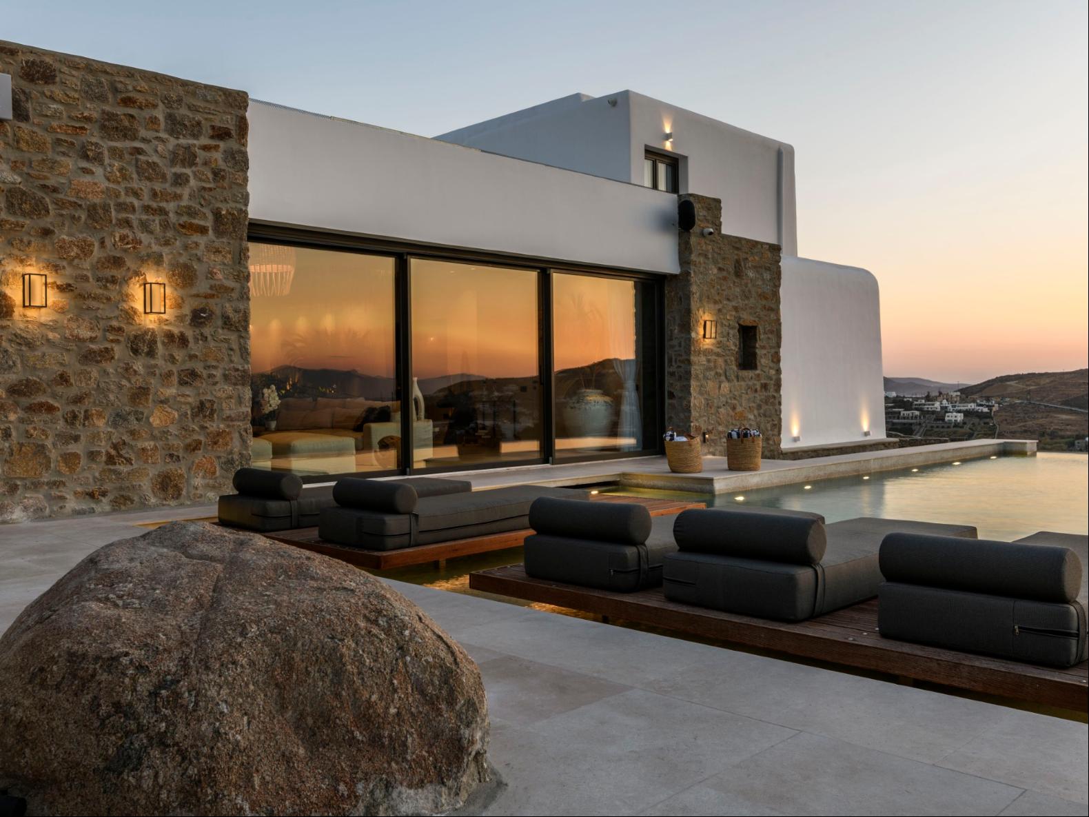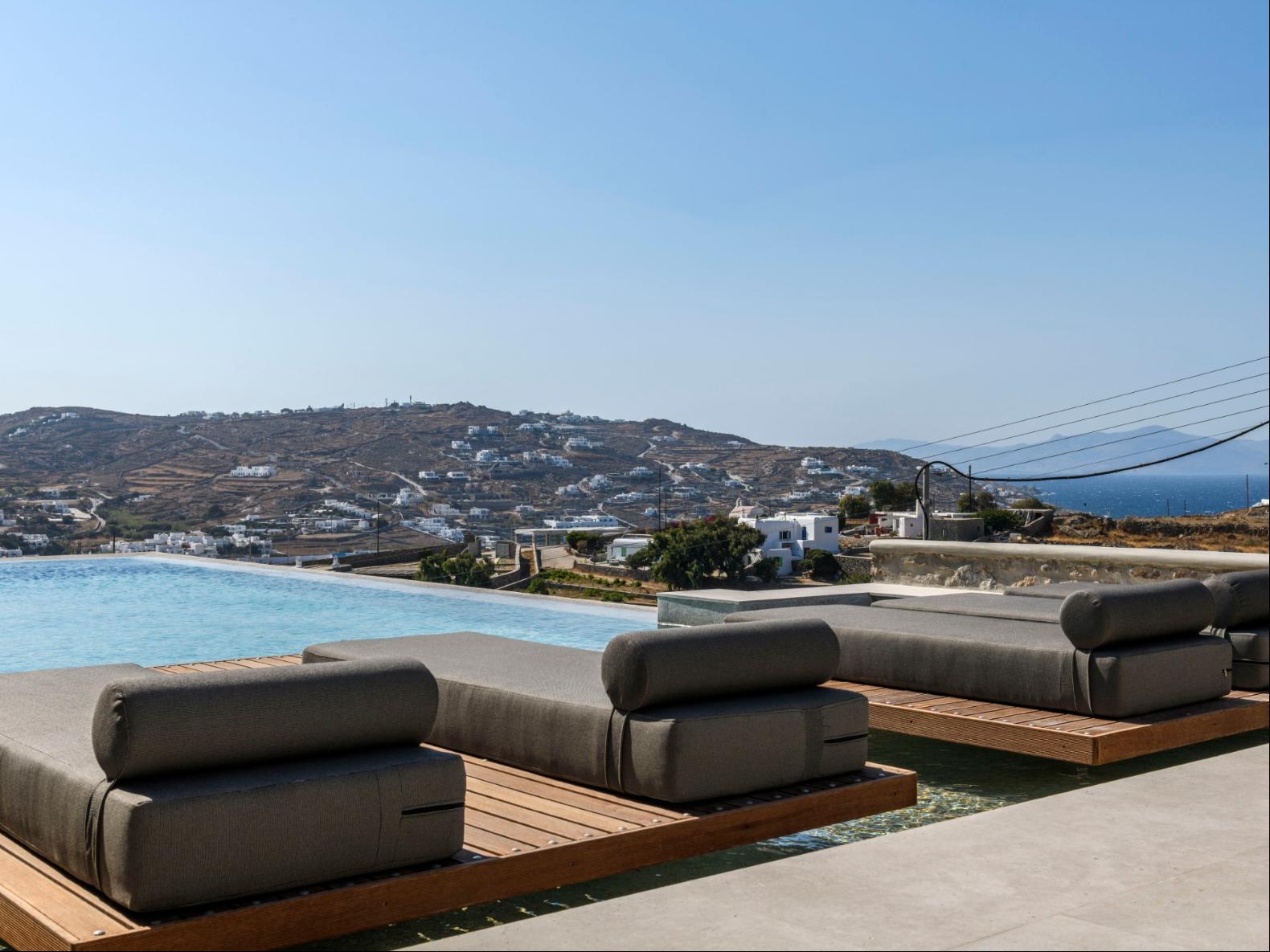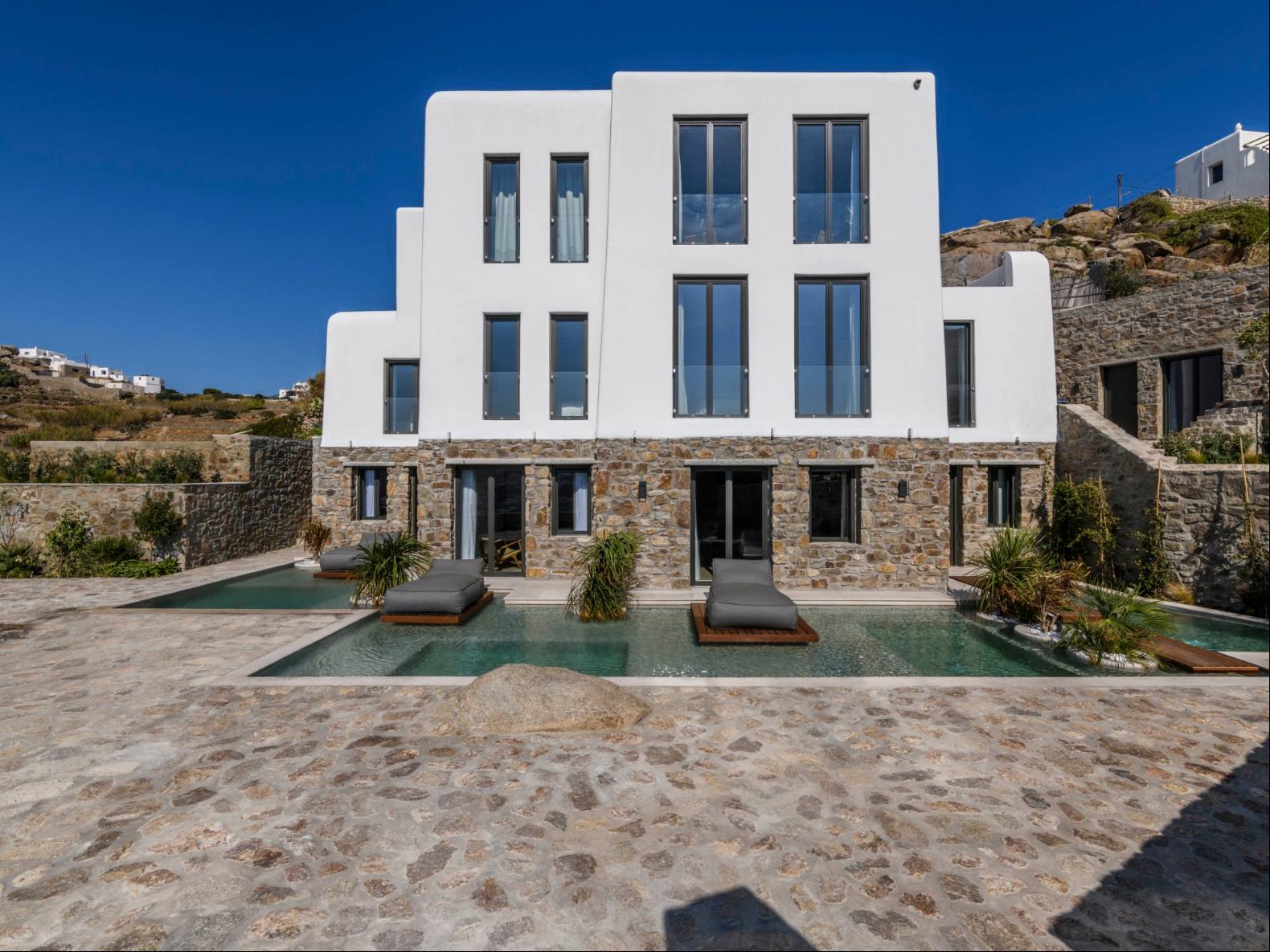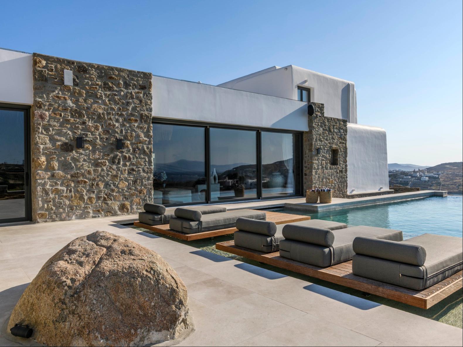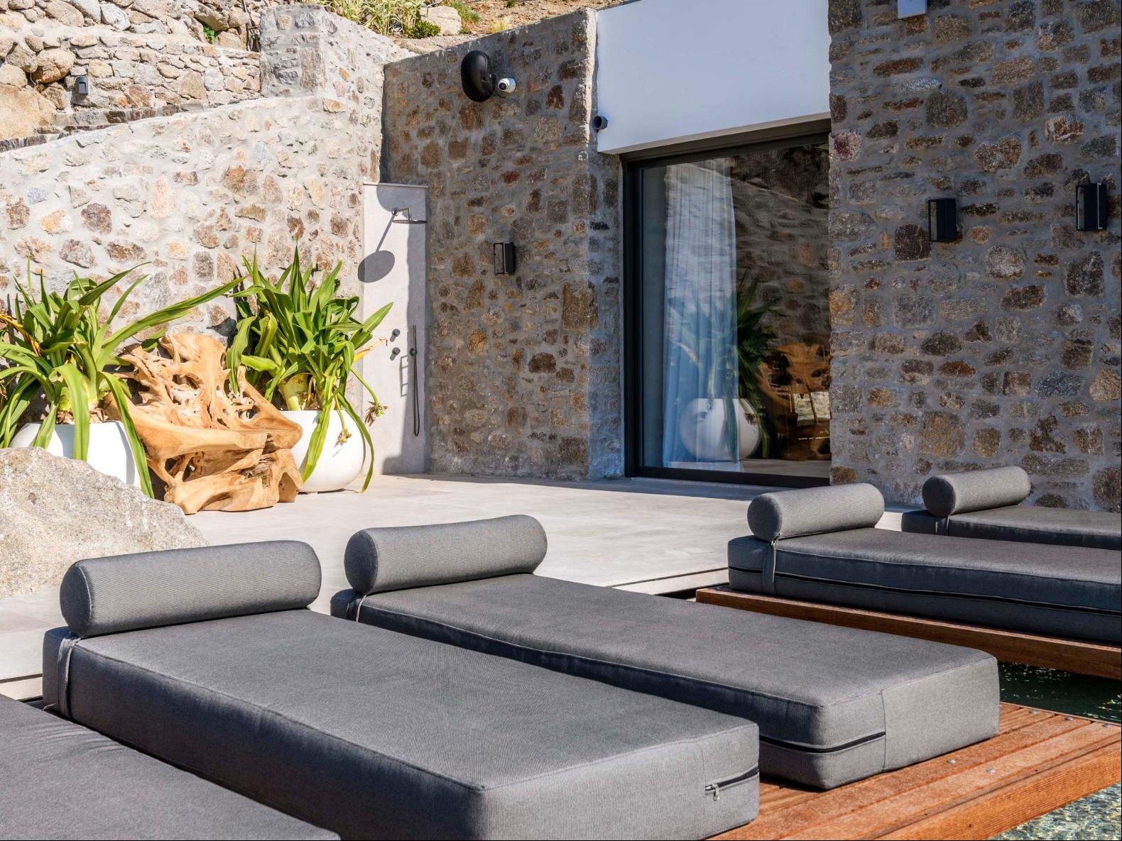 A true jewel in an ideal location, this exquisite estate offers uninterrupted views of the Aegean Sea and the surrounding islands. Also, this stylish and modern Villa is located next to the cosmopolitan Ornos Beach and Mykonos Town. The property can accommodate up to 20 guests. It consists of three levels; the lower, the main, and the upper floor. On the lower level, you can find 2 double bedrooms with en-suite bathrooms, independent entrance and an amazing pool and sea view. On the main level, there are 3 double bedrooms with en-suite bathrooms, a spacious living and dining area, and a fully equipped kitchen with a wine cellar and a cigar bar. Additionally, on the main level, there are 3 bedrooms with en-suite bathrooms, independent entrance and elegant boho aesthetics. On the upper level, there are 2 bedrooms with independent entrance on a natural cliff with an en-suite bathroom and a stunning sea view. The property also offers a staff room next to the parking area. The property can accommodate up to 20 guests. It consists of three levels; the lower, the main, and the upper floor. On the lower level, you can find 2 double bedrooms with en-suite bathrooms, independent entrance and an amazing pool and sea view. On the main level, there are 3 double bedrooms with en-suite bathrooms, a spacious living and dining area, and a fully equipped kitchen with a wine cellar and a cigar bar. Additionally, on the main level, there are 3 bedrooms with en-suite bathrooms, independent entrance and elegant boho aesthetics. On the upper level, there are 2 bedrooms with independent entrance on a natural cliff with an en-suite bathroom and a stunning sea view. The property also offers a staff room next to the parking area. This contemporary estate showcases a modern design with elegant, stylish touches throughout both the interior and outdoor spaces.. Guests can use the sunbeds around the pool in order to have a drink, relax and enjoy the spectacular views with their beloved ones. This Villa is ideal either for friends who want to have the time of their lives or for a family who wants to spend unforgettable moments altogether.