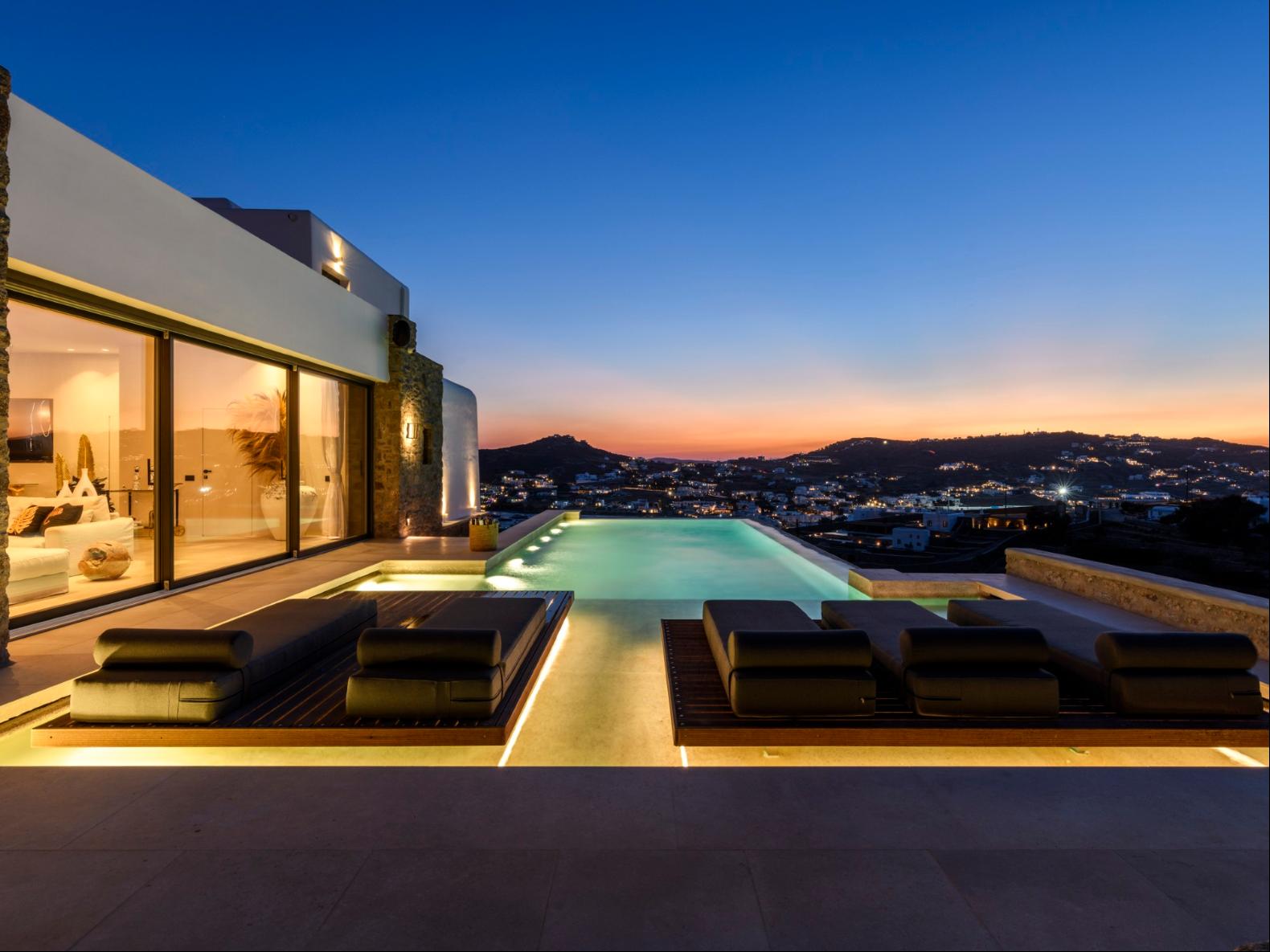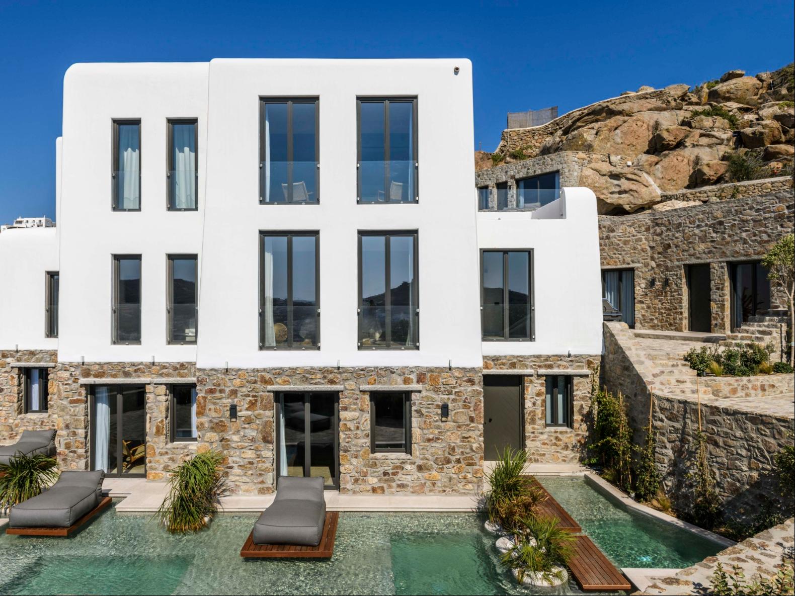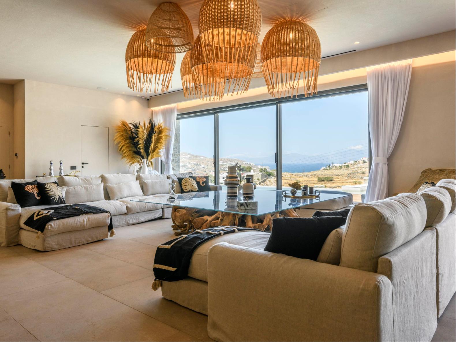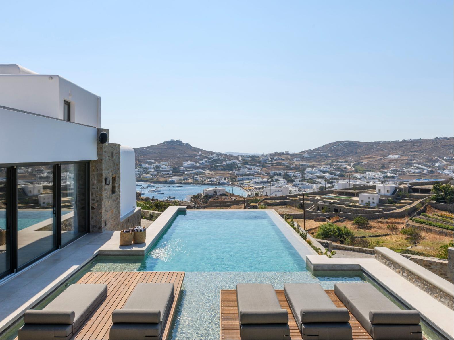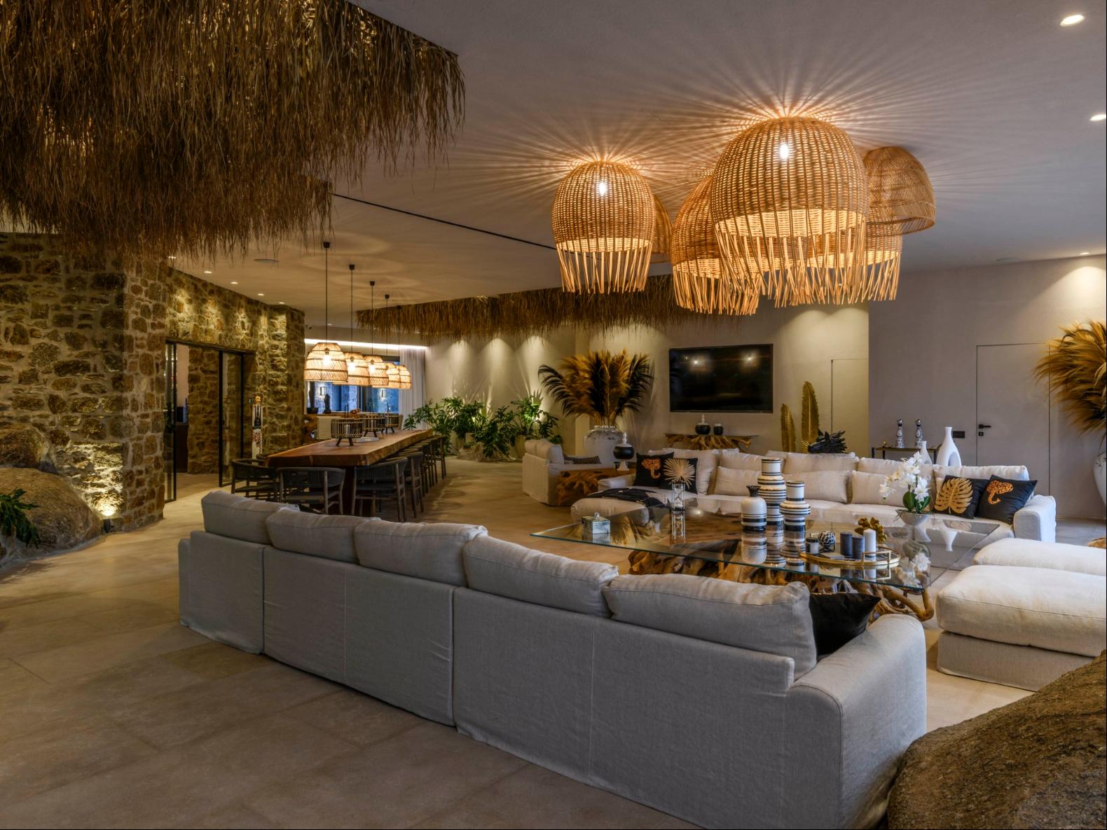 A true jewel in an ideal location, this exquisite estate offers uninterrupted views of the Aegean Sea and the surrounding islands. Also, this stylish and modern Villa is located next to the cosmopolitan Ornos Beach and Mykonos Town. The property can accommodate up to 20 guests. It consists of three levels; the lower, the main, and the upper floor. On the lower level, you can find 2 double bedrooms with en-suite bathrooms, independent entrance and an amazing pool and sea view. On the main level, there are 3 double bedrooms with en-suite bathrooms, a spacious living and dining area, and a fully equipped kitchen with a wine cellar and a cigar bar. Additionally, on the main level, there are 3 bedrooms with en-suite bathrooms, independent entrance and elegant boho aesthetics. On the upper level, there are 2 bedrooms with independent entrance on a natural cliff with an en-suite bathroom and a stunning sea view. The property also offers a staff room next to the parking area. The property can accommodate up to 20 guests. It consists of three levels; the lower, the main, and the upper floor. On the lower level, you can find 2 double bedrooms with en-suite bathrooms, independent entrance and an amazing pool and sea view. On the main level, there are 3 double bedrooms with en-suite bathrooms, a spacious living and dining area, and a fully equipped kitchen with a wine cellar and a cigar bar. Additionally, on the main level, there are 3 bedrooms with en-suite bathrooms, independent entrance and elegant boho aesthetics. On the upper level, there are 2 bedrooms with independent entrance on a natural cliff with an en-suite bathroom and a stunning sea view. The property also offers a staff room next to the parking area. This contemporary estate showcases a modern design with elegant, stylish touches throughout both the interior and outdoor spaces.. Guests can use the sunbeds around the pool in order to have a drink, relax and enjoy the spectacular views with their beloved ones. This Villa is ideal either for friends who want to have the time of their lives or for a family who wants to spend unforgettable moments altogether.