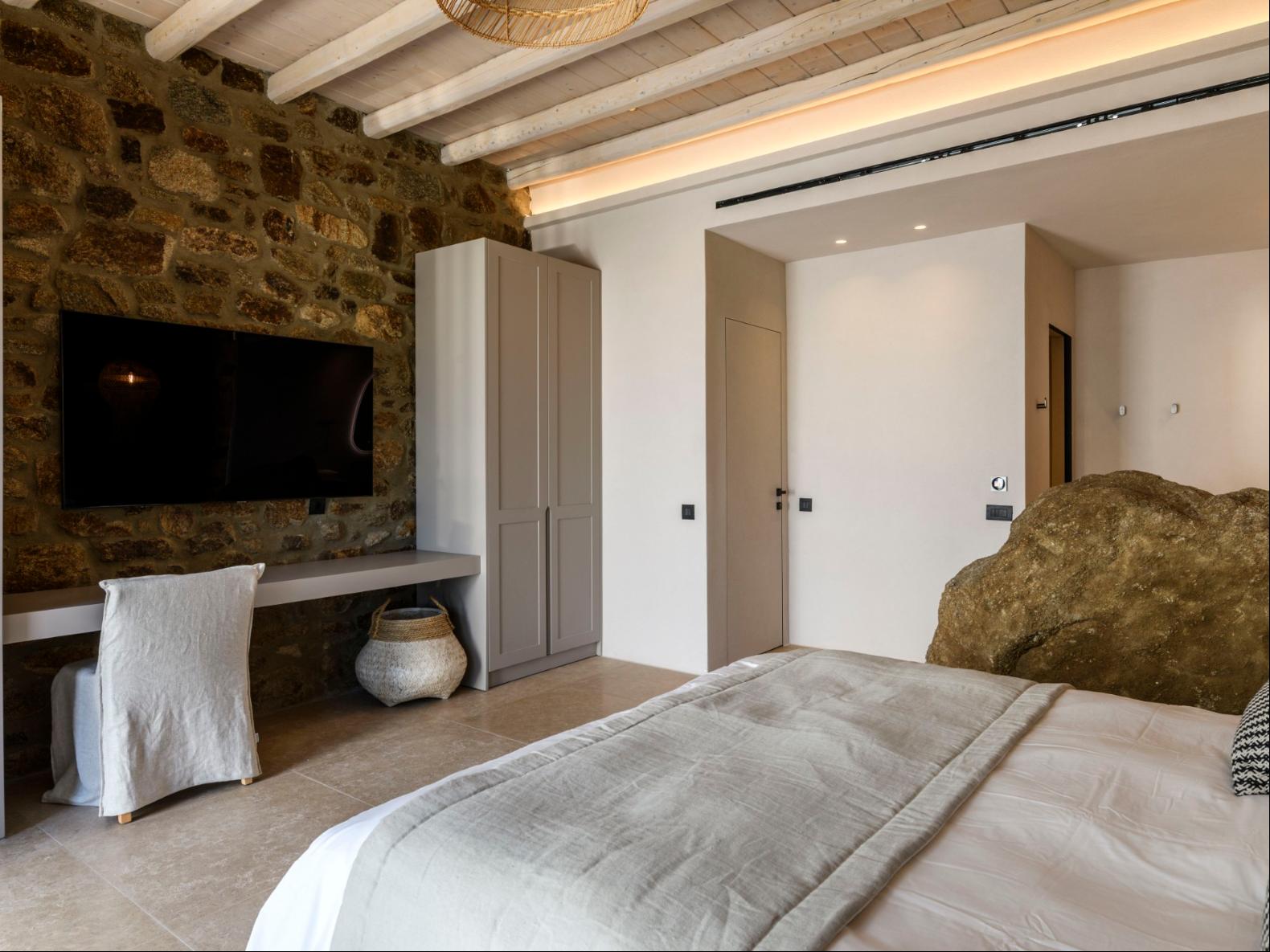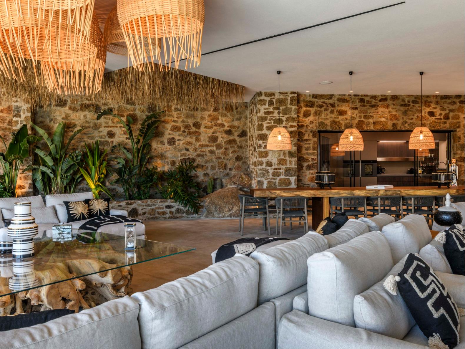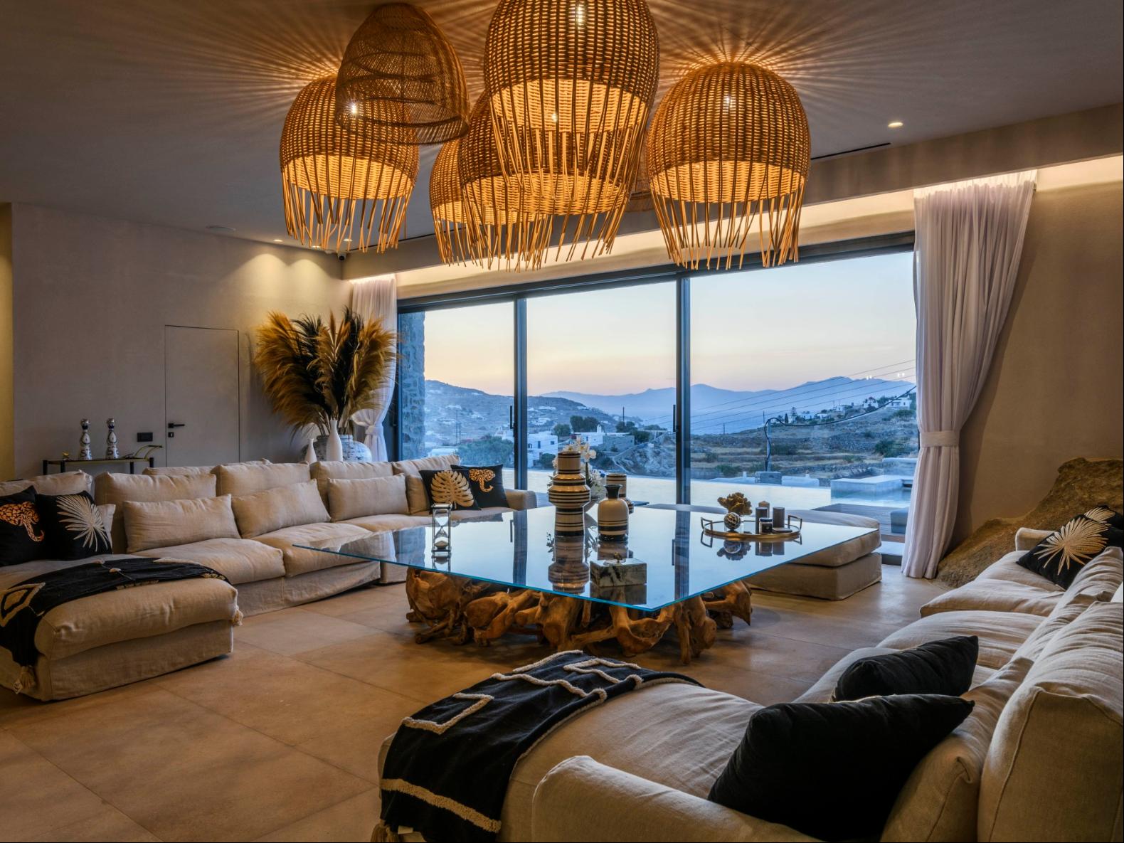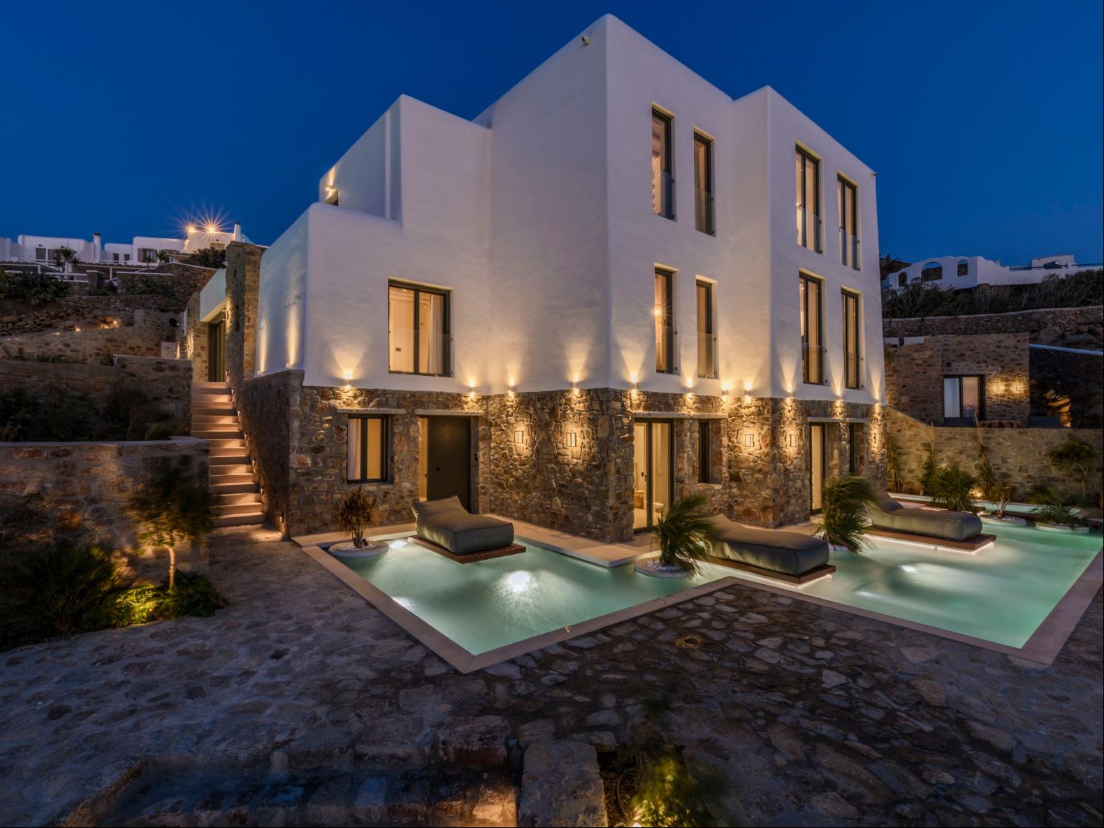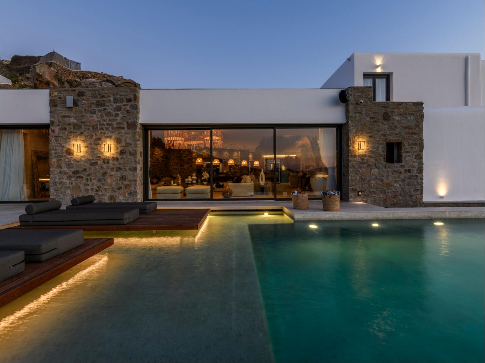 A true jewel in an ideal location, this exquisite estate offers uninterrupted views of the Aegean Sea and the surrounding islands. Also, this stylish and modern Villa is located next to the cosmopolitan Ornos Beach and Mykonos Town. The property can accommodate up to 20 guests. It consists of three levels; the lower, the main, and the upper floor. On the lower level, you can find 2 double bedrooms with en-suite bathrooms, independent entrance and an amazing pool and sea view. On the main level, there are 3 double bedrooms with en-suite bathrooms, a spacious living and dining area, and a fully equipped kitchen with a wine cellar and a cigar bar. Additionally, on the main level, there are 3 bedrooms with en-suite bathrooms, independent entrance and elegant boho aesthetics. On the upper level, there are 2 bedrooms with independent entrance on a natural cliff with an en-suite bathroom and a stunning sea view. The property also offers a staff room next to the parking area. The property can accommodate up to 20 guests. It consists of three levels; the lower, the main, and the upper floor. On the lower level, you can find 2 double bedrooms with en-suite bathrooms, independent entrance and an amazing pool and sea view. On the main level, there are 3 double bedrooms with en-suite bathrooms, a spacious living and dining area, and a fully equipped kitchen with a wine cellar and a cigar bar. Additionally, on the main level, there are 3 bedrooms with en-suite bathrooms, independent entrance and elegant boho aesthetics. On the upper level, there are 2 bedrooms with independent entrance on a natural cliff with an en-suite bathroom and a stunning sea view. The property also offers a staff room next to the parking area. This contemporary estate showcases a modern design with elegant, stylish touches throughout both the interior and outdoor spaces.. Guests can use the sunbeds around the pool in order to have a drink, relax and enjoy the spectacular views with their beloved ones. This Villa is ideal either for friends who want to have the time of their lives or for a family who wants to spend unforgettable moments altogether.