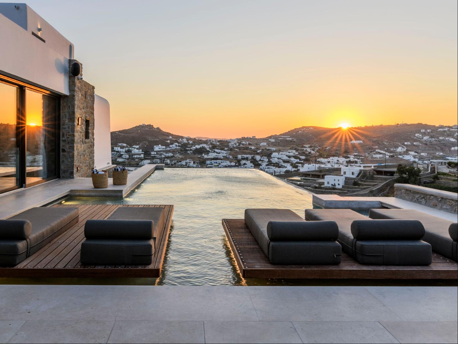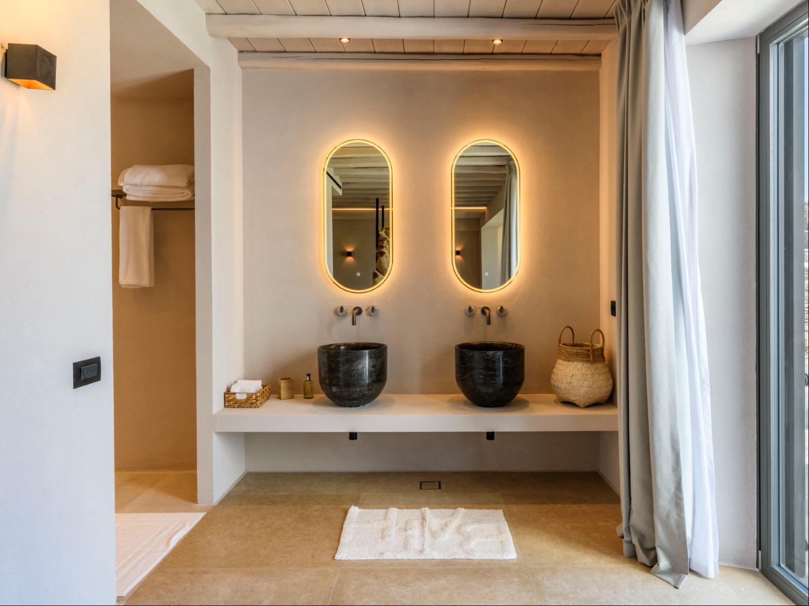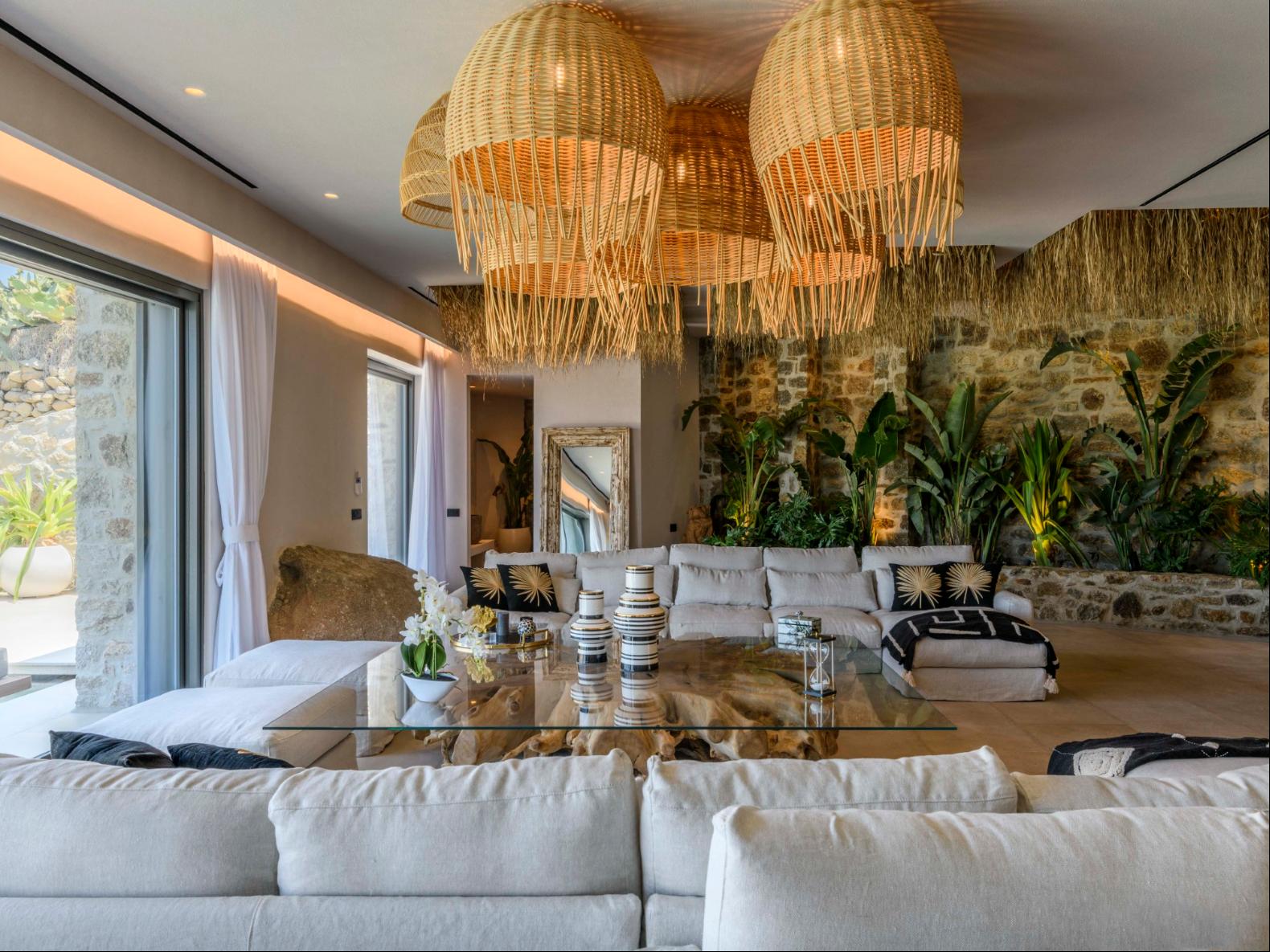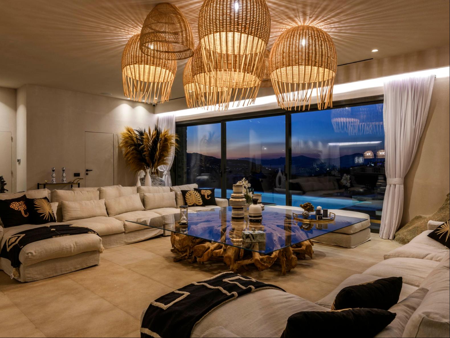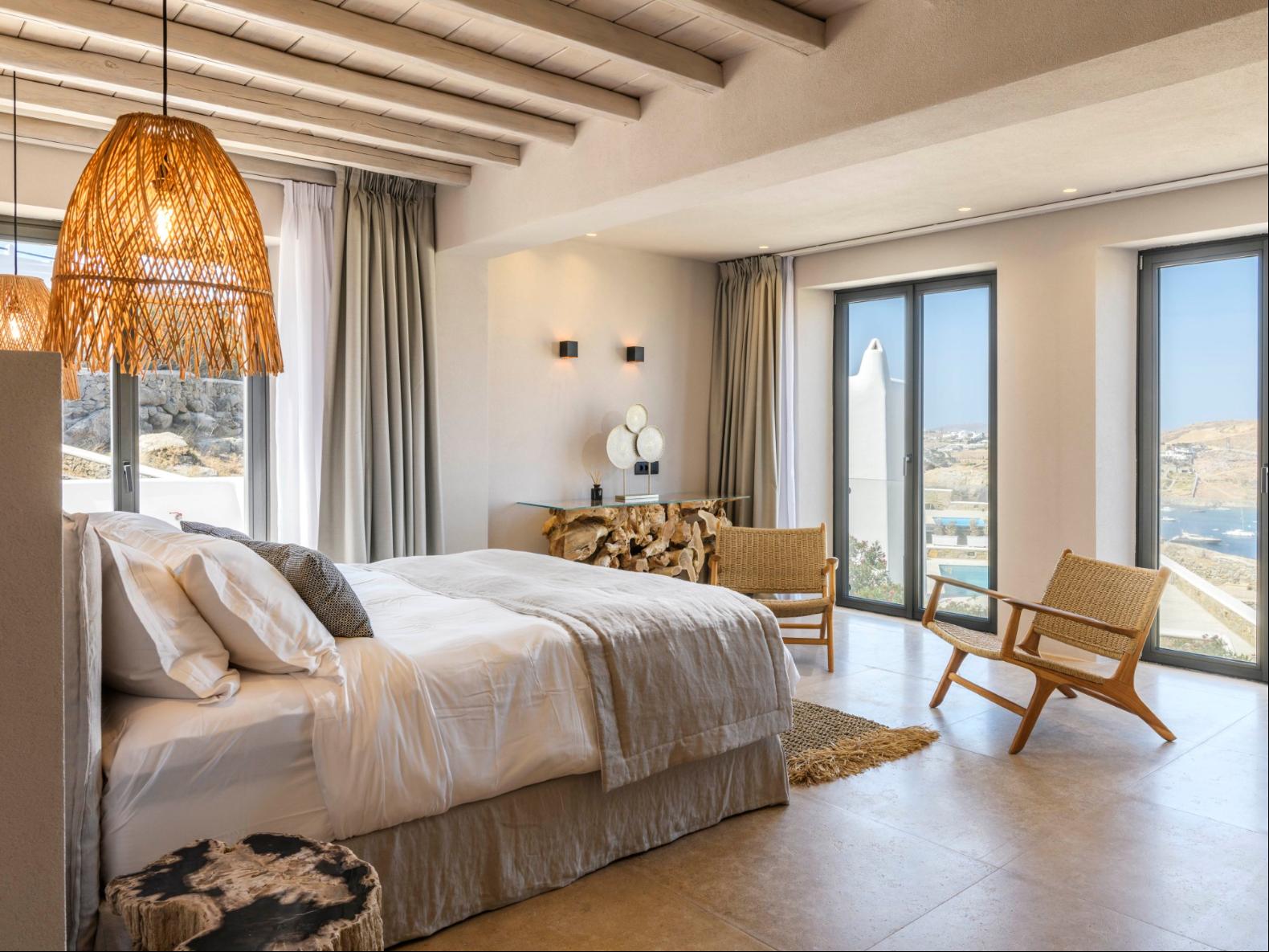 A true jewel in an ideal location, this exquisite estate offers uninterrupted views of the Aegean Sea and the surrounding islands. Also, this stylish and modern Villa is located next to the cosmopolitan Ornos Beach and Mykonos Town. The property can accommodate up to 20 guests. It consists of three levels; the lower, the main, and the upper floor. On the lower level, you can find 2 double bedrooms with en-suite bathrooms, independent entrance and an amazing pool and sea view. On the main level, there are 3 double bedrooms with en-suite bathrooms, a spacious living and dining area, and a fully equipped kitchen with a wine cellar and a cigar bar. Additionally, on the main level, there are 3 bedrooms with en-suite bathrooms, independent entrance and elegant boho aesthetics. On the upper level, there are 2 bedrooms with independent entrance on a natural cliff with an en-suite bathroom and a stunning sea view. The property also offers a staff room next to the parking area. The property can accommodate up to 20 guests. It consists of three levels; the lower, the main, and the upper floor. On the lower level, you can find 2 double bedrooms with en-suite bathrooms, independent entrance and an amazing pool and sea view. On the main level, there are 3 double bedrooms with en-suite bathrooms, a spacious living and dining area, and a fully equipped kitchen with a wine cellar and a cigar bar. Additionally, on the main level, there are 3 bedrooms with en-suite bathrooms, independent entrance and elegant boho aesthetics. On the upper level, there are 2 bedrooms with independent entrance on a natural cliff with an en-suite bathroom and a stunning sea view. The property also offers a staff room next to the parking area. This contemporary estate showcases a modern design with elegant, stylish touches throughout both the interior and outdoor spaces.. Guests can use the sunbeds around the pool in order to have a drink, relax and enjoy the spectacular views with their beloved ones. This Villa is ideal either for friends who want to have the time of their lives or for a family who wants to spend unforgettable moments altogether.