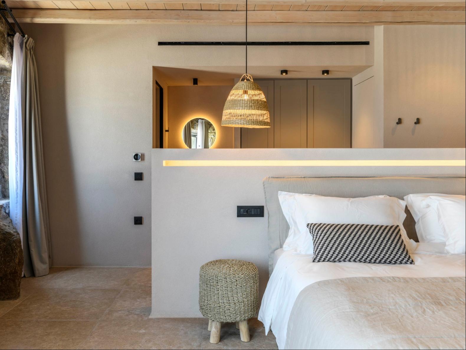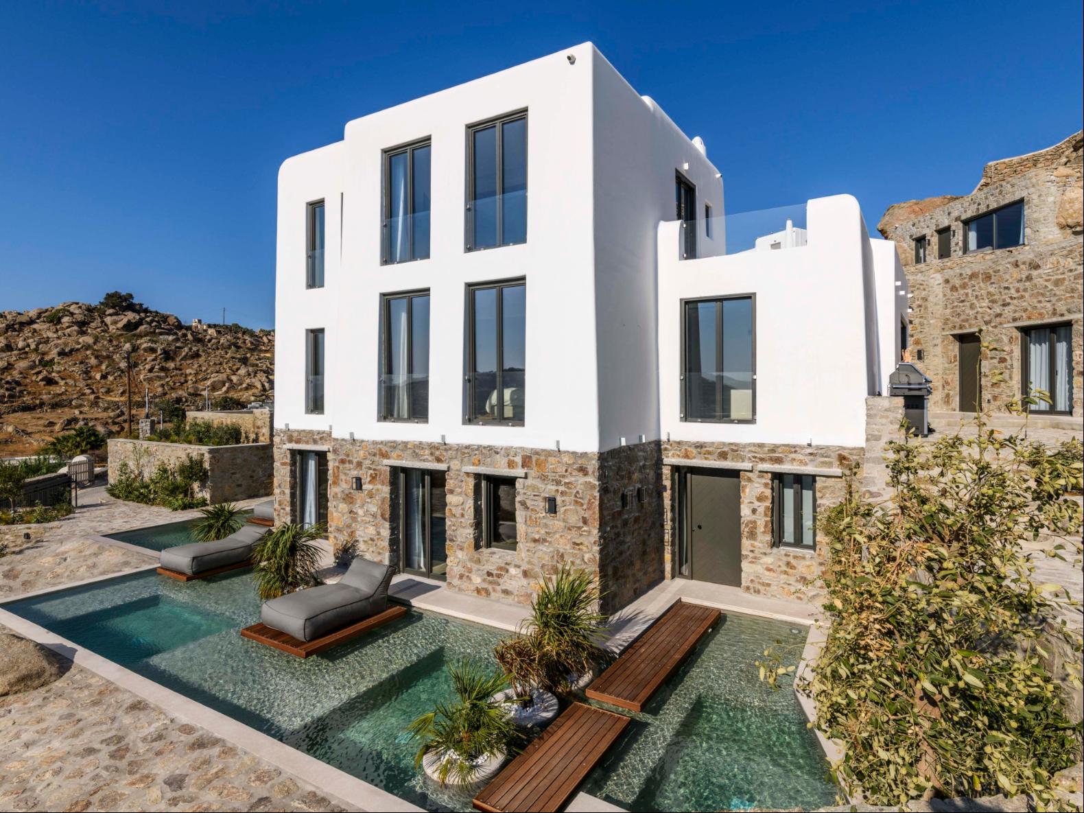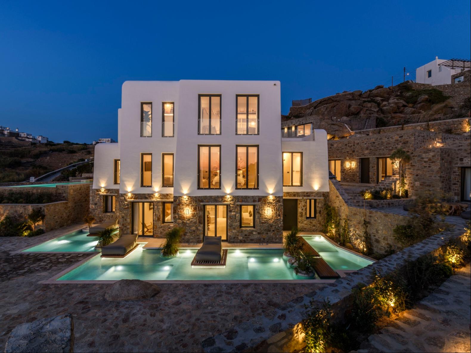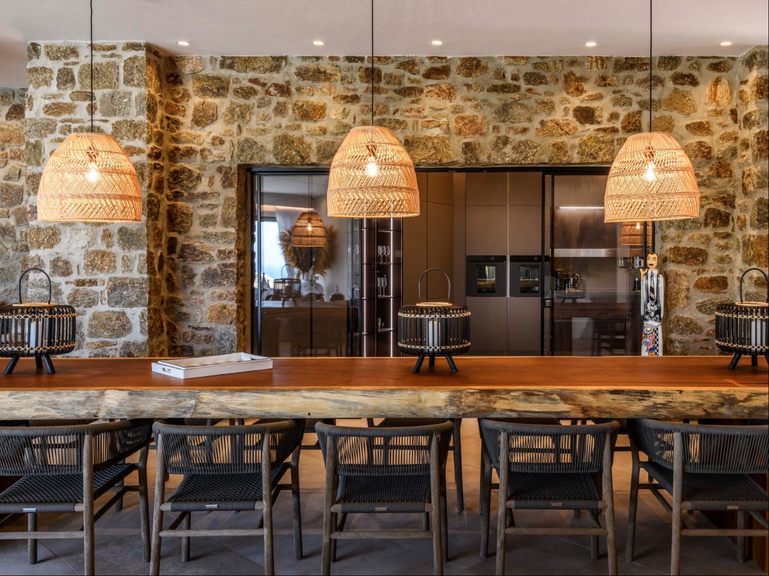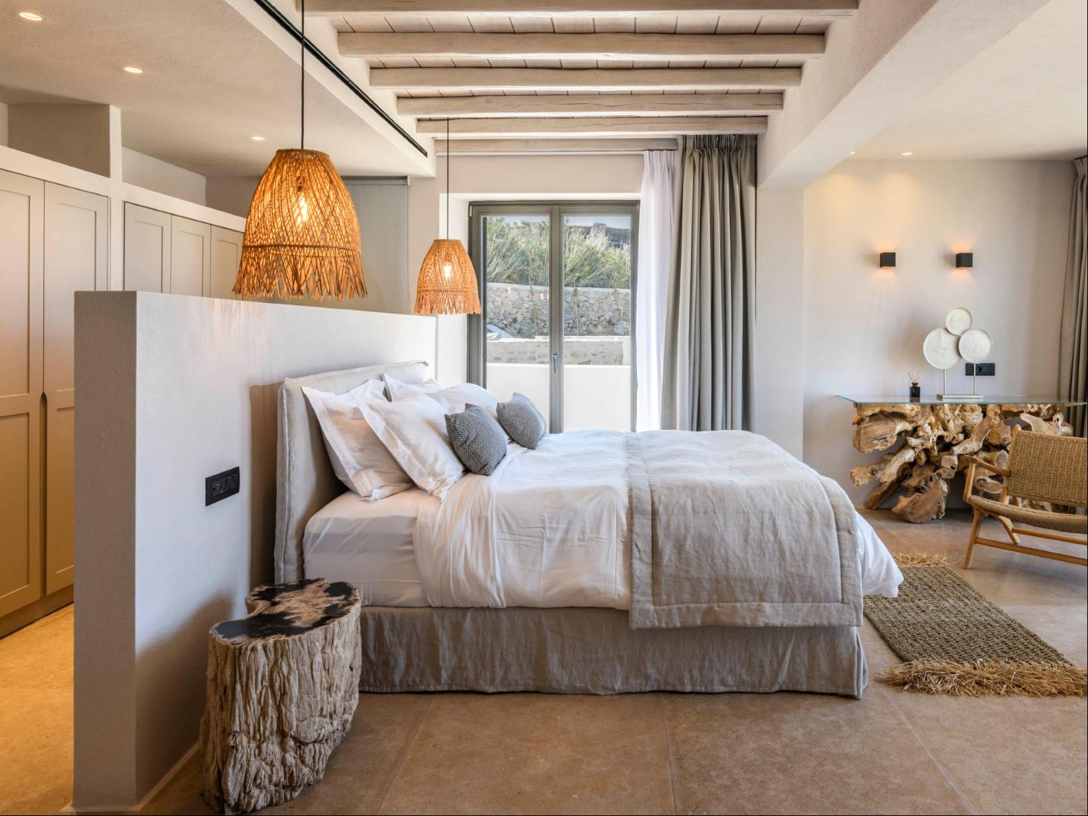 A true jewel in an ideal location, this exquisite estate offers uninterrupted views of the Aegean Sea and the surrounding islands. Also, this stylish and modern Villa is located next to the cosmopolitan Ornos Beach and Mykonos Town. The property can accommodate up to 20 guests. It consists of three levels; the lower, the main, and the upper floor. On the lower level, you can find 2 double bedrooms with en-suite bathrooms, independent entrance and an amazing pool and sea view. On the main level, there are 3 double bedrooms with en-suite bathrooms, a spacious living and dining area, and a fully equipped kitchen with a wine cellar and a cigar bar. Additionally, on the main level, there are 3 bedrooms with en-suite bathrooms, independent entrance and elegant boho aesthetics. On the upper level, there are 2 bedrooms with independent entrance on a natural cliff with an en-suite bathroom and a stunning sea view. The property also offers a staff room next to the parking area. The property can accommodate up to 20 guests. It consists of three levels; the lower, the main, and the upper floor. On the lower level, you can find 2 double bedrooms with en-suite bathrooms, independent entrance and an amazing pool and sea view. On the main level, there are 3 double bedrooms with en-suite bathrooms, a spacious living and dining area, and a fully equipped kitchen with a wine cellar and a cigar bar. Additionally, on the main level, there are 3 bedrooms with en-suite bathrooms, independent entrance and elegant boho aesthetics. On the upper level, there are 2 bedrooms with independent entrance on a natural cliff with an en-suite bathroom and a stunning sea view. The property also offers a staff room next to the parking area. This contemporary estate showcases a modern design with elegant, stylish touches throughout both the interior and outdoor spaces.. Guests can use the sunbeds around the pool in order to have a drink, relax and enjoy the spectacular views with their beloved ones. This Villa is ideal either for friends who want to have the time of their lives or for a family who wants to spend unforgettable moments altogether.