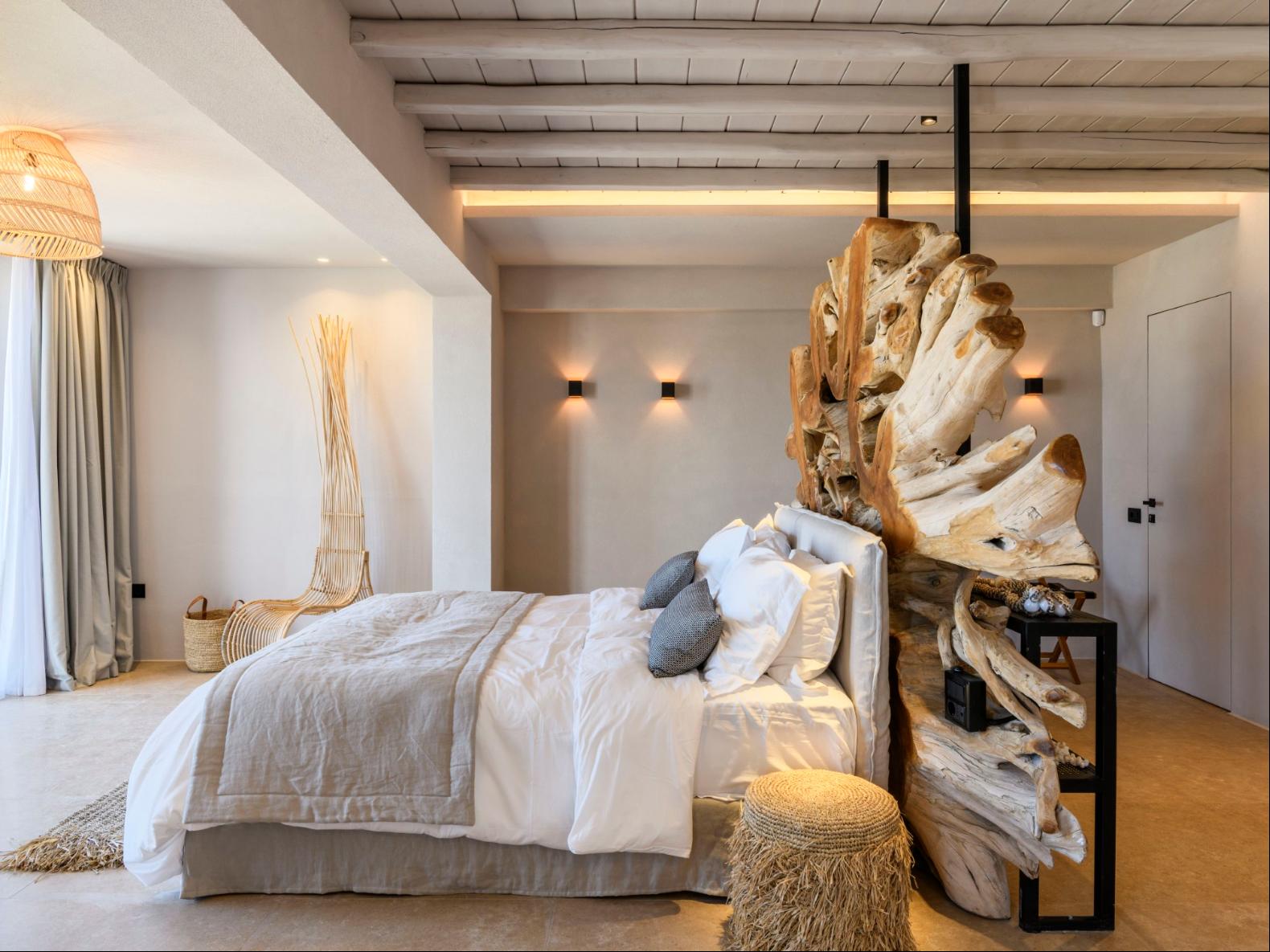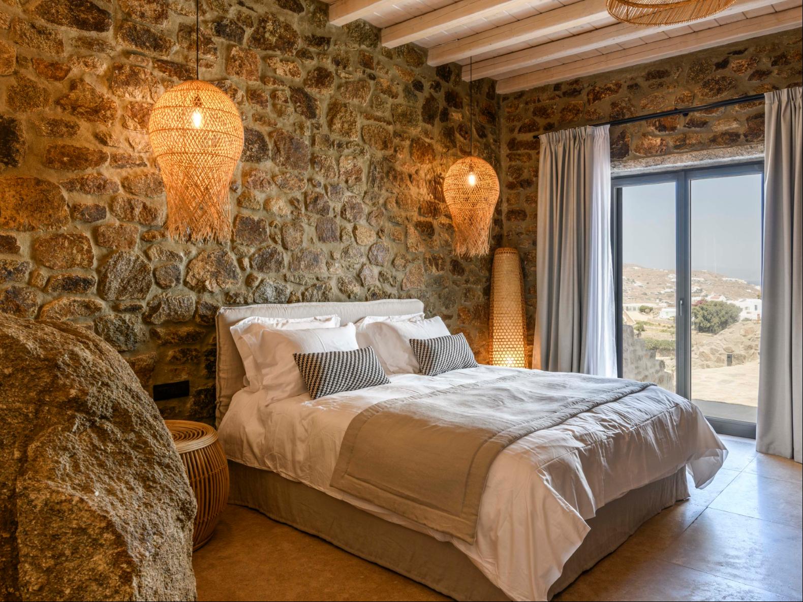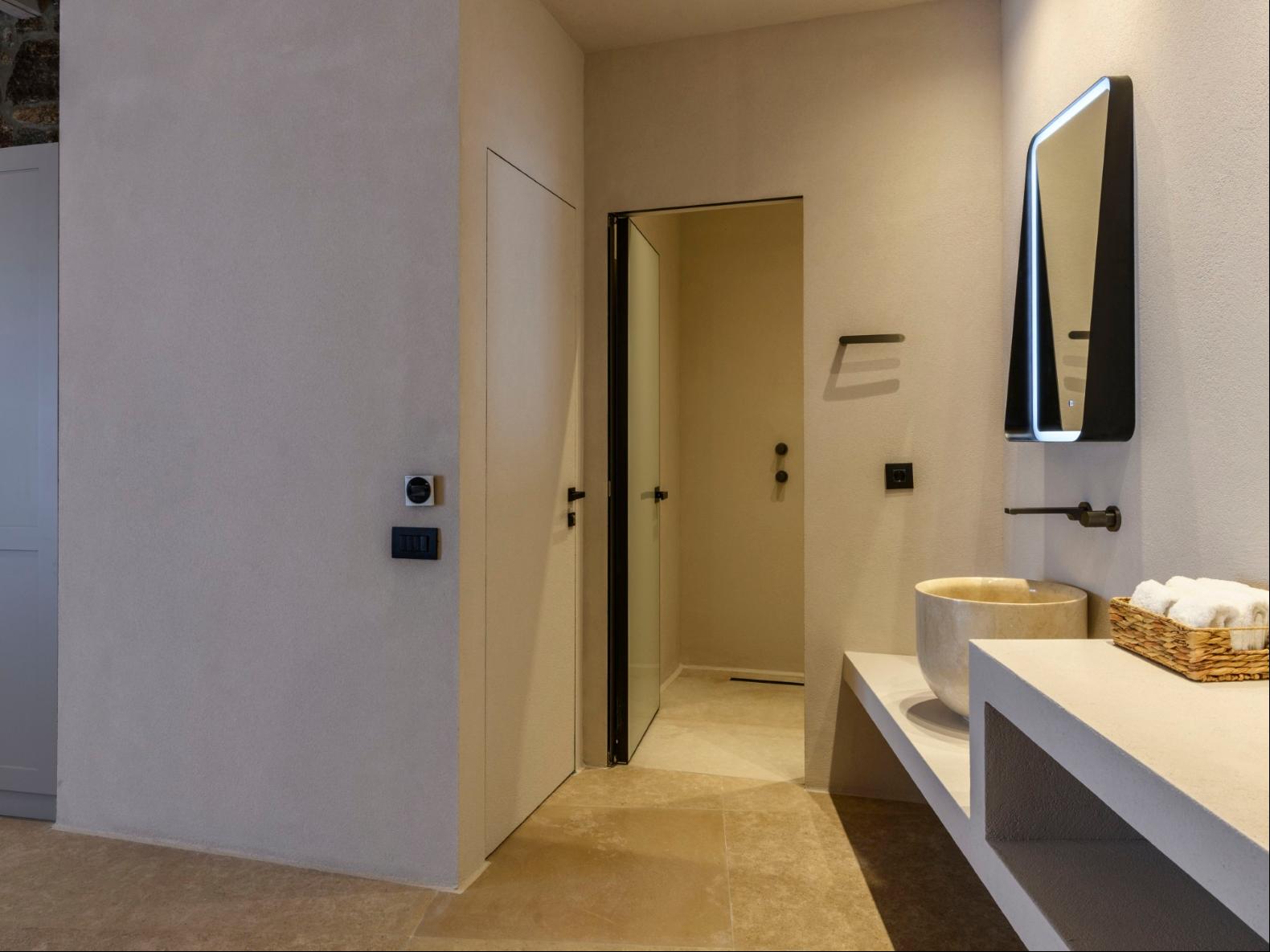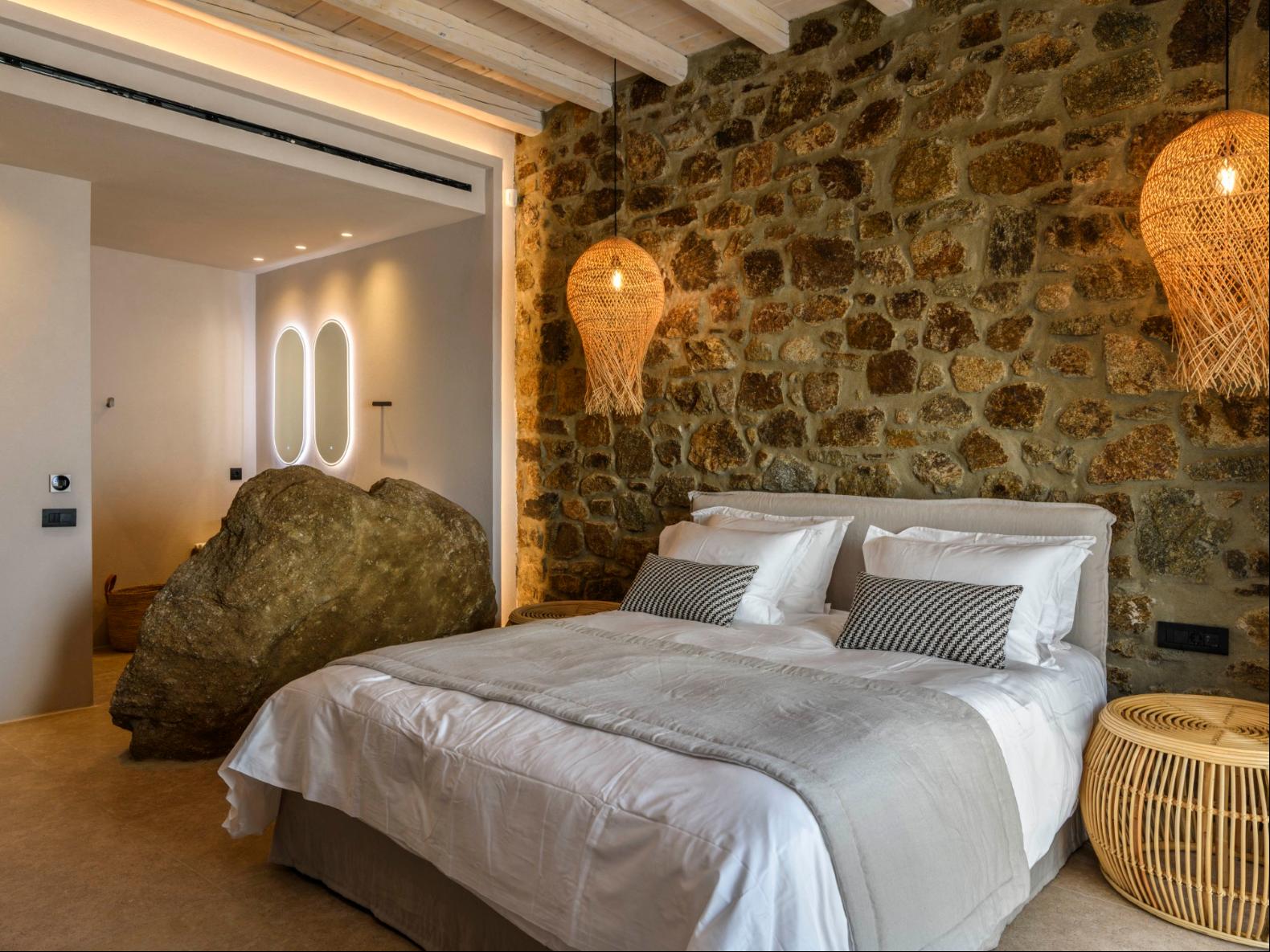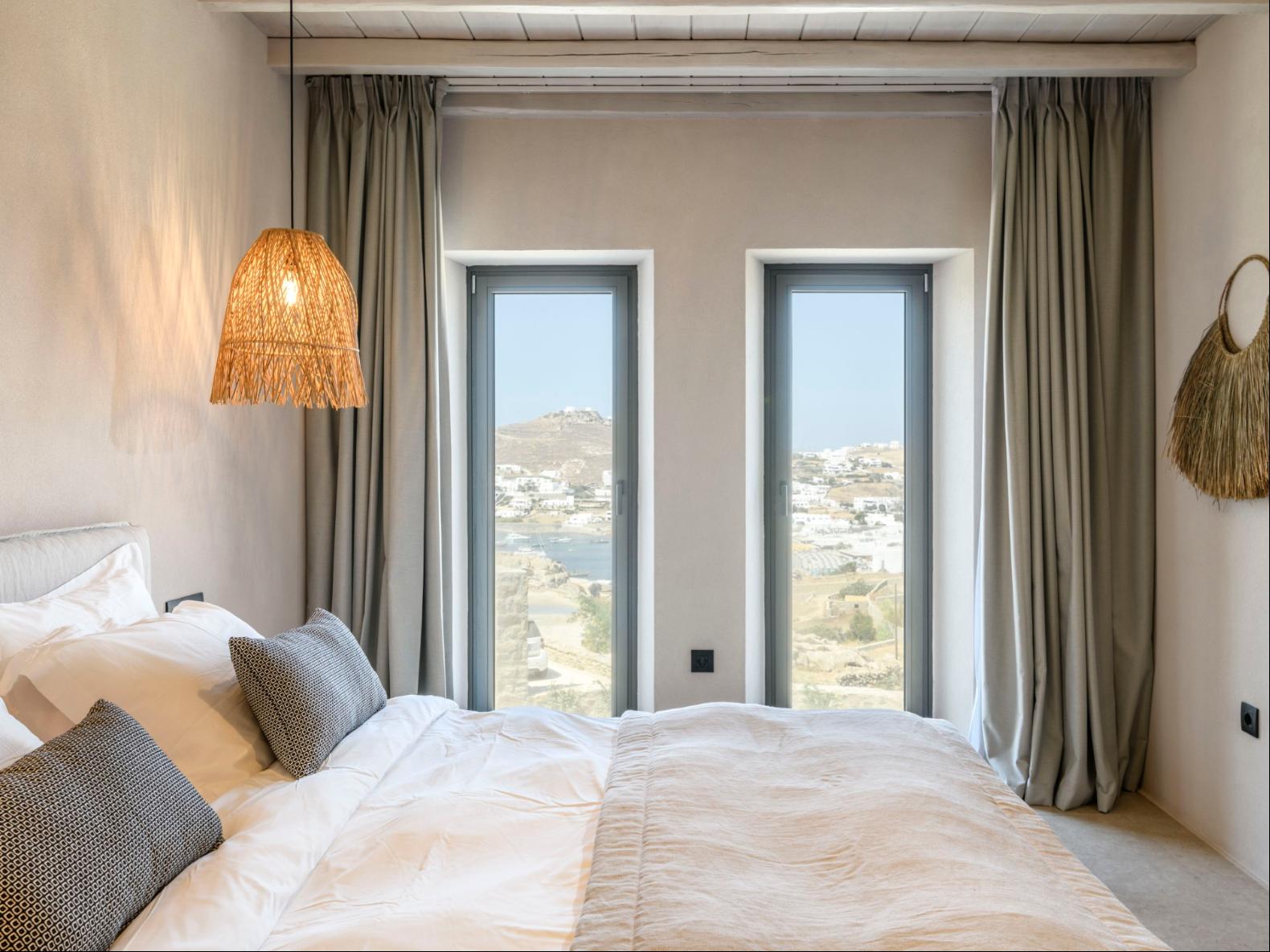 A true jewel in an ideal location, this exquisite estate offers uninterrupted views of the Aegean Sea and the surrounding islands. Also, this stylish and modern Villa is located next to the cosmopolitan Ornos Beach and Mykonos Town. The property can accommodate up to 20 guests. It consists of three levels; the lower, the main, and the upper floor. On the lower level, you can find 2 double bedrooms with en-suite bathrooms, independent entrance and an amazing pool and sea view. On the main level, there are 3 double bedrooms with en-suite bathrooms, a spacious living and dining area, and a fully equipped kitchen with a wine cellar and a cigar bar. Additionally, on the main level, there are 3 bedrooms with en-suite bathrooms, independent entrance and elegant boho aesthetics. On the upper level, there are 2 bedrooms with independent entrance on a natural cliff with an en-suite bathroom and a stunning sea view. The property also offers a staff room next to the parking area. The property can accommodate up to 20 guests. It consists of three levels; the lower, the main, and the upper floor. On the lower level, you can find 2 double bedrooms with en-suite bathrooms, independent entrance and an amazing pool and sea view. On the main level, there are 3 double bedrooms with en-suite bathrooms, a spacious living and dining area, and a fully equipped kitchen with a wine cellar and a cigar bar. Additionally, on the main level, there are 3 bedrooms with en-suite bathrooms, independent entrance and elegant boho aesthetics. On the upper level, there are 2 bedrooms with independent entrance on a natural cliff with an en-suite bathroom and a stunning sea view. The property also offers a staff room next to the parking area. This contemporary estate showcases a modern design with elegant, stylish touches throughout both the interior and outdoor spaces.. Guests can use the sunbeds around the pool in order to have a drink, relax and enjoy the spectacular views with their beloved ones. This Villa is ideal either for friends who want to have the time of their lives or for a family who wants to spend unforgettable moments altogether.