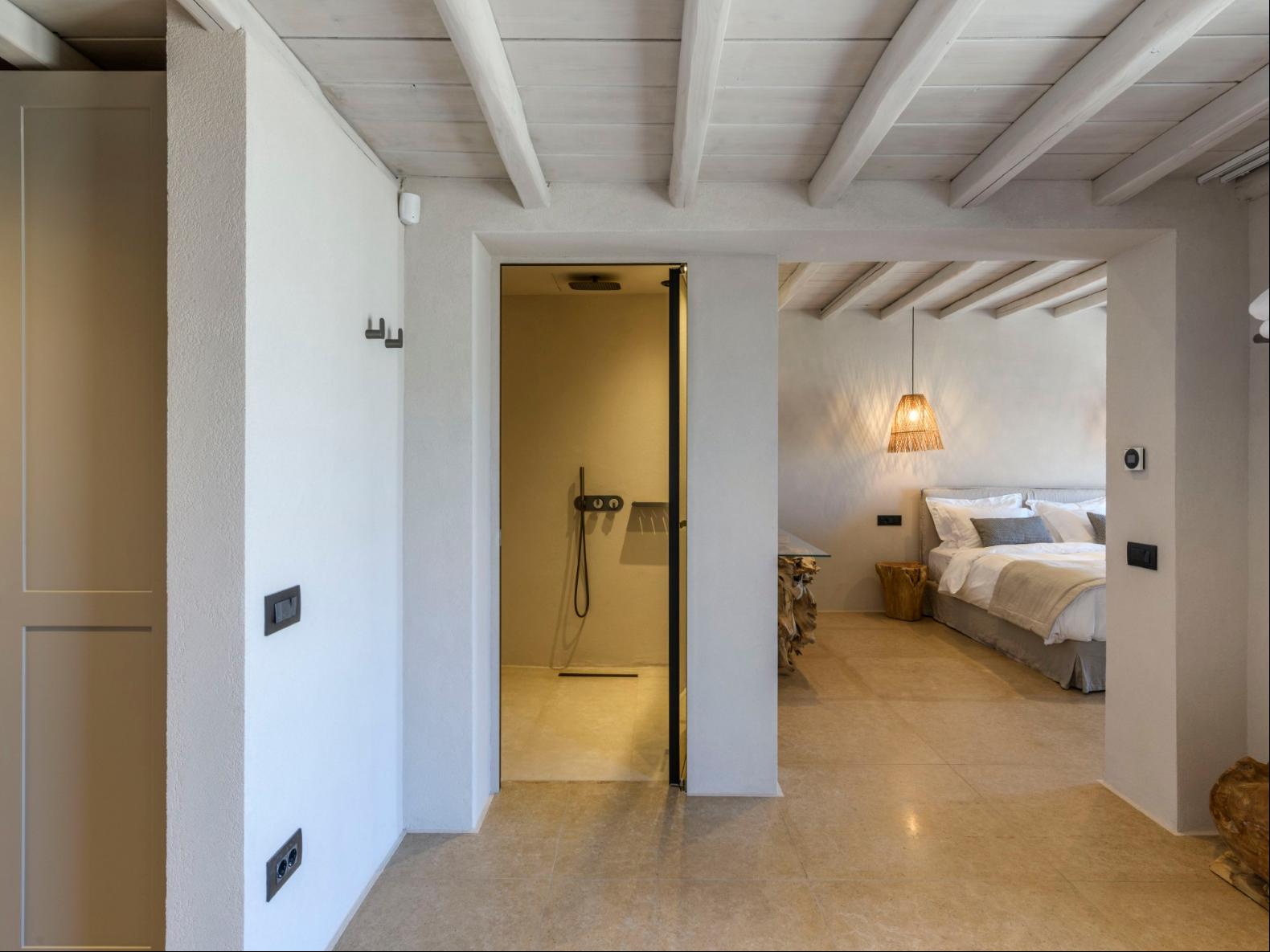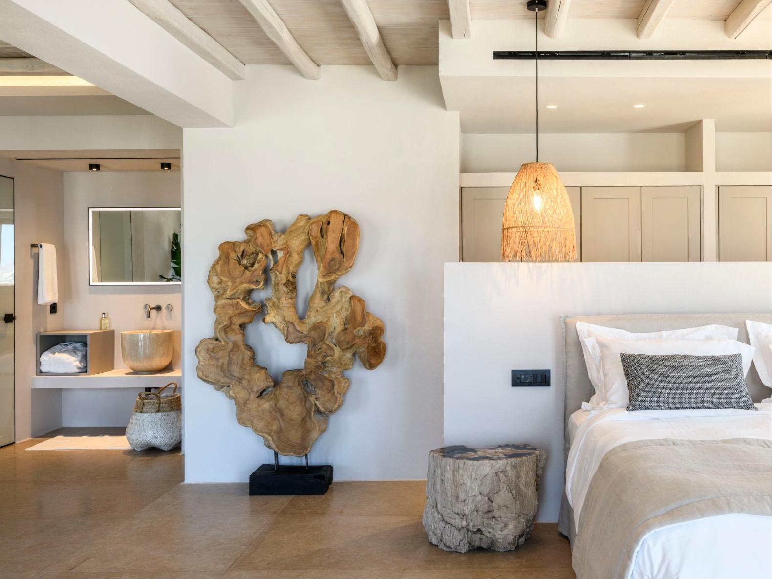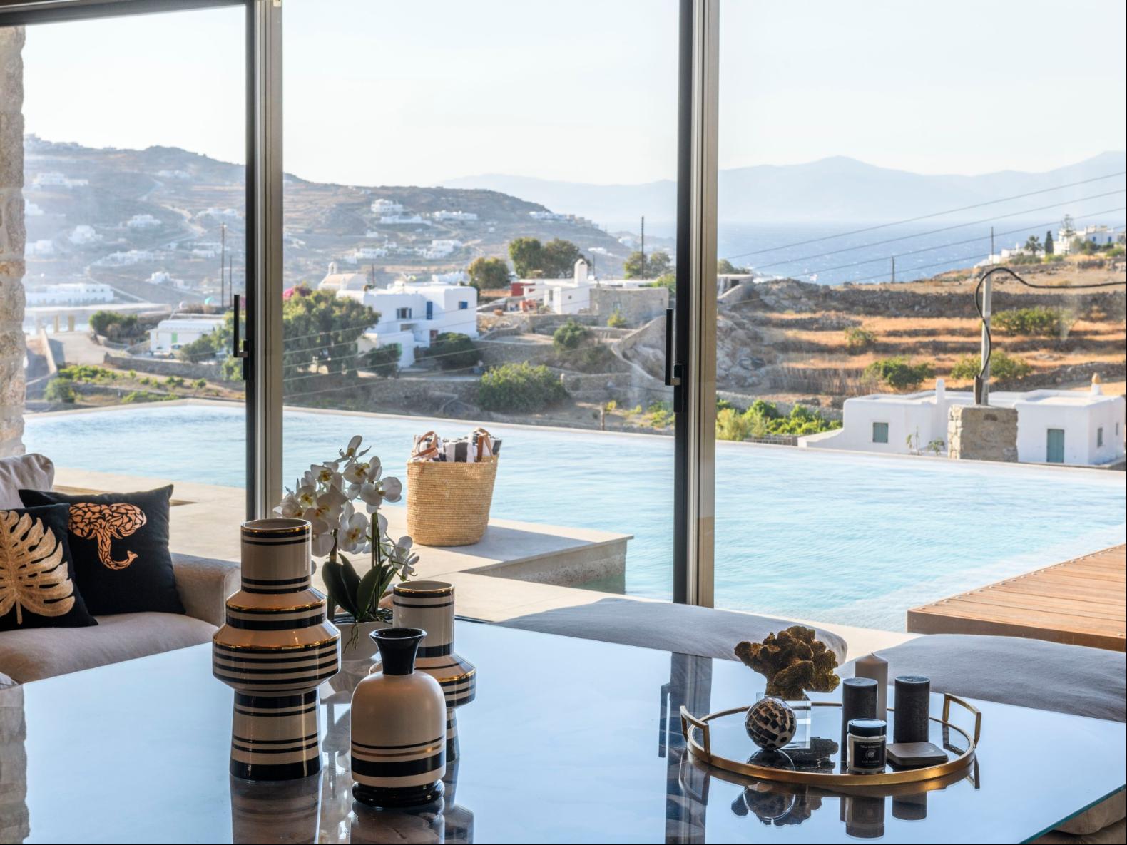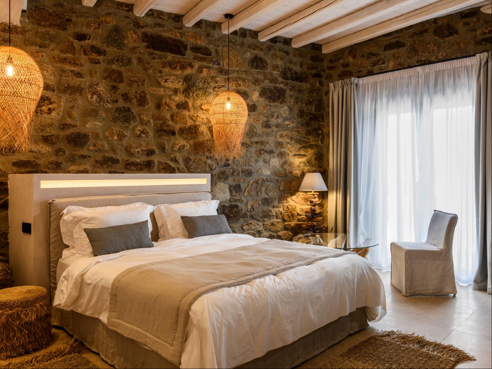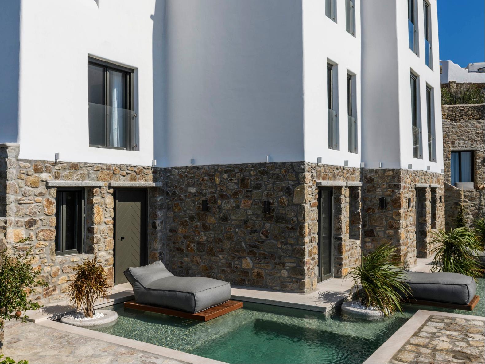 A true jewel in an ideal location, this exquisite estate offers uninterrupted views of the Aegean Sea and the surrounding islands. Also, this stylish and modern Villa is located next to the cosmopolitan Ornos Beach and Mykonos Town. The property can accommodate up to 20 guests. It consists of three levels; the lower, the main, and the upper floor. On the lower level, you can find 2 double bedrooms with en-suite bathrooms, independent entrance and an amazing pool and sea view. On the main level, there are 3 double bedrooms with en-suite bathrooms, a spacious living and dining area, and a fully equipped kitchen with a wine cellar and a cigar bar. Additionally, on the main level, there are 3 bedrooms with en-suite bathrooms, independent entrance and elegant boho aesthetics. On the upper level, there are 2 bedrooms with independent entrance on a natural cliff with an en-suite bathroom and a stunning sea view. The property also offers a staff room next to the parking area. The property can accommodate up to 20 guests. It consists of three levels; the lower, the main, and the upper floor. On the lower level, you can find 2 double bedrooms with en-suite bathrooms, independent entrance and an amazing pool and sea view. On the main level, there are 3 double bedrooms with en-suite bathrooms, a spacious living and dining area, and a fully equipped kitchen with a wine cellar and a cigar bar. Additionally, on the main level, there are 3 bedrooms with en-suite bathrooms, independent entrance and elegant boho aesthetics. On the upper level, there are 2 bedrooms with independent entrance on a natural cliff with an en-suite bathroom and a stunning sea view. The property also offers a staff room next to the parking area. This contemporary estate showcases a modern design with elegant, stylish touches throughout both the interior and outdoor spaces.. Guests can use the sunbeds around the pool in order to have a drink, relax and enjoy the spectacular views with their beloved ones. This Villa is ideal either for friends who want to have the time of their lives or for a family who wants to spend unforgettable moments altogether.
