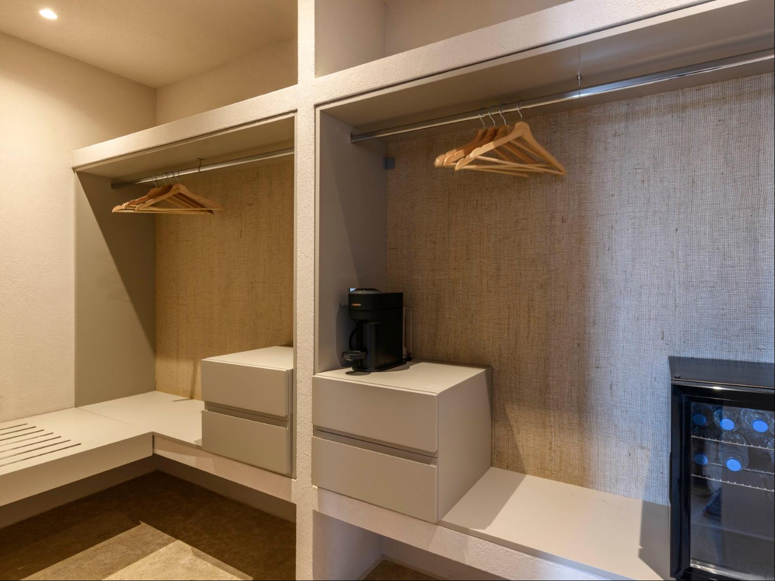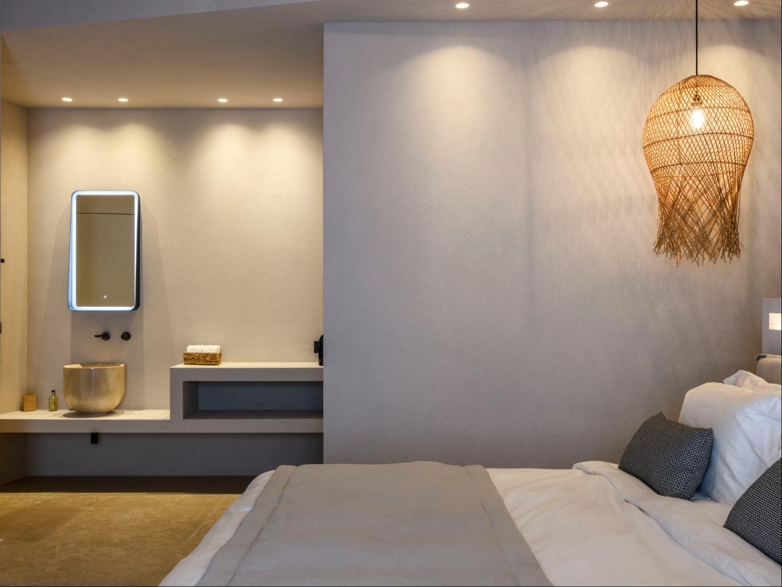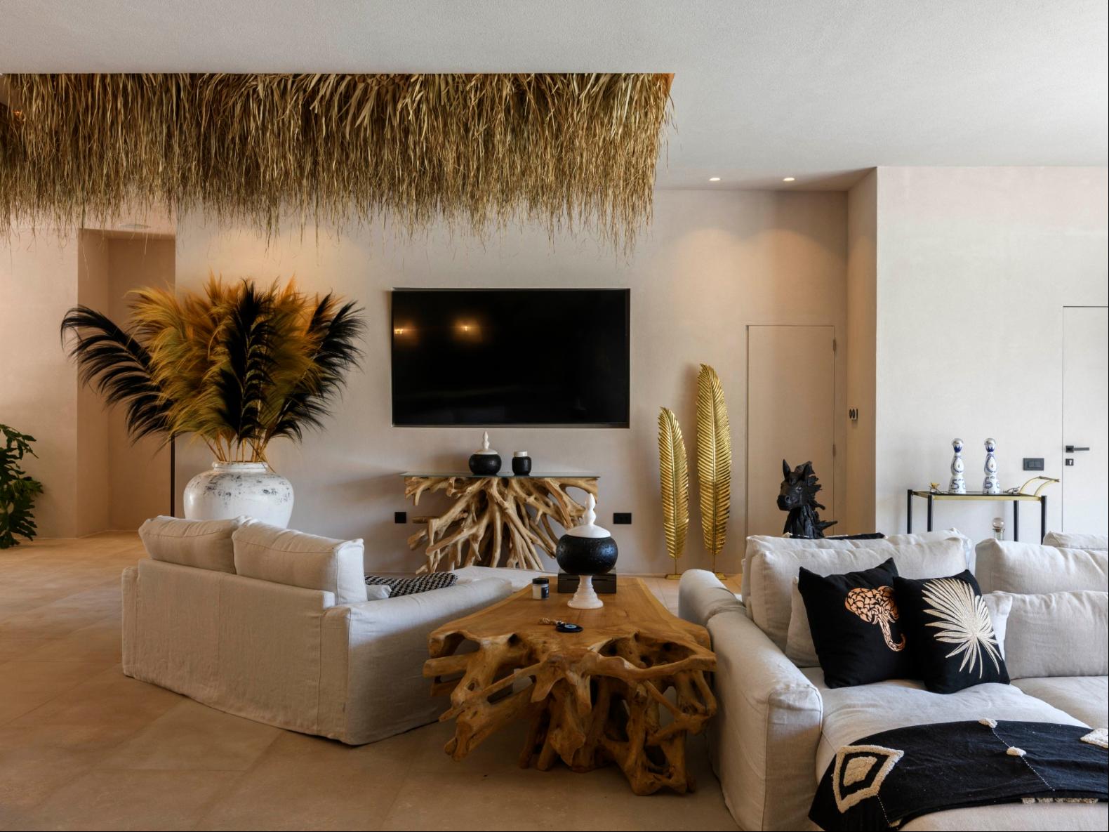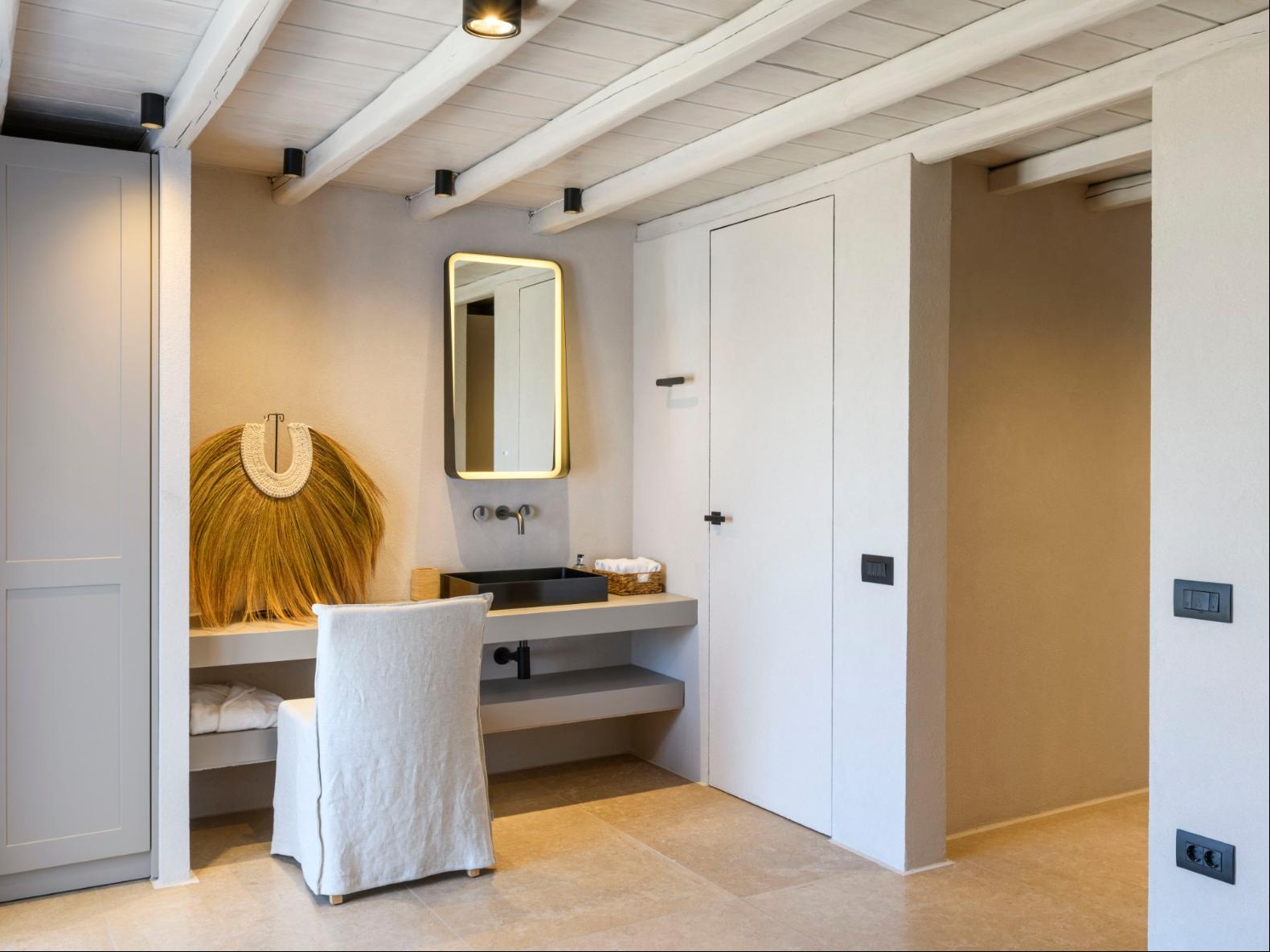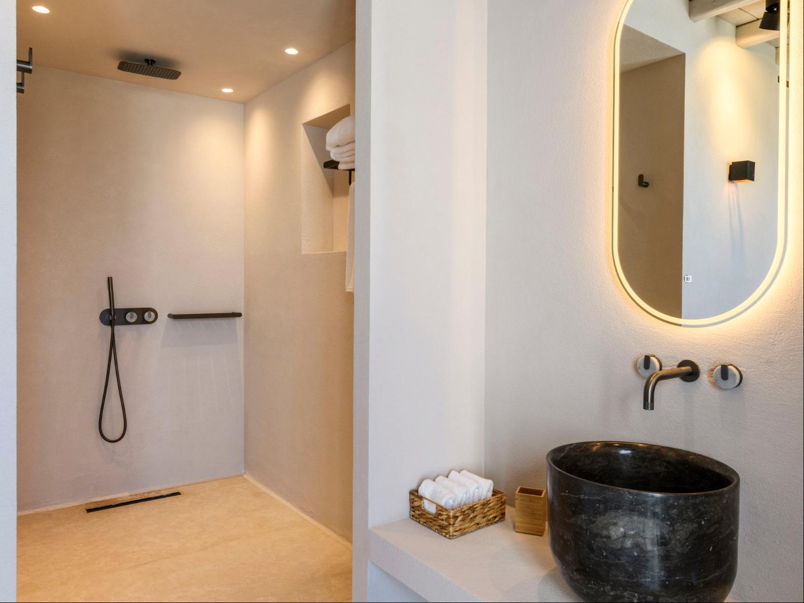 A true jewel in an ideal location, this exquisite estate offers uninterrupted views of the Aegean Sea and the surrounding islands. Also, this stylish and modern Villa is located next to the cosmopolitan Ornos Beach and Mykonos Town. The property can accommodate up to 20 guests. It consists of three levels; the lower, the main, and the upper floor. On the lower level, you can find 2 double bedrooms with en-suite bathrooms, independent entrance and an amazing pool and sea view. On the main level, there are 3 double bedrooms with en-suite bathrooms, a spacious living and dining area, and a fully equipped kitchen with a wine cellar and a cigar bar. Additionally, on the main level, there are 3 bedrooms with en-suite bathrooms, independent entrance and elegant boho aesthetics. On the upper level, there are 2 bedrooms with independent entrance on a natural cliff with an en-suite bathroom and a stunning sea view. The property also offers a staff room next to the parking area. The property can accommodate up to 20 guests. It consists of three levels; the lower, the main, and the upper floor. On the lower level, you can find 2 double bedrooms with en-suite bathrooms, independent entrance and an amazing pool and sea view. On the main level, there are 3 double bedrooms with en-suite bathrooms, a spacious living and dining area, and a fully equipped kitchen with a wine cellar and a cigar bar. Additionally, on the main level, there are 3 bedrooms with en-suite bathrooms, independent entrance and elegant boho aesthetics. On the upper level, there are 2 bedrooms with independent entrance on a natural cliff with an en-suite bathroom and a stunning sea view. The property also offers a staff room next to the parking area. This contemporary estate showcases a modern design with elegant, stylish touches throughout both the interior and outdoor spaces.. Guests can use the sunbeds around the pool in order to have a drink, relax and enjoy the spectacular views with their beloved ones. This Villa is ideal either for friends who want to have the time of their lives or for a family who wants to spend unforgettable moments altogether.