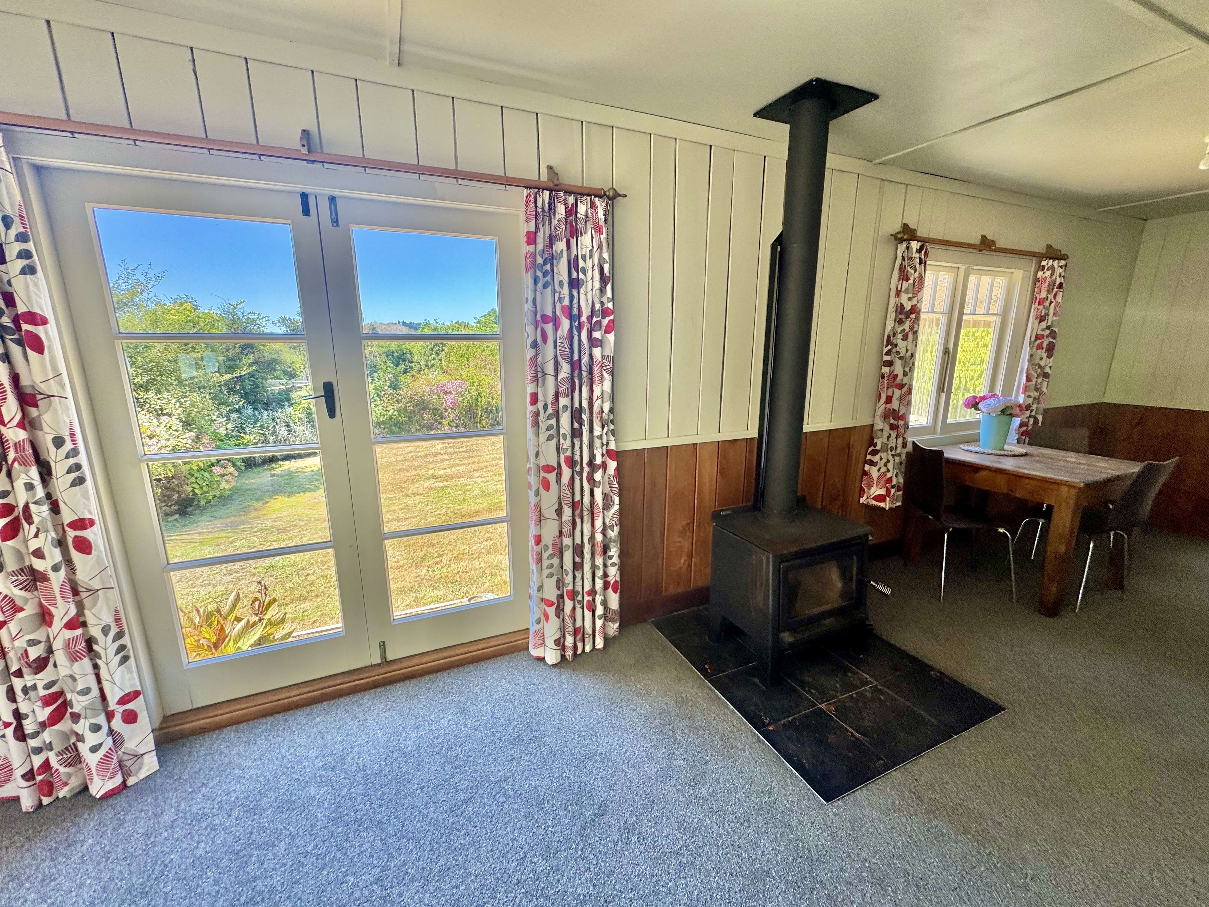 The 1930’s residence has been thoughtfully updated while retaining its warm, cottage-style charm. Open-plan living connects the lounge, dining area, and kitchen, complemented by two bedrooms, a modern bathroom, and a separate toilet. Macrocarpa and Red Beech interiors, a log burner, and a heat pump make the home cosy year-round, while the sheltered veranda invites you to relax and enjoy the sun-soaked gardens, fields, and rolling hills.