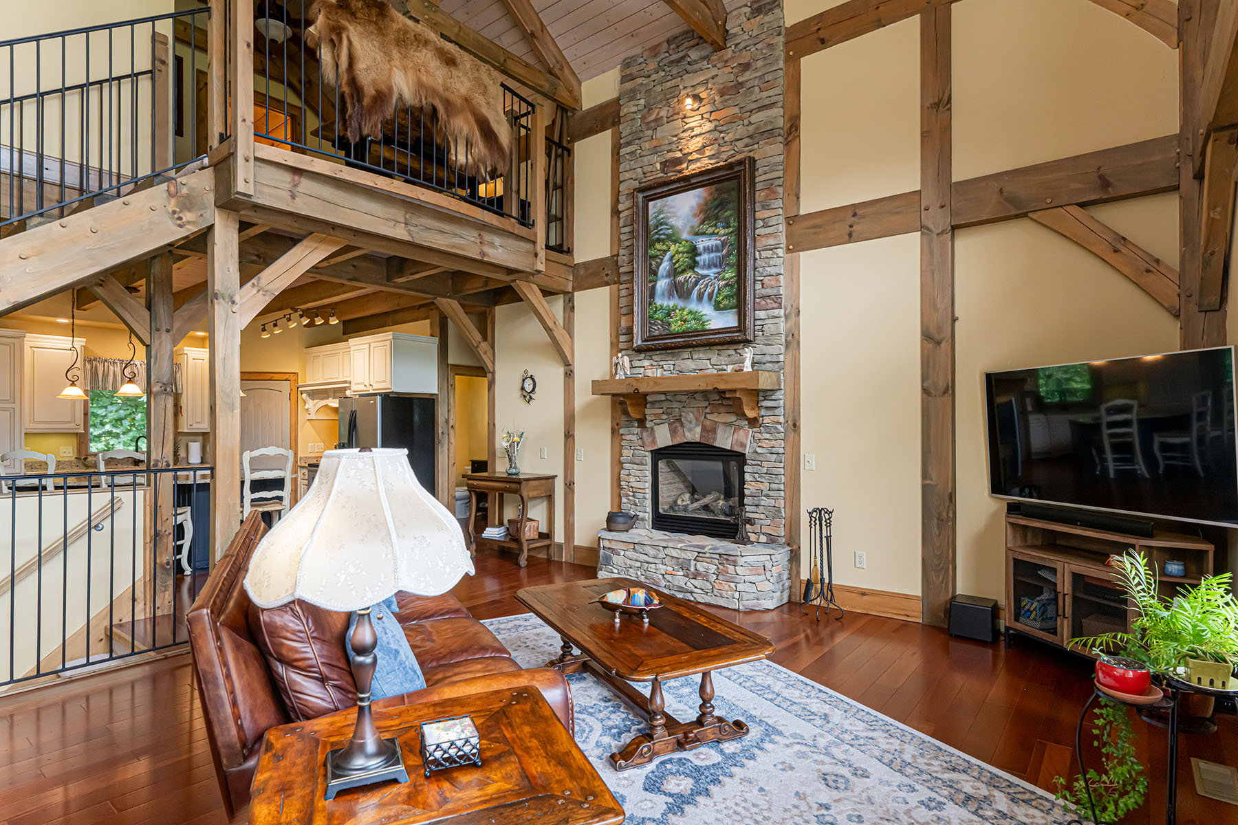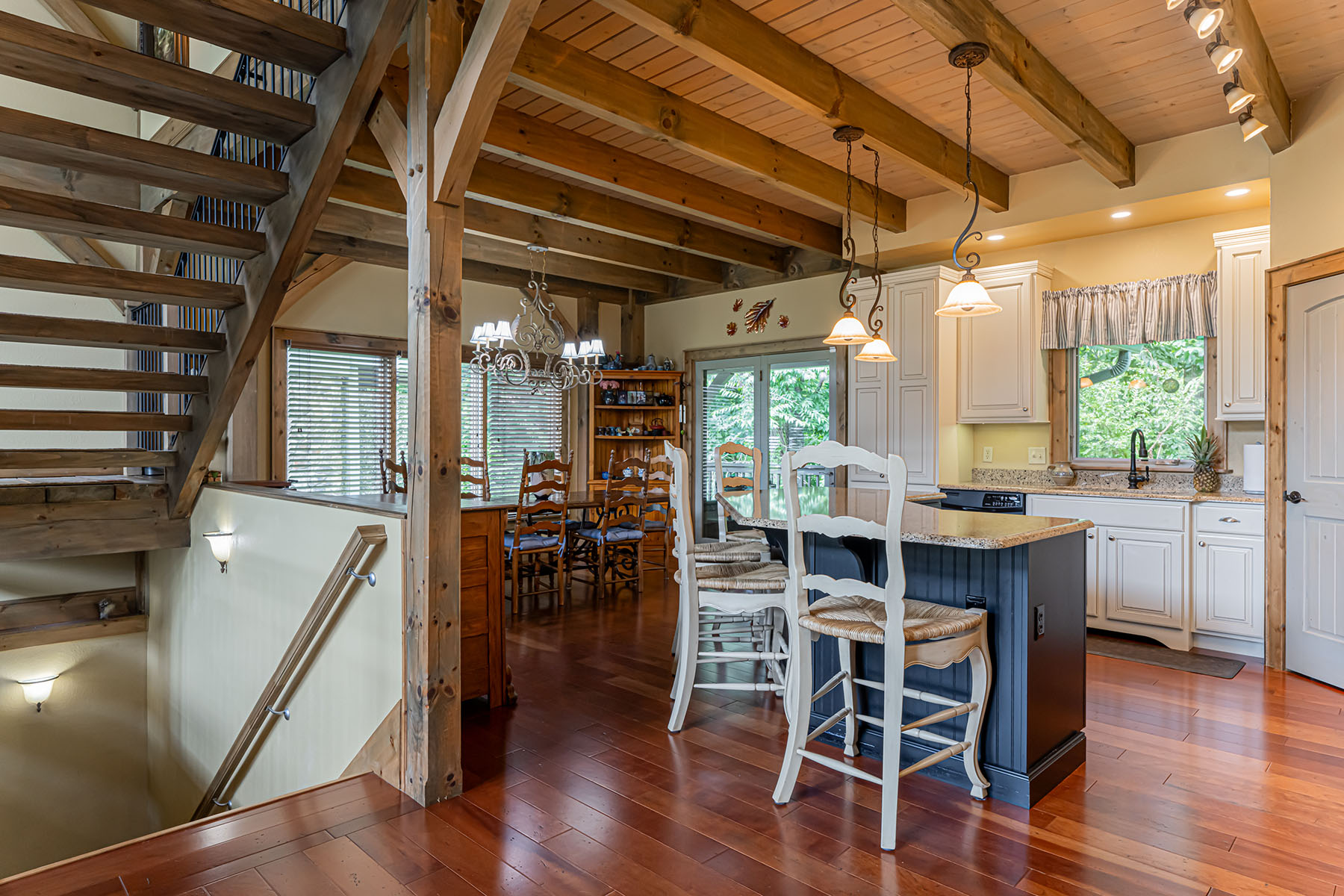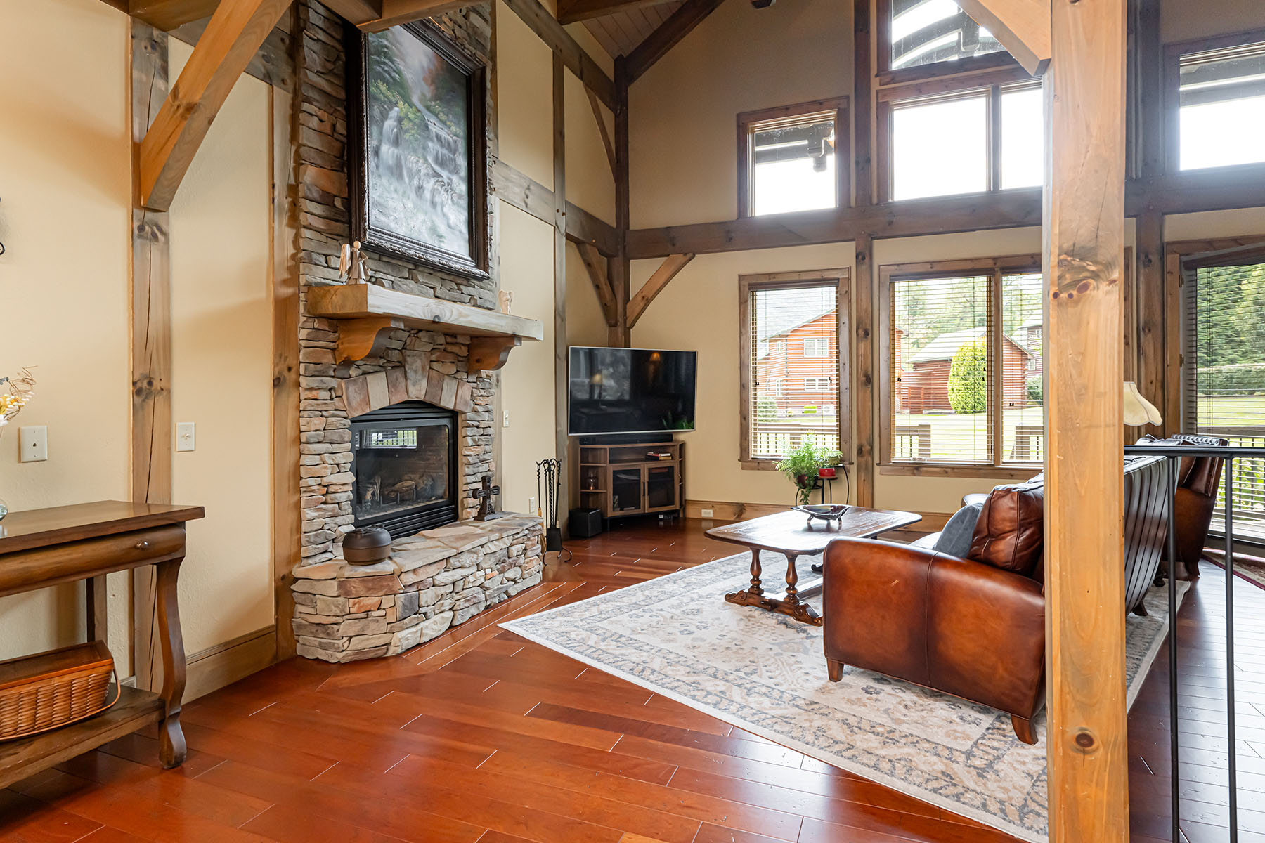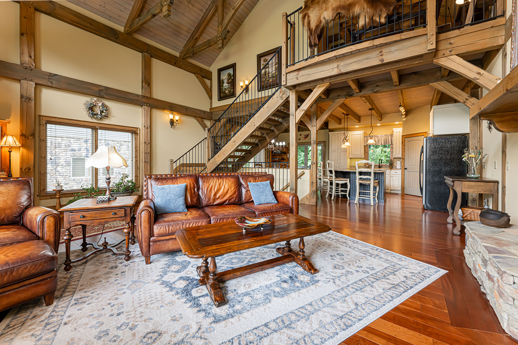The interior is anchored by a striking great room, where soaring timber beams, expansive windows, and a floor-to-ceiling stone fireplace establish a warm yet refined gathering space. Natural light fills the home throughout the day, highlighting rich hardwood floors and thoughtfully selected finishes. The open-concept design transitions seamlessly into a well-appointed kitchen featuring granite countertops, stainless steel appliances, a central island, and generous storage, equally suited for entertaining or everyday living.