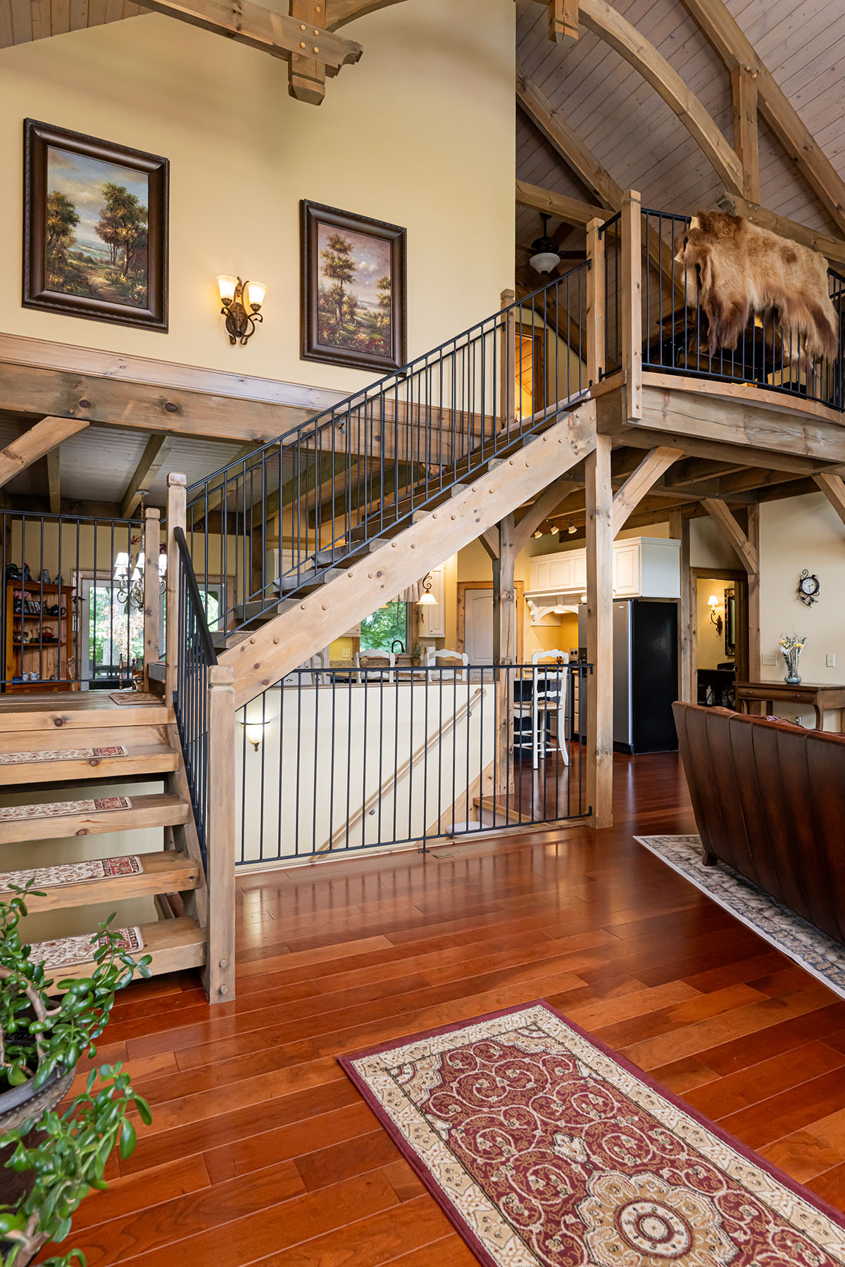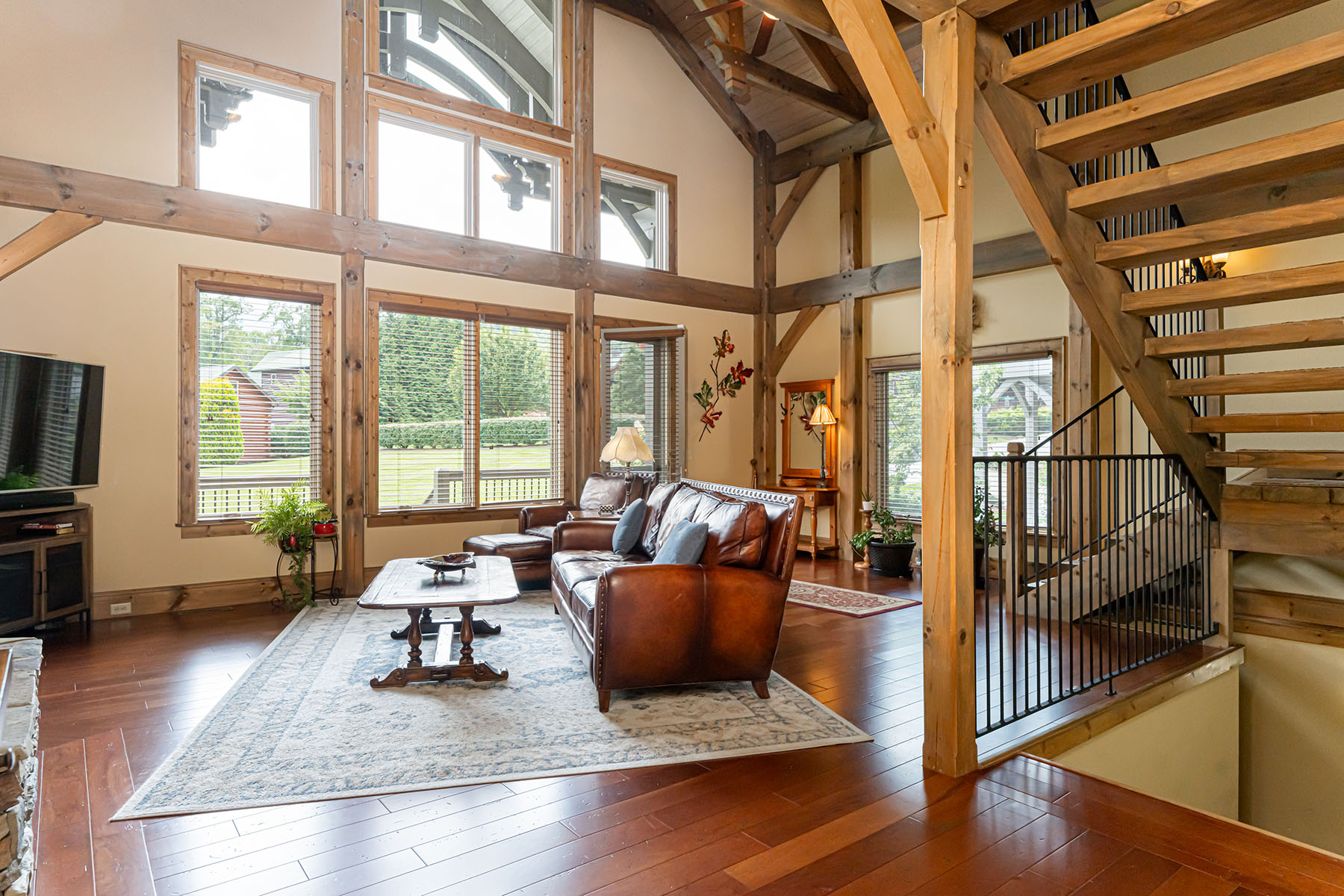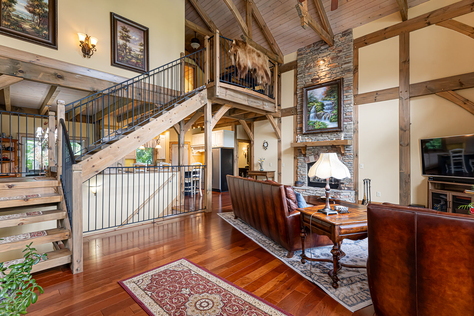 The interior is anchored by a striking great room, where soaring timber beams, expansive windows, and a floor-to-ceiling stone fireplace establish a warm yet refined gathering space. Natural light fills the home throughout the day, highlighting rich hardwood floors and thoughtfully selected finishes. The open-concept design transitions seamlessly into a well-appointed kitchen featuring granite countertops, stainless steel appliances, a central island, and generous storage, equally suited for entertaining or everyday living.