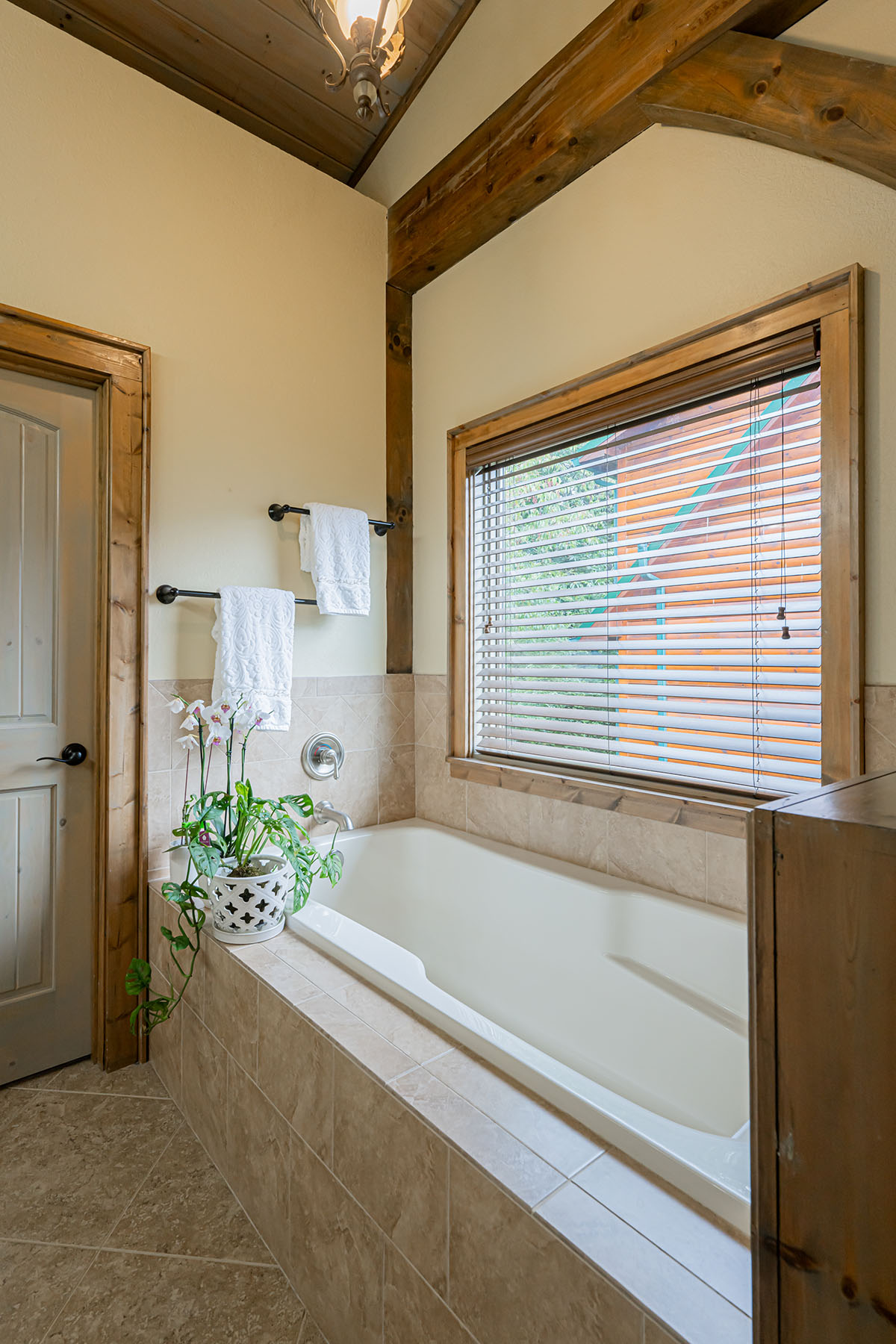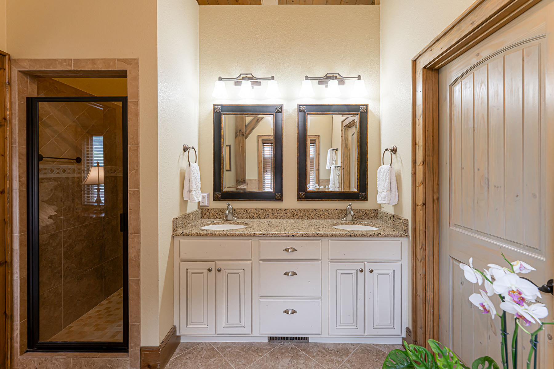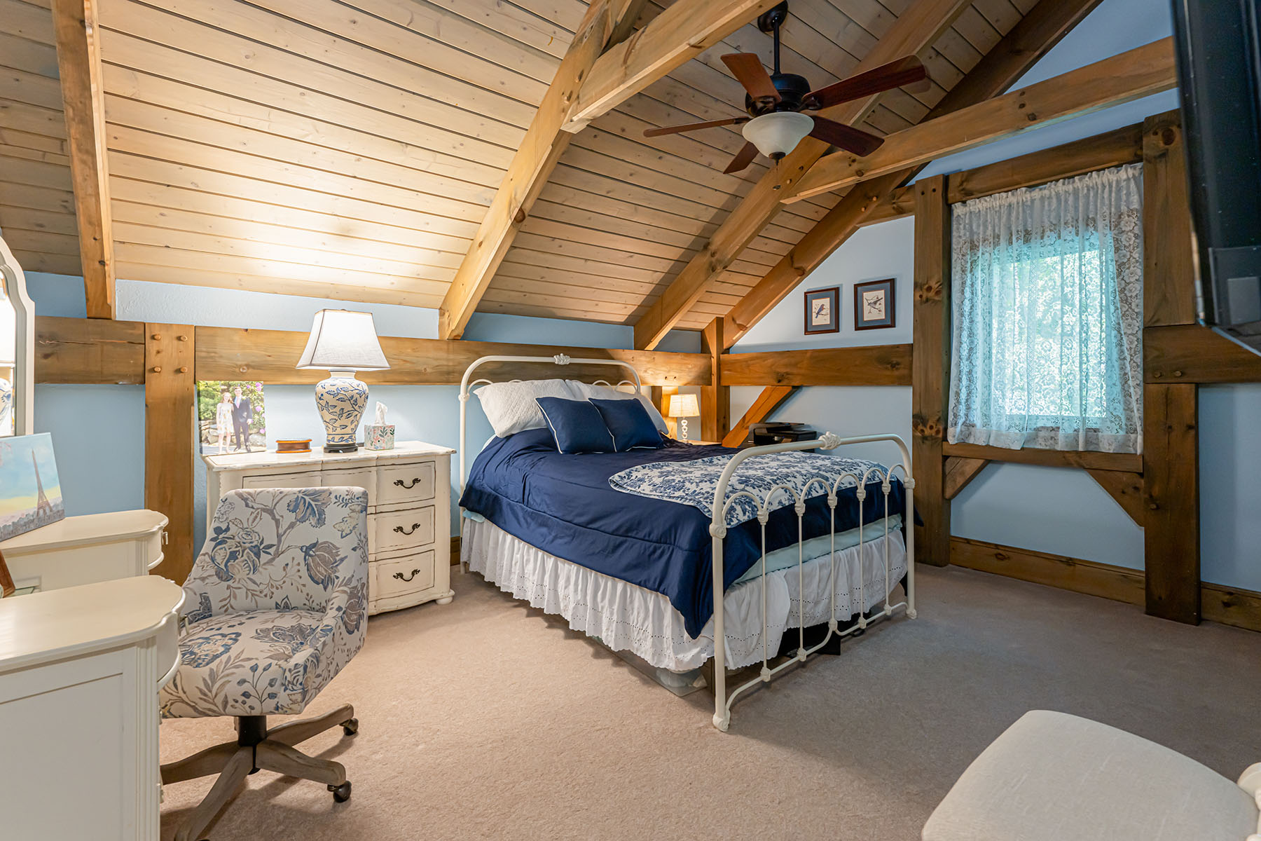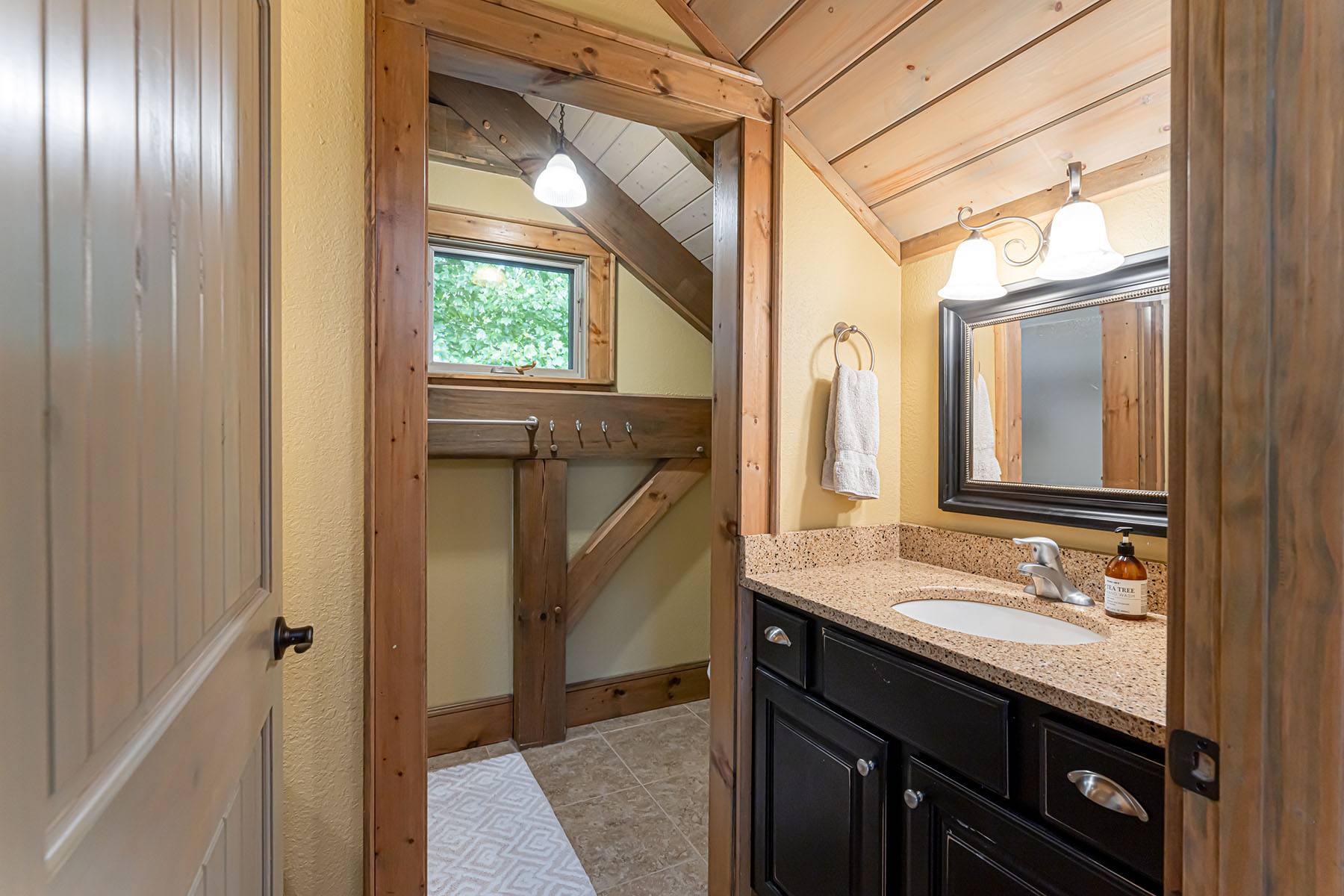 The interior is anchored by a striking great room, where soaring timber beams, expansive windows, and a floor-to-ceiling stone fireplace establish a warm yet refined gathering space. Natural light fills the home throughout the day, highlighting rich hardwood floors and thoughtfully selected finishes. The open-concept design transitions seamlessly into a well-appointed kitchen featuring granite countertops, stainless steel appliances, a central island, and generous storage, equally suited for entertaining or everyday living.