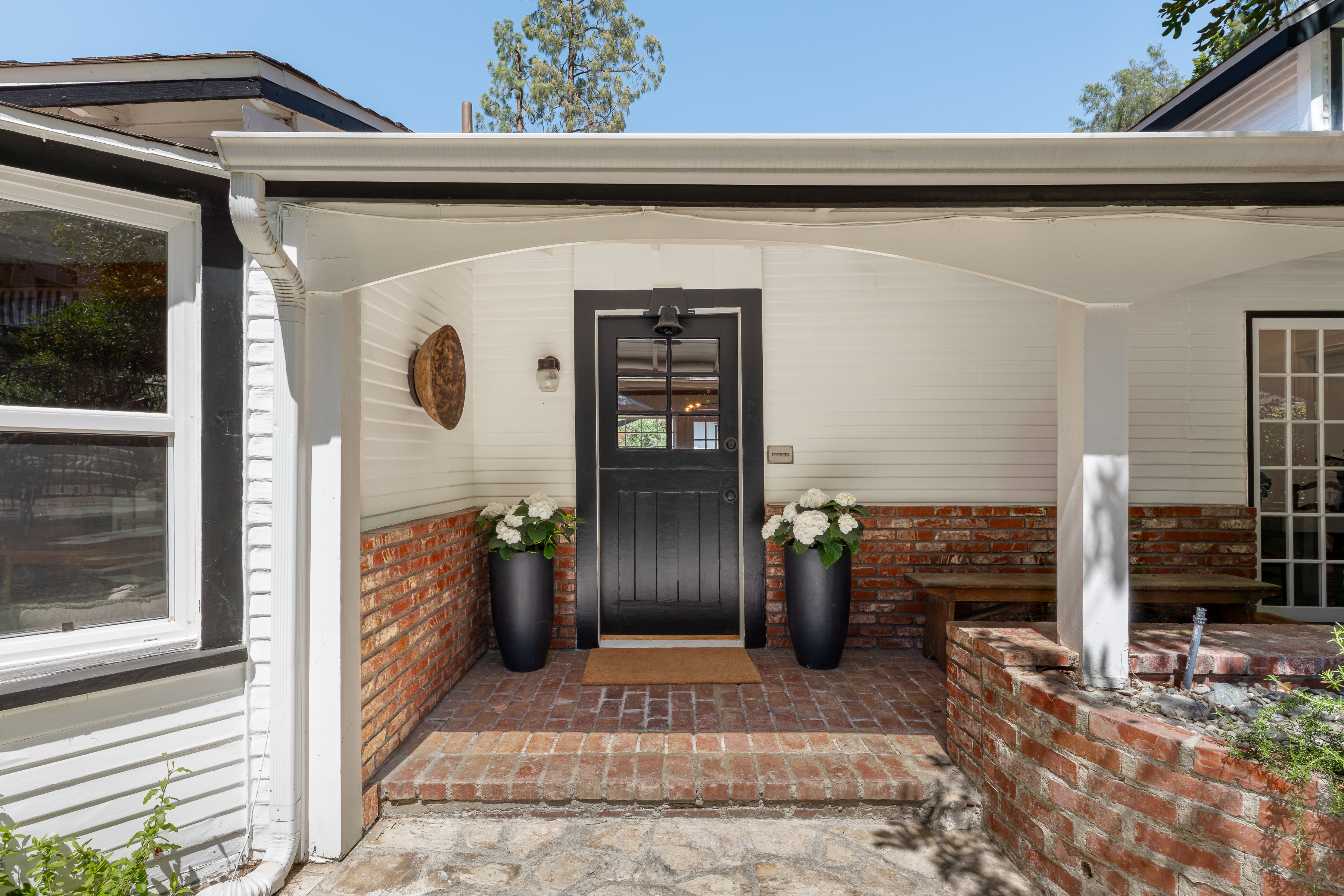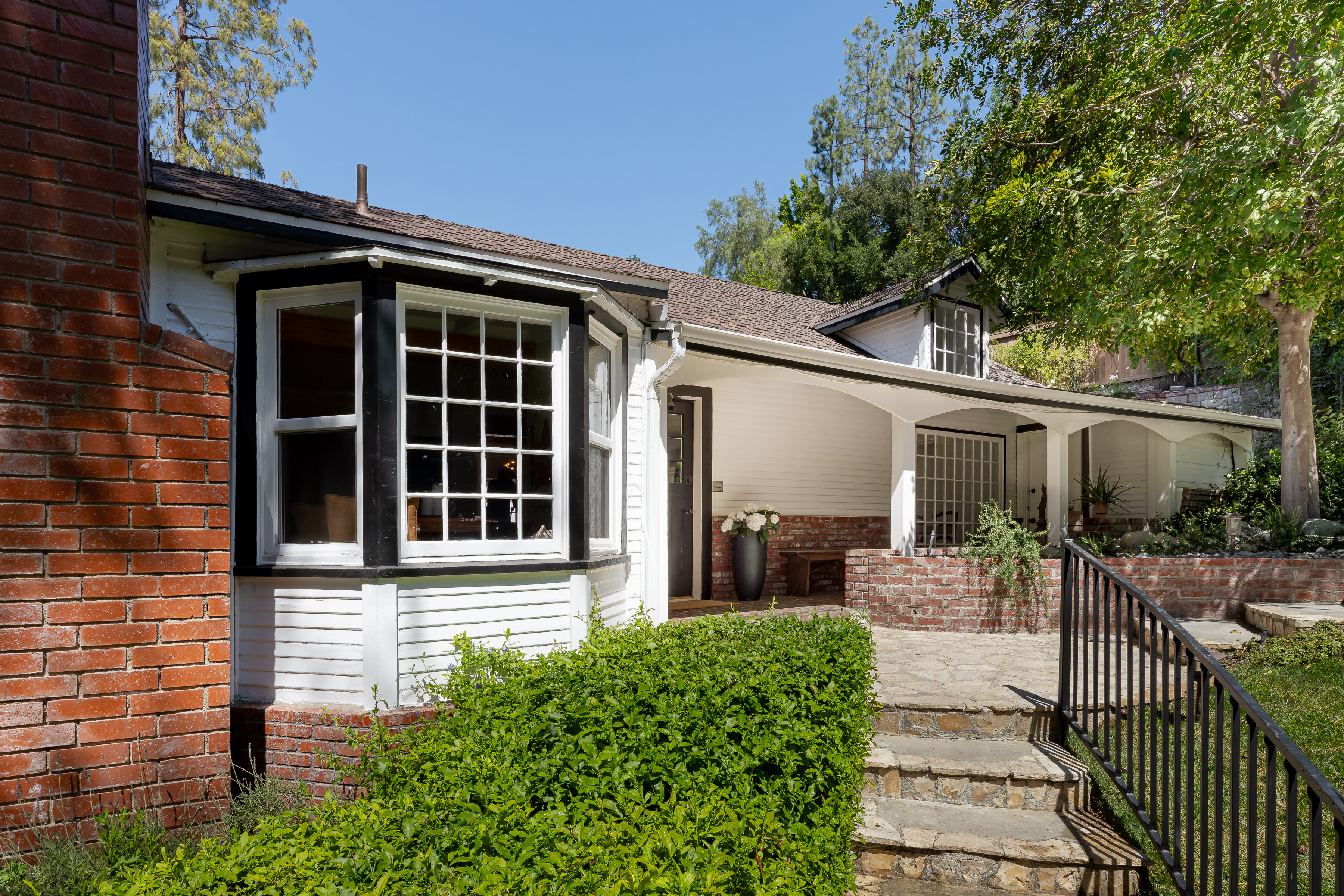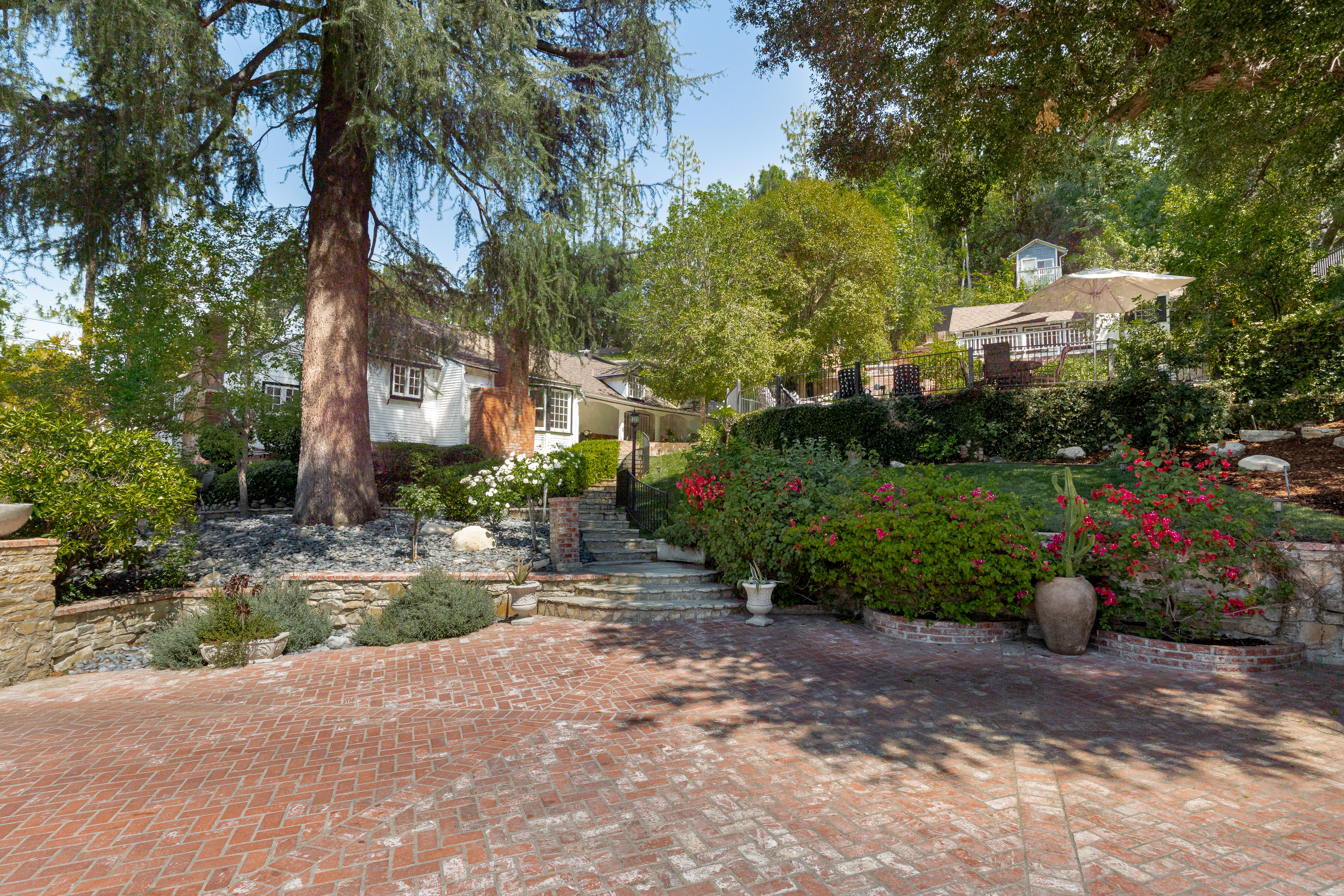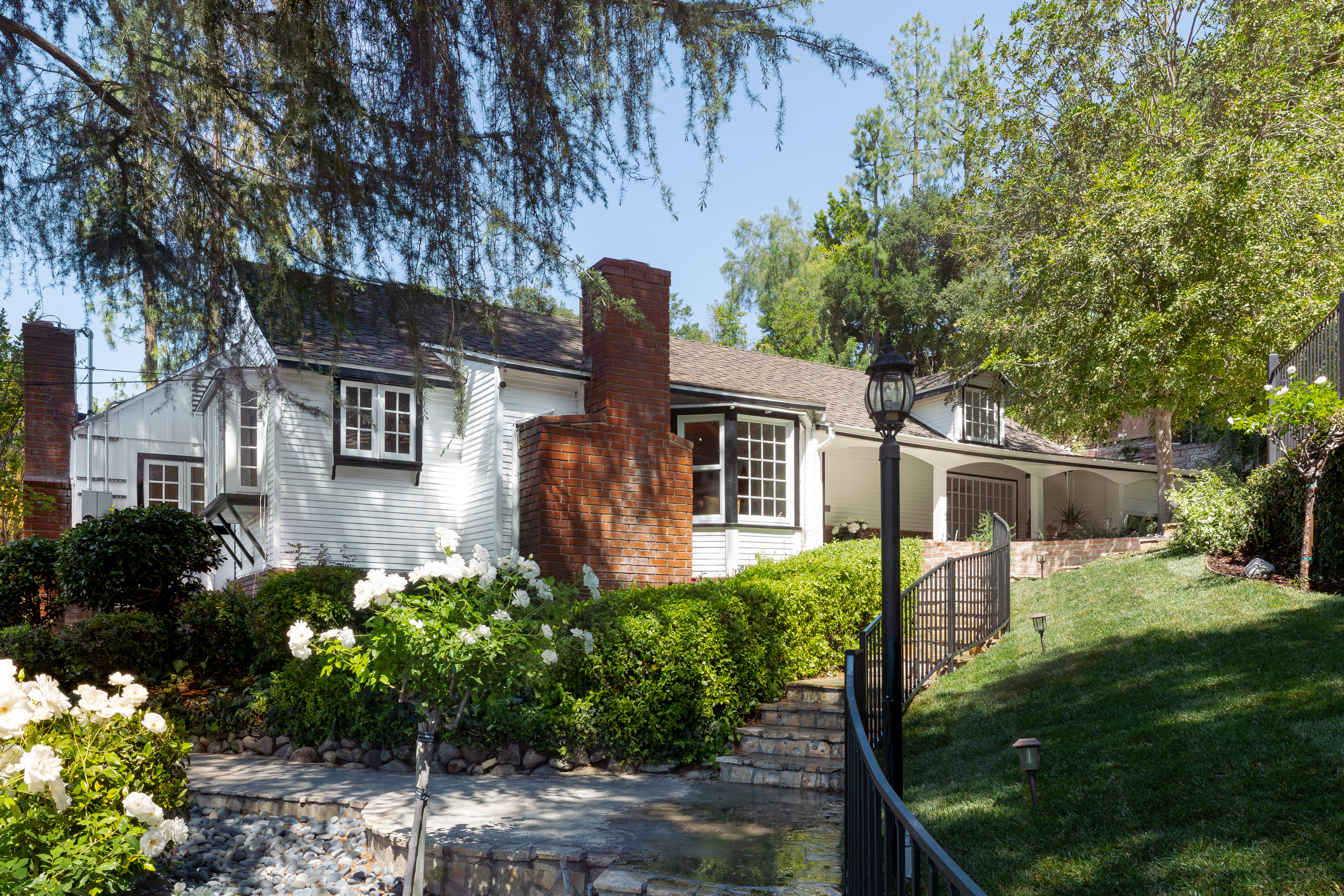 Tucked away on a peaceful cul-de-sac in the celebrated Rancho Estates, this enchanting, gated property offers a rare blend of privacy, charm, timeless character, and pure emotion. Set on an expansive approx. 18,000 sq. ft. sprawling lot, this storybook hideaway, reminiscent of a “writer’s retreat,” feels worlds away-yet is just minutes away from Ventura Blvd and its many vibrant dining and shopping options. Featuring 3 spacious bedrooms, 4 bathrooms, plus a captivating multi-purpose guest house, this Traditional-style residence is rich with warmth and architectural detail. A welcoming living room showcases a vaulted wood-beamed ceiling, bay window, wood floors, built-in bookshelves, and a classic brick fireplace. This space flows seamlessly into a generous formal dining room with a coffered ceiling, French windows, and a door that leads to a delightful rear patio. The hub of the home is a sunlit country kitchen, featuring vaulted ceilings, a center island with gas cooktop, generous storage, a built-in desk, and bright breakfast area. Adjoining the kitchen is a large guest suite with its own full bath, while a versatile flex space off the living room makes for a perfect study, library, or music room. The bedroom wing includes a secondary ensuite bedroom overlooking the front yard, and an alluring, primary suite with a walk-in closet, French windows, and a newer remodeled bath with separate shower, soaking tub, and decorative tile flooring. Perched above the main home, the intimate and secluded guest house offers its own tranquil space, complete with vaulted wood-beamed ceilings, brick floors, kitchenette, full bath, and engaging outdoor spaces including a viewing deck and entertaining patio, ideal for guests, a home office, or creative studio. Explore the lushly landscaped grounds embellished with fruit trees, including pomegranate, cherry, olive, and a dozen citrus trees, or meander among the multiple flagstone and brick pathways. Host unforgettable summer barbecues around the gated, pebble bottom pool and spa surrounded by flagstone decking, lounge areas, and a separate waterfall. Additional amenities are a 2-car garage, ample driveway parking, storage shed, dual-zone HVAC, and an alarm system. Separate entrances make it easy to work from home. A unique and special sanctuary, this one-of-a-kind property is the perfect blend of countryside tranquility and city convenience, custom made for those seeking the ultimate in location, environment, and beauty.