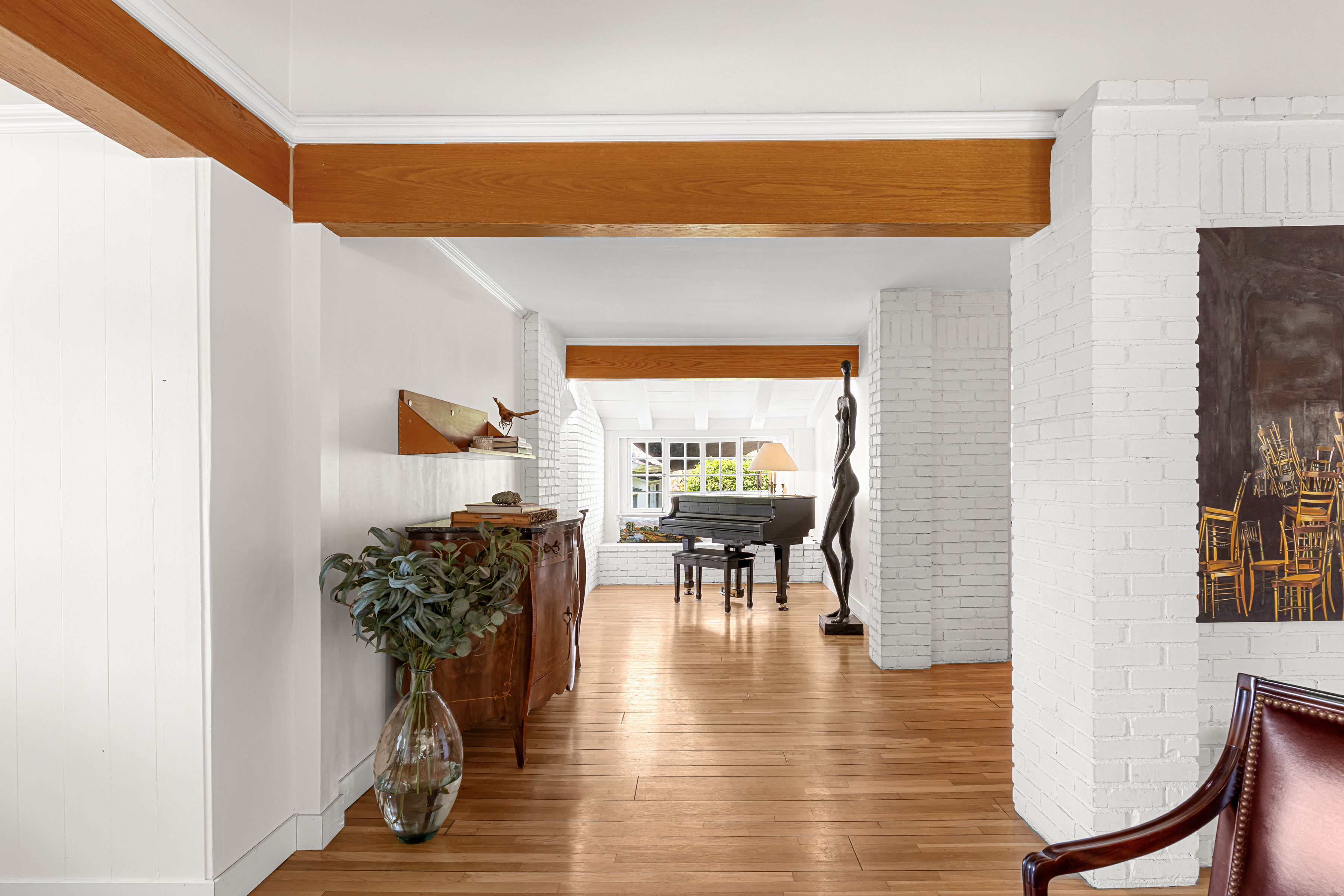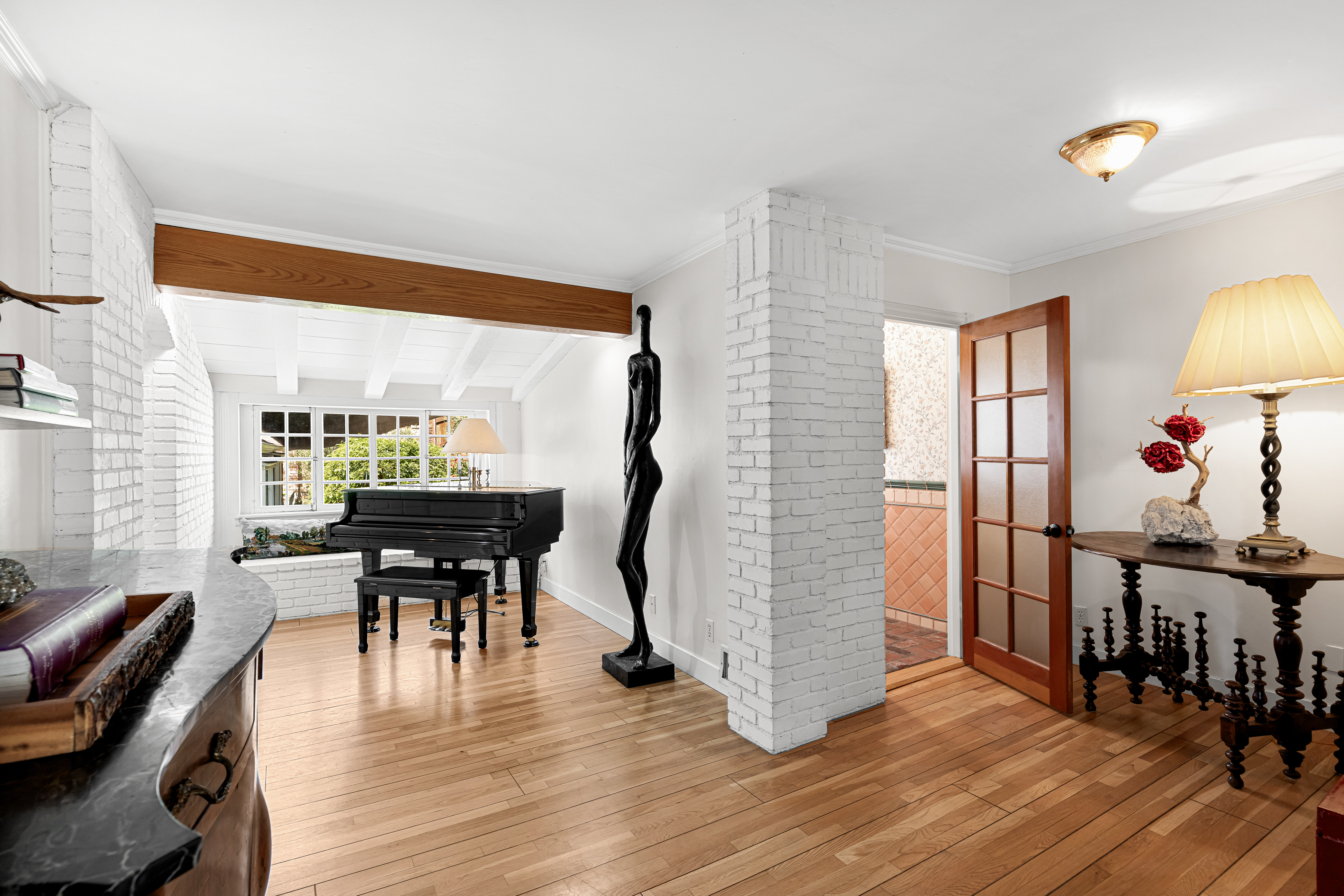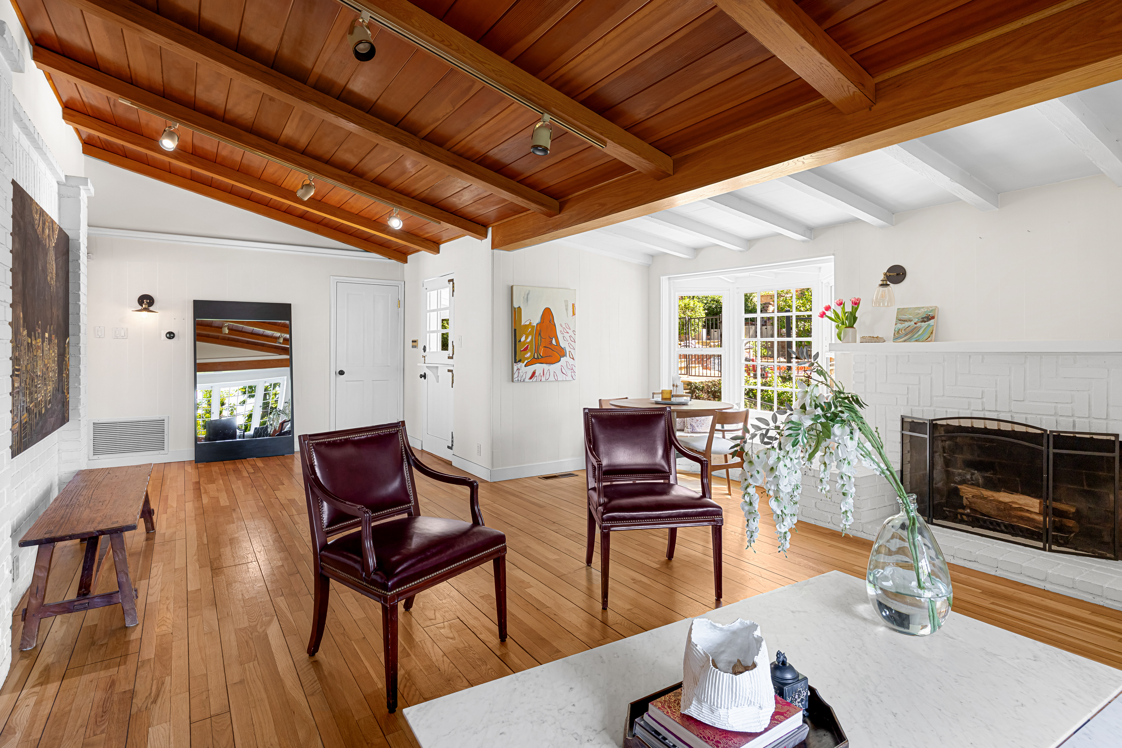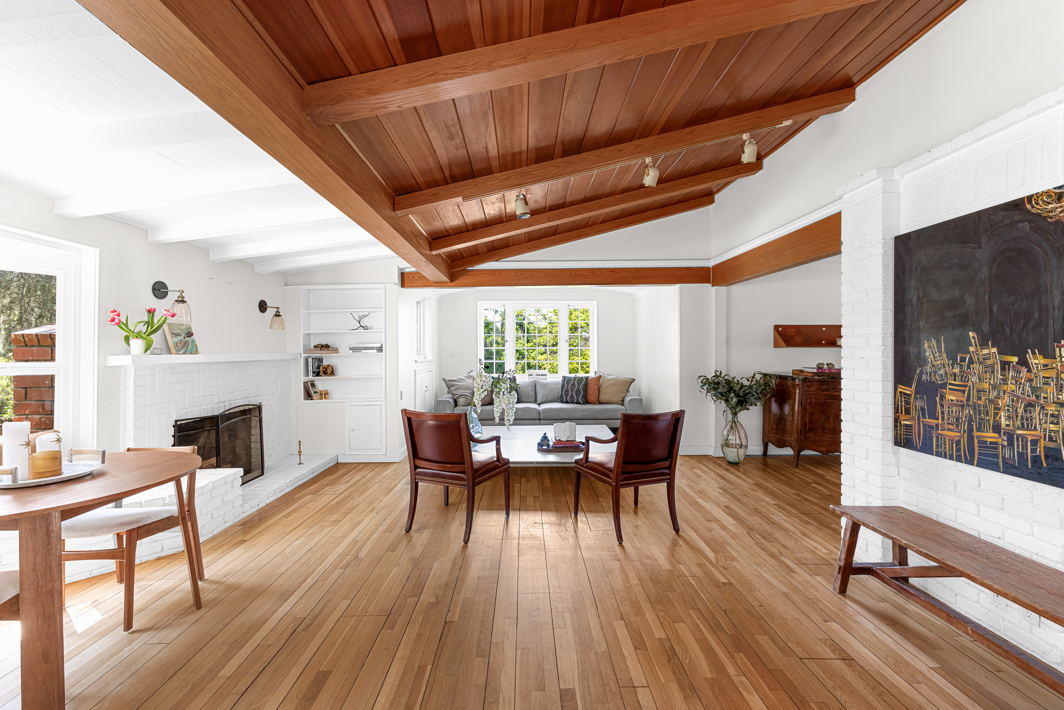 Tucked away on a peaceful cul-de-sac in the celebrated Rancho Estates, this enchanting, gated property offers a rare blend of privacy, charm, timeless character, and pure emotion. Set on an expansive approx. 18,000 sq. ft. sprawling lot, this storybook hideaway, reminiscent of a “writer’s retreat,” feels worlds away-yet is just minutes away from Ventura Blvd and its many vibrant dining and shopping options. Featuring 3 spacious bedrooms, 4 bathrooms, plus a captivating multi-purpose guest house, this Traditional-style residence is rich with warmth and architectural detail. A welcoming living room showcases a vaulted wood-beamed ceiling, bay window, wood floors, built-in bookshelves, and a classic brick fireplace. This space flows seamlessly into a generous formal dining room with a coffered ceiling, French windows, and a door that leads to a delightful rear patio. The hub of the home is a sunlit country kitchen, featuring vaulted ceilings, a center island with gas cooktop, generous storage, a built-in desk, and bright breakfast area. Adjoining the kitchen is a large guest suite with its own full bath, while a versatile flex space off the living room makes for a perfect study, library, or music room. The bedroom wing includes a secondary ensuite bedroom overlooking the front yard, and an alluring, primary suite with a walk-in closet, French windows, and a newer remodeled bath with separate shower, soaking tub, and decorative tile flooring. Perched above the main home, the intimate and secluded guest house offers its own tranquil space, complete with vaulted wood-beamed ceilings, brick floors, kitchenette, full bath, and engaging outdoor spaces including a viewing deck and entertaining patio, ideal for guests, a home office, or creative studio. Explore the lushly landscaped grounds embellished with fruit trees, including pomegranate, cherry, olive, and a dozen citrus trees, or meander among the multiple flagstone and brick pathways. Host unforgettable summer barbecues around the gated, pebble bottom pool and spa surrounded by flagstone decking, lounge areas, and a separate waterfall. Additional amenities are a 2-car garage, ample driveway parking, storage shed, dual-zone HVAC, and an alarm system. Separate entrances make it easy to work from home. A unique and special sanctuary, this one-of-a-kind property is the perfect blend of countryside tranquility and city convenience, custom made for those seeking the ultimate in location, environment, and beauty.