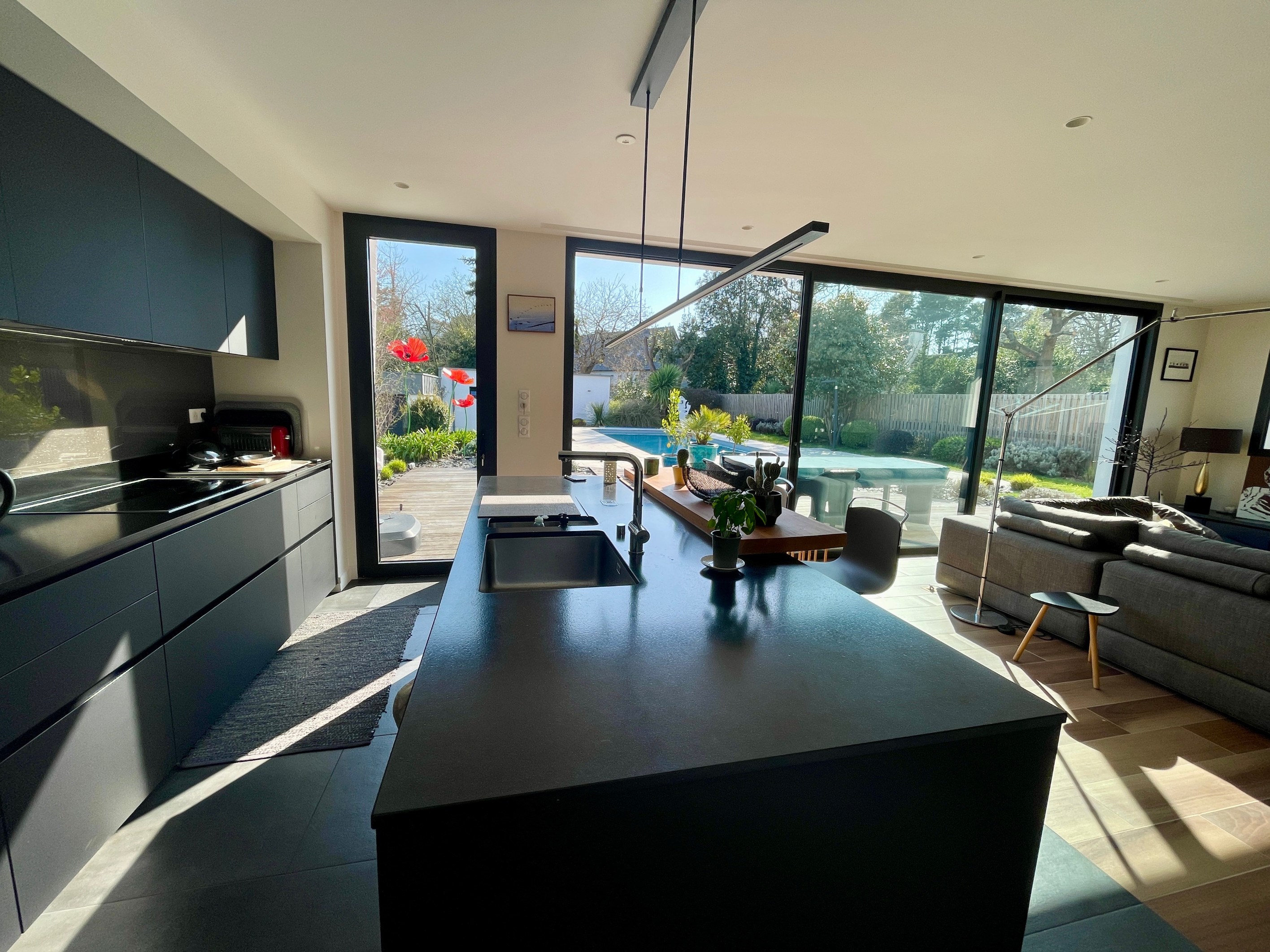 This outstanding house, built in 2020, can be found in the wonderful town of Concarneau. The property is for sale. The property benefits from wonderful clear views sans vis-à-vis. You will find 200 sq. m of living space in the house. an 1100 sq. m garden and a terrace offer unparalleled peace and privacy. Upon entering the house, you step into an attractive hall and cross into a spacious living room. The house comes with five bedrooms, including one master suite. This property's assets, such as its perfect condition and its brightness, are highly coveted.