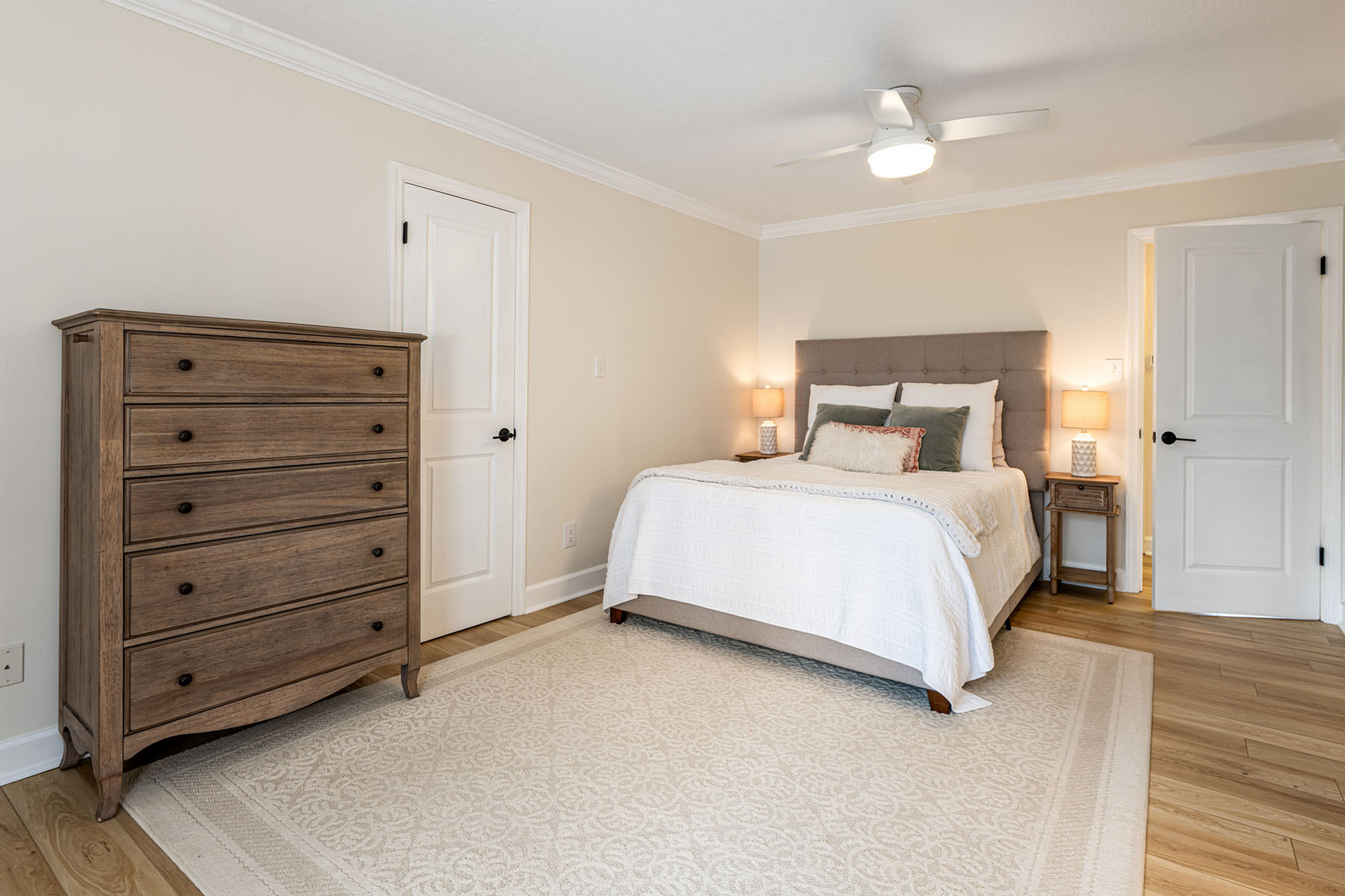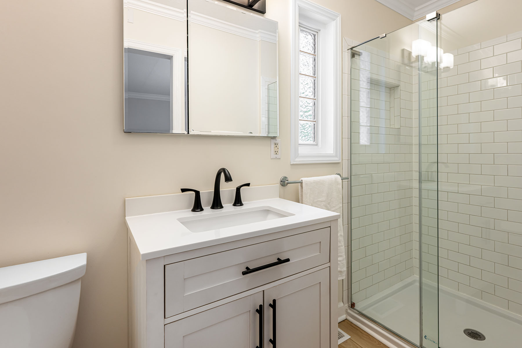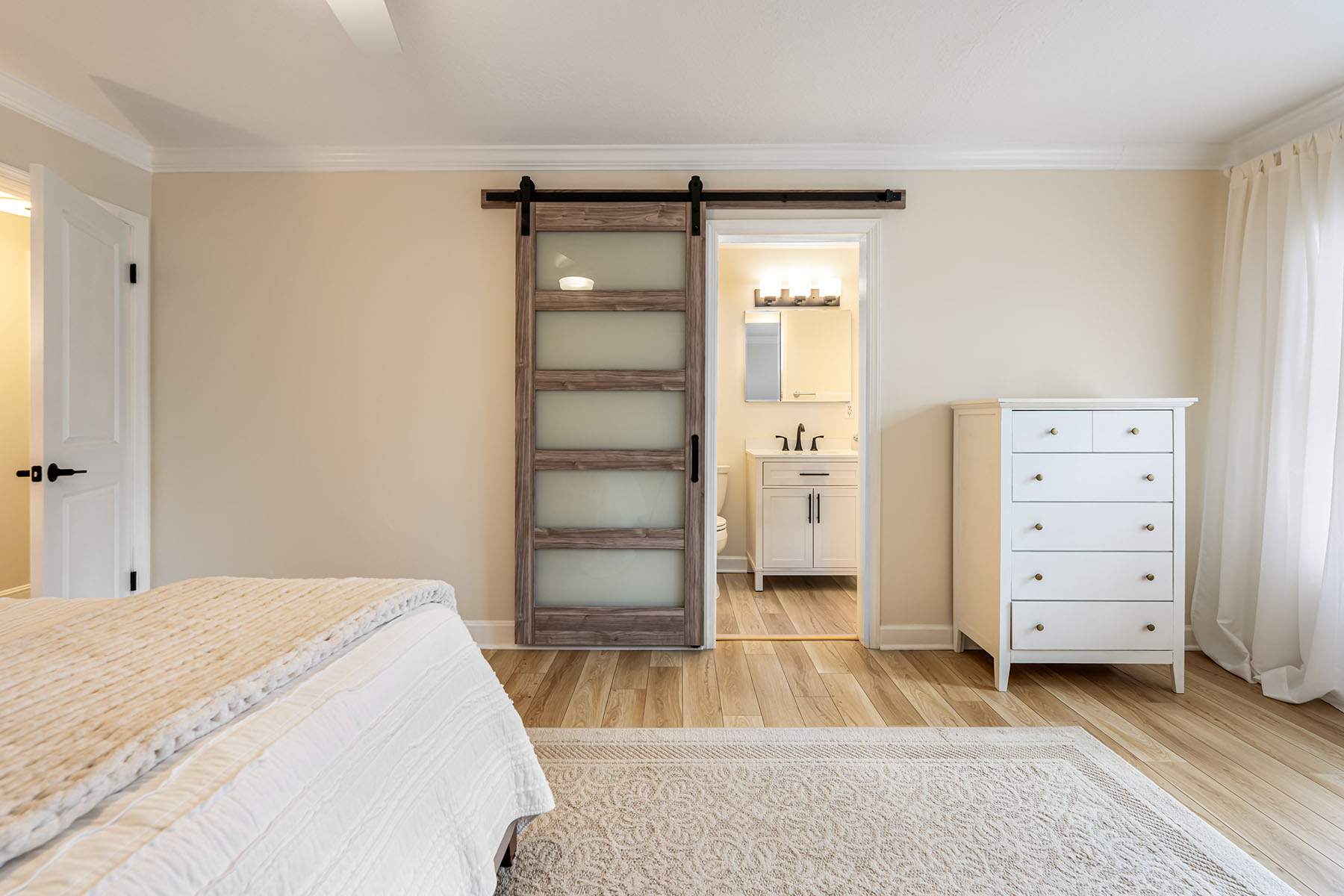 The primary suite includes dual closets and a fully updated ensuite bath. Two additional guest bedrooms are served by a hall bath with timeless wall tile, a pedestal sink, and a tub-shower combination.