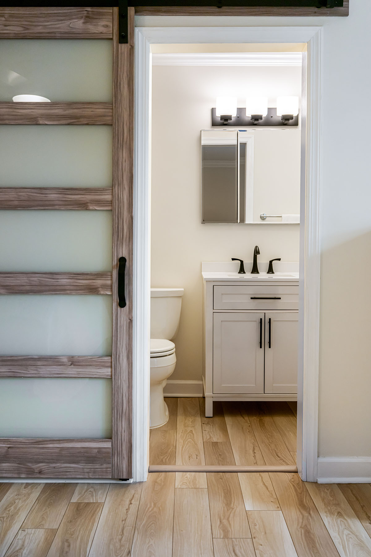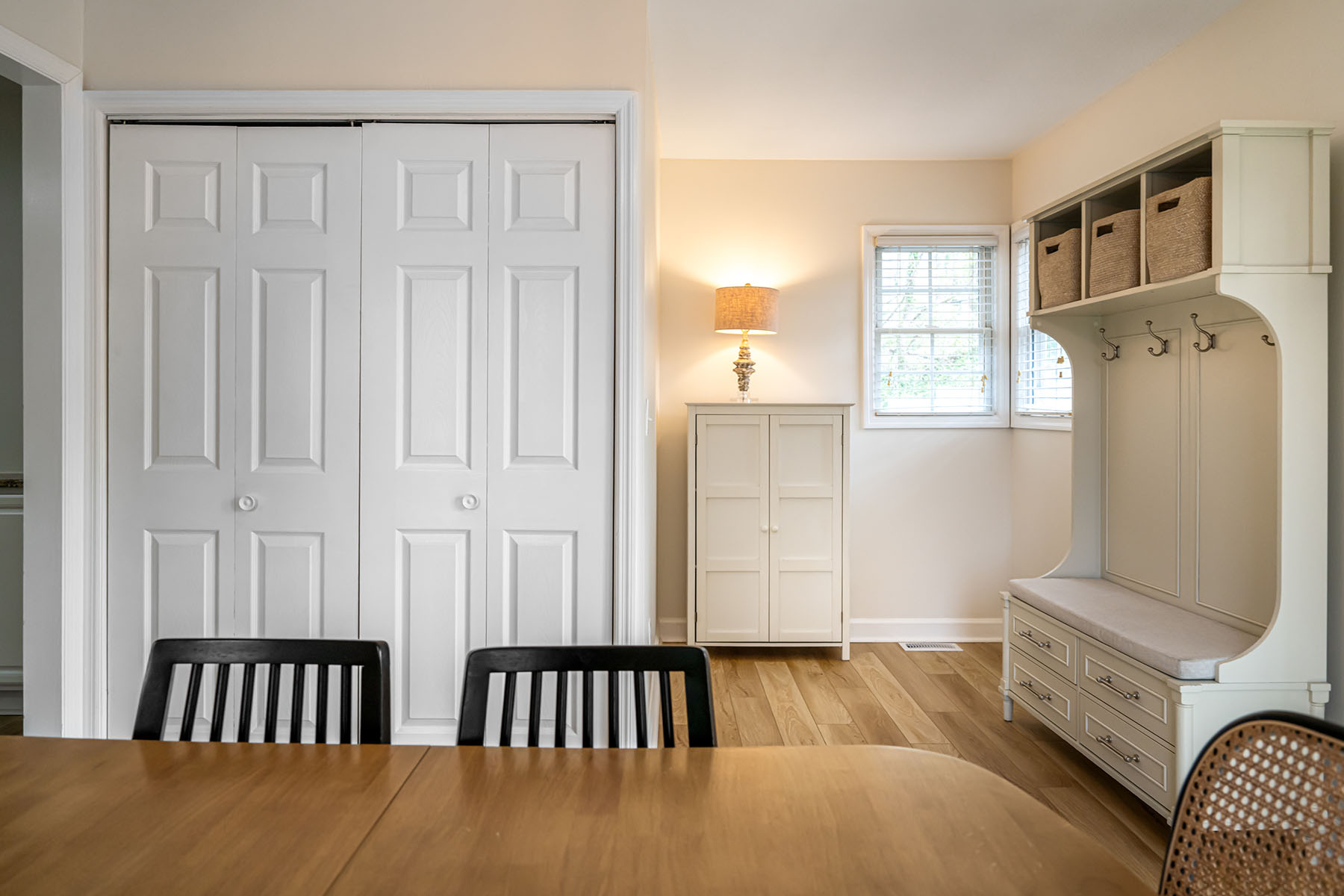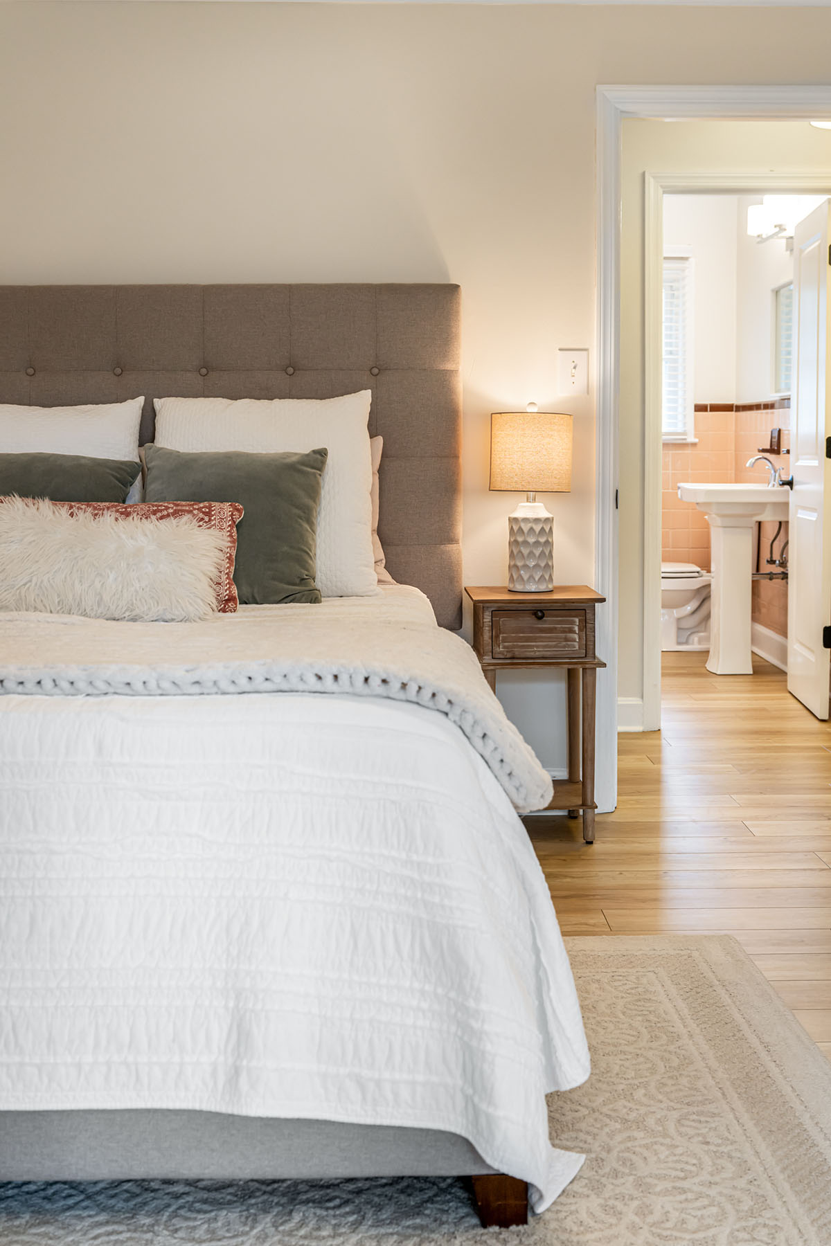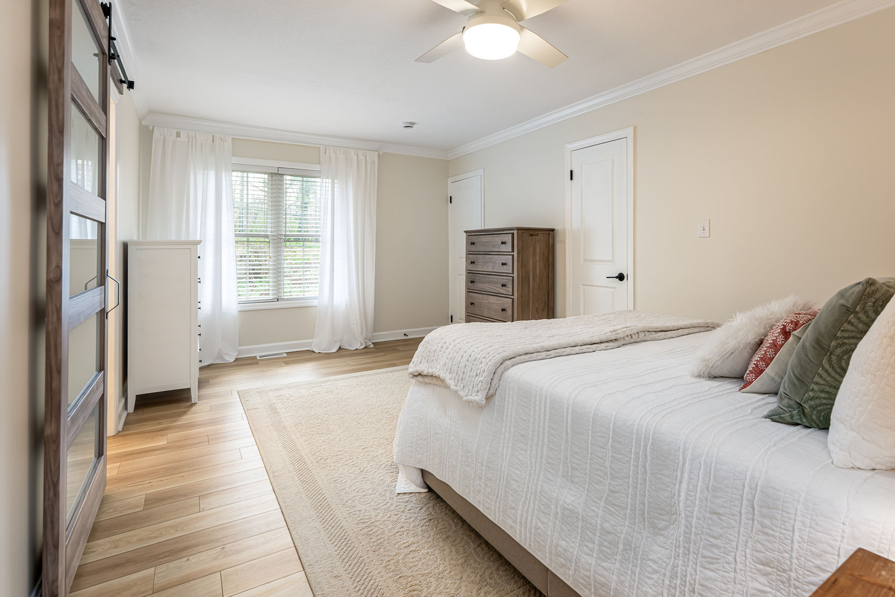 The primary suite includes dual closets and a fully updated ensuite bath. Two additional guest bedrooms are served by a hall bath with timeless wall tile, a pedestal sink, and a tub-shower combination.