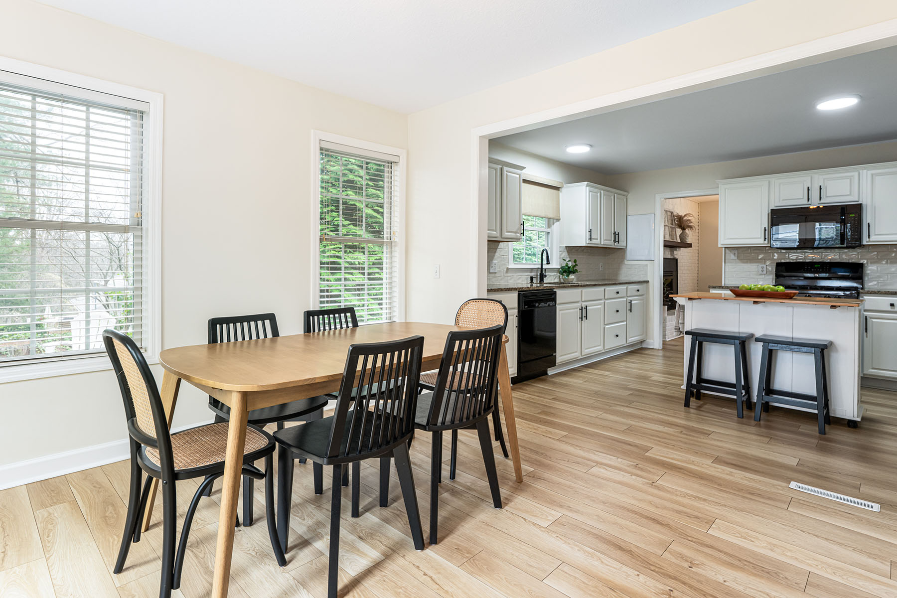 Inside, the living room is anchored by a brick accent wall with a gas fireplace, offering a warm and inviting space to gather. The kitchen and dining area flow seamlessly from the living space and feature a large island, with a layout that is bright, open, and well-suited for both daily living and entertaining. A pantry, laundry closet, and mudroom niche with exterior access add to the home's functionality. LVP flooring runs throughout, creating a clean and cohesive feel.