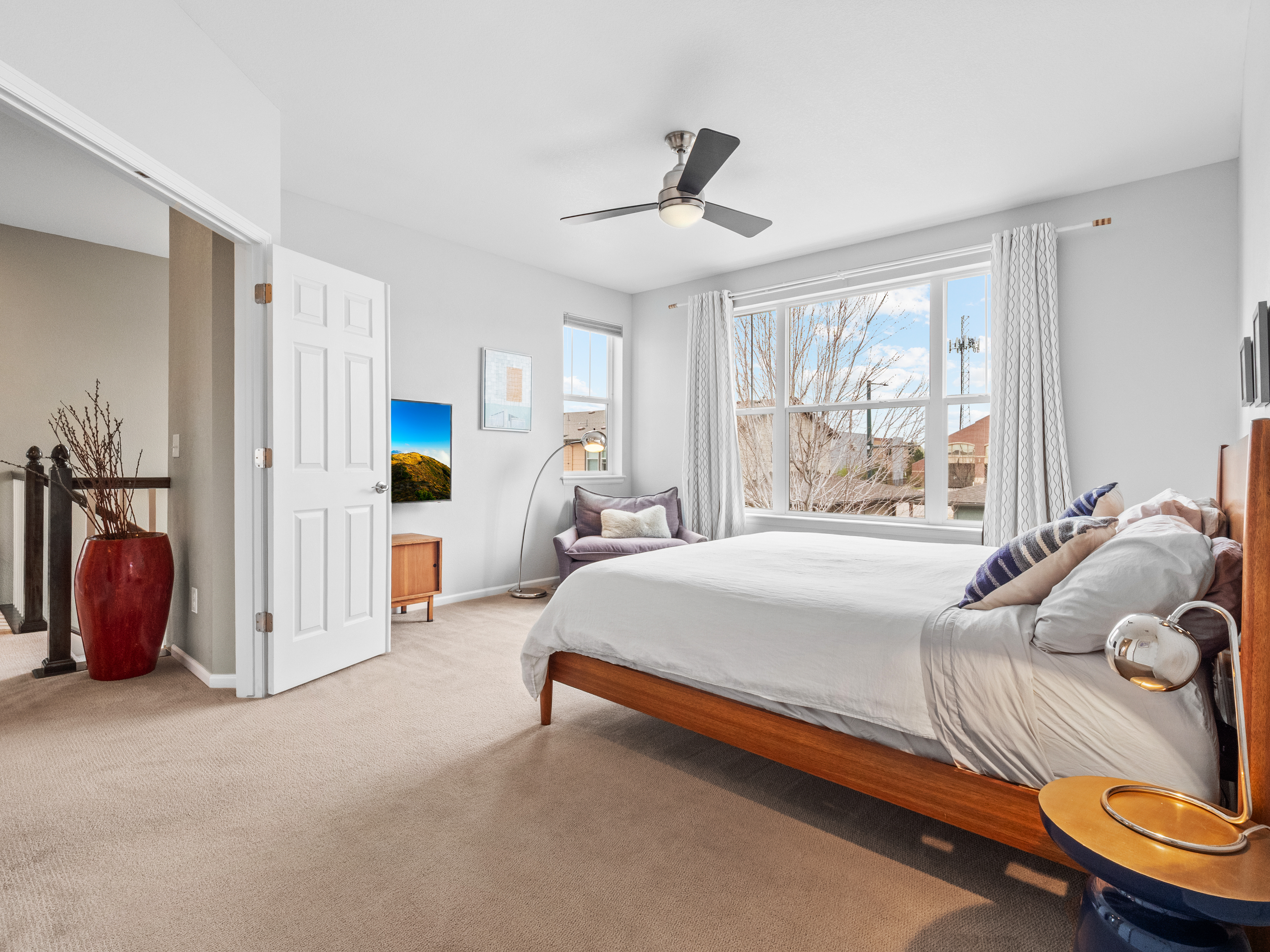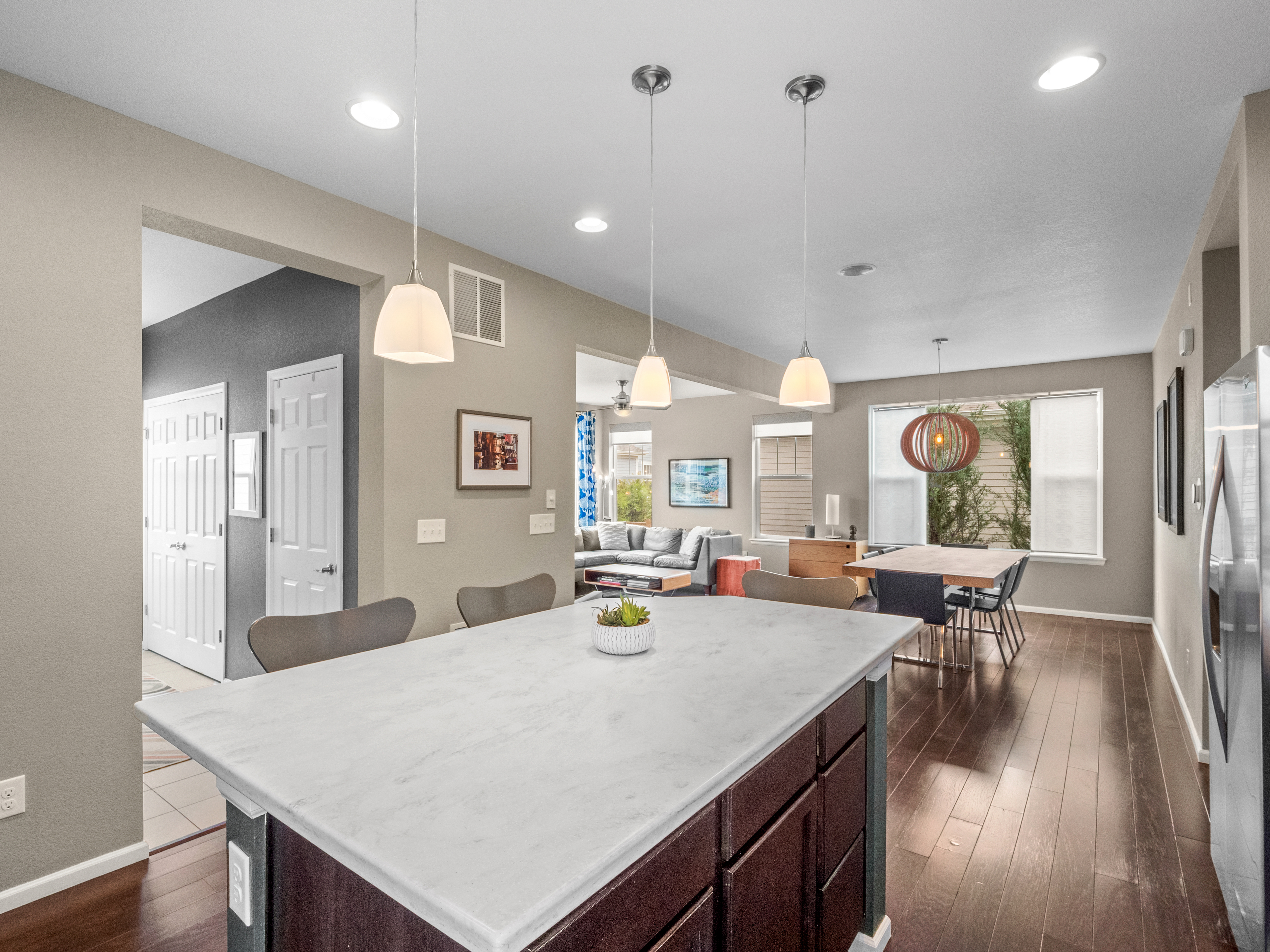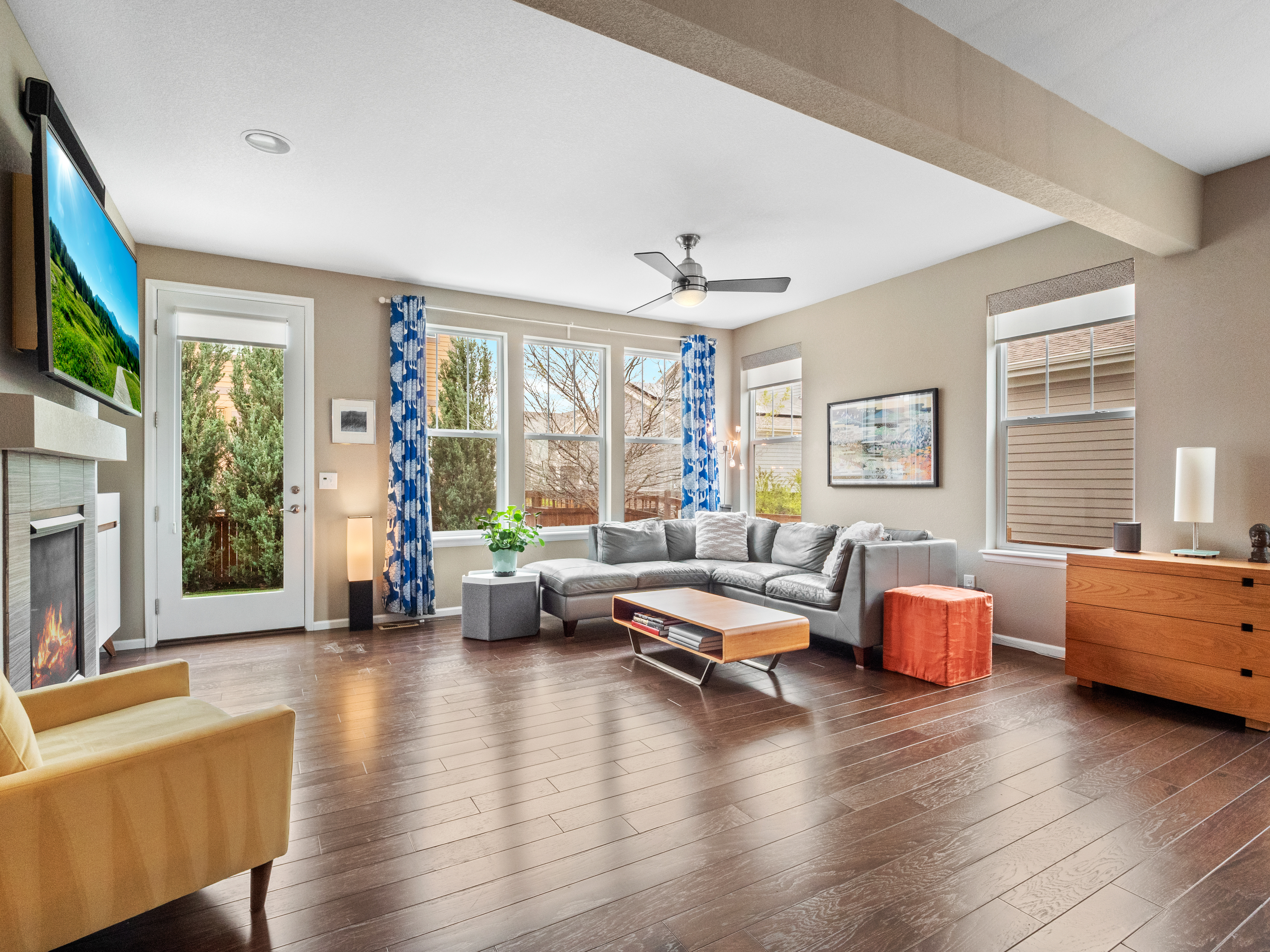 Welcome home to this 5 bed, 3.5 bath Standard Pacific home in Central Park West offering a thoughtfully designed floorplan, abundant natural light, and beautifully curated outdoor living. A gracious wraparound porch sets the tone, leading into a bright entry with warm wood floors and a layout that balances open gathering spaces with comfortable privacy.The main level flows seamlessly, creating an ideal setting for both daily living and entertaining. The kitchen is anchored by an oversized island and features ample cabinetry and a gas range, all opening to a spacious dining area and inviting living room with fireplace. A large mudroom enhances functionality, while the front office - currently styled as a light-filled wellness space - offers flexibility. A tucked-away powder room completes the level.Upstairs, the primary suite serves as a quiet retreat with a five-piece bath and an organized walk-in closet. Two additional bedrooms, a full hall bath, and a conveniently located laundry room provide a practical and well-balanced upper level. The Georgeson designed finished basement extends the home’s livability with a layout tailored for both relaxation and recreation, including two additional bedrooms with generous natural light.Outdoor living has been expertly planned to maximize both function and enjoyment. The multi-use driveway is framed by irrigated garden beds and built-in seating, while the private, low-maintenance backyard features an outdoor kitchen, contoured putting green, privacy maximizing columnar junipers, and a large patio with shaded dining and a built-in firepit. You will love all the spaces to gather and unwind.Recent updates, including fresh exterior paint, new roof, AC, and hot water heater, offer peace of mind, while a fully owned solar array provides meaningful energy savings. An oversized garage with EV hookups adds everyday convenience. Just moments from the shops and restaurants at 29th Avenue Town Center and with easy access to light rail, this home delivers a refined blend of space, comfort, and connected city living.