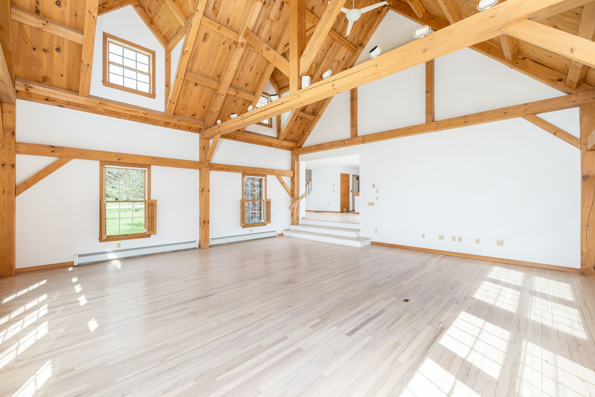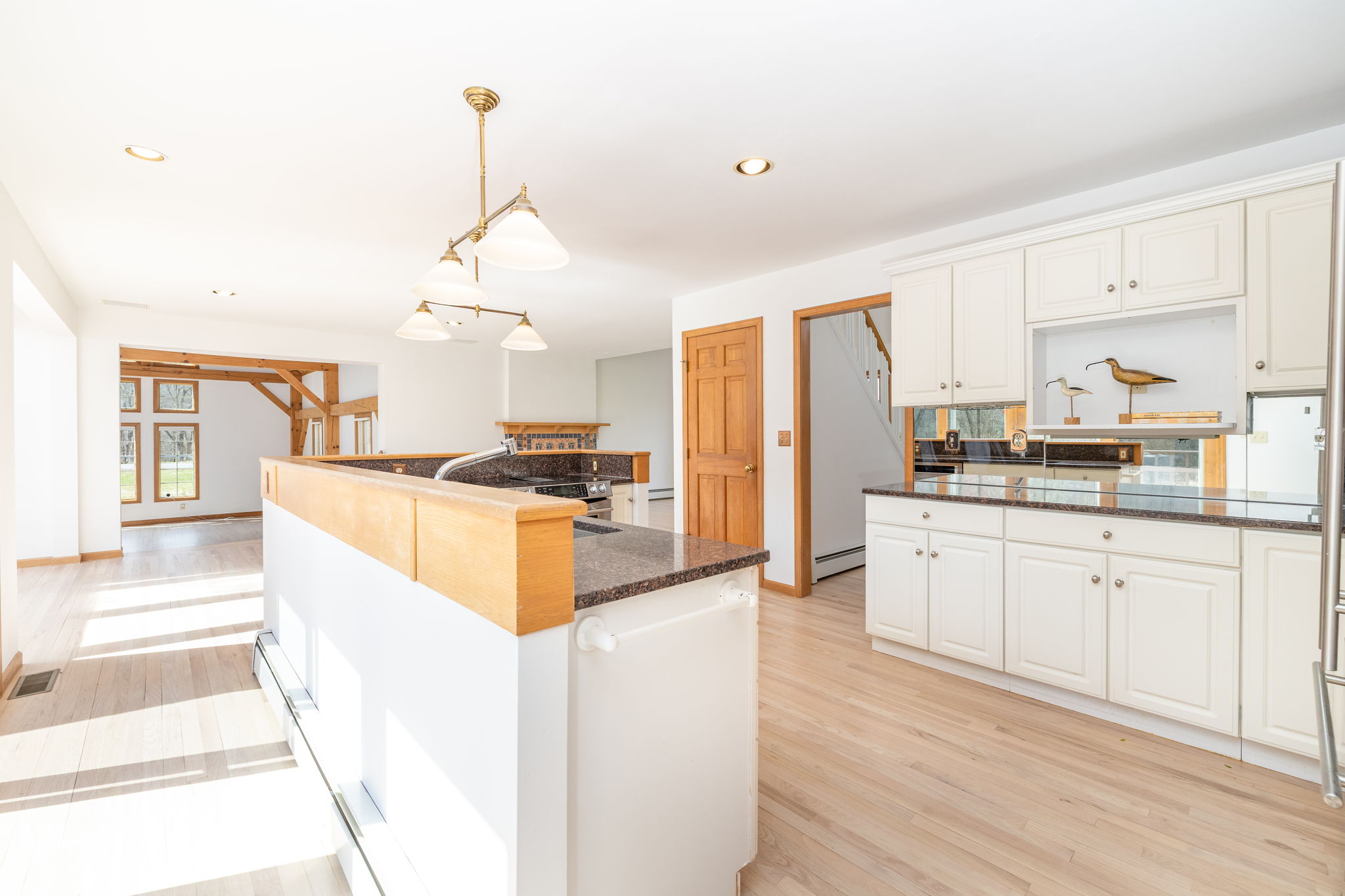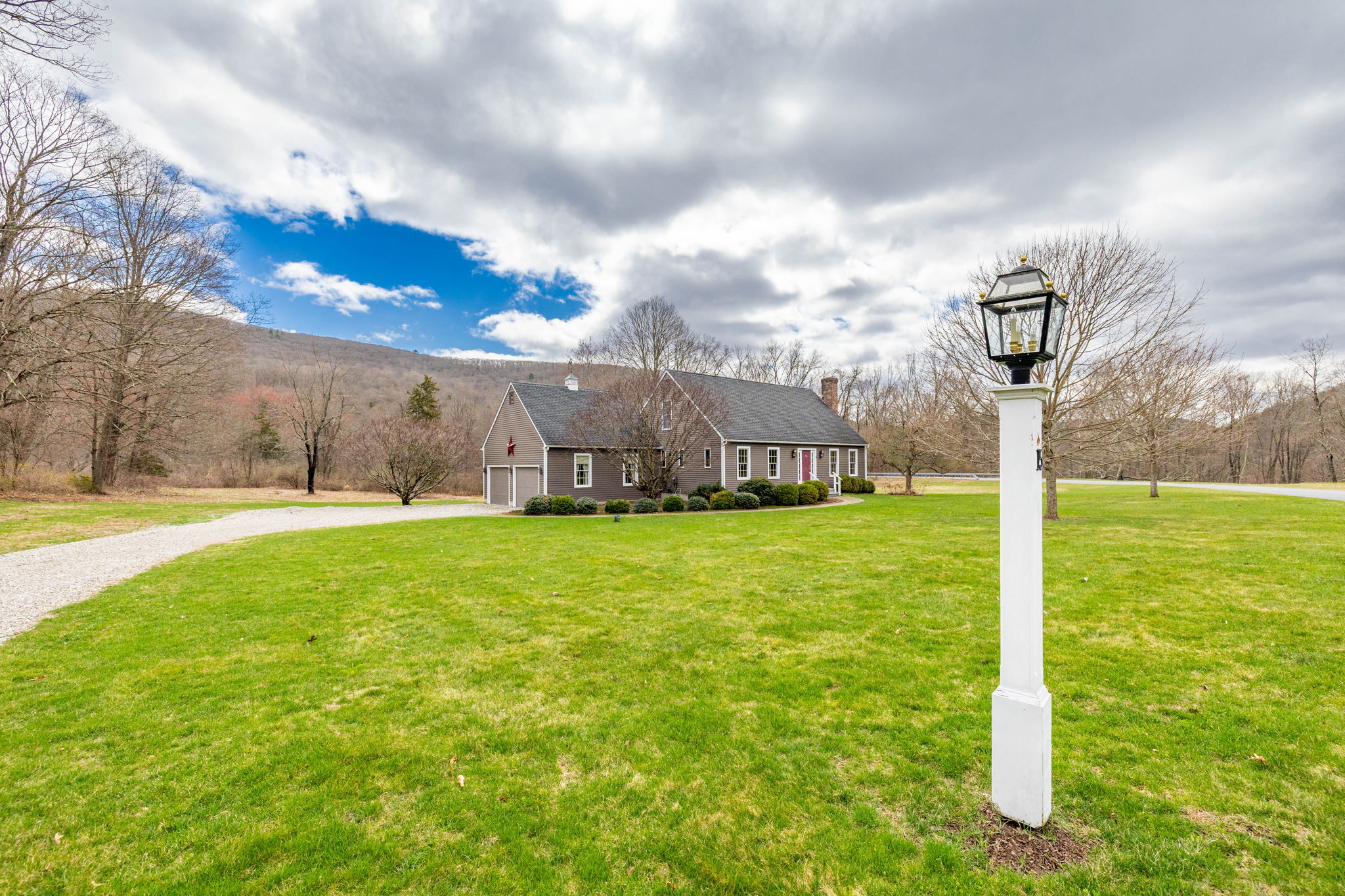 An exquisite three-bedroom Cape-style residence, this property is poised upon four pristine acres on Studio Hill. Constructed in 1990 and meticulously enhanced by an expansive great room addition in 1993, this move-in ready home offers a sophisticated blend of classic design and modern amenity. The sun-drenched, open concept floor plan commences with a welcoming living room, anchored by a handsome wood-burning fireplace. The kitchen features elegant granite countertops with stainless steel appliances, with sliding glass doors providing seamless ingress to the deck for al fresco dining. The adjacent dining area flows effortlessly into the main living space, providing an ideal layout for both intimate dinners and larger holiday gatherings. The architectural centerpiece of the home is the impressive post and beam great room. The main level is further distinguished by a primary bedroom suite complete with a private walk-in closet, which facilitates convenient single-level living. The first floor also hosts the laundry facility and provides access to the attached two-car garage. The upper level is thoughtfully configured with two guest bedrooms and a full bath. Refinished hardwood flooring graces the entire residence. The property's beautifully manicured grounds are framed by natural woodlands, creating a picturesque sanctuary and an exceptional setting for observing local wildlife and birdwatching.