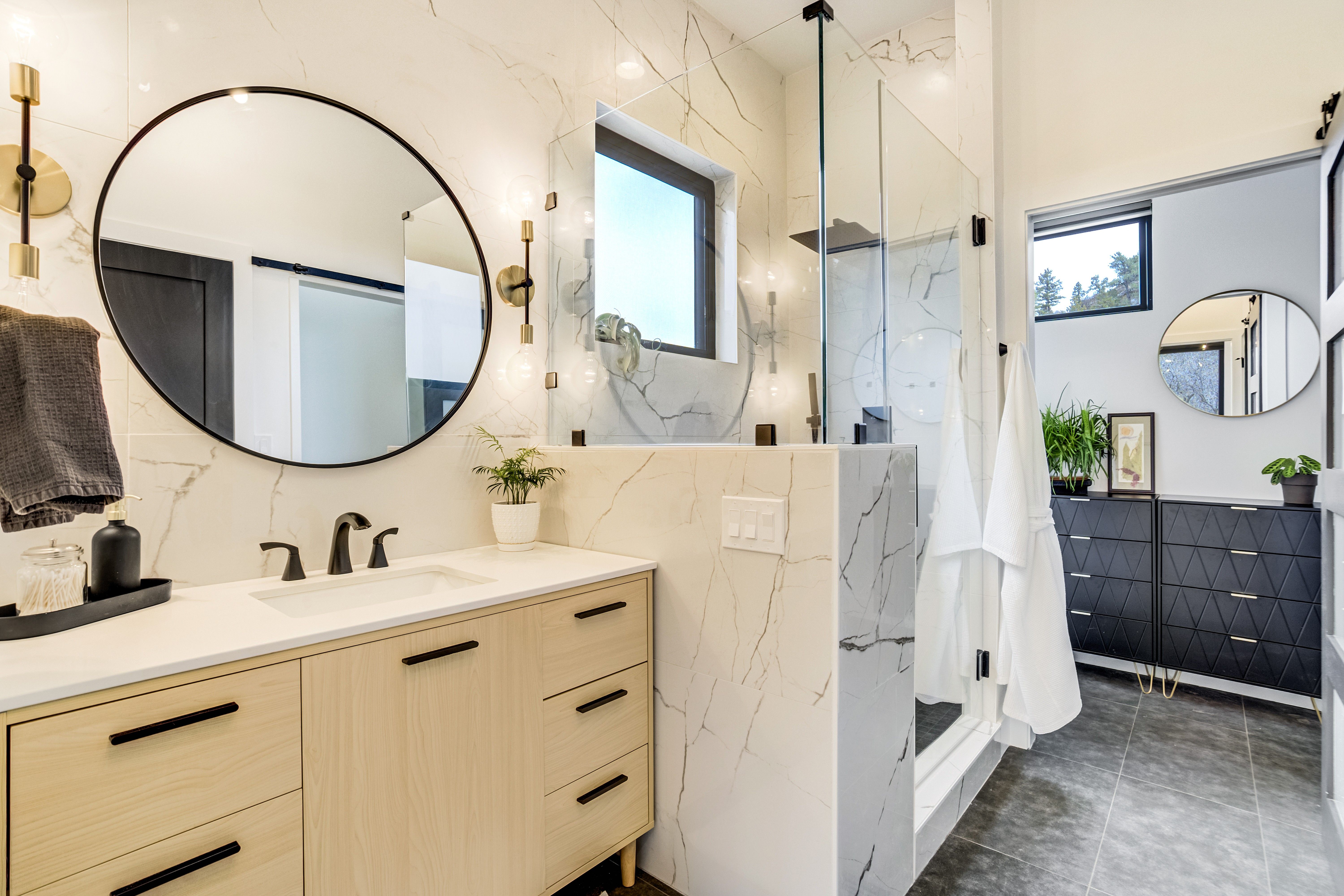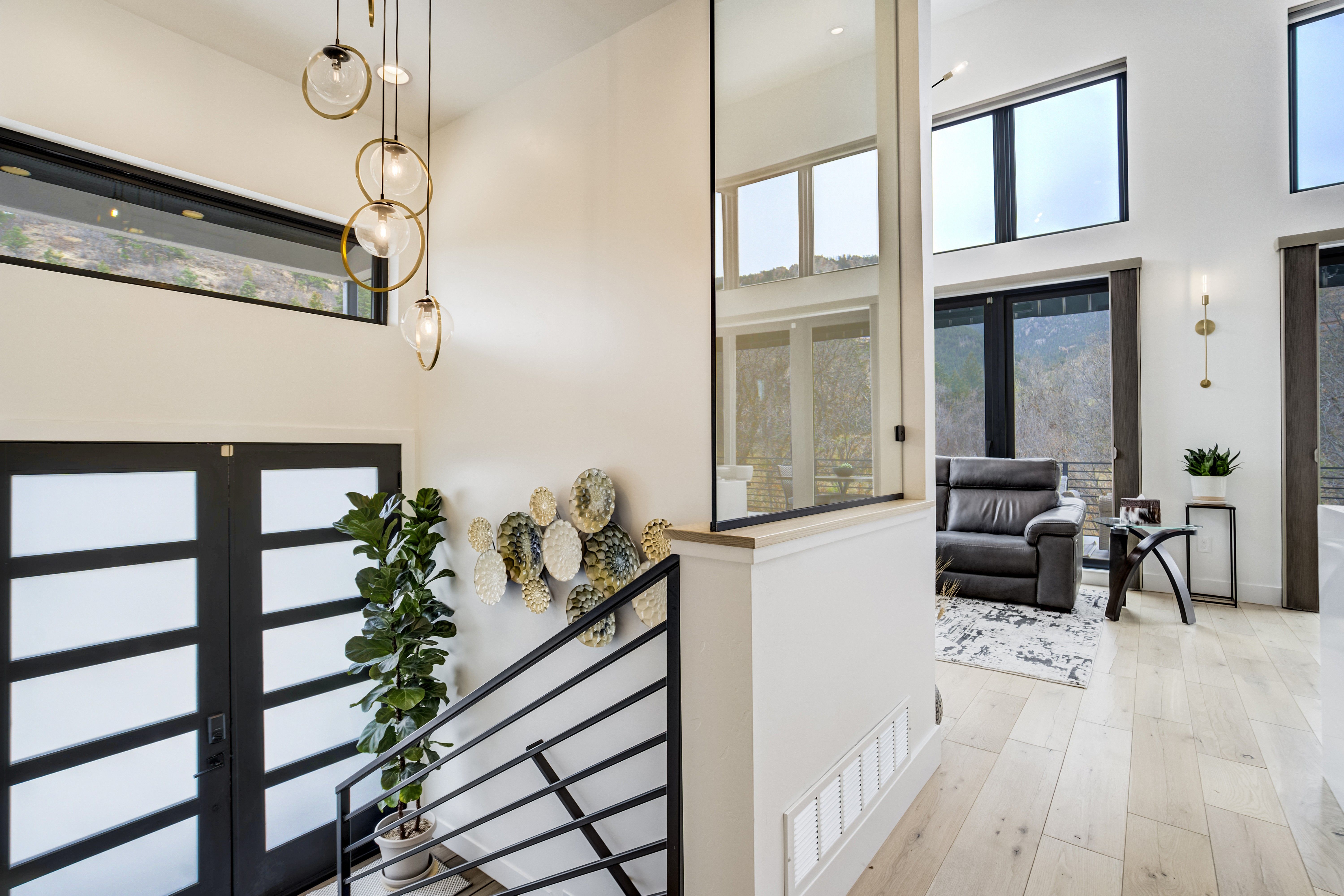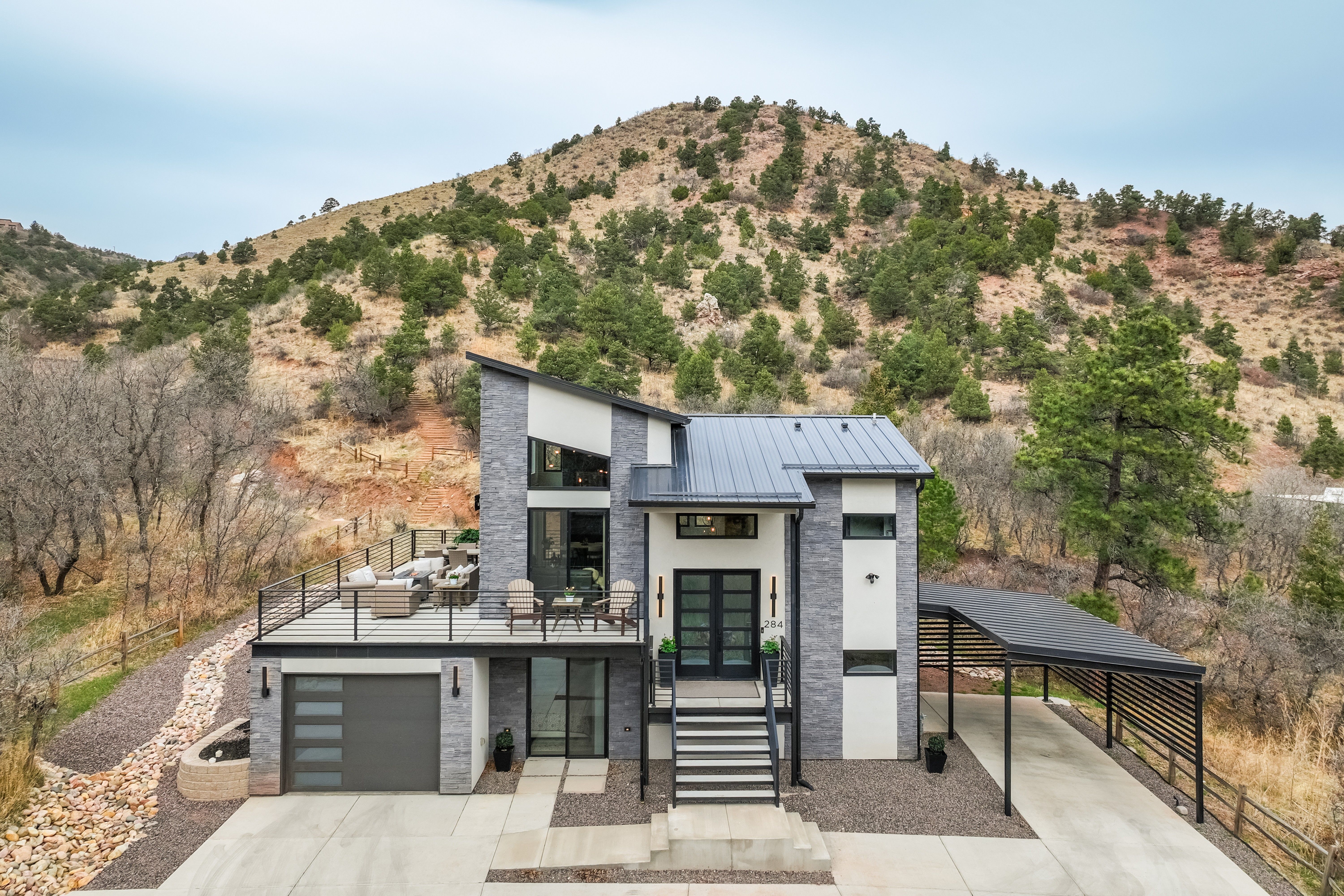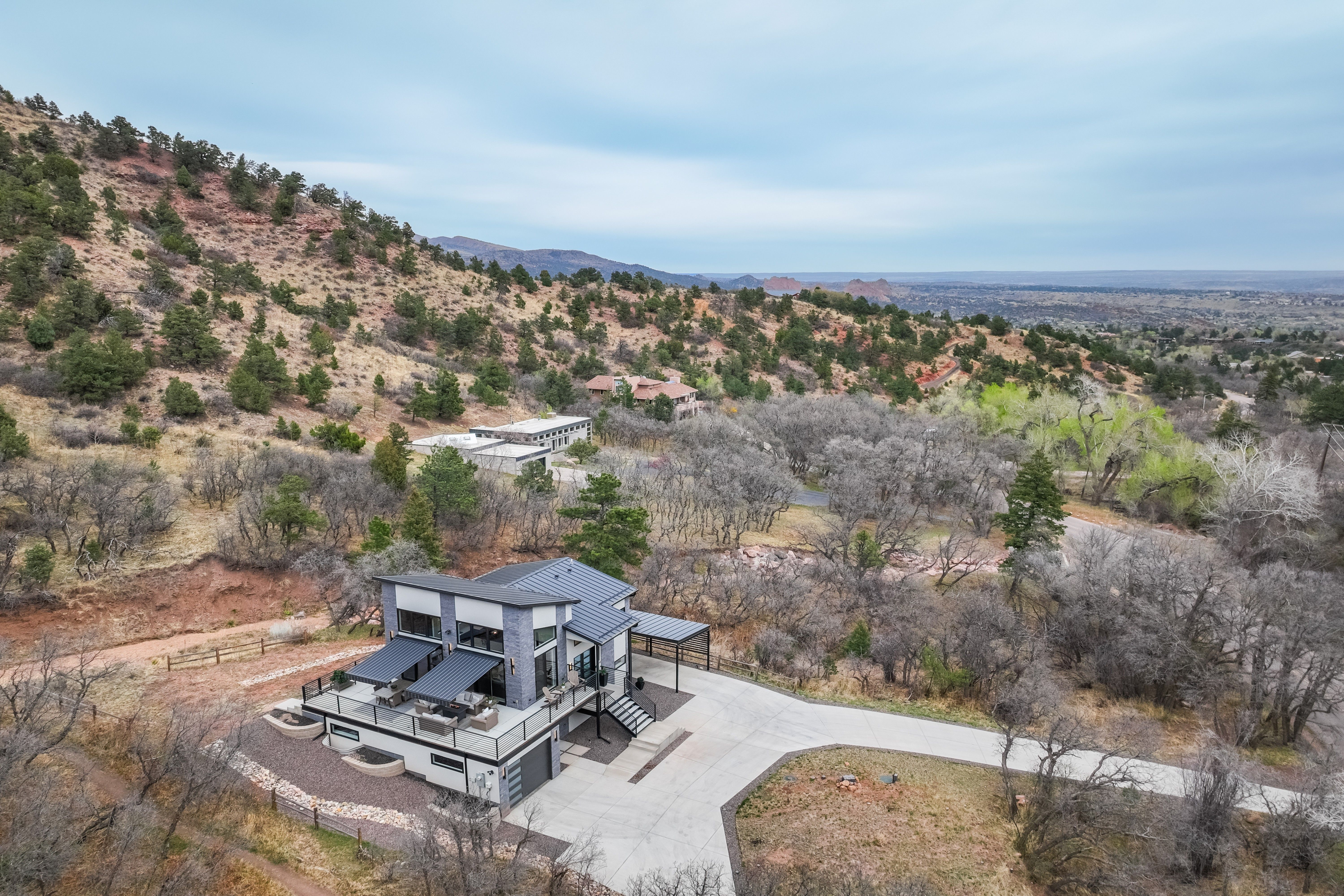 This luxury mountain retreat has a coveted Crystal Park Road location—just before the Crystal Park gated community—only 5 minutes to Manitou Avenue and Highway 24. Enjoy the best of mountain living without the long commute. Set on 2.54 acres with mountains on three sides, this remarkable contemporary home offers breathtaking panoramic views and direct access to the Intemann Trail—your backyard truly becomes your playground. Built in 2023, the home blends modern design with natural surroundings, featuring soaring vaulted ceilings, abundant natural light, and high-end finishes throughout. The custom kitchen showcases paneled front appliances seamlessly integrated into cabinetry, and waterfall quartz countertops creating a clean, sophisticated aesthetic. The main-level primary suite offers a fully tiled bath with quartz countertop and spacious walk-in closet. Step outside to the expansive 652 sq ft deck complete with KE Elite Plus awnings with drop valance —an extension of your living space—perfect for dining, relaxing, and taking in the surrounding beauty. The lower-level features two additional bedrooms and a luxurious bathroom complete with a soaking tub and oversized shower. A second kitchen/laundry area, mudroom entry from the fully finished and insulated garage, and thoughtful layout provide flexibility and convenience. Additional upgrades include Hunter Douglas window coverings throughout (with blackout option in lower-level and master bedrooms), and a carport designed to accommodate oversized vehicles. A rare opportunity to own a modern mountain retreat with unmatched access, views, and convenience.