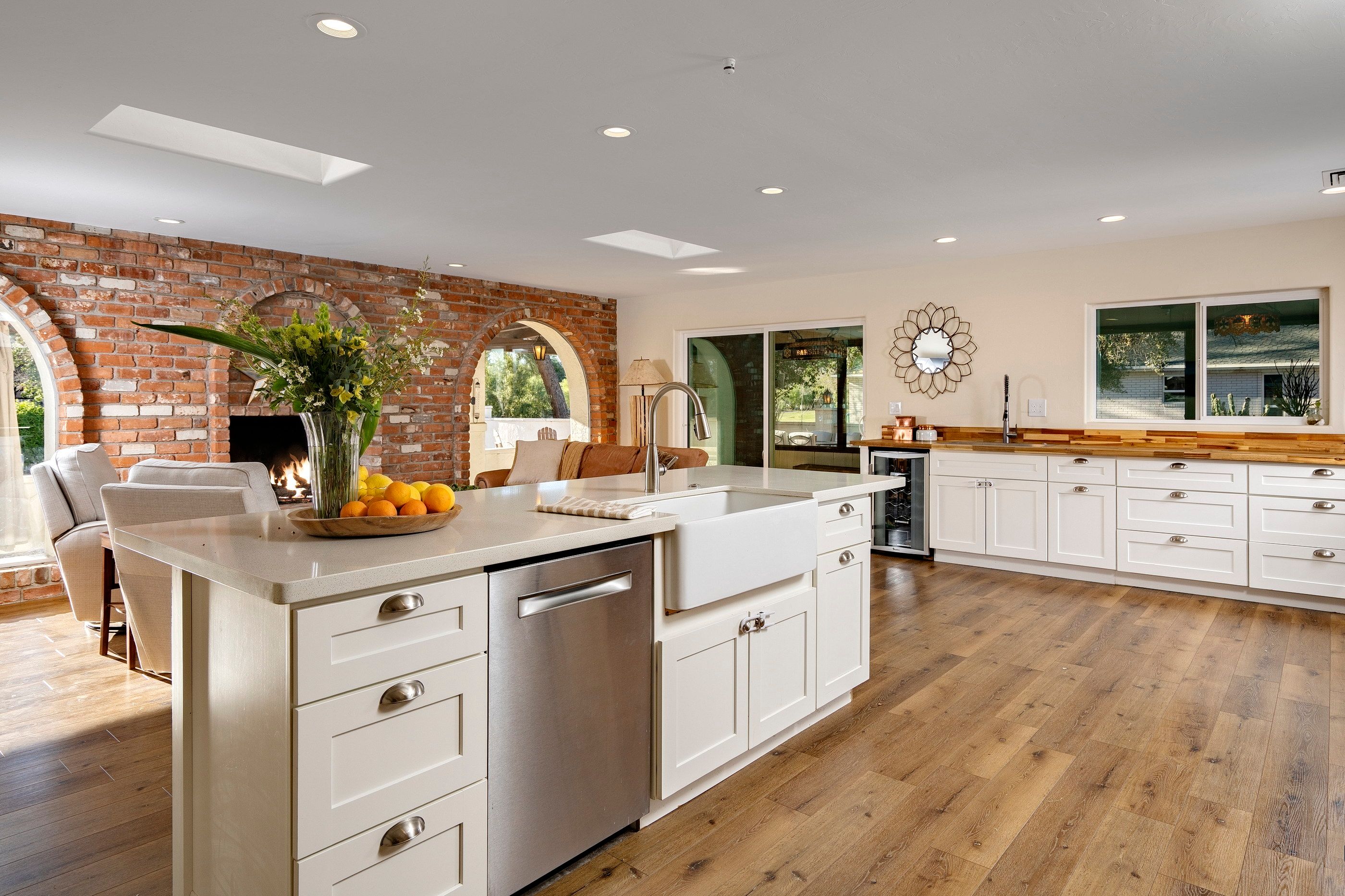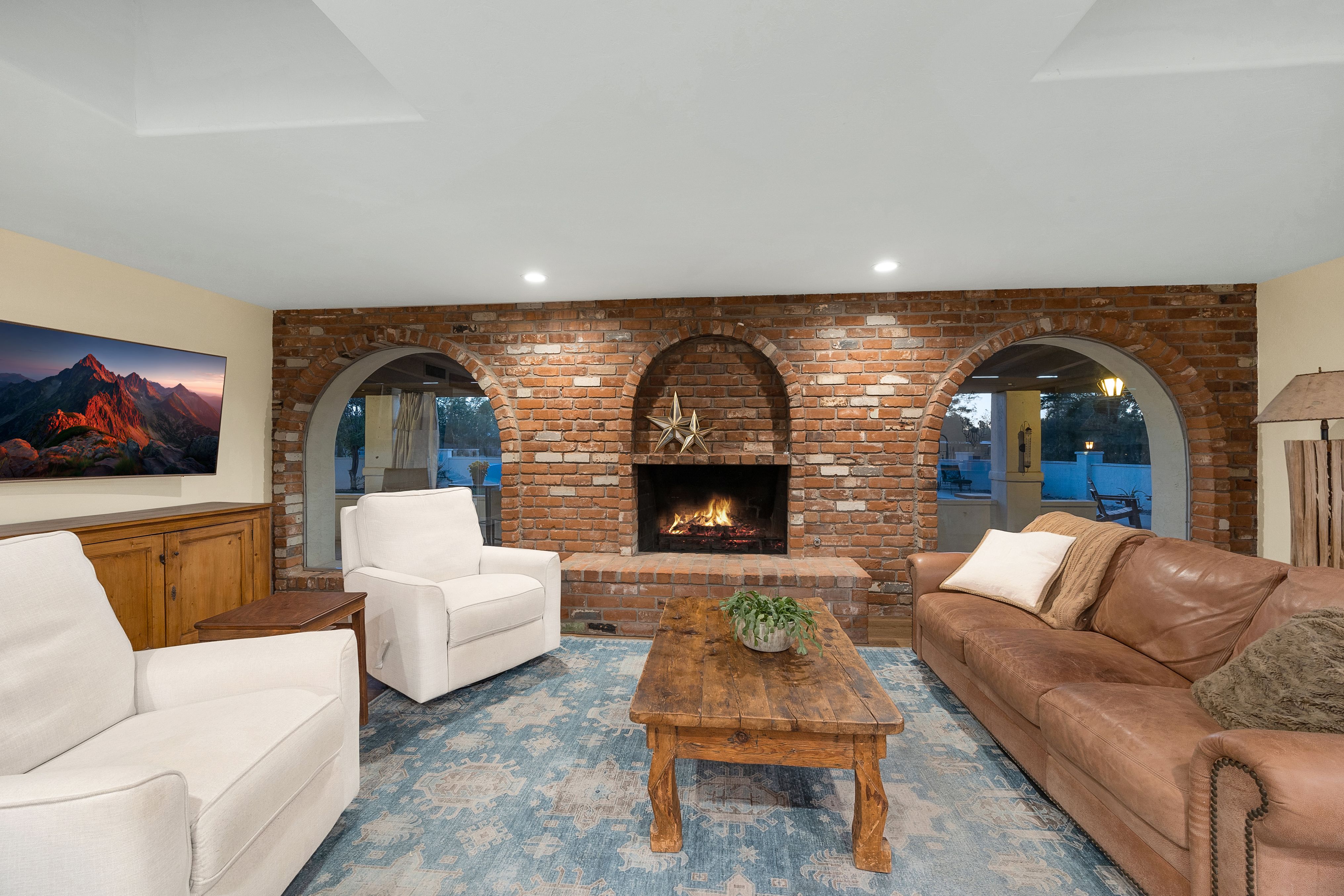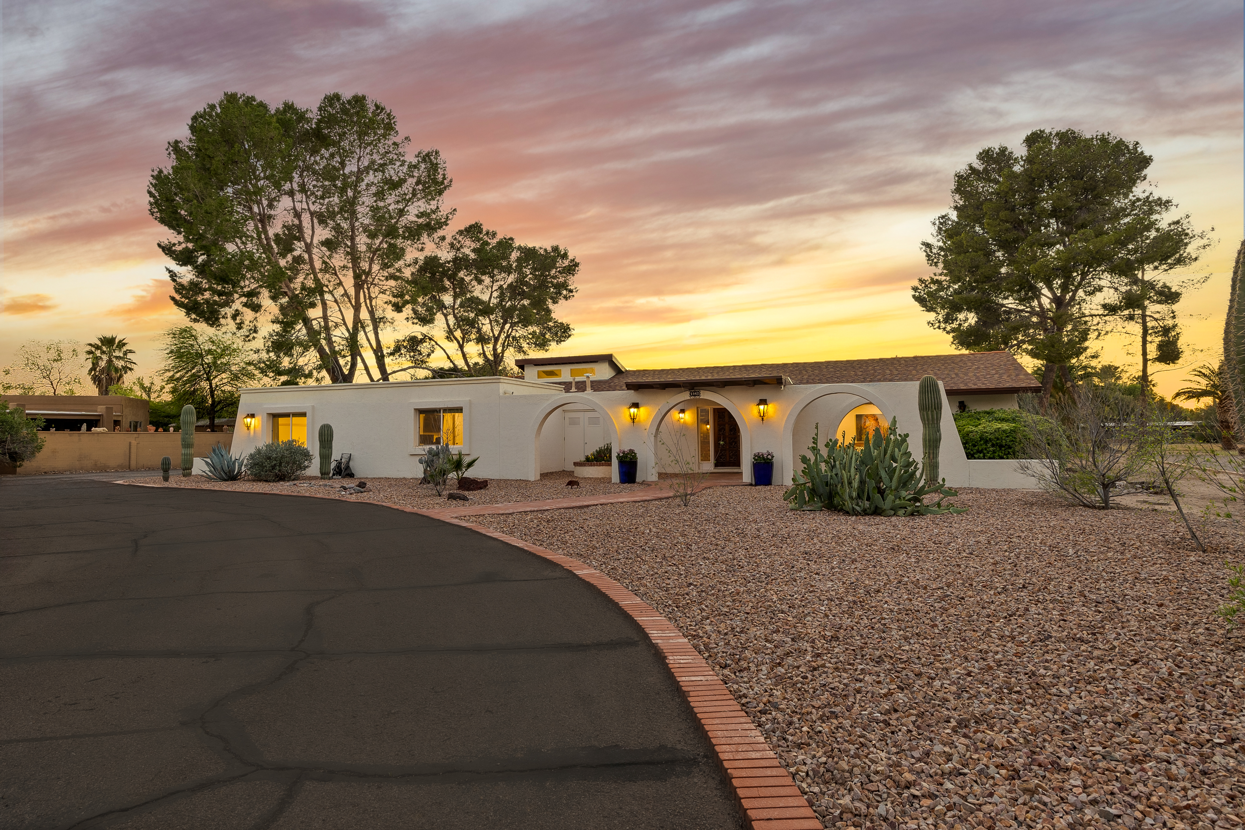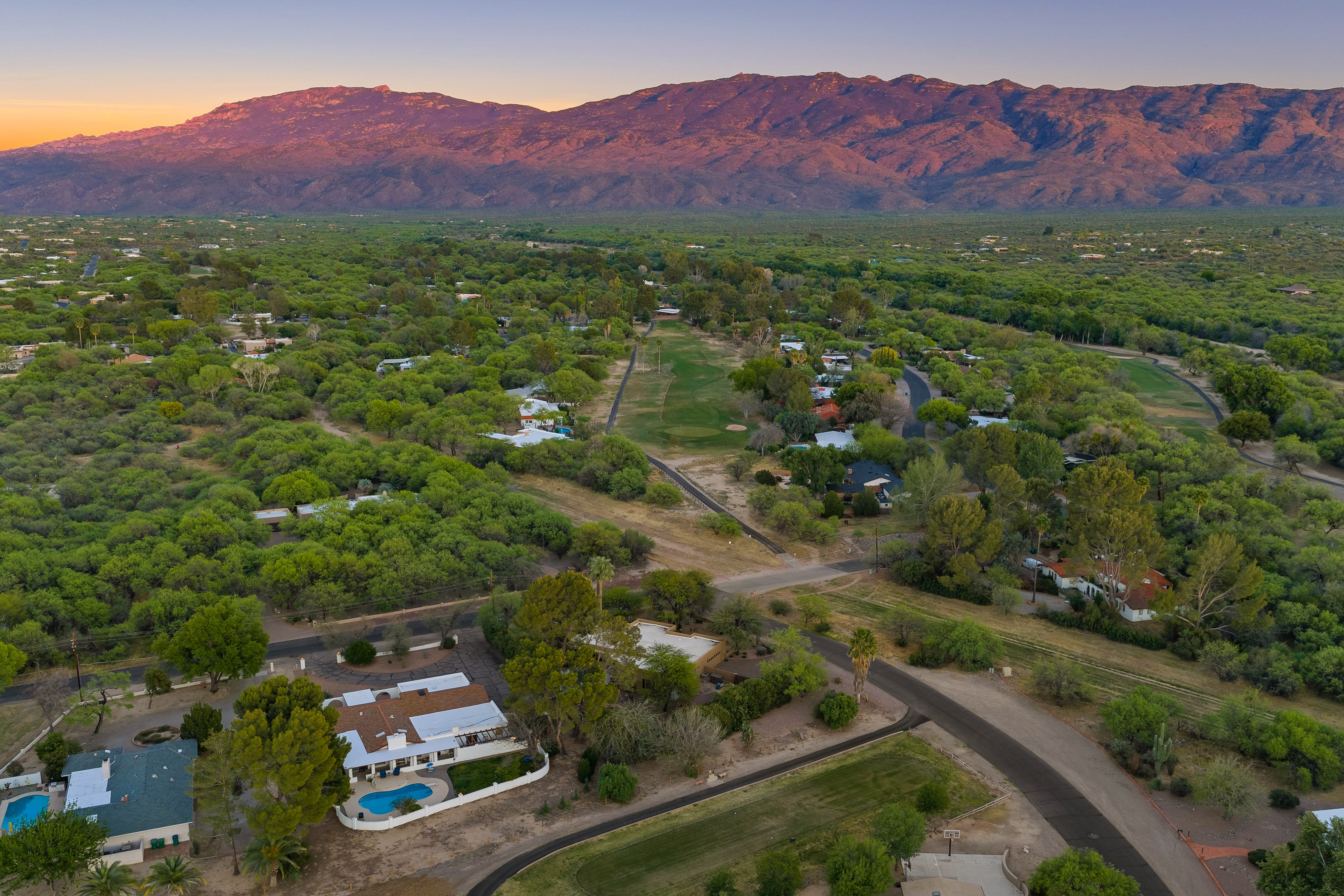 Completely renovated five-bedroom, four-bathroom masonry-built home situated on a private, .65-acre lot in the sought-after 49ers Country Club in the tranquil Tanque Verde Valley. This nearly 4000-square-foot home, set on the 17th hole of the 49ers golf course was thoughtfully redesigned to maintain the charm of the original home while bringing every inch up to date. Set back on the lot, a circular driveway and a red-brick walkway welcome you to this modern ranch-style home that preserves classic character with wood-beam accents, exposed brick, and large arched windows that flood the space with natural light. Spacious entry with rich engineered wood floors, a formal dining area with room for large-scale entertaining, and a spacious living room. The kitchen with a center island and breakfast bar opens to the family room with a brick fireplace and flows into an Arizona room that serves as a flexible entertaining space, refuge from the elements, and additional space for serving food and storing kitchen supplies. Updates and upgrades in the kitchen include quartz and butcher block counters, new cabinetry and hardware, stainless steel appliances including a magnificent GE Monogram gas range with a hood vent, two sinks, wine/beverage refrigerator, and so much more. The split-bedroom floor plan adds to the privacy and livability of this five bedroom plus bonus room home. The versatile bonus room, currently a playroom, can easily serve as an office, den, music room, or media space. The next-level primary suite features a beehive fireplace, a private patio, and a beautifully renovated bathroom with two sinks/vanities, soaking tub with wood-accent feature wall, custom tile shower with glass enclosure, and a spacious walk-in closet with custom built-ins. The additional bathrooms have been updated with new fixtures, tile, vanities, mirrors, and custom tiled showers. The backyard offers a resort-style setting with a newly plastered pool equipped with a safety net, a large grassy area, and covered patios that create an inviting outdoor living space. Sunset and golf course views complement this lush homesite lined with mature trees.This home has new Pex water lines, new floors, new windows & blinds, new pool pump, and pool recently re-plastered. Coveted 49ers Country Club amenities include golf, workout facilities, pool, restaurant and bar, holiday events, and outdoor summer movie nights. An active swim team and summer camps create a welcoming community atmosphere. The home is located within the highly rated Tanque Verde School District and is very close to the elementary and middle school. High-demand Hermosa Montessori school is close-by. Private schools such as Desert Christian, St. Michael's, and Castlehill Country Day School are within 20 minutes of the neighborhood. Located in the lush Tanque Verde Valley--often called the Green Jewel of the Desert--this exceptional property enjoys a setting unlike anywhere else in Tucson. Traversed by two seasonal creeks, the valley offers an uncommon green desert environment shaded by mature trees and unparalleled natural beauty. Home to approximately 15,000 residents, Tanque Verde is defined by larger parcel properties, open space, and direct access to both the Catalina and Rincon Mountains. Situated at the base of Mt. Lemmon, residents enjoy the rare ability to ski or play in the snow during winter months and escape Tucson's summer heat in the cool mountain air. The result is a relaxed, scenic lifestyle in one of the most beautiful and distinctive settings in the Sonoran Desert.