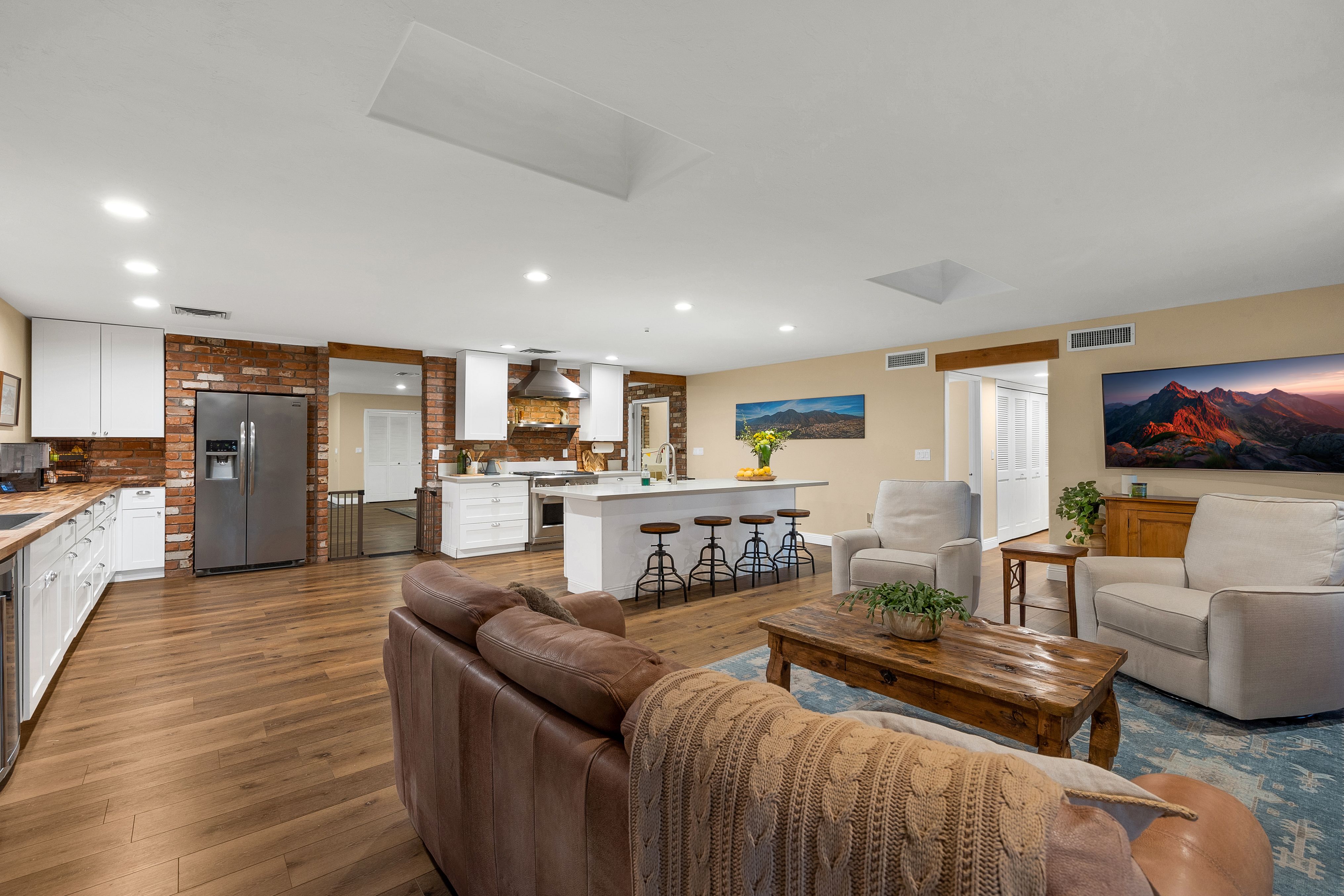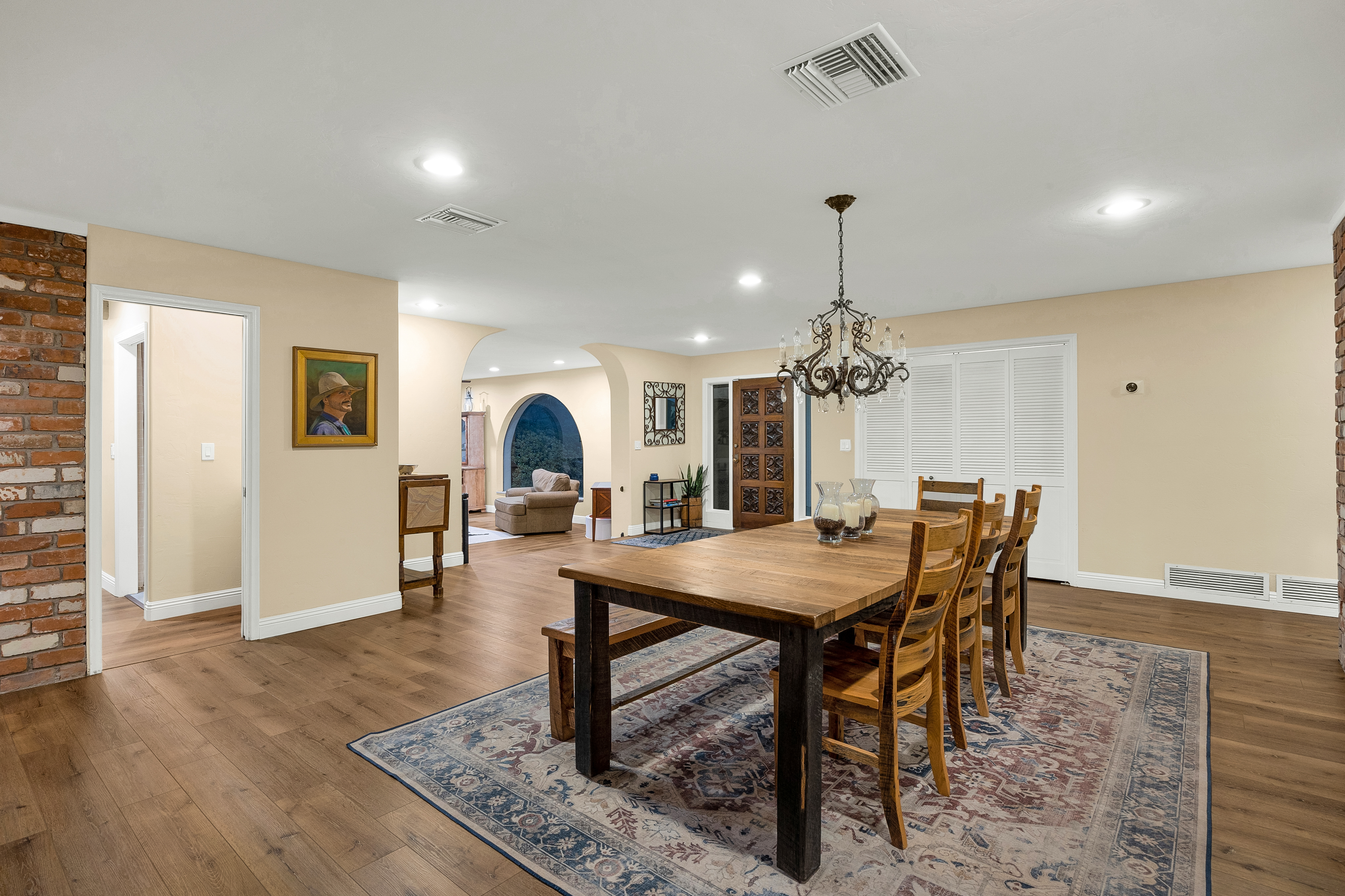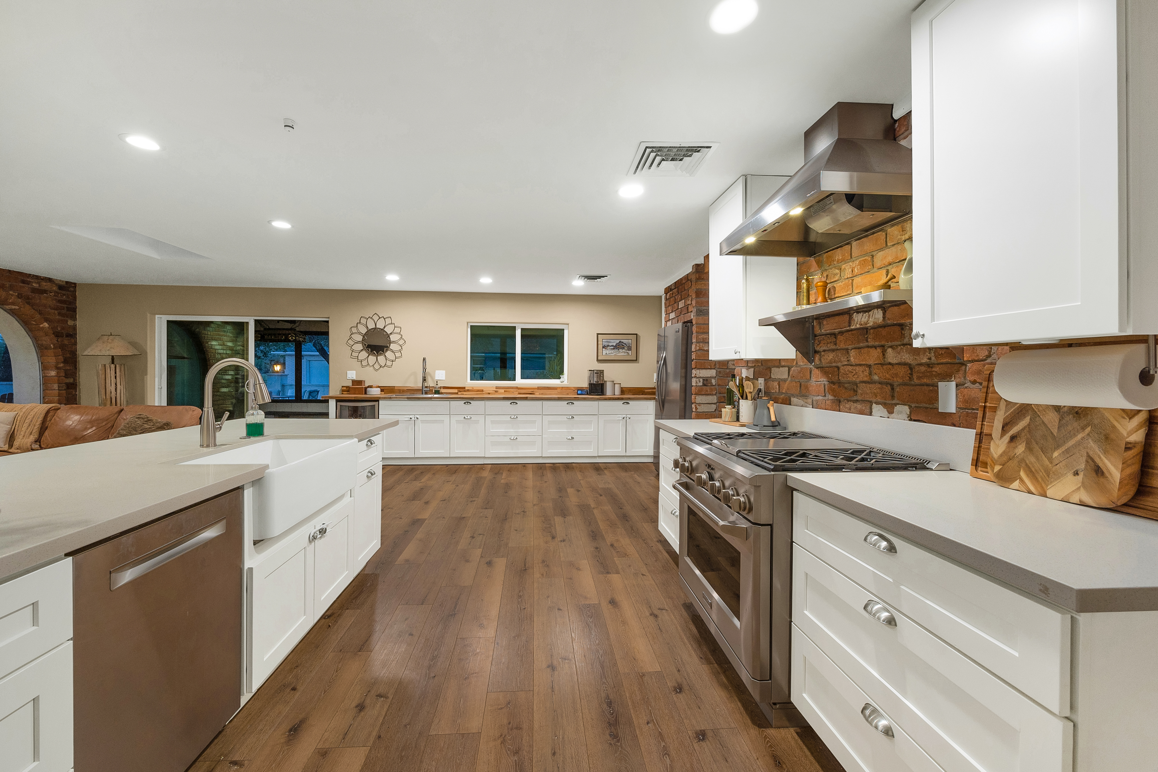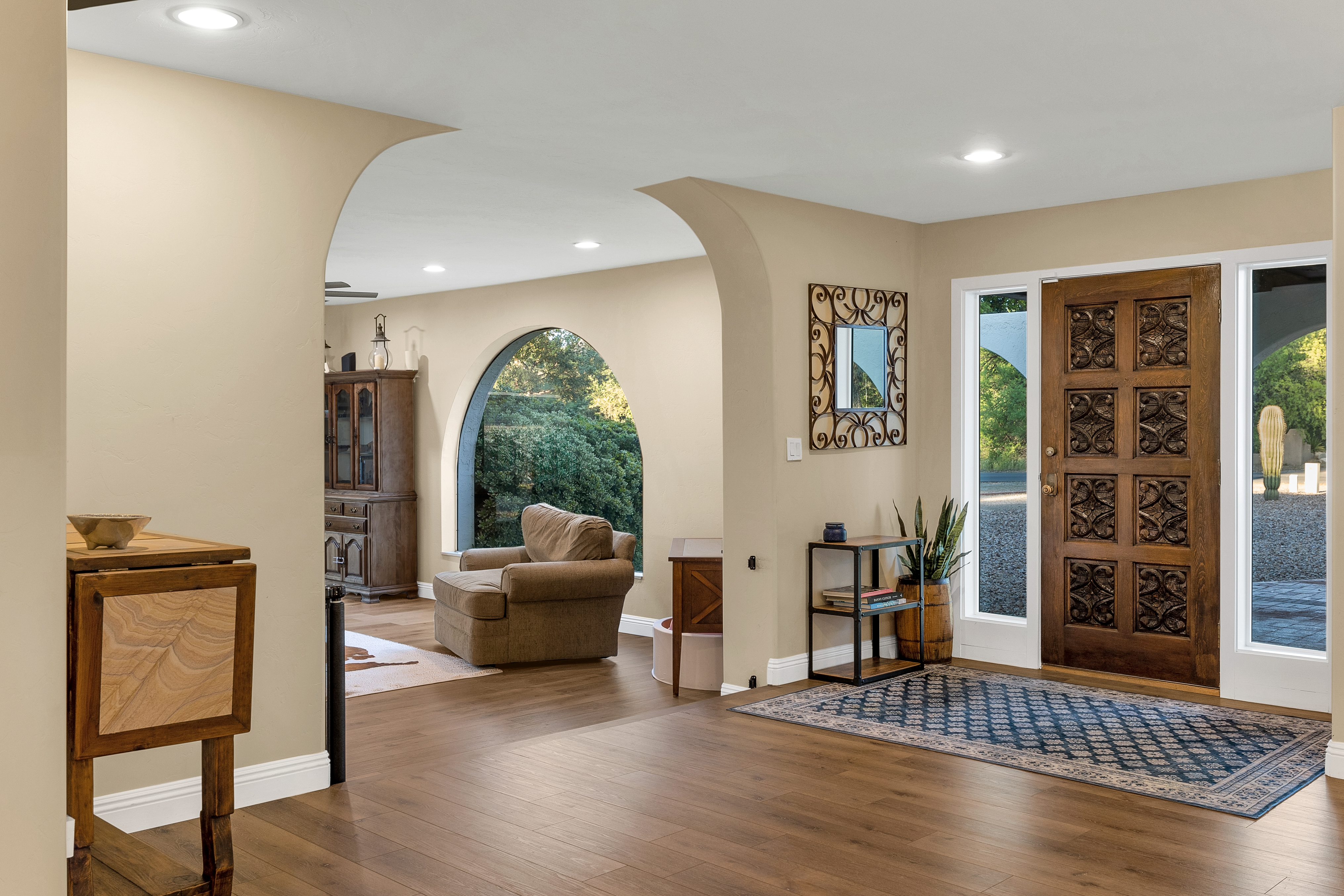 Completely renovated five-bedroom, four-bathroom masonry-built home situated on a private, .65-acre lot in the sought-after 49ers Country Club in the tranquil Tanque Verde Valley. This nearly 4000-square-foot home, set on the 17th hole of the 49ers golf course was thoughtfully redesigned to maintain the charm of the original home while bringing every inch up to date. Set back on the lot, a circular driveway and a red-brick walkway welcome you to this modern ranch-style home that preserves classic character with wood-beam accents, exposed brick, and large arched windows that flood the space with natural light. Spacious entry with rich engineered wood floors, a formal dining area with room for large-scale entertaining, and a spacious living room. The kitchen with a center island and breakfast bar opens to the family room with a brick fireplace and flows into an Arizona room that serves as a flexible entertaining space, refuge from the elements, and additional space for serving food and storing kitchen supplies. Updates and upgrades in the kitchen include quartz and butcher block counters, new cabinetry and hardware, stainless steel appliances including a magnificent GE Monogram gas range with a hood vent, two sinks, wine/beverage refrigerator, and so much more. The split-bedroom floor plan adds to the privacy and livability of this five bedroom plus bonus room home. The versatile bonus room, currently a playroom, can easily serve as an office, den, music room, or media space. The next-level primary suite features a beehive fireplace, a private patio, and a beautifully renovated bathroom with two sinks/vanities, soaking tub with wood-accent feature wall, custom tile shower with glass enclosure, and a spacious walk-in closet with custom built-ins. The additional bathrooms have been updated with new fixtures, tile, vanities, mirrors, and custom tiled showers. The backyard offers a resort-style setting with a newly plastered pool equipped with a safety net, a large grassy area, and covered patios that create an inviting outdoor living space. Sunset and golf course views complement this lush homesite lined with mature trees.This home has new Pex water lines, new floors, new windows & blinds, new pool pump, and pool recently re-plastered. Coveted 49ers Country Club amenities include golf, workout facilities, pool, restaurant and bar, holiday events, and outdoor summer movie nights. An active swim team and summer camps create a welcoming community atmosphere. The home is located within the highly rated Tanque Verde School District and is very close to the elementary and middle school. High-demand Hermosa Montessori school is close-by. Private schools such as Desert Christian, St. Michael's, and Castlehill Country Day School are within 20 minutes of the neighborhood. Located in the lush Tanque Verde Valley--often called the Green Jewel of the Desert--this exceptional property enjoys a setting unlike anywhere else in Tucson. Traversed by two seasonal creeks, the valley offers an uncommon green desert environment shaded by mature trees and unparalleled natural beauty. Home to approximately 15,000 residents, Tanque Verde is defined by larger parcel properties, open space, and direct access to both the Catalina and Rincon Mountains. Situated at the base of Mt. Lemmon, residents enjoy the rare ability to ski or play in the snow during winter months and escape Tucson's summer heat in the cool mountain air. The result is a relaxed, scenic lifestyle in one of the most beautiful and distinctive settings in the Sonoran Desert.