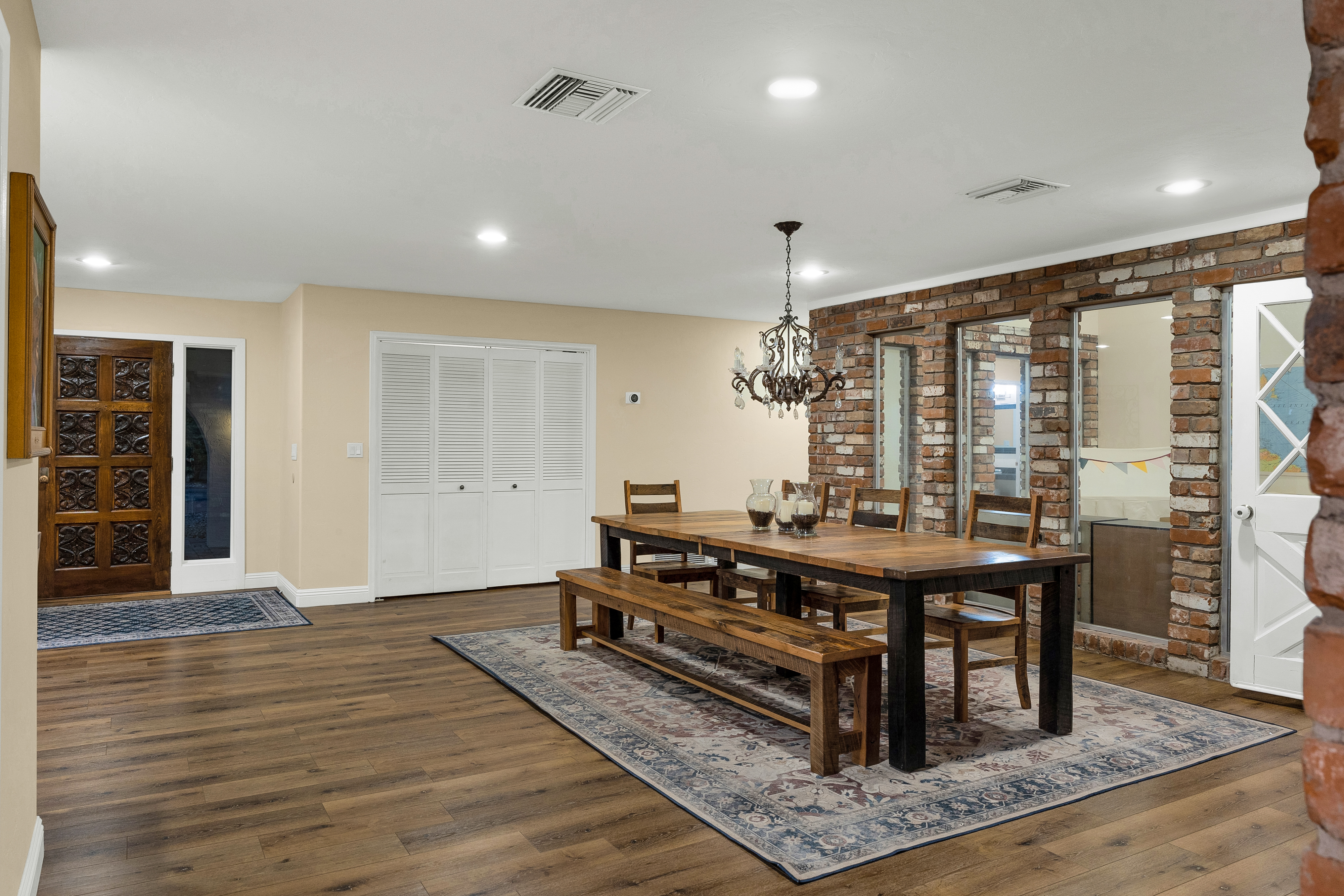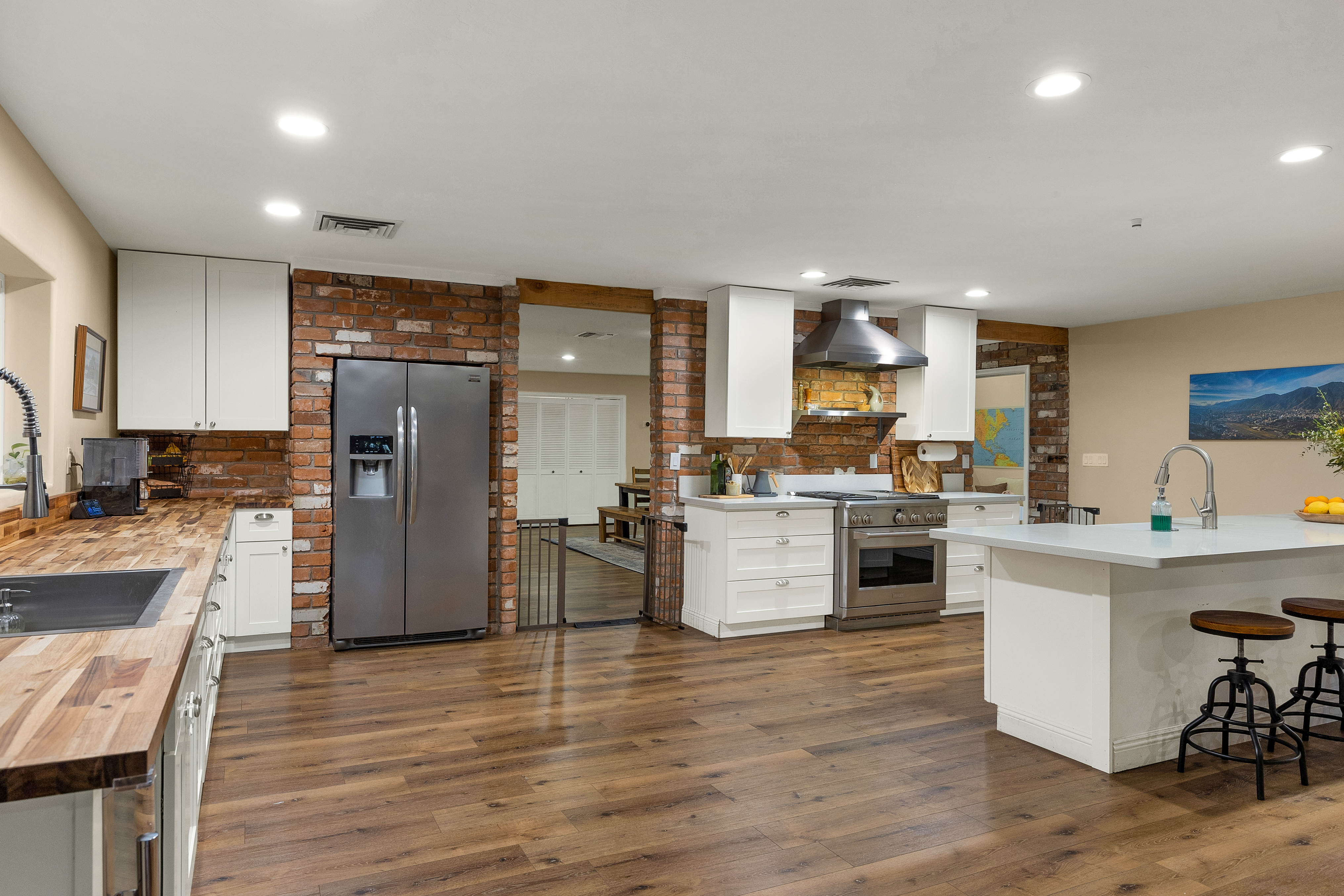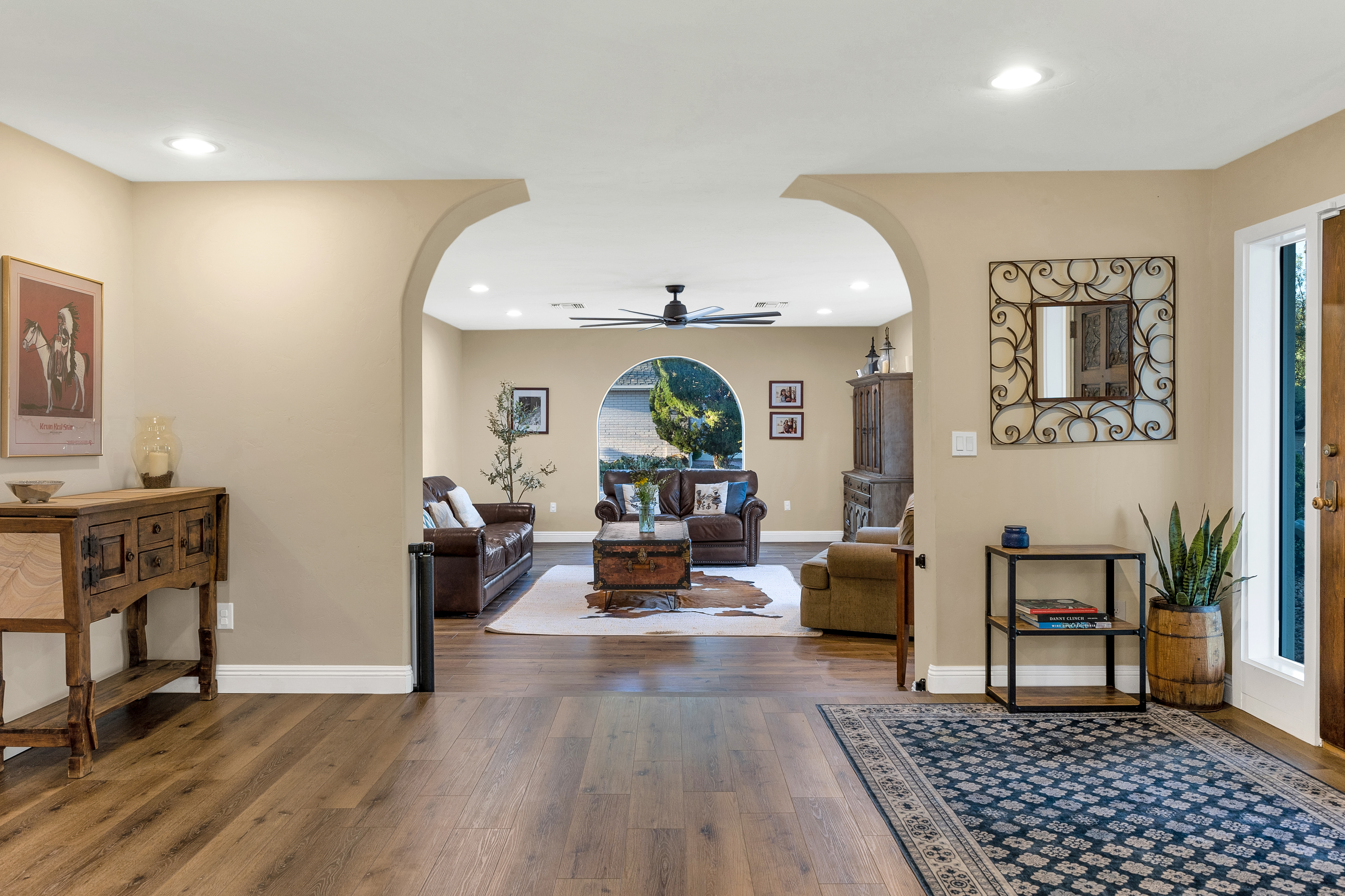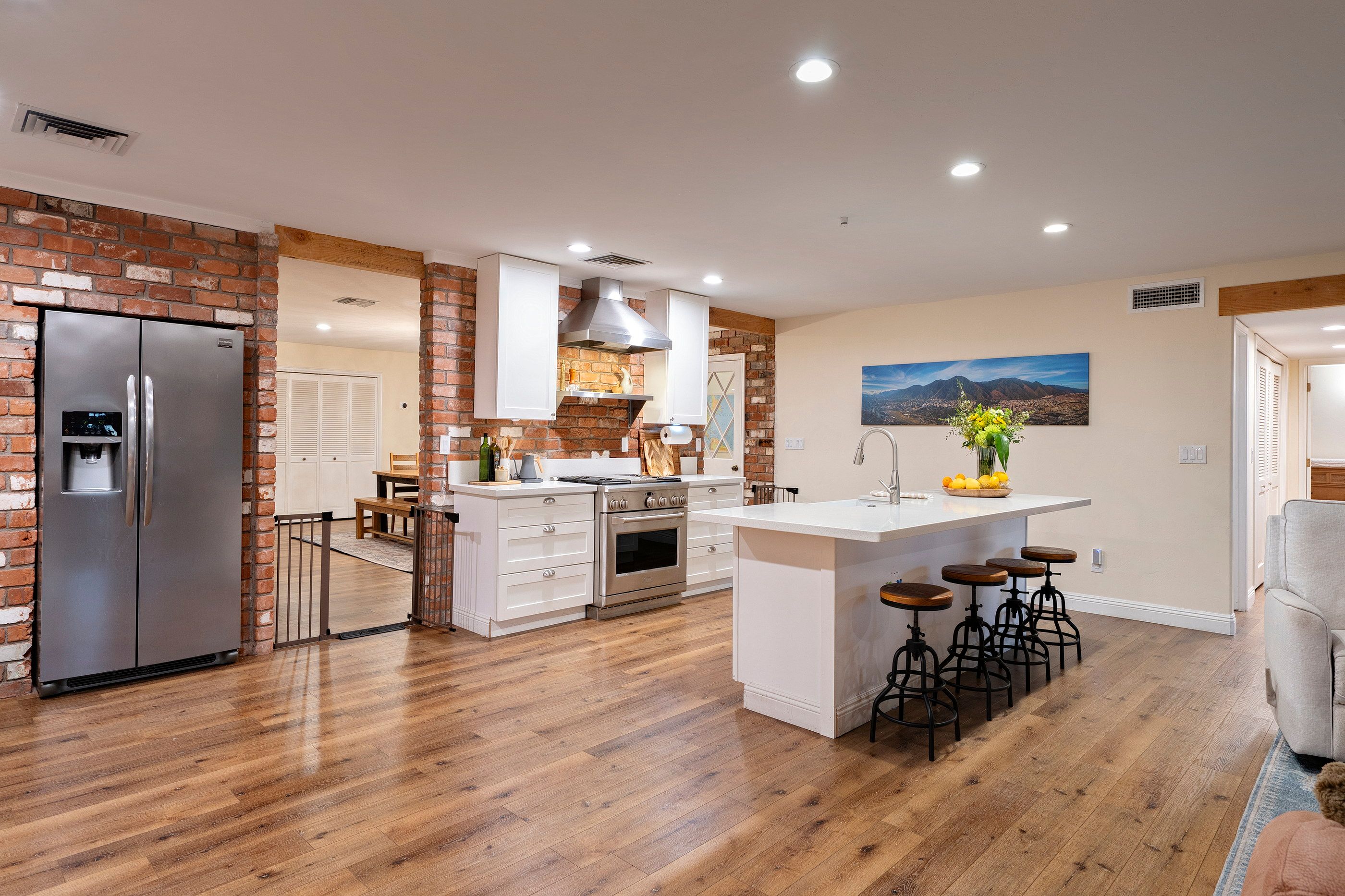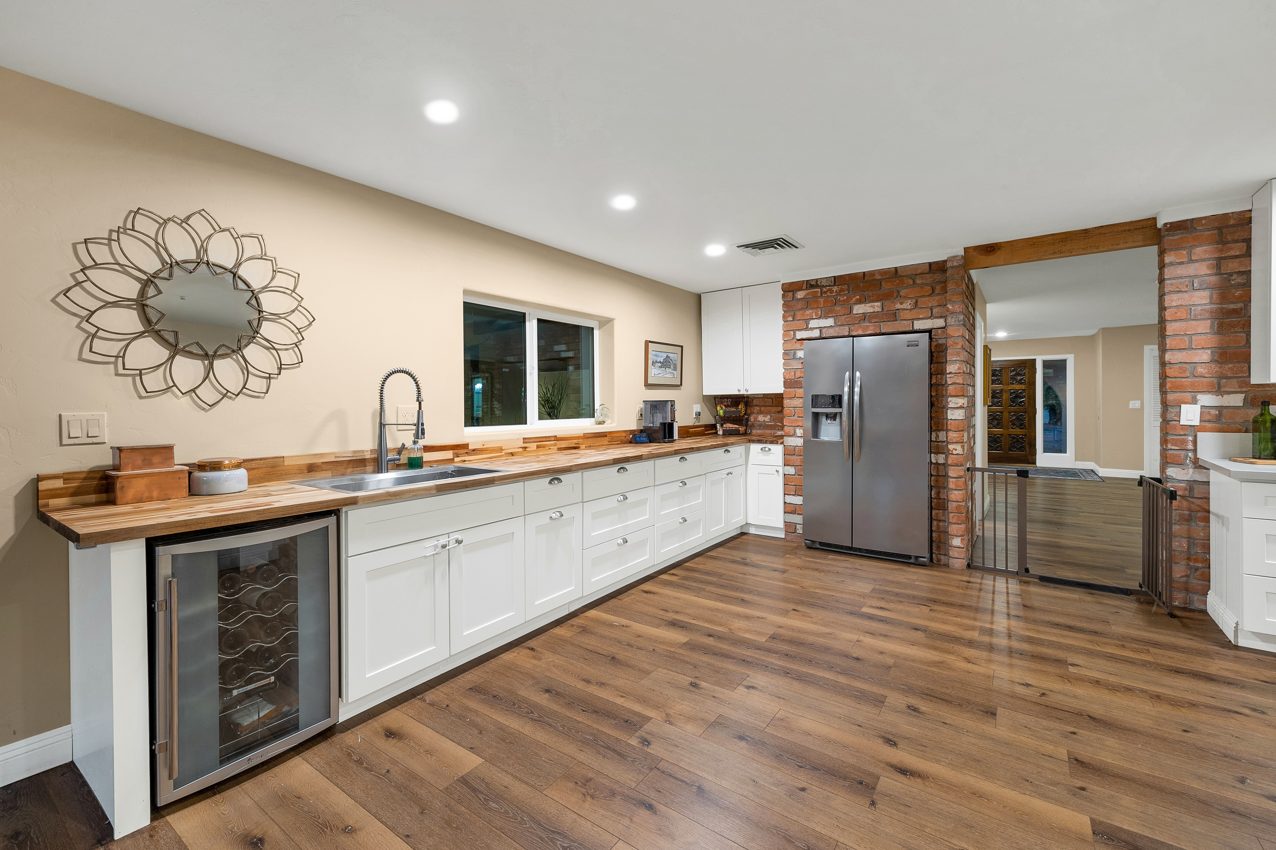 Completely renovated five-bedroom, four-bathroom masonry-built home situated on a private, .65-acre lot in the sought-after 49ers Country Club in the tranquil Tanque Verde Valley. This nearly 4000-square-foot home, set on the 17th hole of the 49ers golf course was thoughtfully redesigned to maintain the charm of the original home while bringing every inch up to date. Set back on the lot, a circular driveway and a red-brick walkway welcome you to this modern ranch-style home that preserves classic character with wood-beam accents, exposed brick, and large arched windows that flood the space with natural light. Spacious entry with rich engineered wood floors, a formal dining area with room for large-scale entertaining, and a spacious living room. The kitchen with a center island and breakfast bar opens to the family room with a brick fireplace and flows into an Arizona room that serves as a flexible entertaining space, refuge from the elements, and additional space for serving food and storing kitchen supplies. Updates and upgrades in the kitchen include quartz and butcher block counters, new cabinetry and hardware, stainless steel appliances including a magnificent GE Monogram gas range with a hood vent, two sinks, wine/beverage refrigerator, and so much more. The split-bedroom floor plan adds to the privacy and livability of this five bedroom plus bonus room home. The versatile bonus room, currently a playroom, can easily serve as an office, den, music room, or media space. The next-level primary suite features a beehive fireplace, a private patio, and a beautifully renovated bathroom with two sinks/vanities, soaking tub with wood-accent feature wall, custom tile shower with glass enclosure, and a spacious walk-in closet with custom built-ins. The additional bathrooms have been updated with new fixtures, tile, vanities, mirrors, and custom tiled showers. The backyard offers a resort-style setting with a newly plastered pool equipped with a safety net, a large grassy area, and covered patios that create an inviting outdoor living space. Sunset and golf course views complement this lush homesite lined with mature trees.This home has new Pex water lines, new floors, new windows & blinds, new pool pump, and pool recently re-plastered. Coveted 49ers Country Club amenities include golf, workout facilities, pool, restaurant and bar, holiday events, and outdoor summer movie nights. An active swim team and summer camps create a welcoming community atmosphere. The home is located within the highly rated Tanque Verde School District and is very close to the elementary and middle school. High-demand Hermosa Montessori school is close-by. Private schools such as Desert Christian, St. Michael's, and Castlehill Country Day School are within 20 minutes of the neighborhood. Located in the lush Tanque Verde Valley--often called the Green Jewel of the Desert--this exceptional property enjoys a setting unlike anywhere else in Tucson. Traversed by two seasonal creeks, the valley offers an uncommon green desert environment shaded by mature trees and unparalleled natural beauty. Home to approximately 15,000 residents, Tanque Verde is defined by larger parcel properties, open space, and direct access to both the Catalina and Rincon Mountains. Situated at the base of Mt. Lemmon, residents enjoy the rare ability to ski or play in the snow during winter months and escape Tucson's summer heat in the cool mountain air. The result is a relaxed, scenic lifestyle in one of the most beautiful and distinctive settings in the Sonoran Desert.