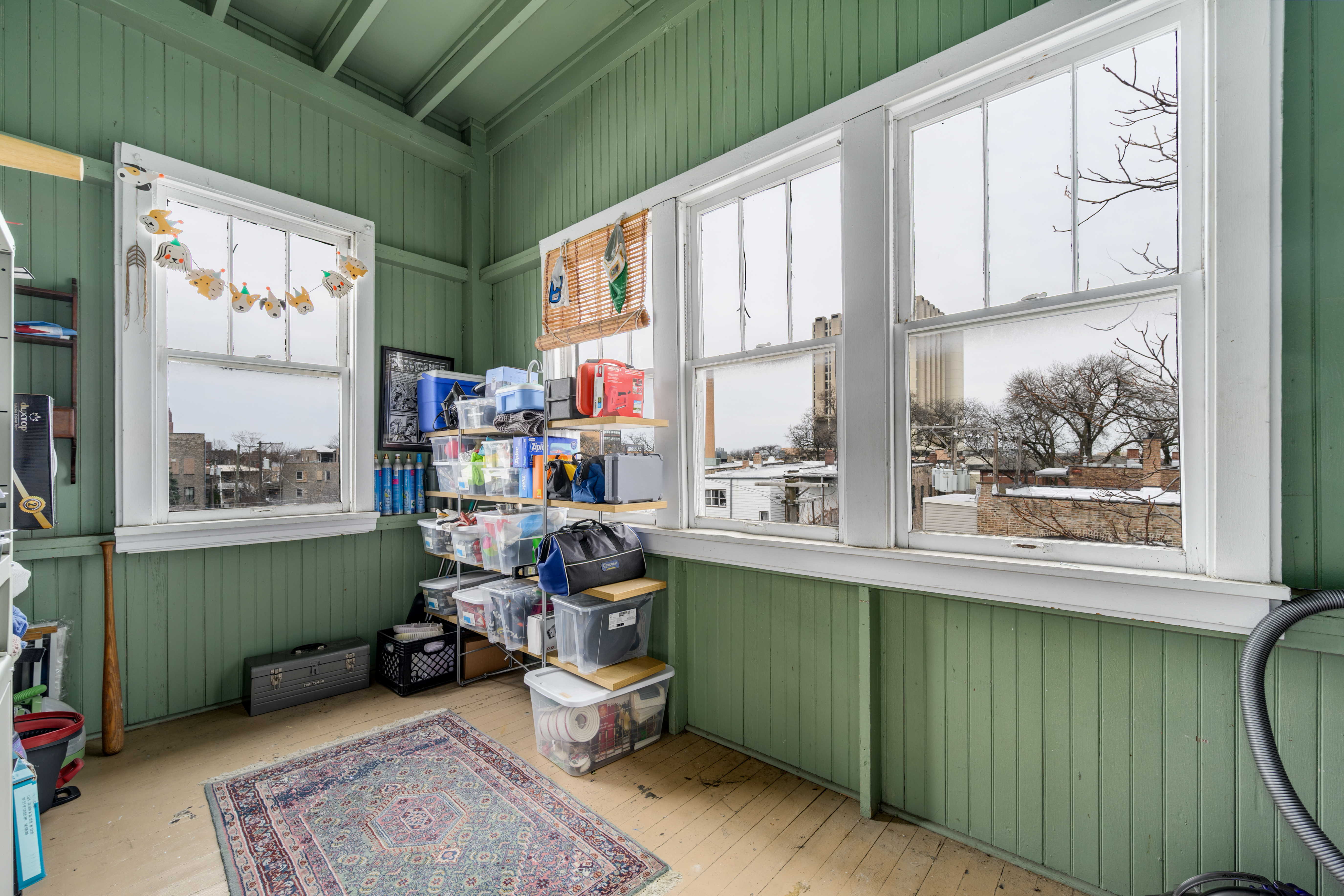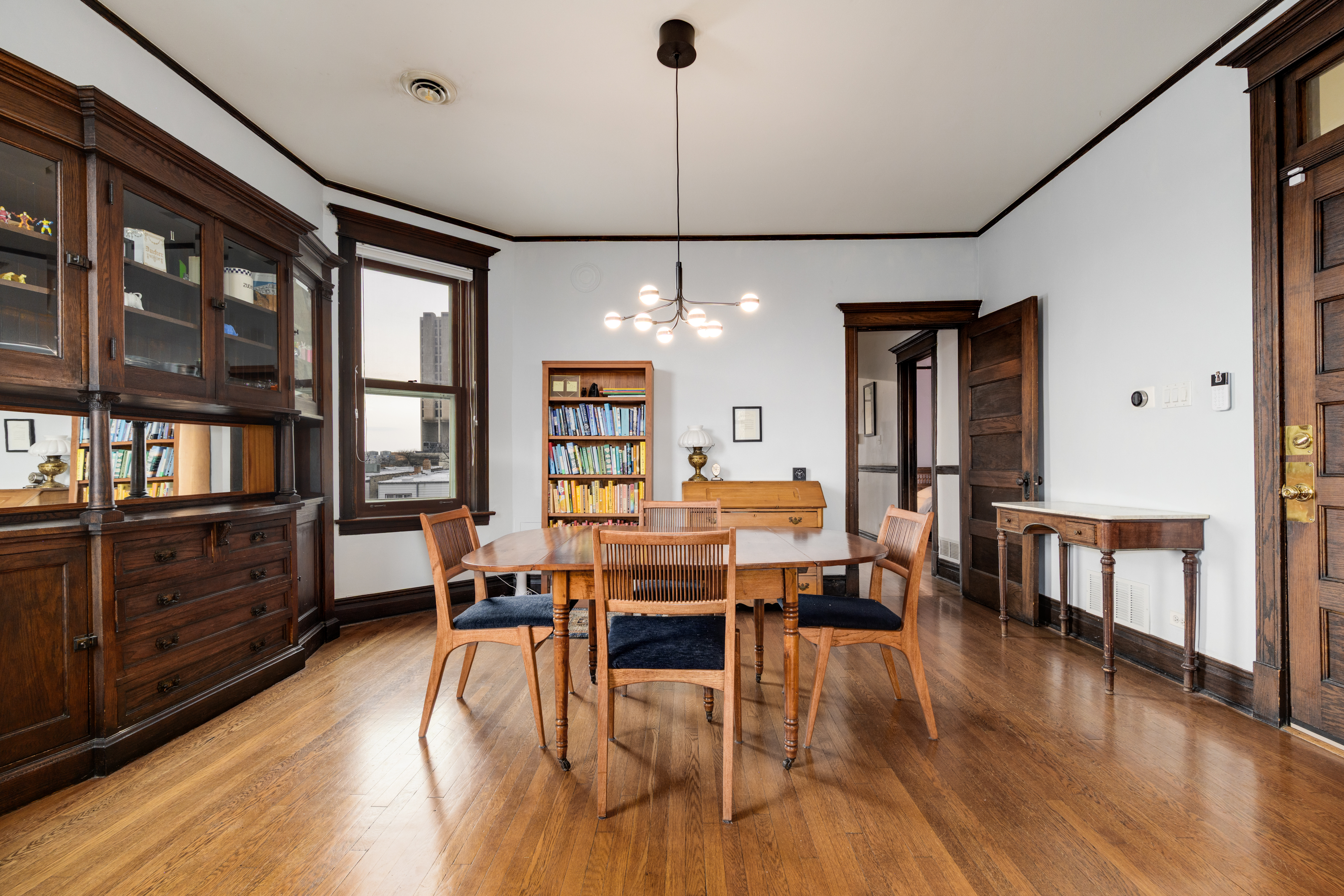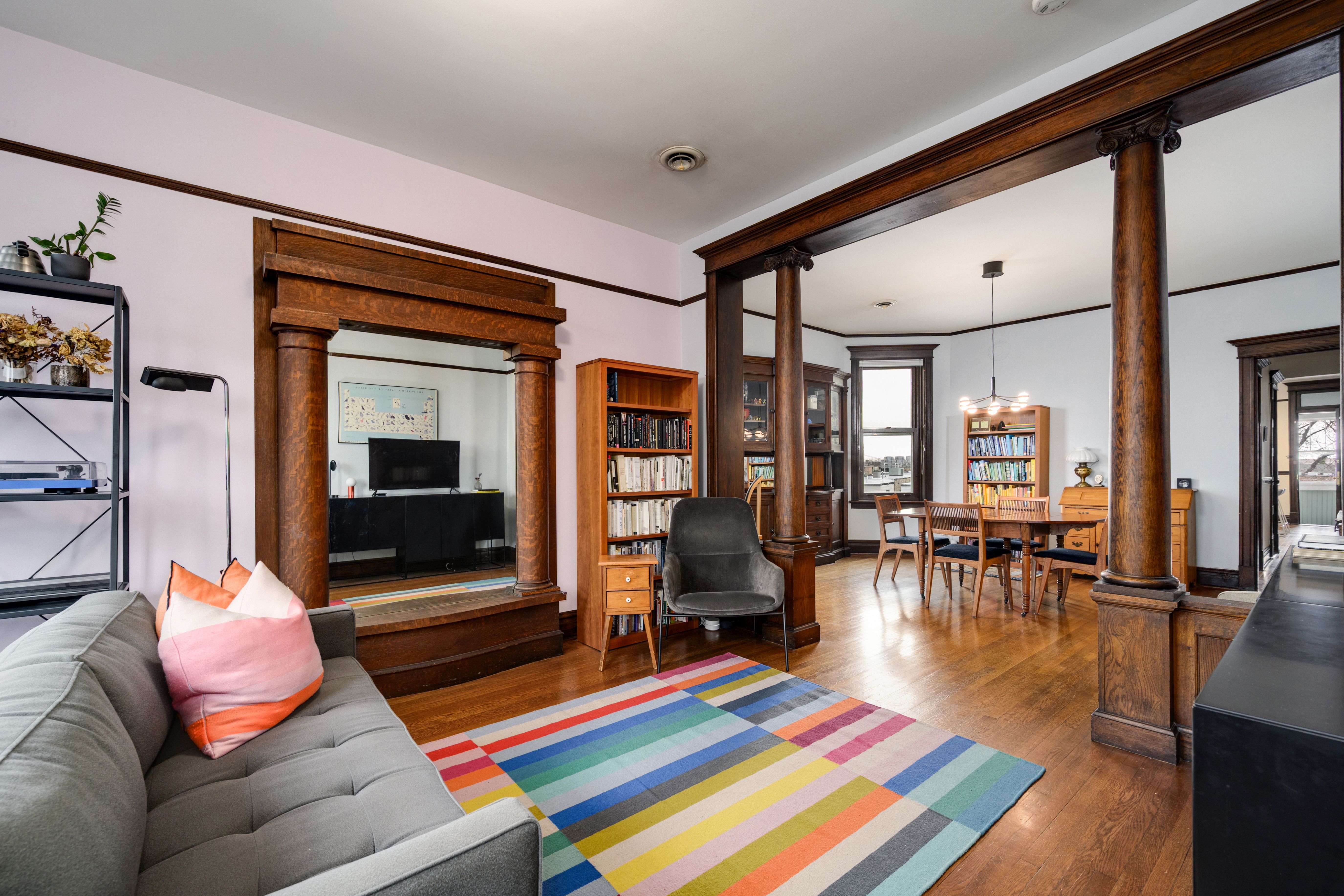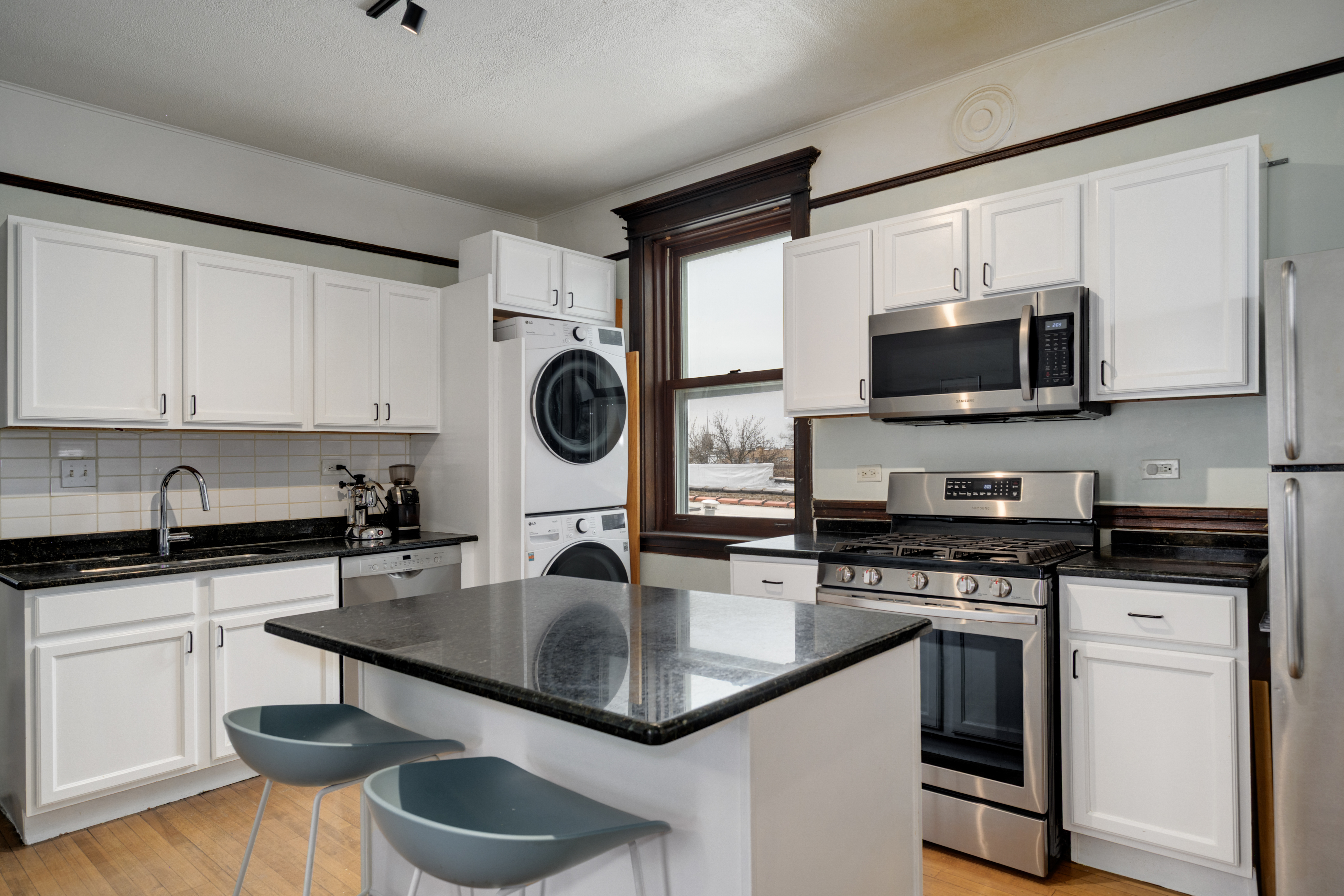 Wonderful sunny, extra-wide, top floor, 3 bedroom/2 bath condo in Ukrainian Village with the original vintage details intact including a beautiful built-in hutch in the formal dining room, a stunning pier glass mirror in the living room, ornate carved columns separating the living and dining rooms, high ceilings, original wood floors, hardware, doors and door/window trim throughout. Building was completely rehabbed in 2001 and combines modern amenities with vintage charm including central heat and AC and in-unit laundry. The spacious eat-in kitchen has a large island, granite counters, stainless appliances and washer/dryer. Thanks to the wide lot, the three spacious bedrooms all fit a king or queen bed. Two full bathrooms include a walk-in shower and a soaking tub. A large, enclosed porch off the kitchen provides additional living or storage space. Ideal Ukrainian Village location on beautiful, tree-line Cortez. Easy walk to Division St. and Chicago Ave, public transport, dining/night life and shopping and near both I90/94 and I290. Garage parking space included.