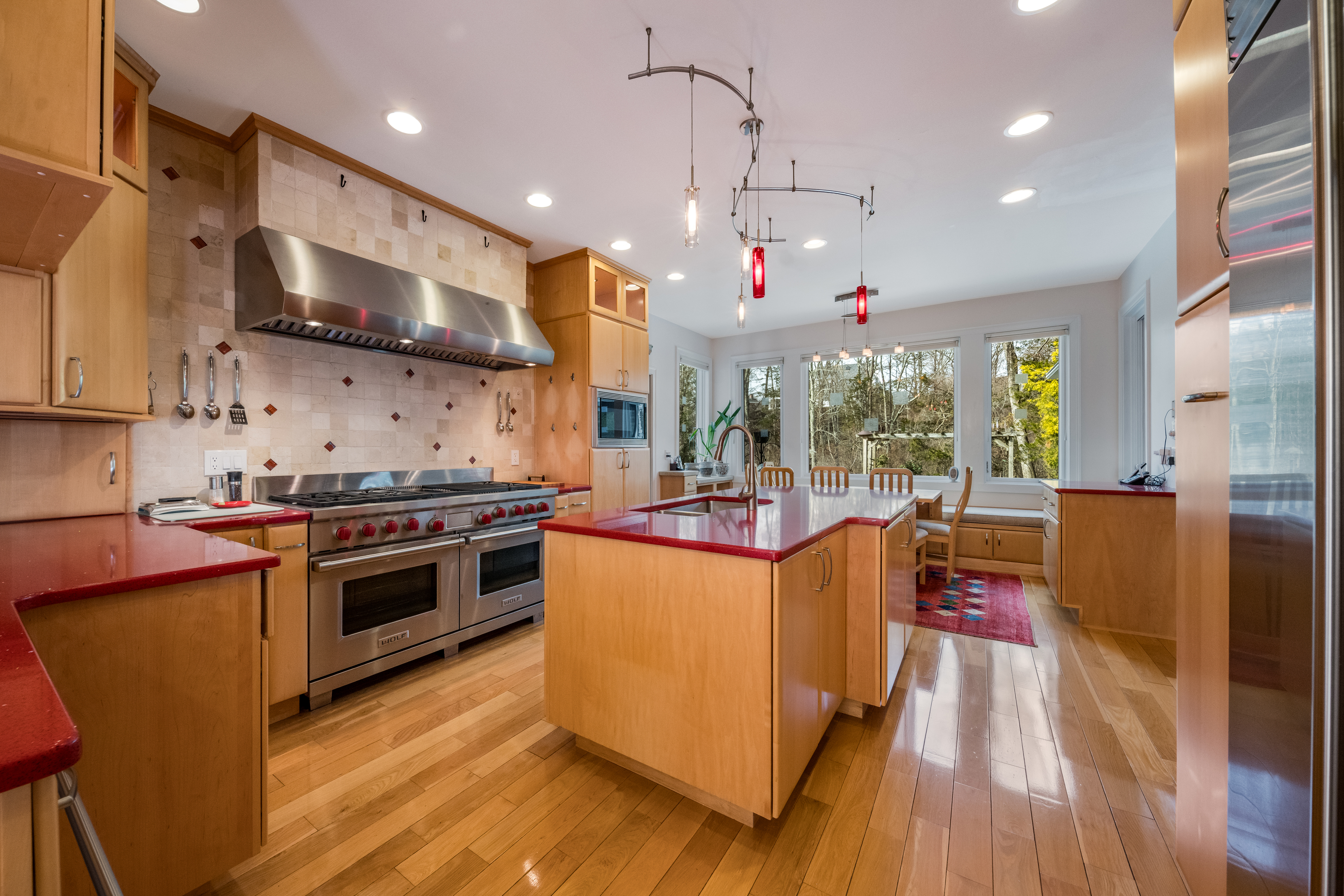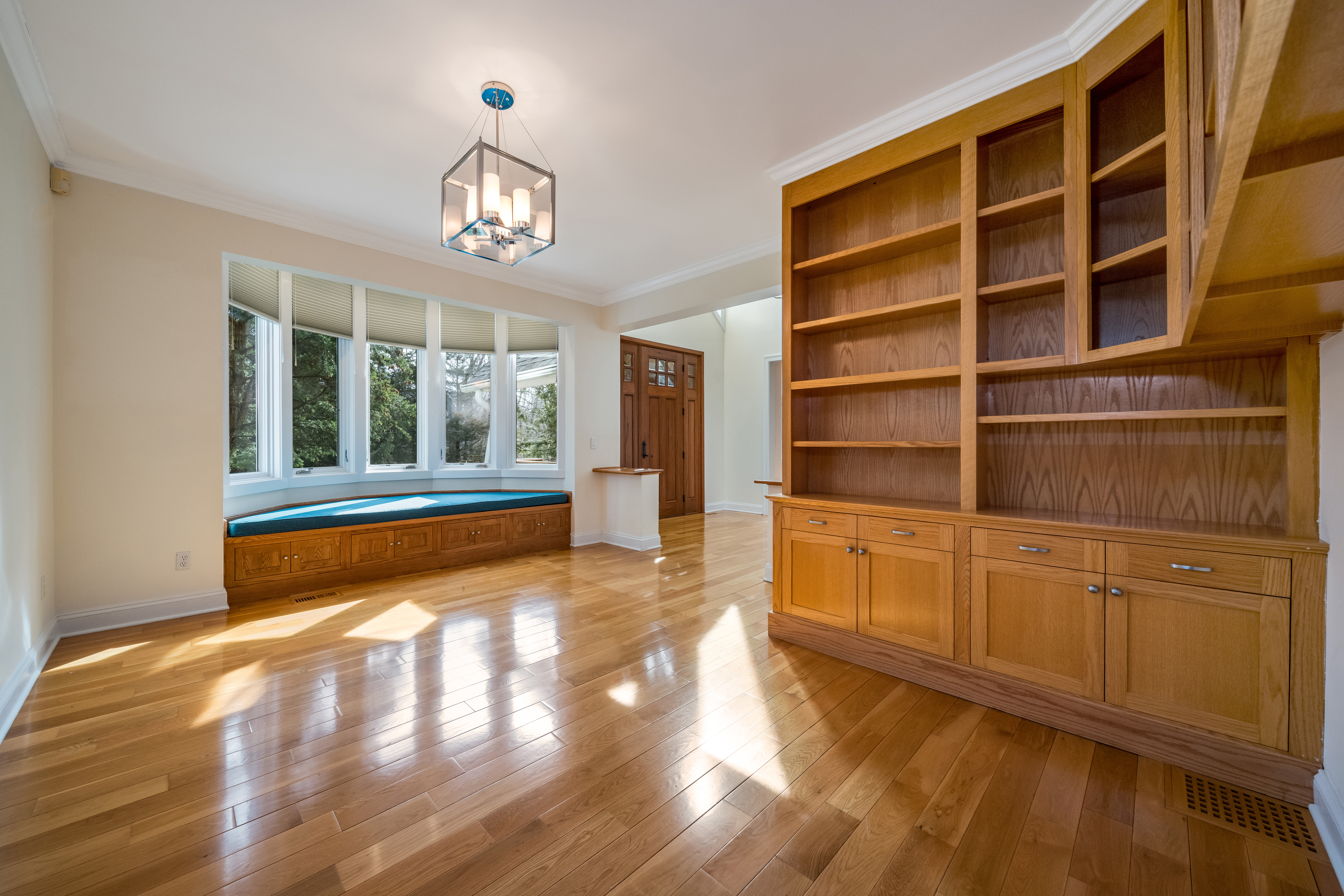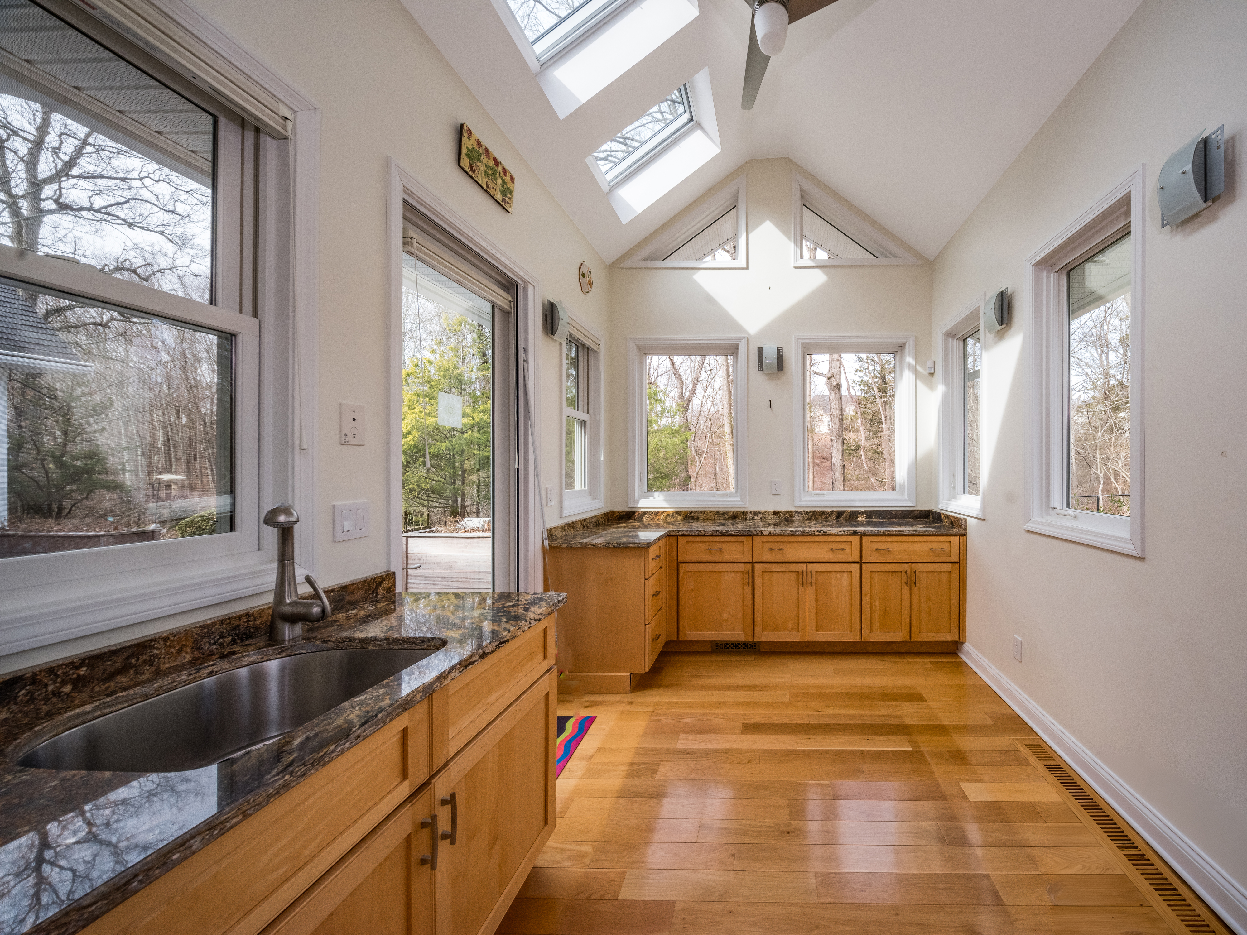 Where gardens flourish and privacy surrounds you, this Moose Hill retreat offers a lifestyle rooted in beauty, nature, and quiet sophistication. Light-filled interior features oversized and bow windows, Hardie cement siding, and Marvin windows throughout. Extraordinary gardens showcase three-season blooms, perennial herbs, berry plantings, fruit trees, irrigation, and a fenced vegetable garden with raised beds. For the green thumb, lower-level grow lights extend the gardening season for early planting. Chef's kitchen with Caesarstone countertops, Wolf appliances, Sub-Zero refrigeration, and built-in dining. Separate family room addition designed as a destination space with wet bar, propane fireplace, and dramatic floor-to-ceiling stone chimney. French doors open to outdoor living areas. Brazilian Tigerwood decking, three-season porch, pool with diving board, and built-in Wolf grill center-ideal for entertaining in a private natural setting with distant skyline views. Primary suite with heated floors and Jacuzzi tub, finished lower-level recreation space, three-bay garage, solar system, and whole-house Generac generator.