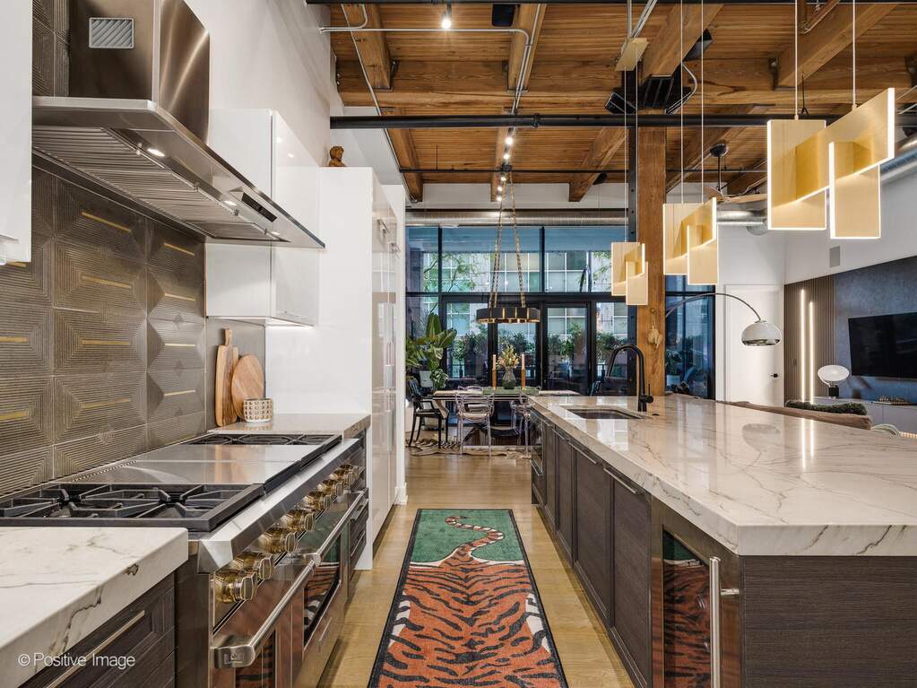 Experience elevated loft living at The Ronsley, one of River North's most sought-after luxury residences. This exceptional 3-bedroom, 3-bathroom home offers a perfect blend of industrial and modern feel, featuring soaring 15-foot timber ceilings, exposed brick, floor-to-ceiling windows, hardwood floors, custom lighting and automatic shades throughout. The open concept living and dining area is filled with natural light and anchored by a custom media wall, seamlessly flowing to a spacious private terrace. The chef's kitchen is outfitted with top-of-the-line Wolf appliances, a large island with polished quartz countertops, custom cabinetry, beverage refrigerator, pantry, and a custom designed built-in breakfast nook. A desirable split-bedroom floor plan offers convenience with each bedroom featuring a full en-suite bath. The luxurious primary suite includes oversized windows with blackout shades, a walk-in closet, and a spa-inspired bath with a steam shower, soaking tub, dual vanities, and updated mirrors. The generously sized second and third bedrooms each offer ample closet space and beautifully appointed en-suite baths. Additional features include a spacious laundry room with side-by-side washer/dryer, utility sink, and extensive cabinetry. The Ronsley is a full amenity building offering 24-hour door staff, fitness center, yoga room, resident lounge, an expansive landscaped courtyard with grilling stations, fire pit, and lounge seating and a private dog run. Ideally located near Montgomery Ward Park, the Chicago Riverwalk, Larrabee dog park, Health/Wellness Clubs such as East Bank Club and Bian, Target, groceries, top dining, nightlife, shopping, public transit and highway access. Price includes a premium deeded garage parking space with a lift accommodating two vehicles.