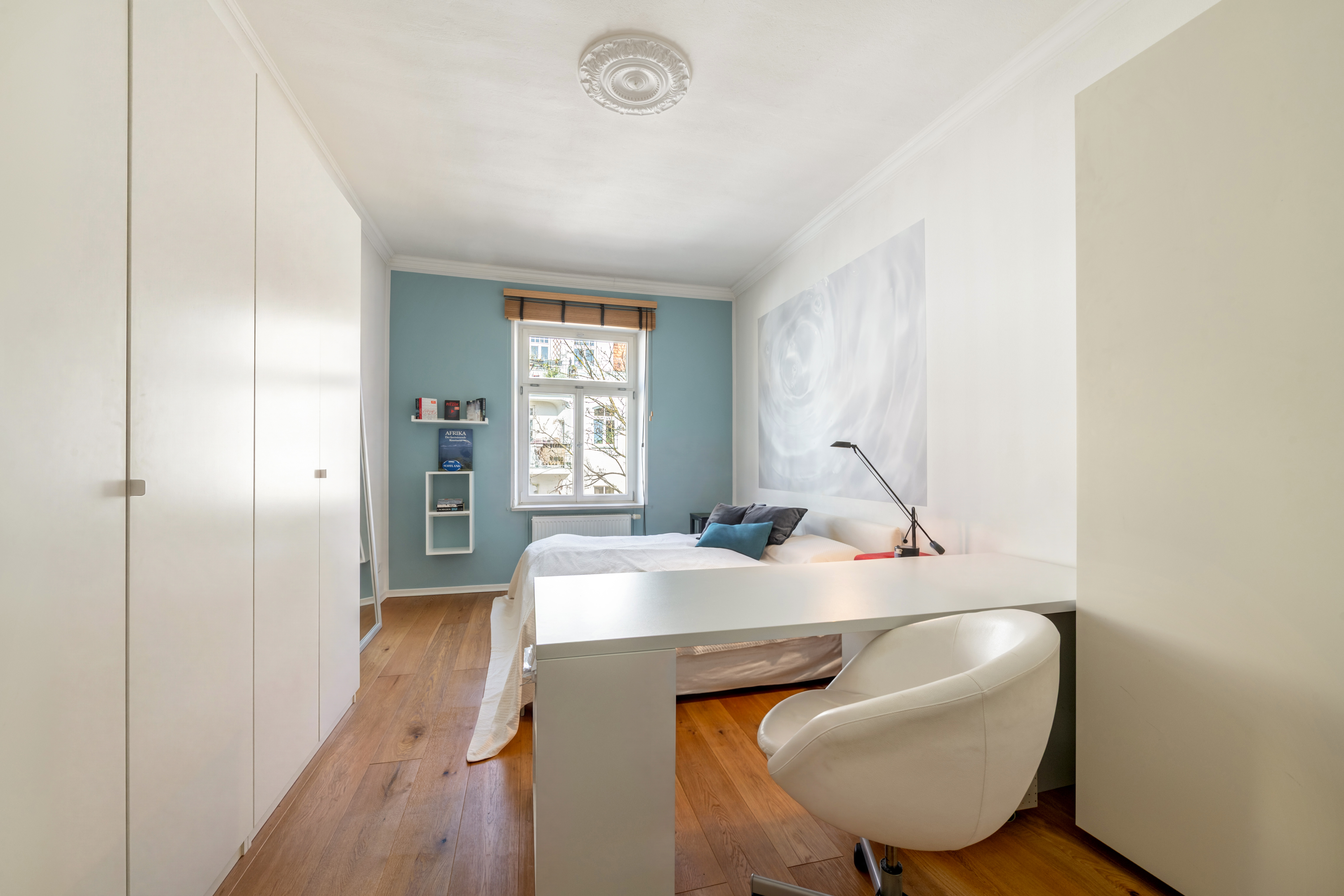 This charming apartment in an old building is in a highly sought-after location in Schwabing. A clearly laid out floor plan and the historical flair characterize this 2.5-room domicile. The premises are located on the3rd floor of a listed building from 1905. On the street side, the property impresses with its neoclassical façade. Symmetrical plaster divisions and stucco ornamentation typical of the eradecorate the front façade. The wooden staircase with its wrought-iron balustrade also conveys the flair of an old building.Impressive ceiling heights of around 2.95 meters underline the attractiveness of this light-filled apartment. A thorough modernization took place in 2015/16. As part of this, the floor plan was adapted to contemporary requirements. In addition, oak floorboards were laid, a modern kitchen installed, the bathroom modernized, coffered doors true to the period and new radiators installed. Heating is provided by a self-sufficient gas floor heating system, which also dates from 2015/16. The windows were replaced in 2019. The space on offer covers approx. 73 m² and includes a living room, a bedroom, an eat-in kitchen and a daylight bathroom. At the last owners' meeting, it was decided to add south-facing balconies. A cellar compartment offers valuable storage space and makes this very attractive city home perfect. The public transport connections are also excellent. LMU and TUM institutes can be easily reached by bicycle.