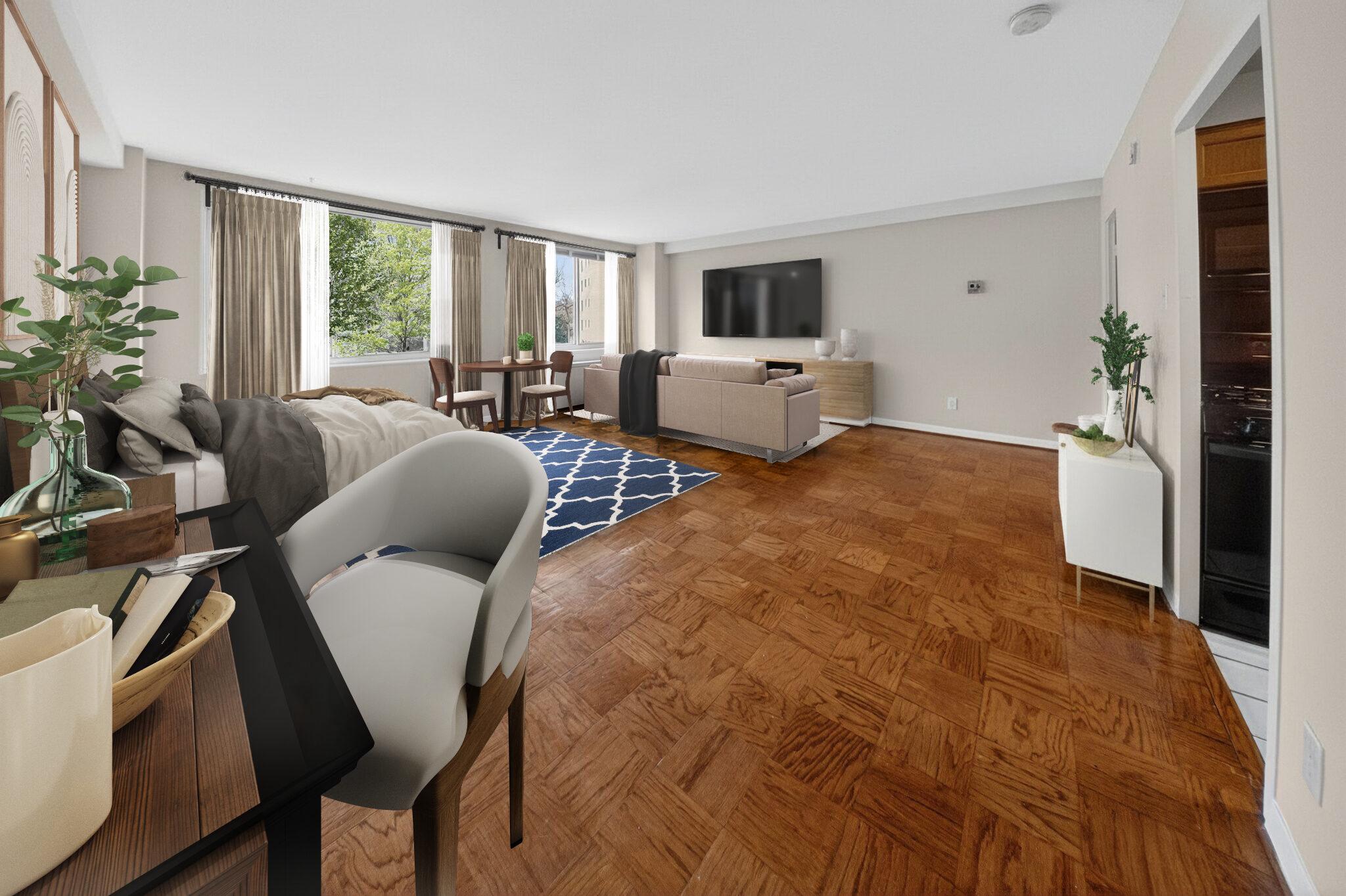 Welcome to 5406 Connecticut Ave NW #507, located in the heart of Chevy Chase, DC, this spacious studio offers an ideal blend of classic charm and modern convenience. The living space features large windows, beautiful parquet flooring, and has been freshly painted. The kitchen is efficient and has been updated with newer cabinetry and appliances. A large closet with built-ins leads to the completely renovated bathroom that is equally stylish and functional. The generous layout provides distinct areas for living, dining, and sleeping. Perfectly situated near Chevy Chase, DC shops, dining, and Metro access, this residence offers effortless city living in one of DC’s most sought-after neighborhoods. The FOB secured building is equipped with onsite community laundry and leisure/fitness room. All utilities other than Wifi/cable are included in condo fee. One storage unit conveys with the unit.