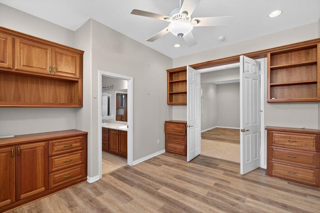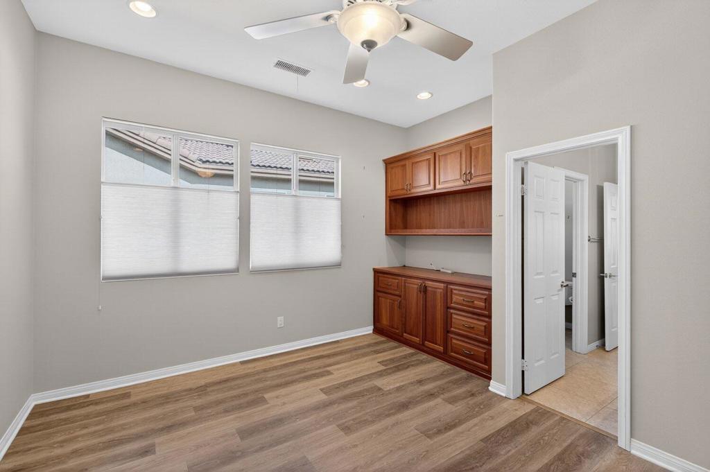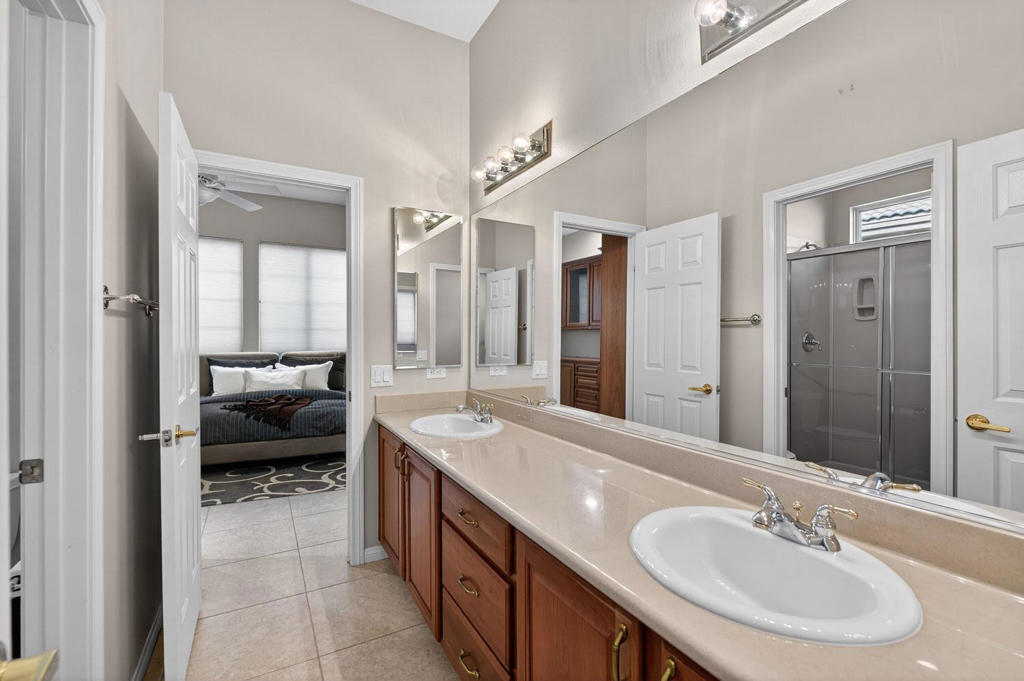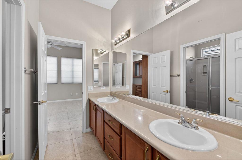 Welcome to Heritage Palms Country Club, where resort-style living meets everyday comfort. This beautifully maintained Westerwood model offers 2,504 square feet of thoughtfully designed space, with three bedrooms and two-and-a-half baths. Tucked away on a quiet cul-de-sac and just a short stroll from the clubhouse, the setting is as desirable as the home itself. Positioned on an elevated lot along the 15th fairway, the property captures sweeping panoramic views of the golf course and surrounding mountains--creating the perfect backdrop for stunning desert sunsets right from your backyard. Inside, a bright and inviting layout welcomes you with living and dining areas, along with a separate great room. The great room features a cozy gas fireplace and an upgraded picture window that frames the outdoor scenery beautifully. The kitchen blends style and function with rich cherry wood cabinetry, slab granite countertops, a center island, and a built-in buffet for added storage and convenience. The expanded primary suite offers a private retreat, complete with a bay window, a spacious ensuite bath with soaking tub and walk-in shower, a generous walk-in closet, and direct access to the covered patio. Two guest bedrooms share an adjoining bath, providing both comfort and privacy--one enhanced with custom cherry wood built-ins, making it ideal as a bedroom, home office, or flexible space. The laundry room complete with a sink leads to an expanded garage with additional space for a golf cart and its own dedicated air conditioning. Outdoors, the backyard is designed for relaxation and entertaining, featuring brick pavers, a flagstone-style overlay, and drop-down shades--perfect for enjoying peaceful evenings overlooking the course. A cozy front patio adds yet another inviting space for morning coffee or quiet moments. Additional highlights include newer Lennox HVAC systems, pavered driveway and walkway, tile and luxury vinyl flooring throughout, ceiling fans and Hunter Douglas window coverings. As a resident of Heritage Palms Country Club, you'll enjoy access to an 18-hole championship golf course, fitness center, indoor and outdoor pools, tennis and pickleball courts, and a vibrant clubhouse with an active social scene. More than just a home, this is a lifestyle--offering the very best of desert living. Come see it for yourself. (Some Photos Have Been Virtually Staged)