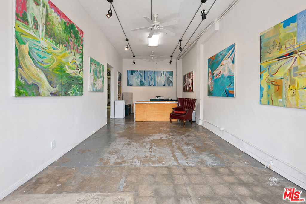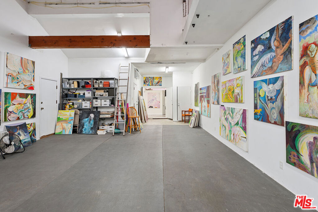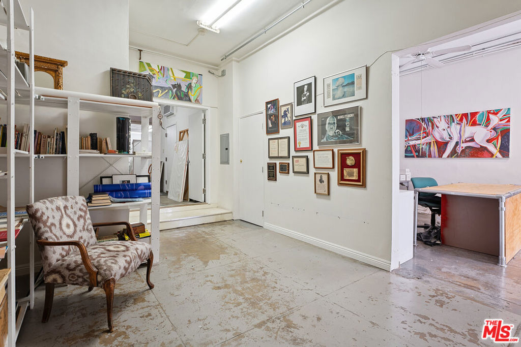 Welcome to 2847 Robertson, a truly unique opportunity to own a piece of Los Angeles history. This storied address was once the working studio and home of the legendary Rachel Rosenthal, one of the most influential interdisciplinary artists, performers, and teachers of the 20th century. The front half of the property is smartly partitioned into two distinct rooms, making it well-suited for two separate businesses or creative ventures. Behind this, there is a performance studio with 220-amp power and dramatic double-height ceilings. This studio space can easily function as a garage, accommodating up to four vehicles. Upstairs, there is a spacious studio apartment, a large patio, and an additional studio space. The studio apartment upstairs features a full kitchen, living room, and bathroom with incredible tree-top views. The additional studio offers exceptional natural light and could potentially be transformed into an additional residential unit. Recent improvements include brand new lighting and windows throughout, new roofs and a deck (2025), and major system updates: upgraded electrical panels (2023 & 2024), and new HVAC. Rarely does a live-work residence combine such versatility and historic provenance.