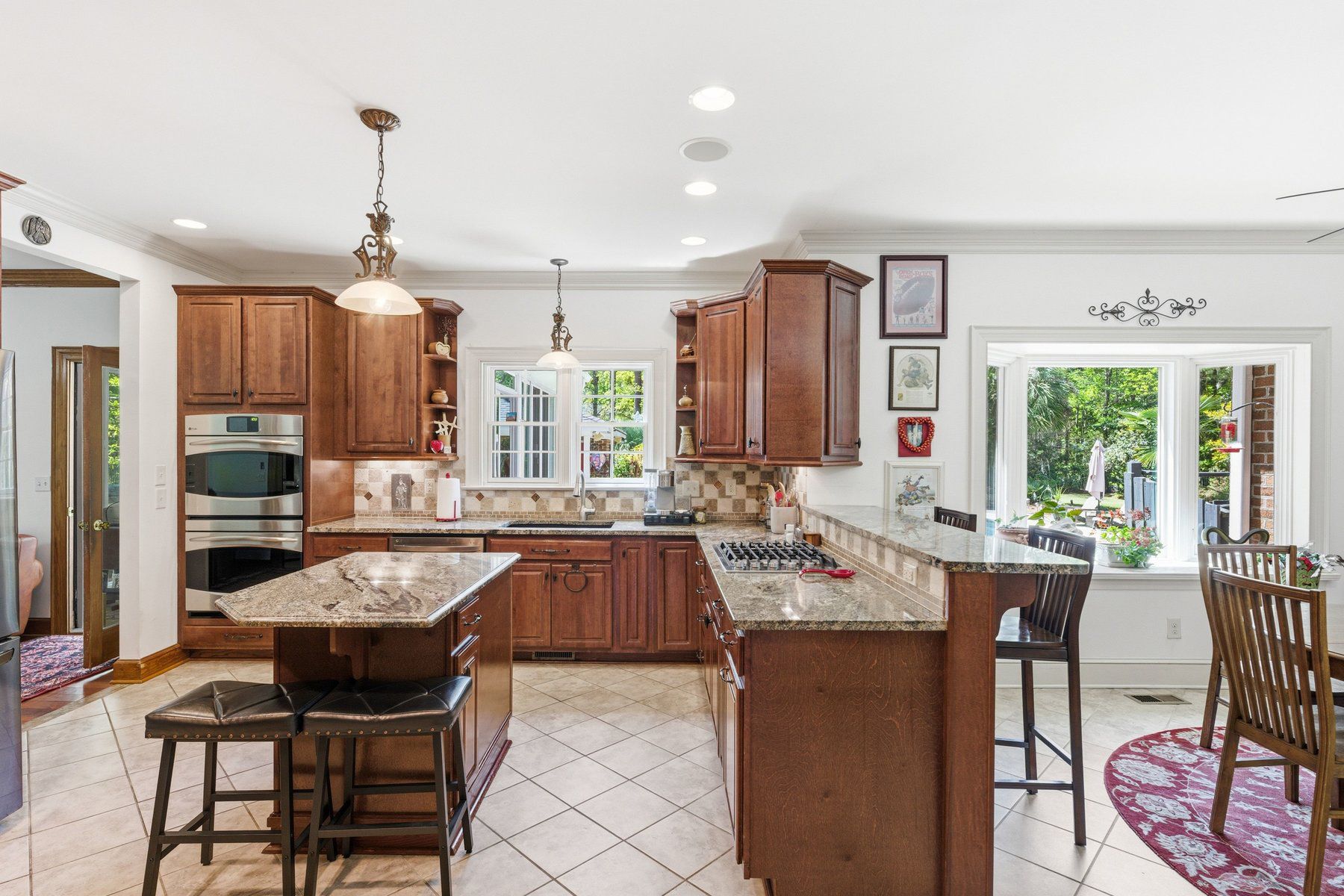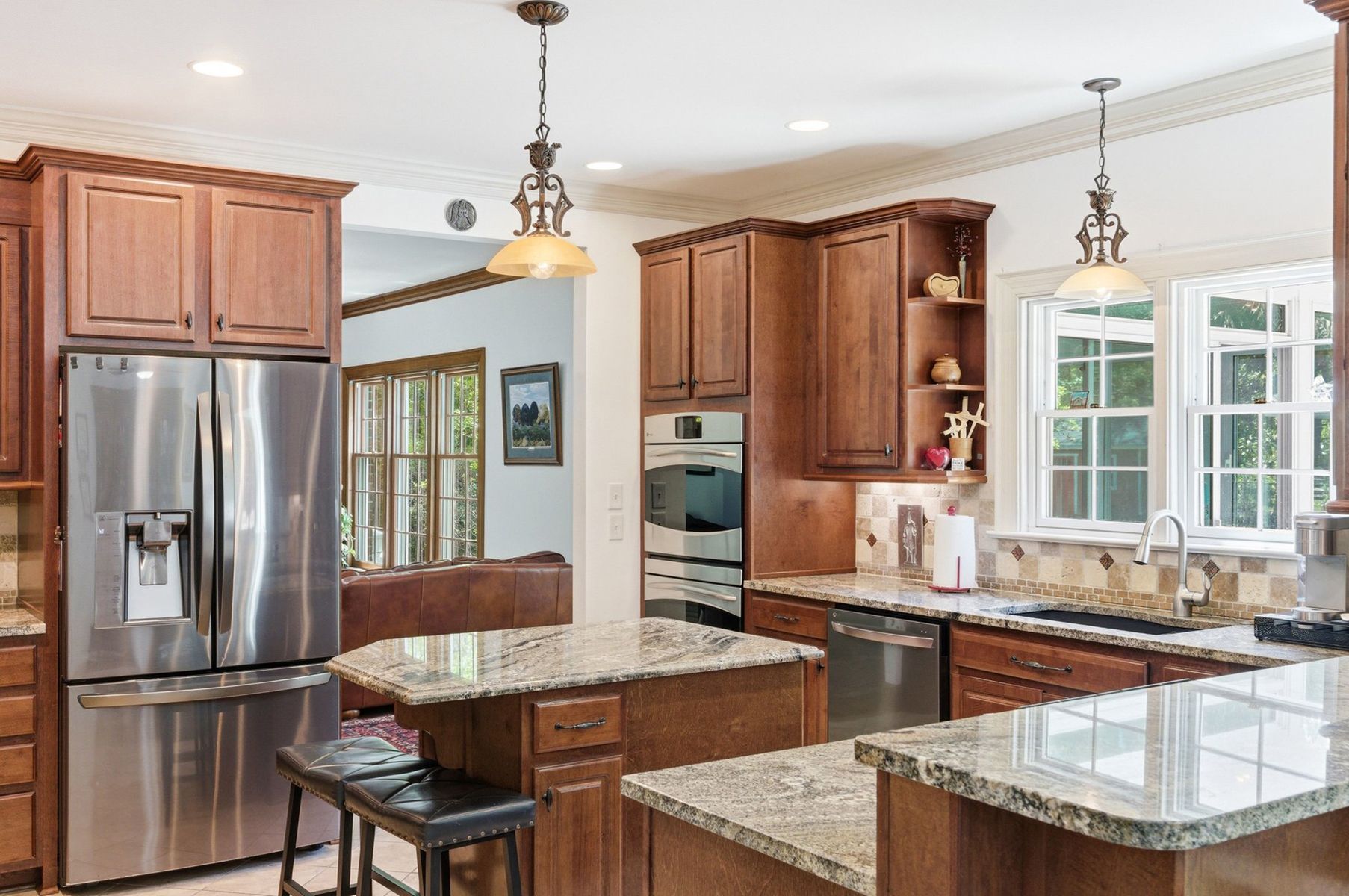 Spanning three levels, the main floor offers formal living and dining rooms, an expansive kitchen, and a welcoming family room with fireplace designed for everyday living and effortless entertaining. A light-filled sunroom overlooks the backyard and pool, creating a seamless connection to the outdoors.