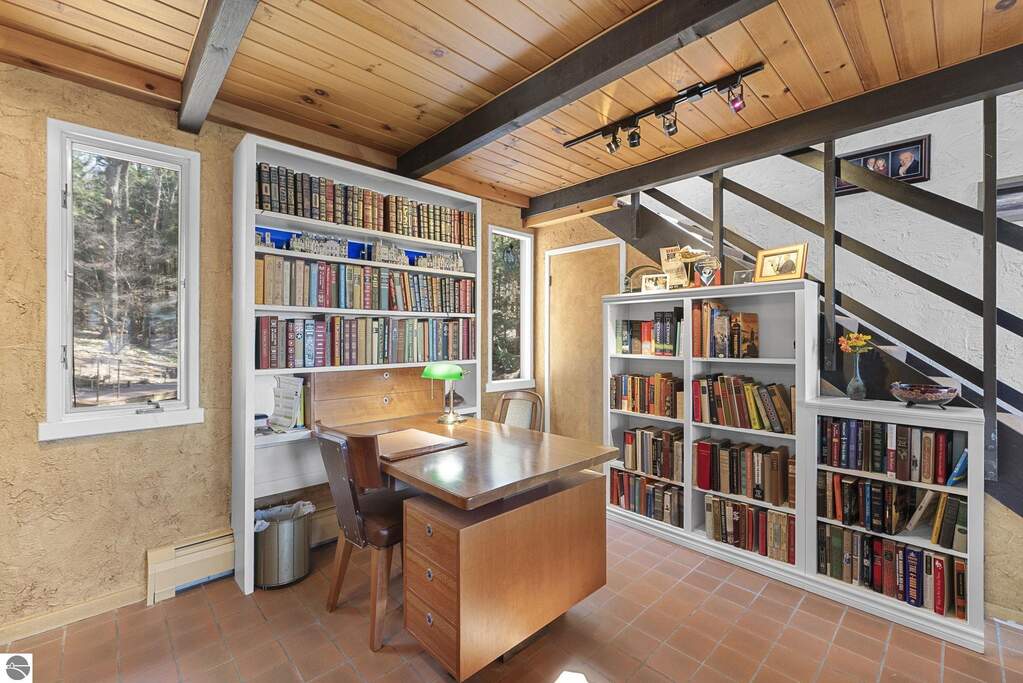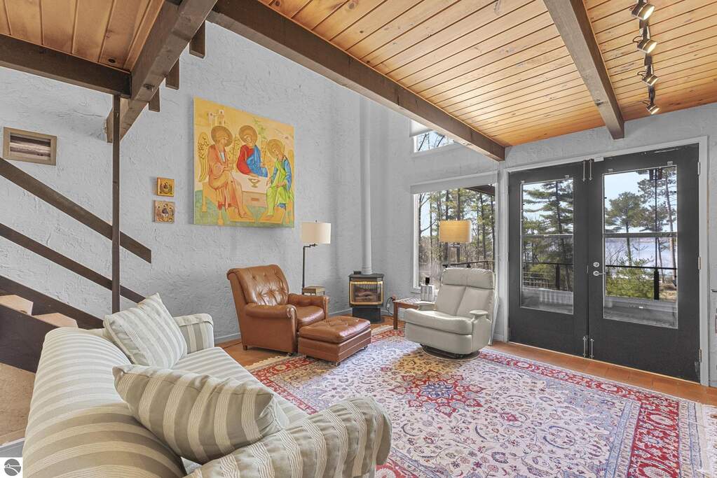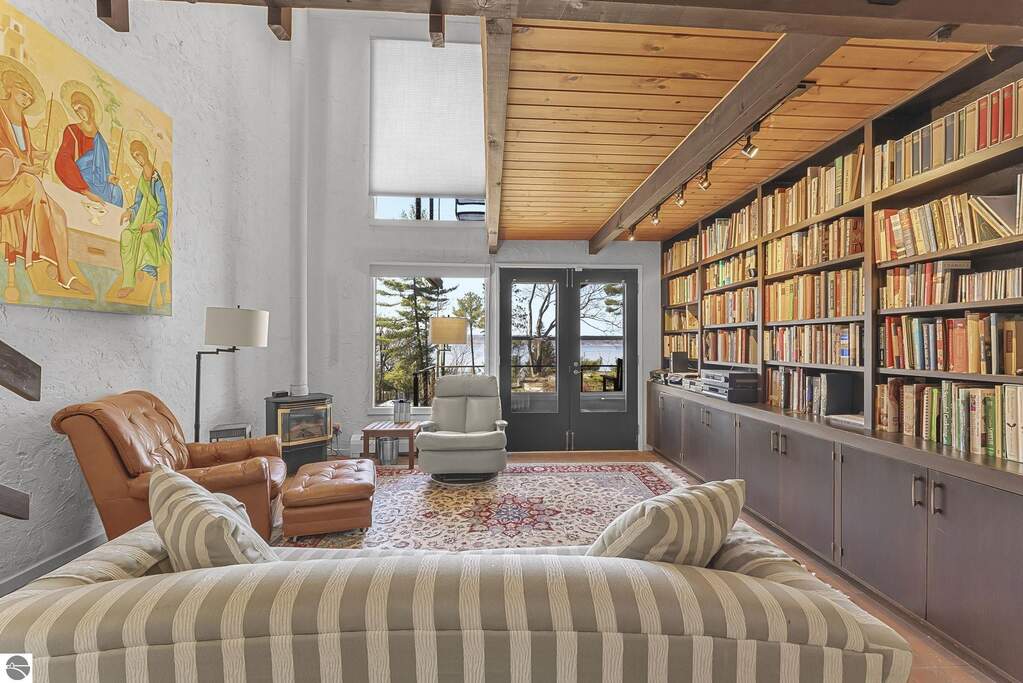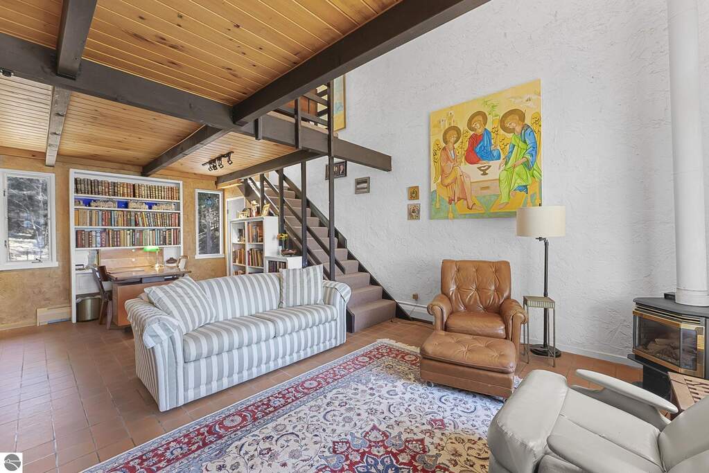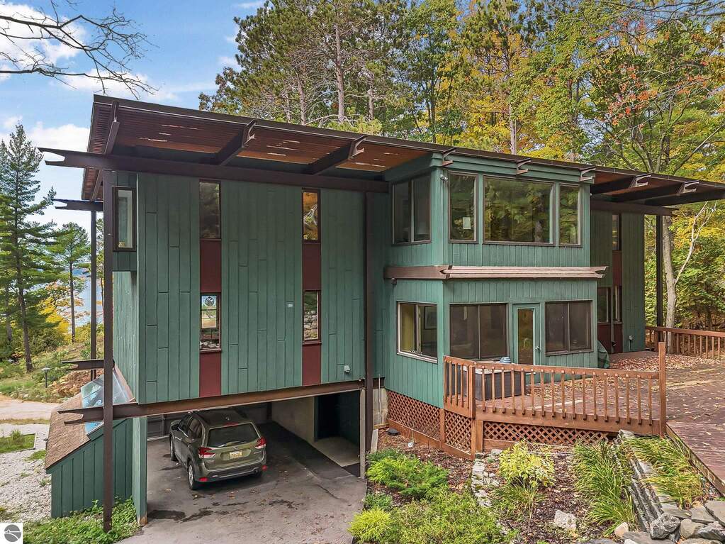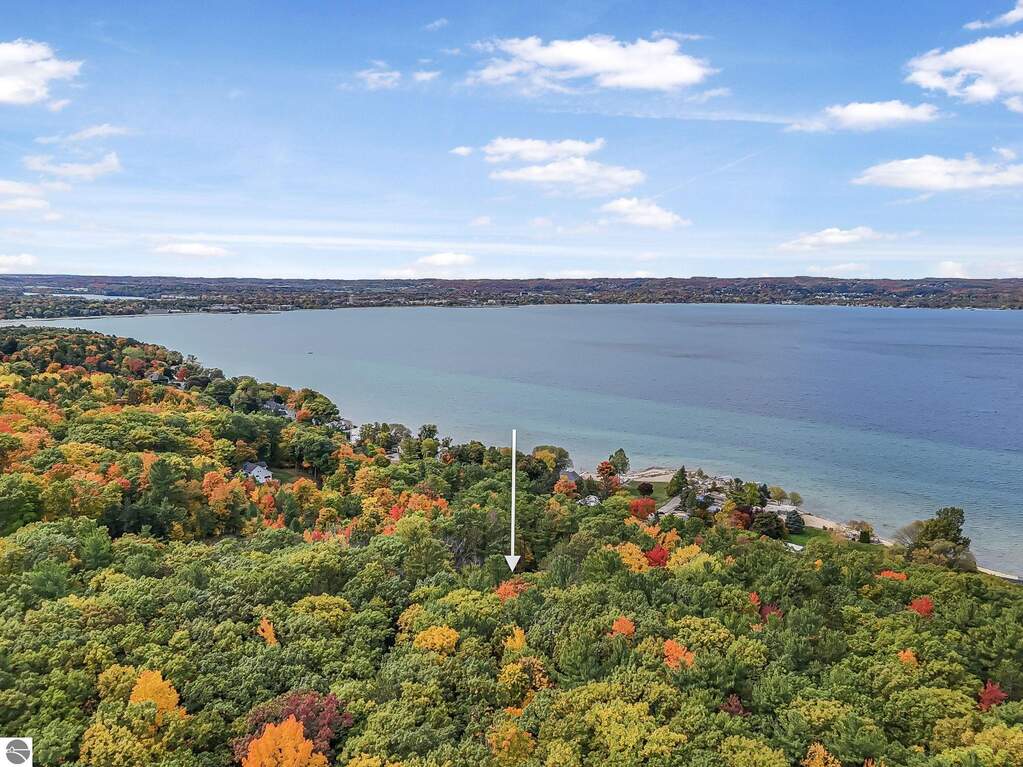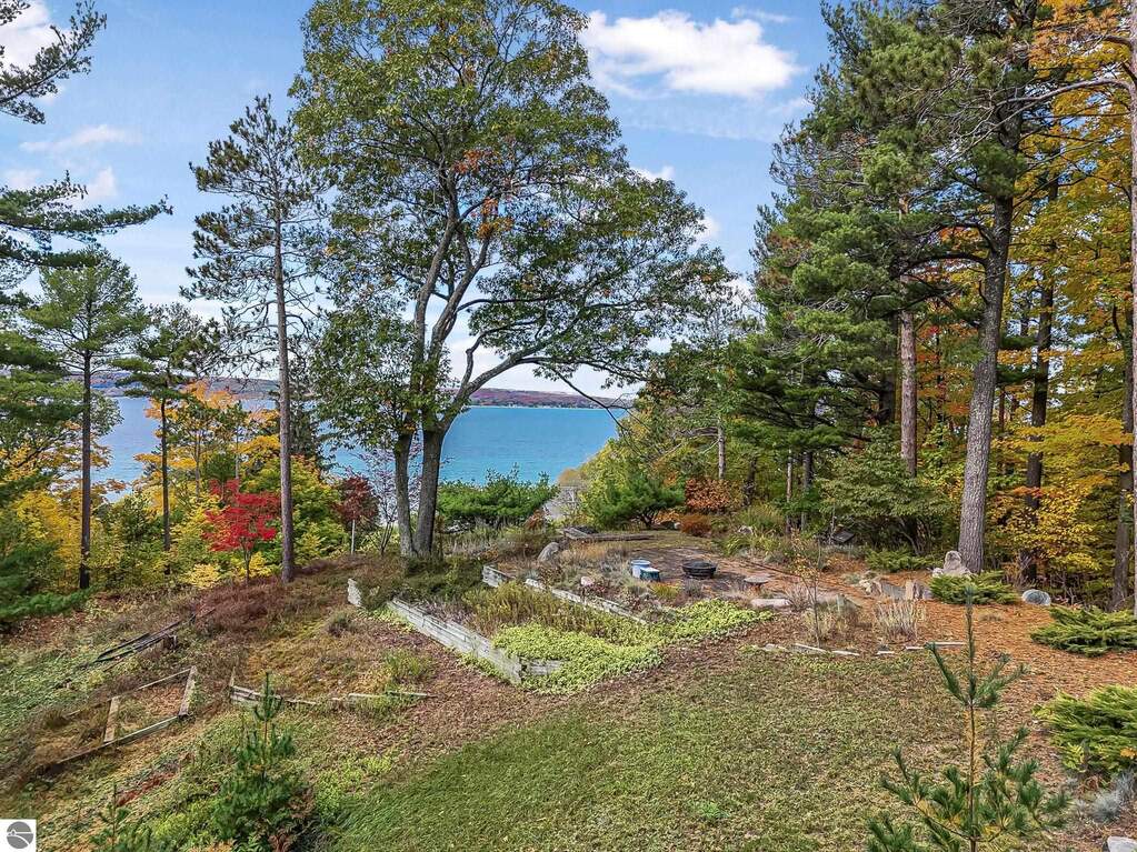 Set near the coveted base of Old Mission Peninsula, this exceptional property offers a rare combination of scale, privacy, and proximity-features seldom found in a single offering. The beautiful and unique architecture of this home is like no other on Old Mission. With just over six acres, the estate presents an extraordinary opportunity in one of Traverse City's most sought-after locations, where acreage of this magnitude is virtually unheard of. The 3,500-square-foot residence is thoughtfully positioned to capture sweeping sunset views over West Bay, with a front-row seat to summer airshows, holiday fireworks, and the ever-changing rhythm of boat traffic along the shoreline. The home offers several separate family areas for entertaining, celebrating family or simply downtime in the cozy and warm interior. Expansive windows and well-proportioned living spaces bring the outdoors in, creating a seamless connection to the surrounding landscape. With three bedrooms and three baths, the home is both substantial and comfortable, offering flexibility for year-round living or a refined seasonal retreat. Just minutes from downtown Traverse City, yet removed enough to feel private and serene, this is a truly rare holding on Old Mission Peninsula-where location, land, and view converge in a way that is increasingly difficult to find. A lower level workshop with tons of storage and a really nice sized garden shed are another bonus with this property. The Views are incredible and the wooded and rolling acreage offers so many opportunities you wont find with other homes.