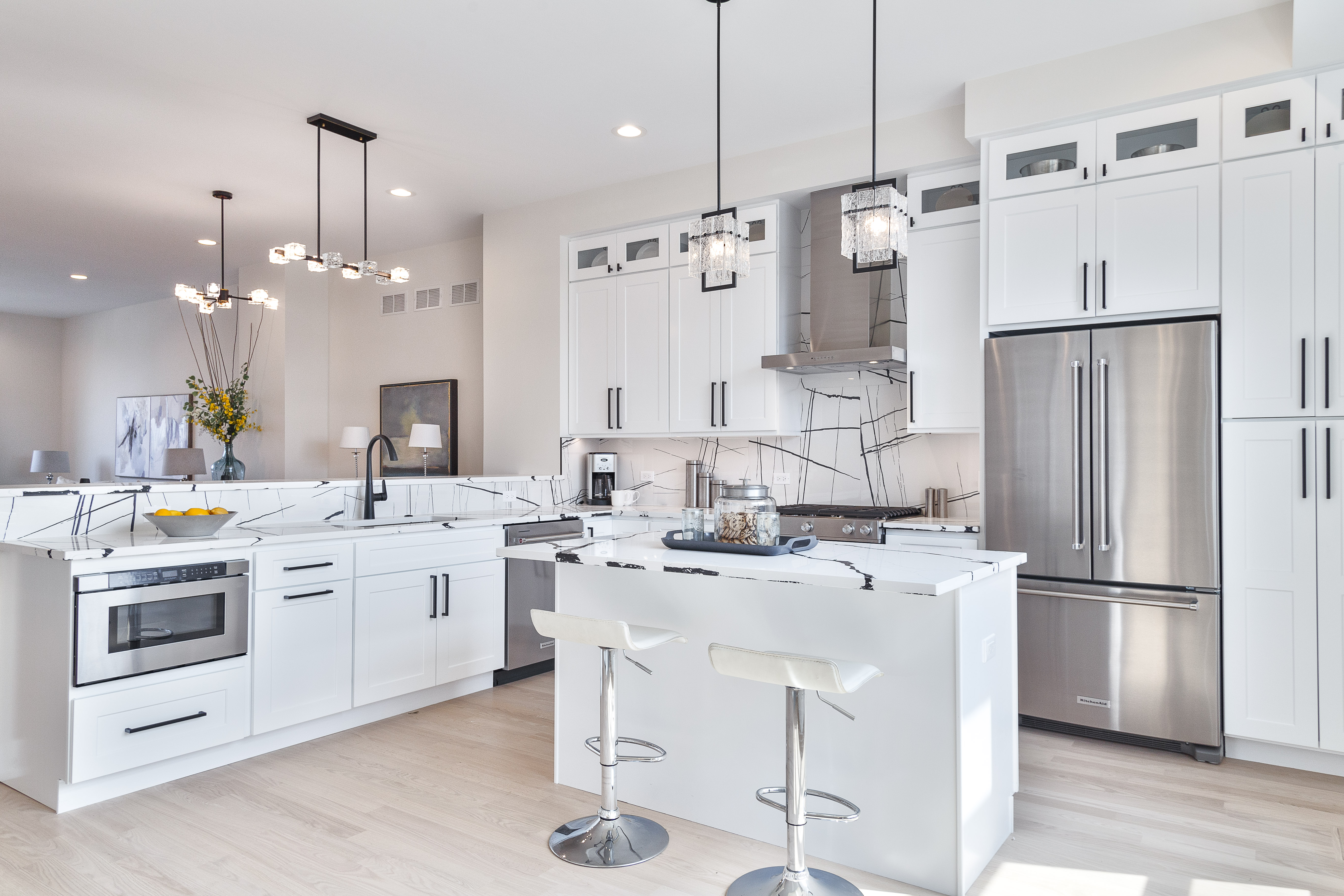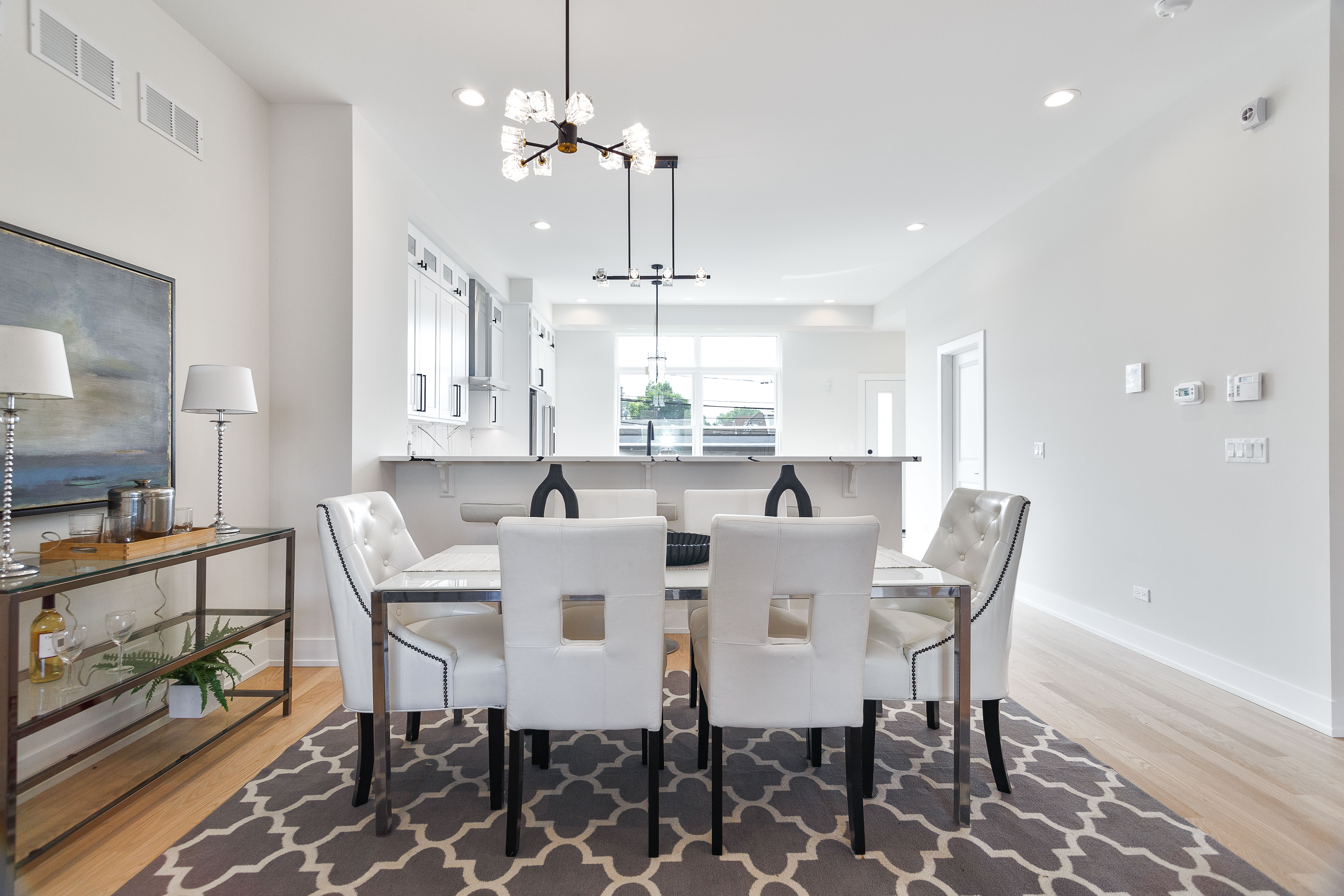 8 On Central - Modern new construction row-home project in Portage Park by top Chicago developer. Sun filled open concept main level features spacious living/dining area with oversized front windows and natural hardwood flooring throughout. Adjoining eat-in kitchen with stainless steel KitchenAid appliance package, soft close shaker cabinetry with glass transoms and under counter lighting, quartz countertops, island, breakfast bar, pantry with custom organizers, and exit to backyard. Bright and spacious primary suite with WIC and private bath featuring a frameless glass shower and dual vanity. Two additional bedrooms, full guest bath with tub and dual vanity, and laundry with washer/dryer complete the upper level. Sunny lower level with family room featuring wet bar and beverage center, 4th bedroom, full bath with frameless glass shower, and utilities. On trend design features, statement lighting, nice ceiling heights, custom closets, and tons of natural light! Private yard and detached two-car garage. Conveniently located near restaurants, shopping, entertainment, parks, public transportation, and more! Estimated completion April. Photos are from the model home (phase 1).