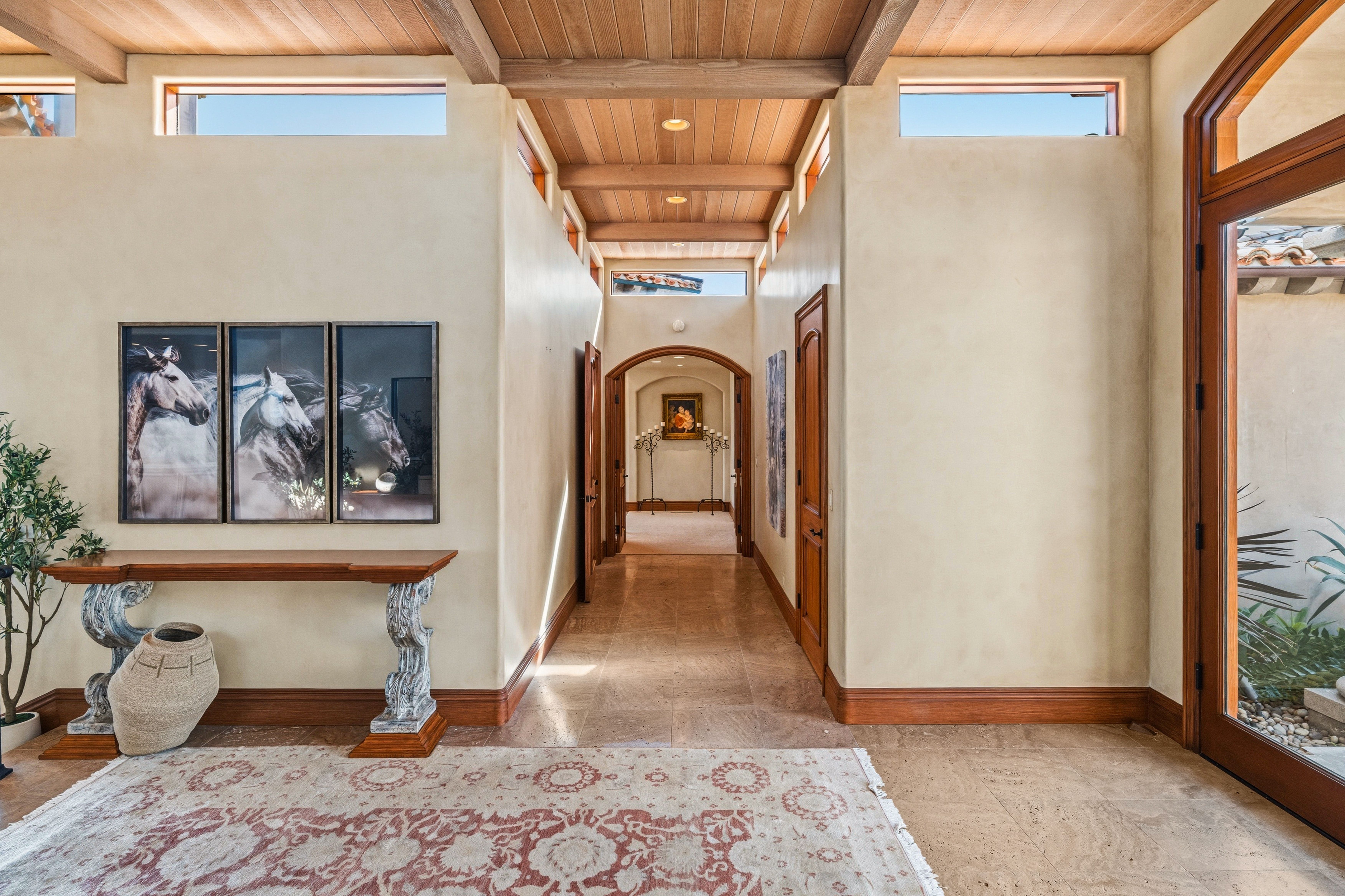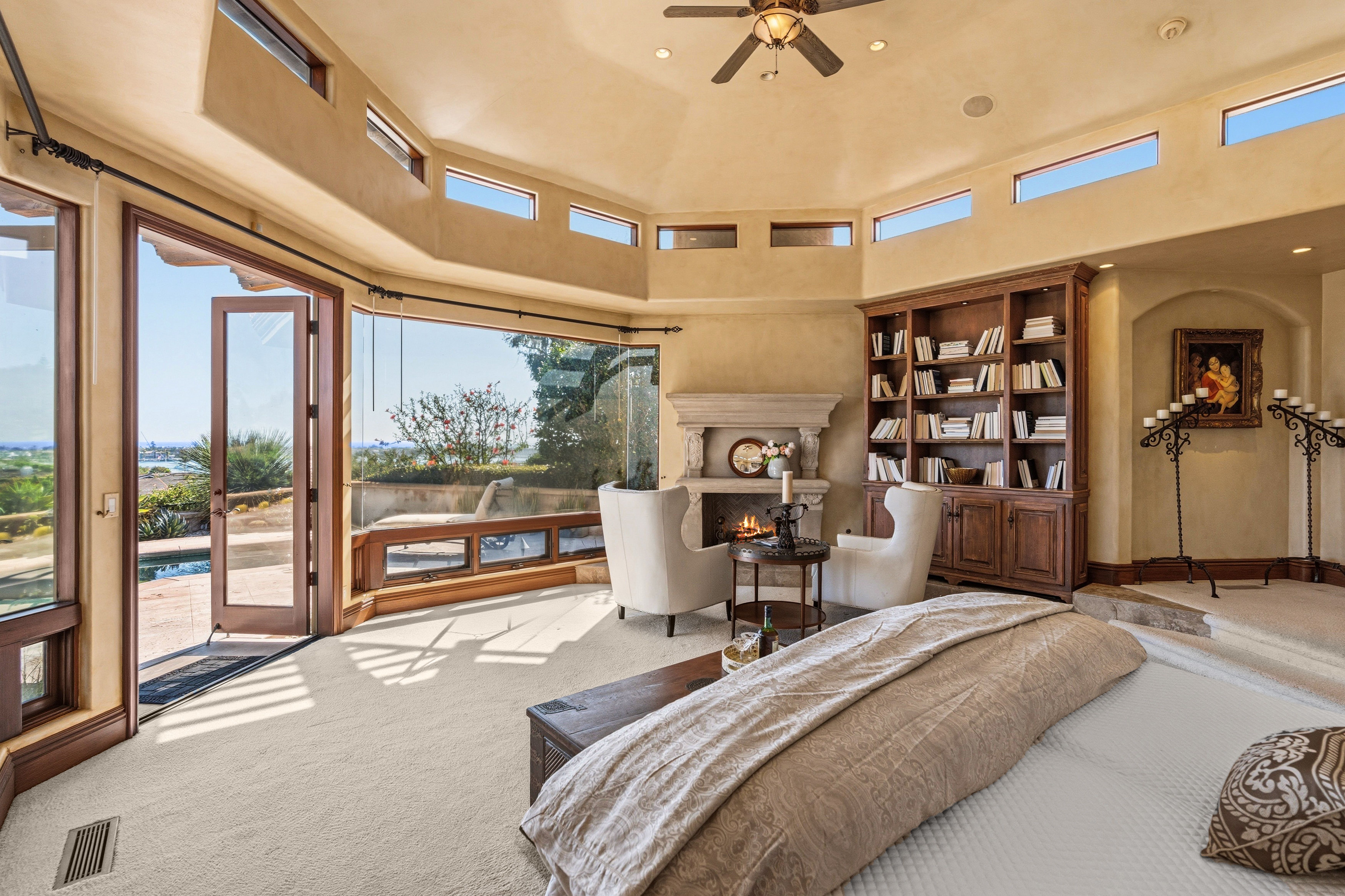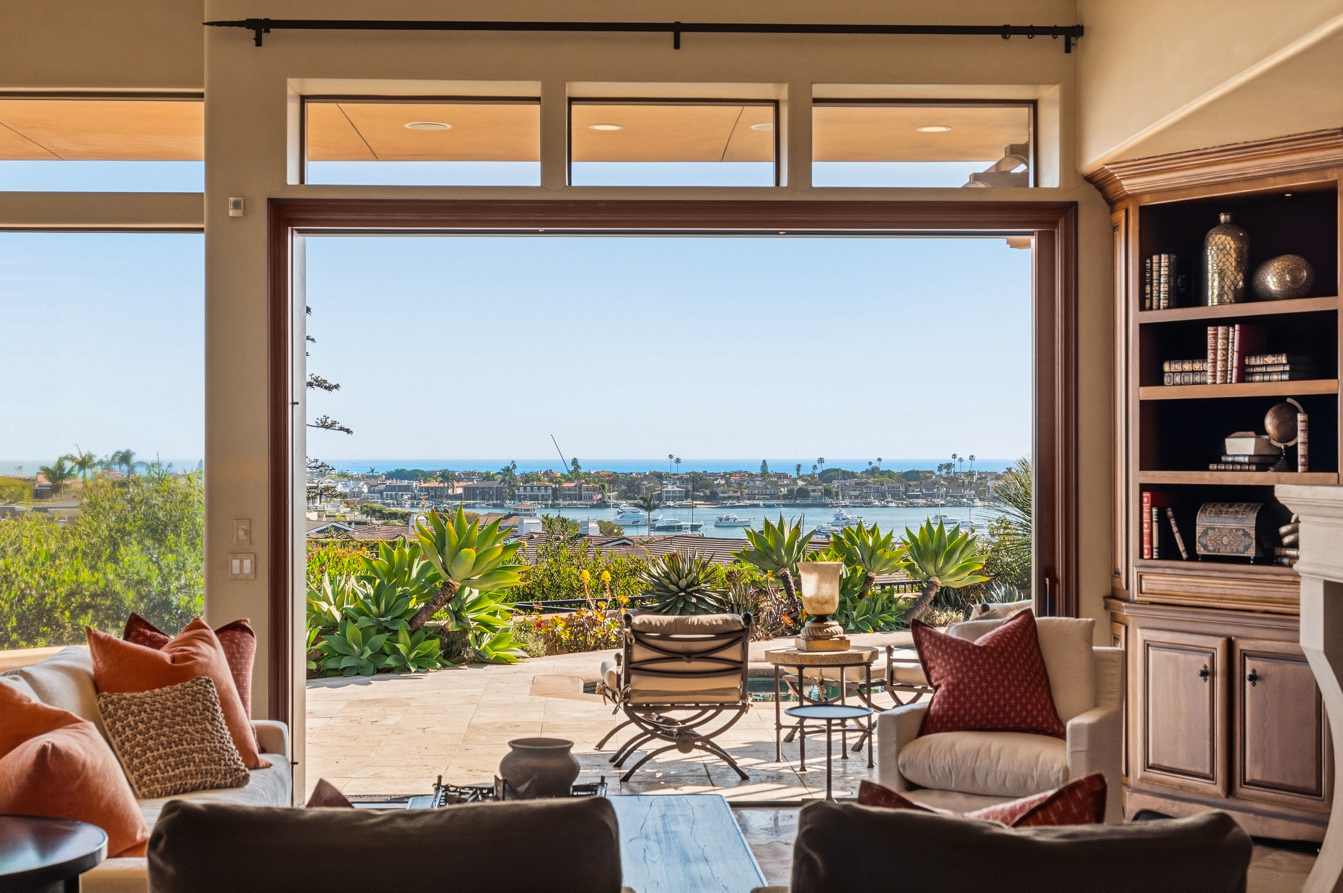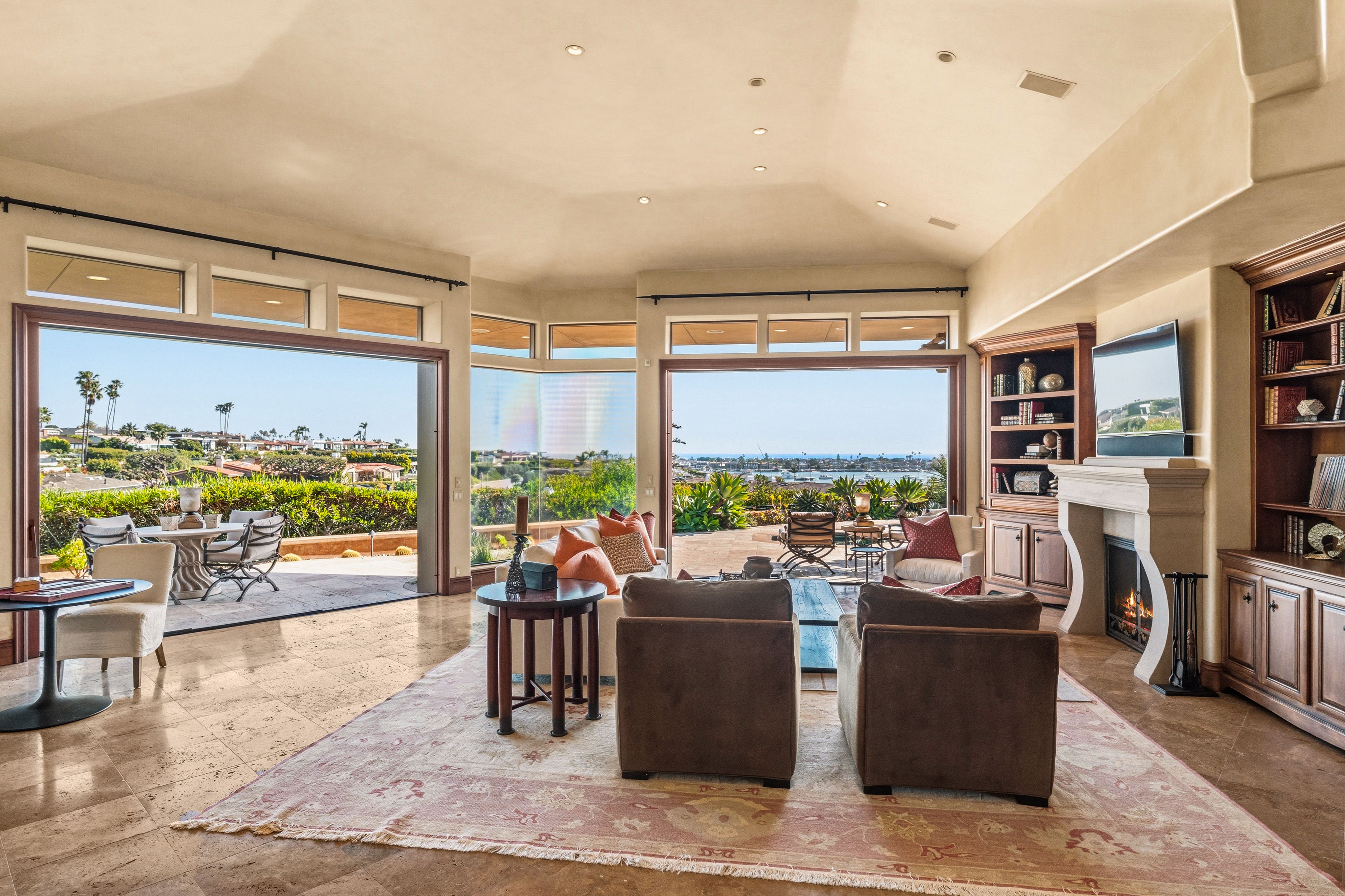Perched in the highly coveted Irvine Terrace neighborhood of Corona del Mar, this Mediterranean-inspired single-level residence captures breathtaking, front-row views of the Pacific Ocean, Catalina Island, and Newport Harbor. Ideally situated moments from Fashion Island and the vibrant charm of Corona del Mar Village, the home offers an exceptional blend of privacy, convenience, and coastal living. Designed for effortless indoor-outdoor living, the open-concept floor plan features expansive retractable walls of glass that seamlessly connect the interior to a resort-style backyard complete with pool, spa, and generous entertaining spaces. Interior highlights include travertine flooring, rich wood-beamed ceilings, and a spacious living room with fireplace and custom built-in bookcases. The chef’s kitchen enjoys panoramic ocean and harbor views and opens to both the living and dining areas. It is appointed with custom cabinetry, professional-grade stainless steel appliances, and a Sub-Zero refrigerator and freezer. The primary suite is a private retreat, offering equally stunning unobstructed views of the ocean, Catalina Island, and harbor, along with a cozy fireplace and built-in cabinetry. The luxurious primary bath features dual vanities, a walk-in shower, and a separate water closet. A detached casita-style guest suite provides ultimate flexibility with its own fireplace and en-suite bath, while an additional bedroom—ideal as an office or guest room—includes a private bath. Additional amenities include a two-car attached garage. A rare opportunity to own a single-level view home in one of Corona del Mar’s most desirable enclaves.