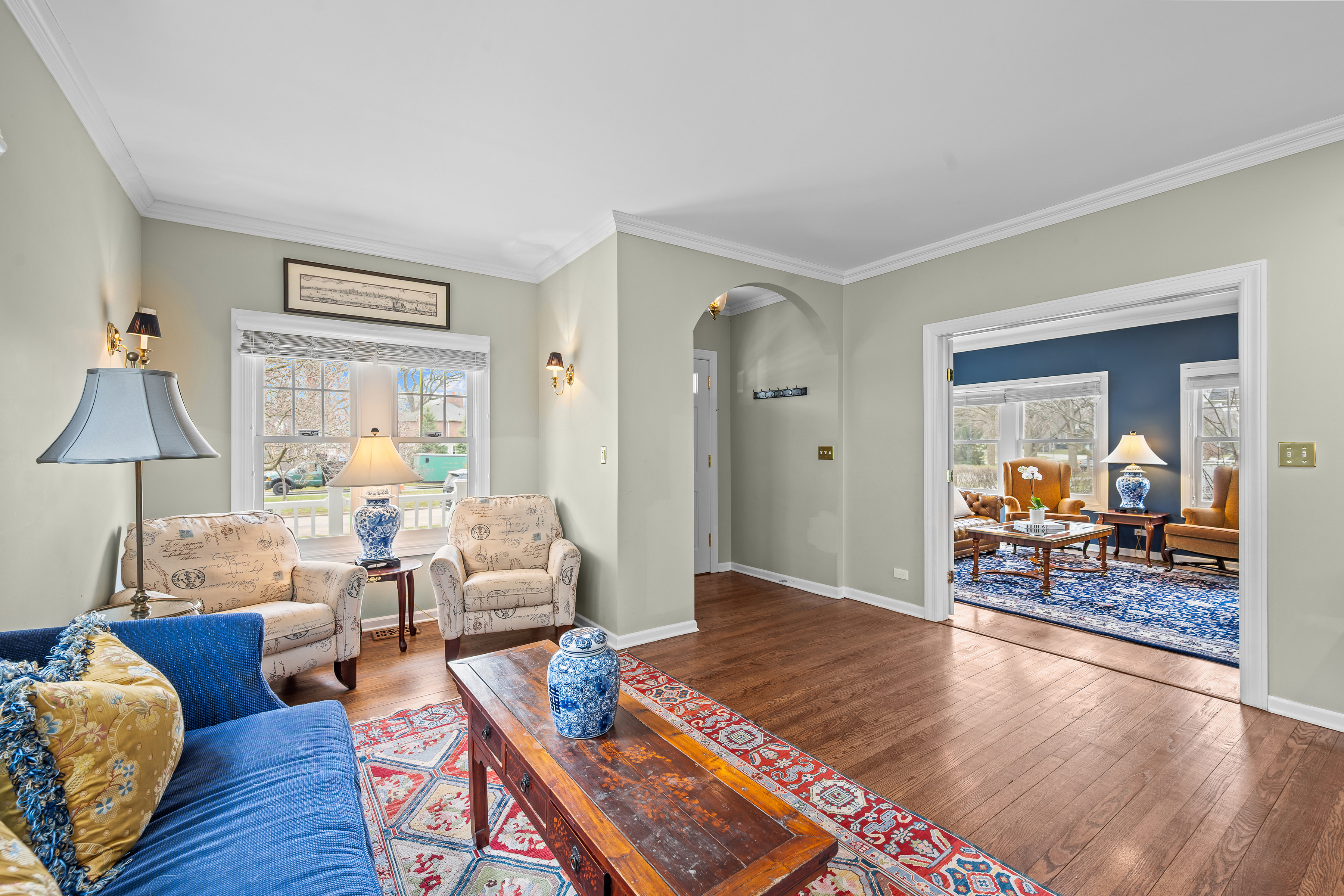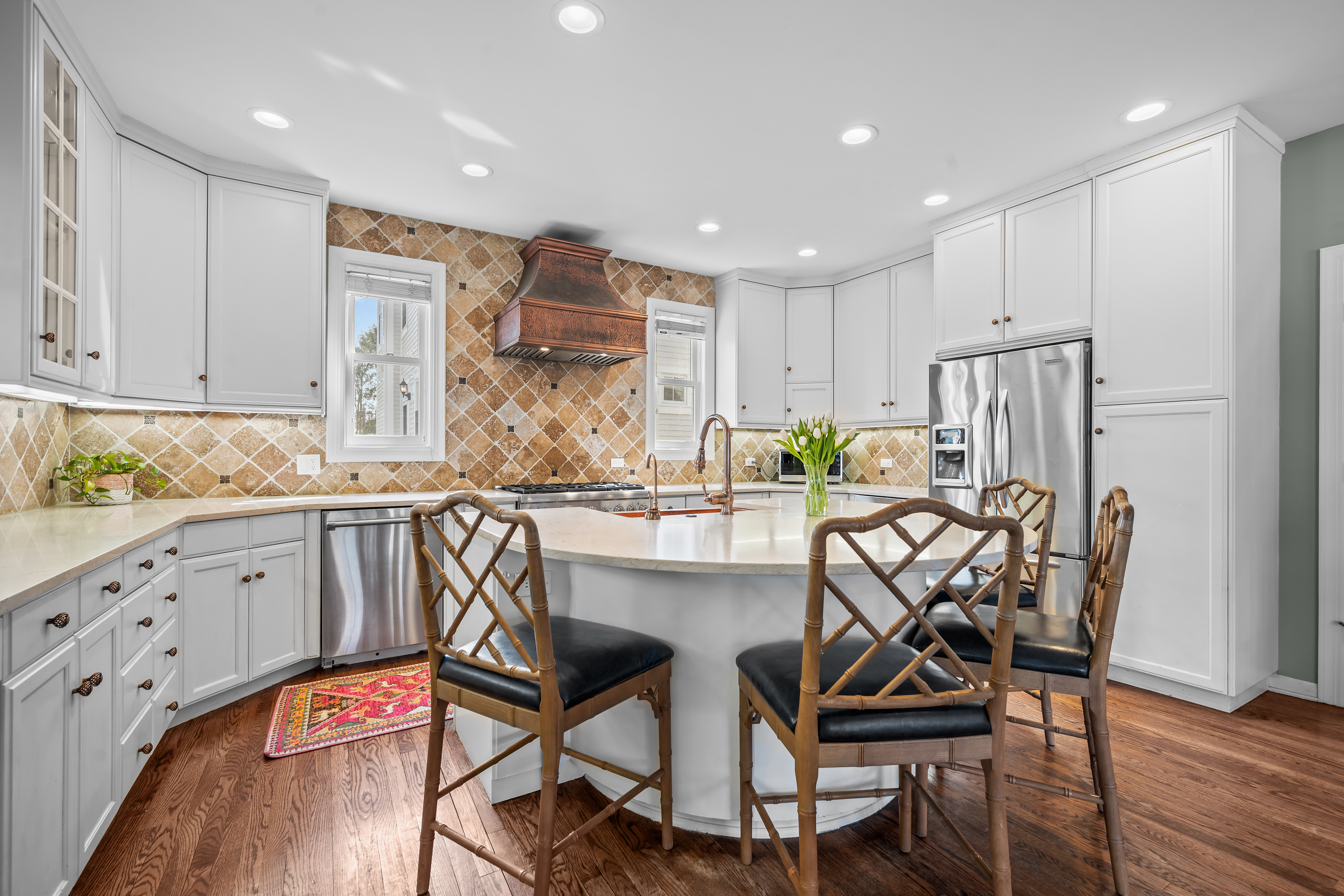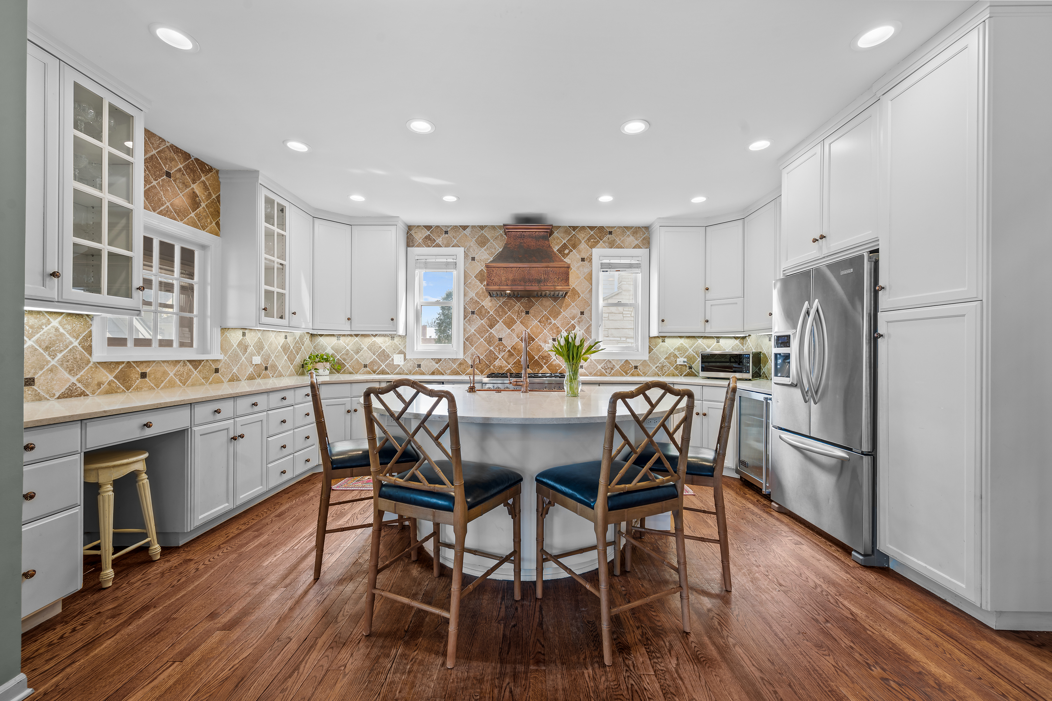 Picture-perfect and deceptively spacious, this Kenilworth gem delivers the lifestyle everyone is looking for! A welcoming front porch sets the tone, perfect for morning coffee or unwinding at sunset. Inside, the main level offers effortless flow for entertaining...gracious living and dining rooms anchored by a handsome fireplace in between and custom built-ins. A versatile front flex space ideal with pretty glass French doors is great for a cozy sitting room or a private office. The heart of the home is the expansive family room that opens seamlessly to a beautifully updated kitchen featuring newer quartz countertops, an abundance of cabinetry, large island with seating and generous prep space. Separate eat-in area room for a large tale as well...truly designed for everyday living and gathering. You will love retreating to the expansive primary suite with charming wood beams! A newly renovated spa-like bath showcasing new quartz countertops, a gorgeous large shower with a lounger, and a 5th bedroom was thoughtfully converted into a luxe primary closet with laundry (it can easily be restored as a bedroom). Three other generously sized bedrooms with excellent closet space and two full larges baths complete the floor. The third floor is a sun-drenched retreat with a vaulted ceiling and wood beams...perfect as a rec room, lounge, guest space, or creative studio. A large mudroom off the back staircase and a spacious basement provide even more flexibility for today's needs. Step outside to a fabulous, oversized, newer paver patio with built-in fireplace, ideal for seamless indoor-outdoor living and entertaining all season long. Complete with a two-car garage and an unbeatable location...just steps to award-winning Sears Elementary and New Trier High School, the beach, train, and Kenilworth's newly renovated Plaza Del Lago restaurants and shops. This All-American beauty has it all!!