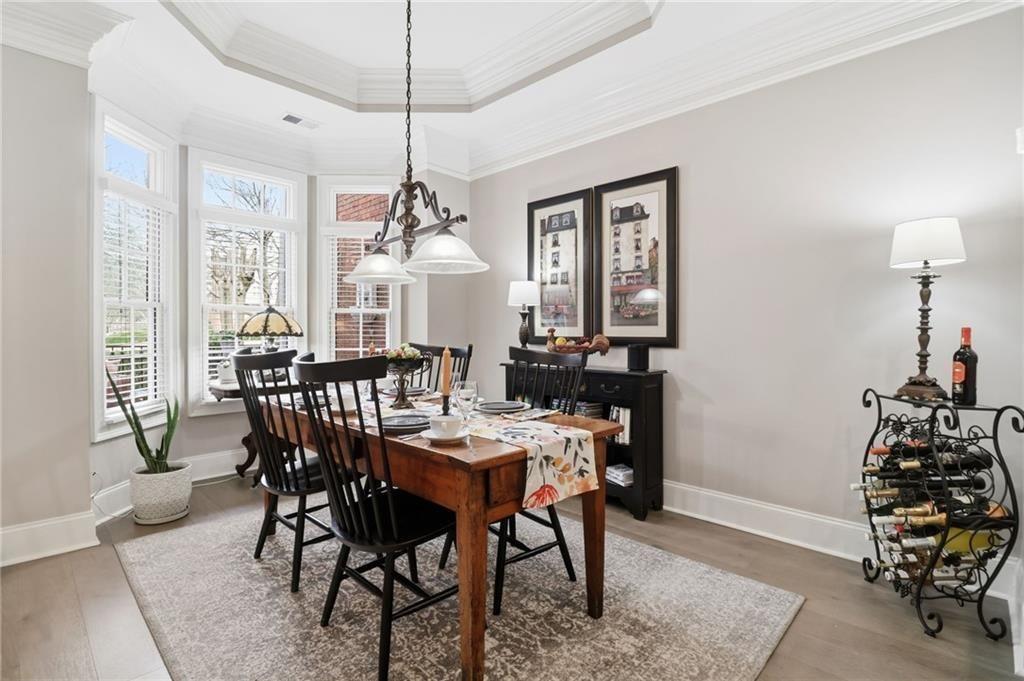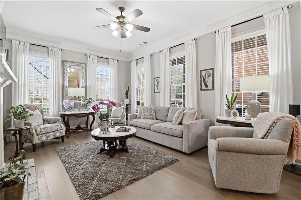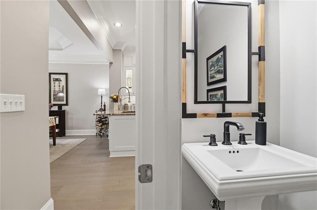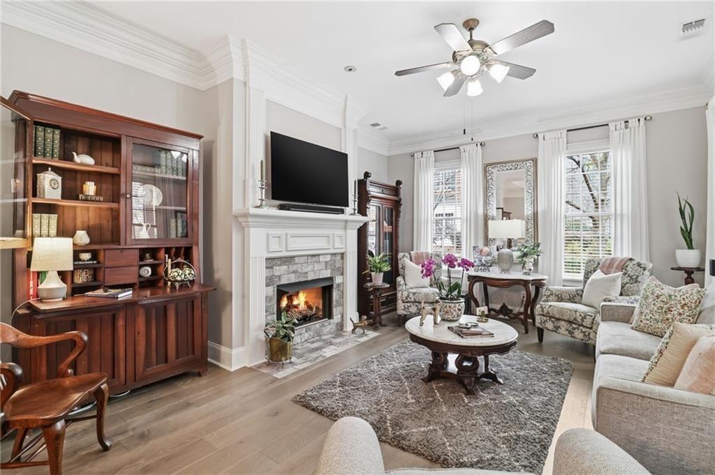 Showstopping custom kitchen 10 ft ceilings + hardwoods Rich crown molding Gas fireplace Primary suite with sitting room + covered balcony 2-car garage All-brick former model townhome in a gated Roswell community. Featuring 3 spacious bedrooms, 2 full baths and 1 half bath, this home delivers quality craftsmanship throughout, including 10-foot ceilings on the main, gorgeous crown molding, and transom foyer windows. The open dining-to-family room plan is anchored by a gas fireplace and flows to the renovated granite kitchen with custom cabinetry, abundant storage, a gas range, and a movable island. The laundry room adds even more storage with doors that conceal the washer and dryer, and it doubles nicely as a mud room. Upstairs, the oversized primary suite includes vaulted ceilings, a separate sitting room, a custom closet, and a private covered balcony. Two additional bedrooms are generously sized with great closet space, plus extra storage throughout. Enjoy the front stone patio with ornamental metal railing, along with a small, level yard. A rear-entry attached 2-car garage on the kitchen level adds everyday convenience and additional storage. Only 1.4 miles to Canton Street restaurants and shops. HOA covers exterior/structure and landscaping for easy, low maintenance living.