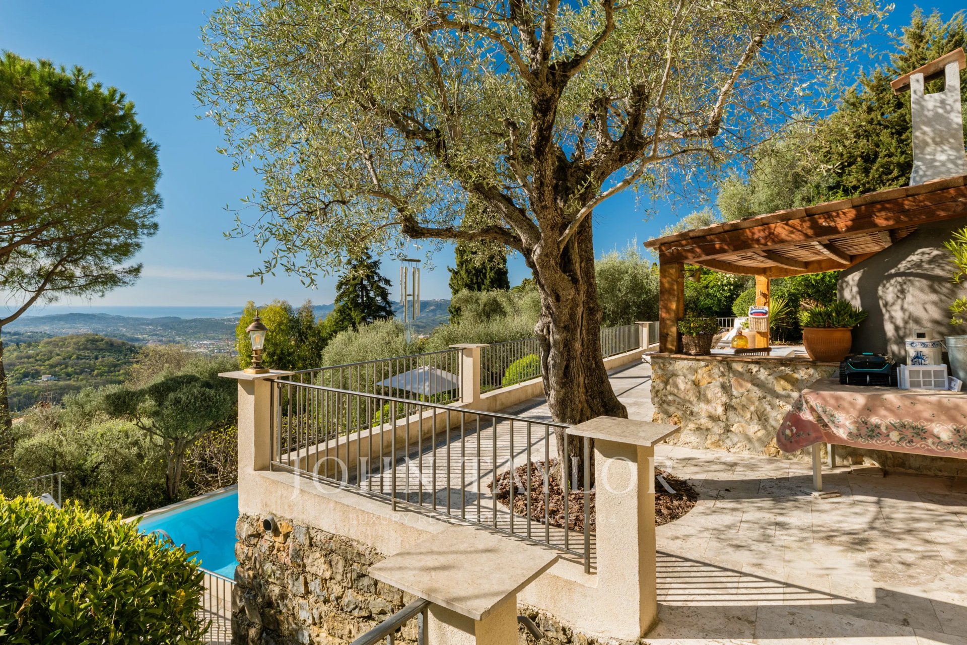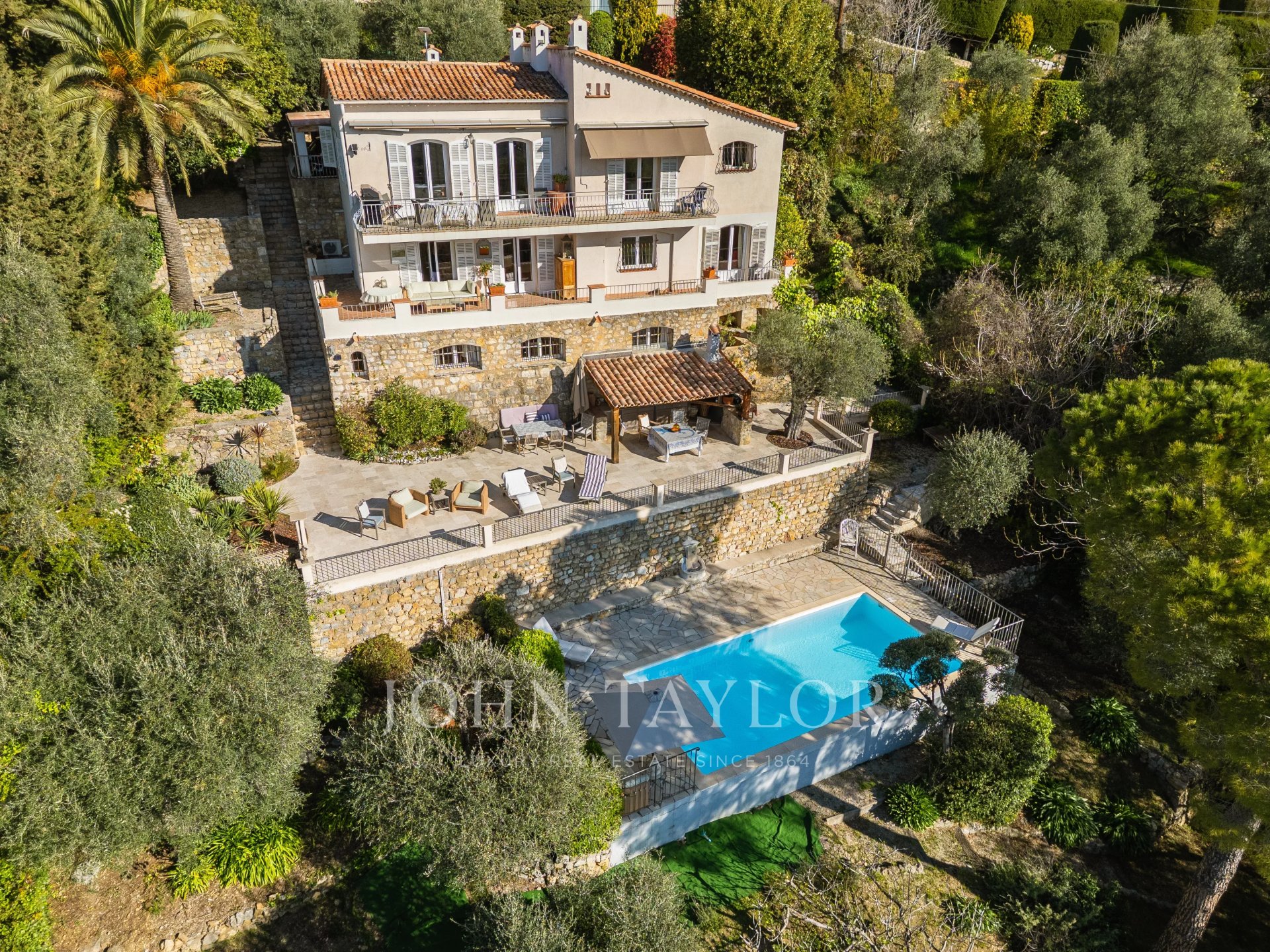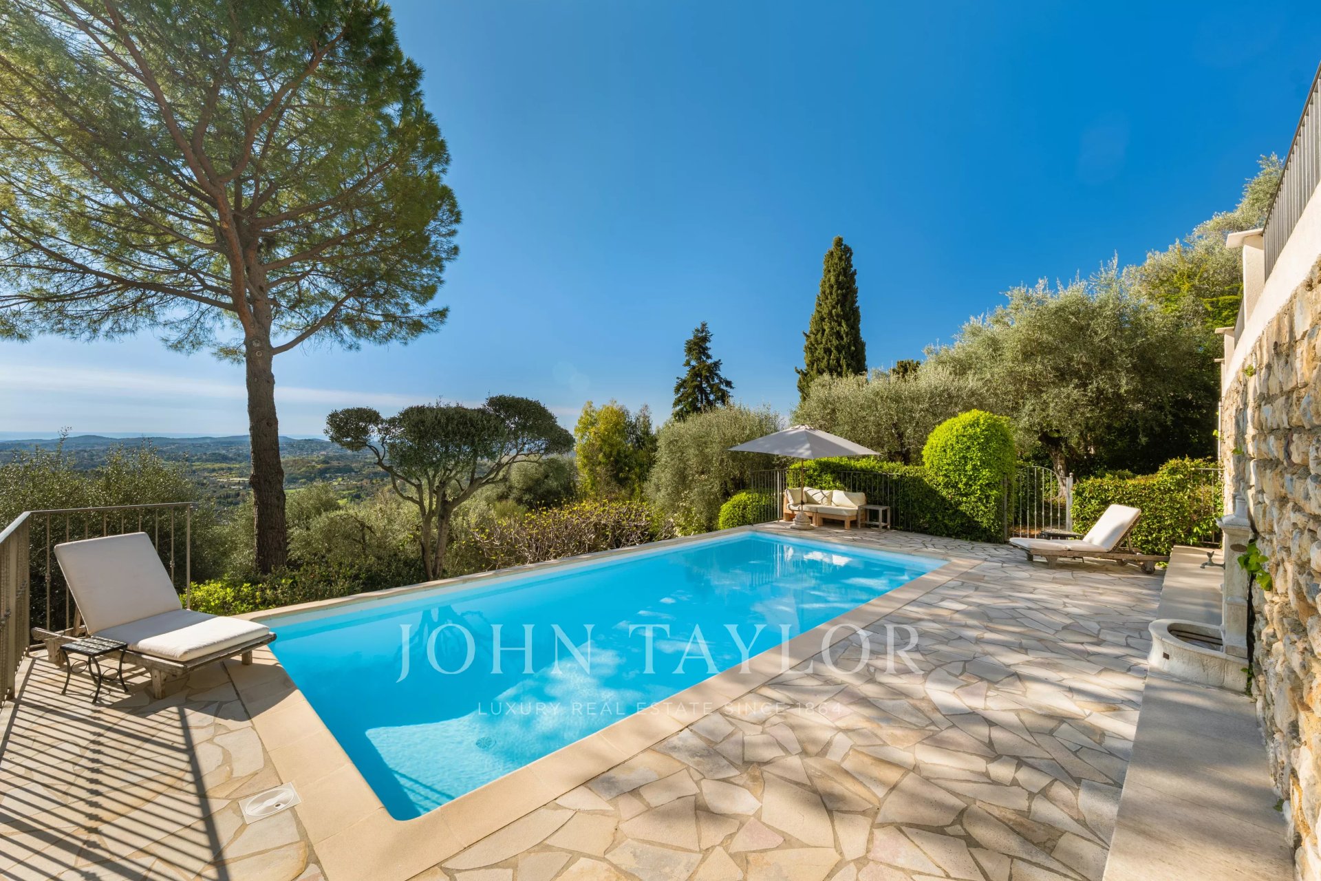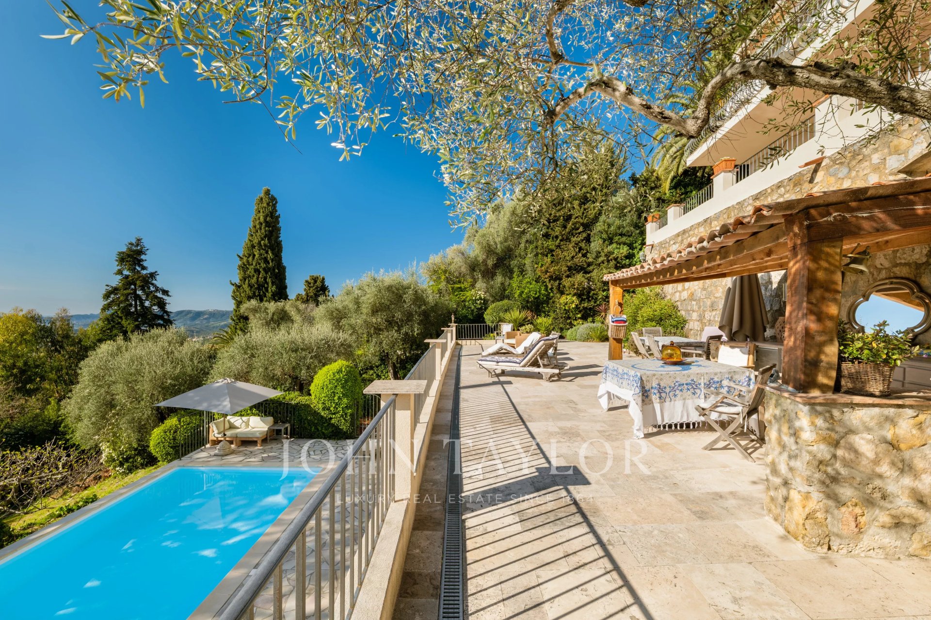 This 195 m² villa enjoys one of the most spectacular views from the hills behind Valbonne. From its four terraces, you can take in sweeping panoramic vistas of the coastline and the rolling, cypress-lined hills stretching all the way to the sea.At the entrance level, you are welcomed by a reception hall leading into a spacious living room with a beautiful fireplace and breathtaking views. This space includes both a dining area and a study corner. A large, well-equipped kitchen opens onto an additional dining area. Both rooms flow seamlessly onto the terrace, making the most of the exceptional outlook.On the lower level, you will find a very large master bedroom with a dressing room and en-suite bathroom, along with a second guest bedroom, also with its own bathroom. On the lowest level of the house, there is an additional bedroom with independent access, a living area, and a bathroom.Just above the pool, a generous and elegant terrace features a fully equipped summer kitchen, ideal for entertaining. The pool and terraces are south-facing and enjoy sunshine throughout the day. The only sound from the garden is birdsong, offering a peaceful and serene setting.Lovingly maintained by the same family for over two decades, this villa is now ready to welcome its new owner. It is a charming family home as well as an easy-to-maintain holiday retreat. Located just 35 minutes from Nice Airport and the beaches of the Côte d’Azur, in an area renowned for beautiful walks and hiking trails, and very close to local amenities, pubs, and cafés.