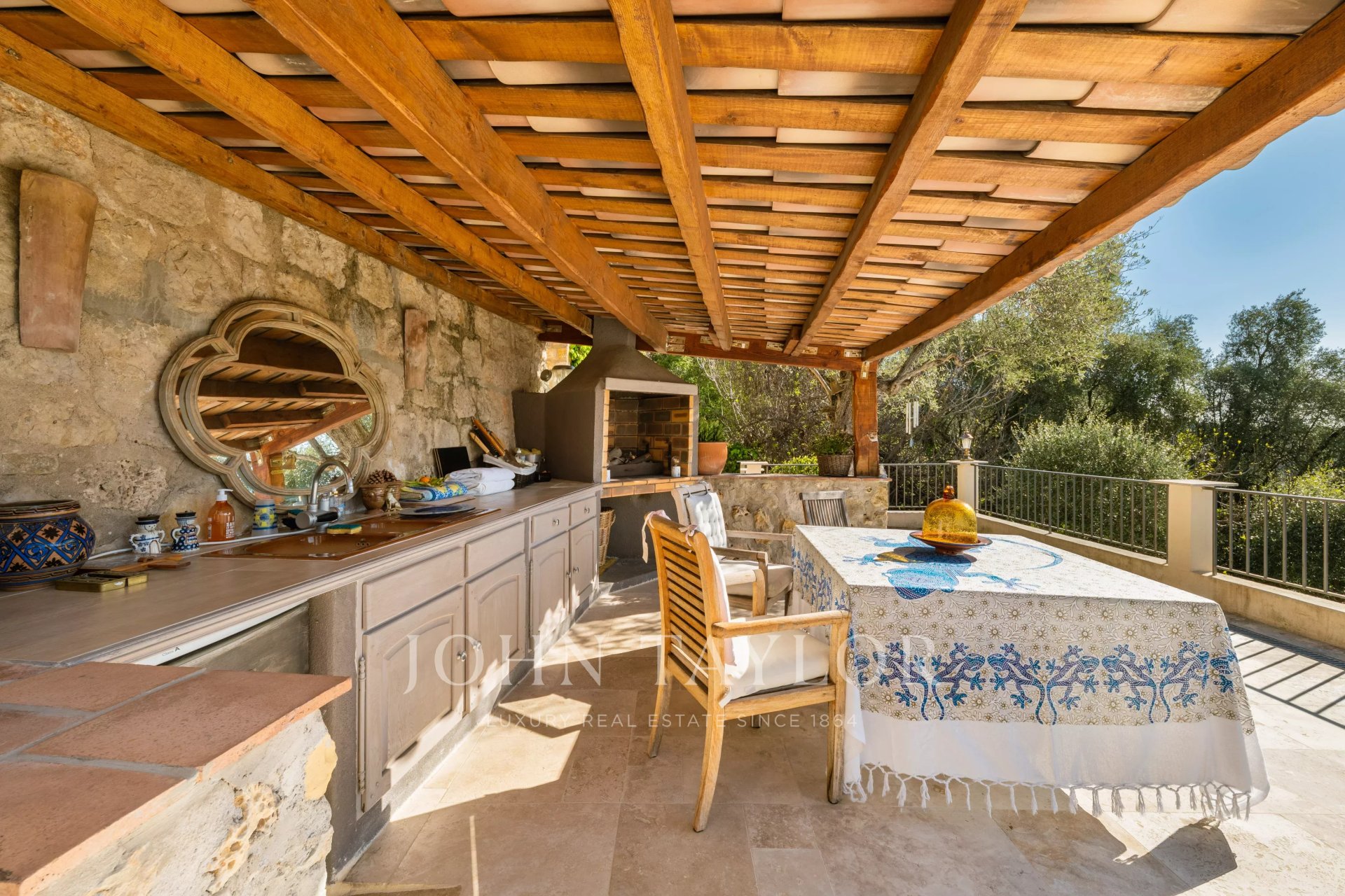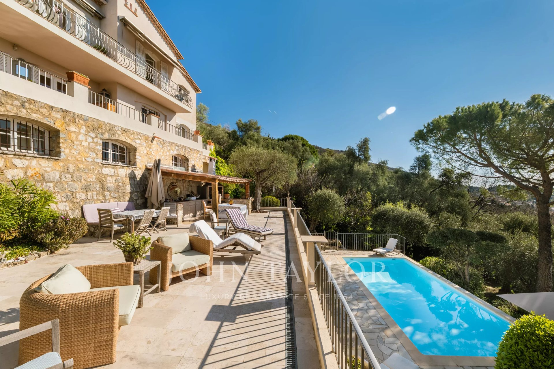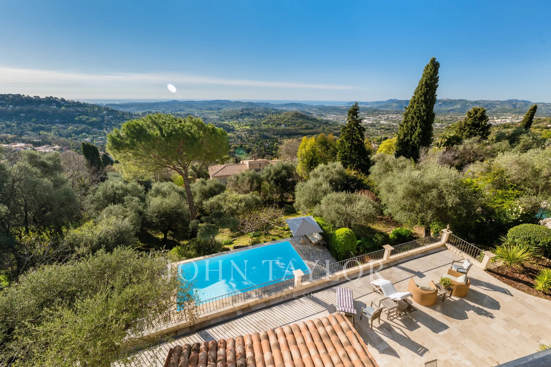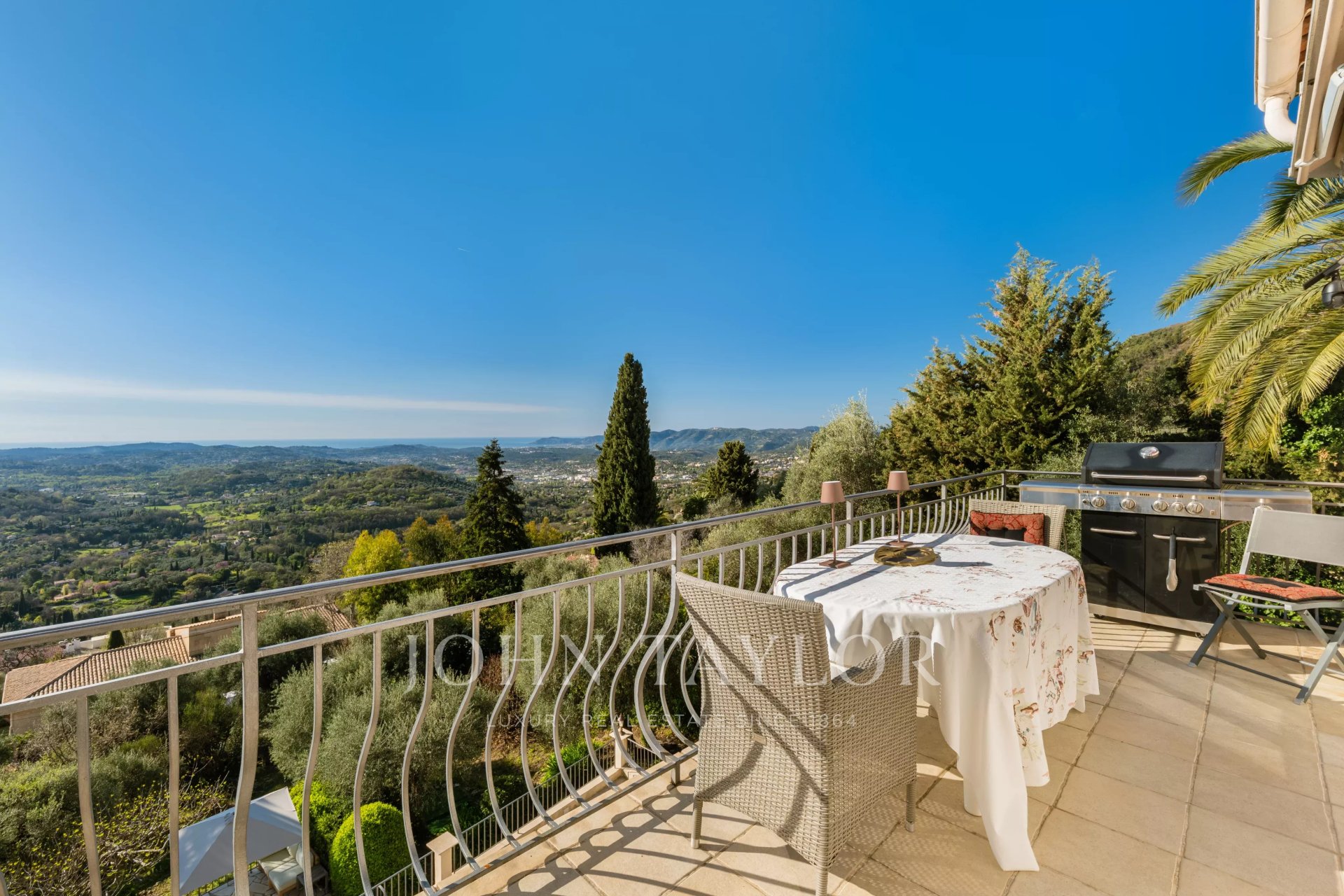 This 195 m² villa enjoys one of the most spectacular views from the hills behind Valbonne. From its four terraces, you can take in sweeping panoramic vistas of the coastline and the rolling, cypress-lined hills stretching all the way to the sea.At the entrance level, you are welcomed by a reception hall leading into a spacious living room with a beautiful fireplace and breathtaking views. This space includes both a dining area and a study corner. A large, well-equipped kitchen opens onto an additional dining area. Both rooms flow seamlessly onto the terrace, making the most of the exceptional outlook.On the lower level, you will find a very large master bedroom with a dressing room and en-suite bathroom, along with a second guest bedroom, also with its own bathroom. On the lowest level of the house, there is an additional bedroom with independent access, a living area, and a bathroom.Just above the pool, a generous and elegant terrace features a fully equipped summer kitchen, ideal for entertaining. The pool and terraces are south-facing and enjoy sunshine throughout the day. The only sound from the garden is birdsong, offering a peaceful and serene setting.Lovingly maintained by the same family for over two decades, this villa is now ready to welcome its new owner. It is a charming family home as well as an easy-to-maintain holiday retreat. Located just 35 minutes from Nice Airport and the beaches of the Côte d’Azur, in an area renowned for beautiful walks and hiking trails, and very close to local amenities, pubs, and cafés.